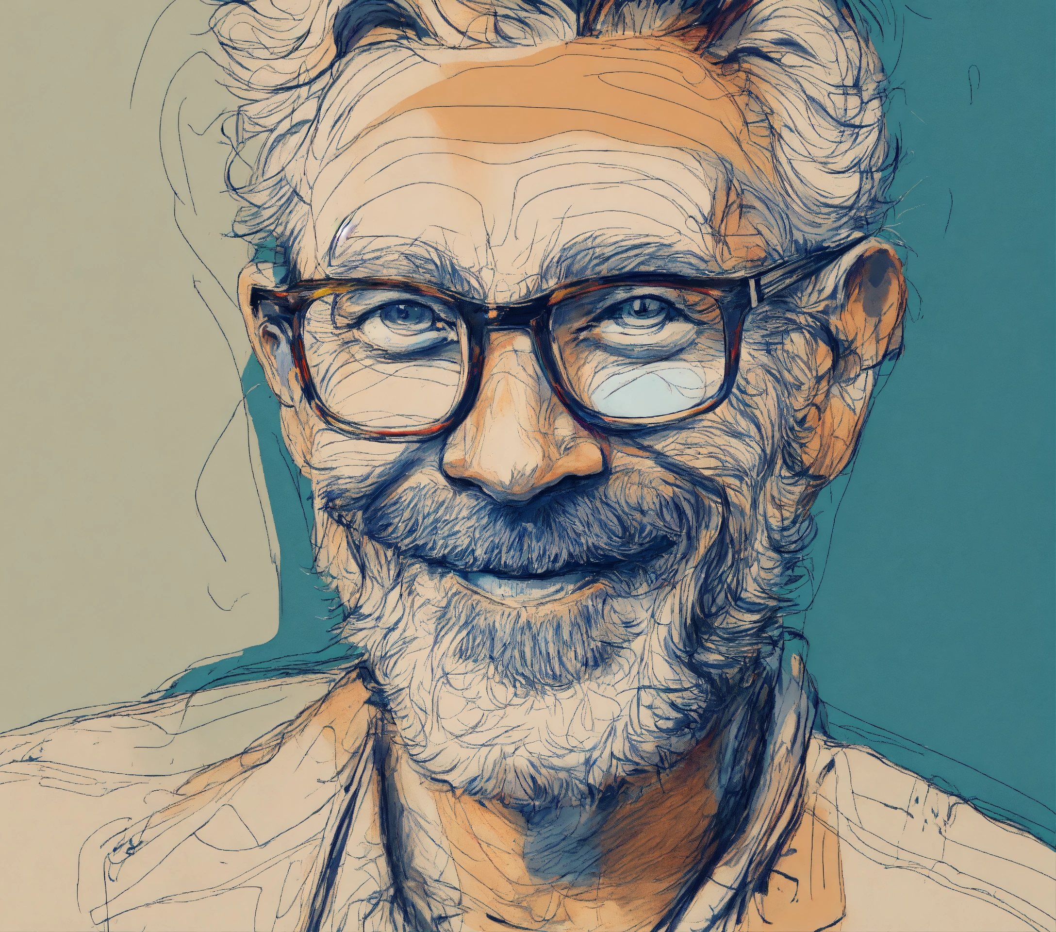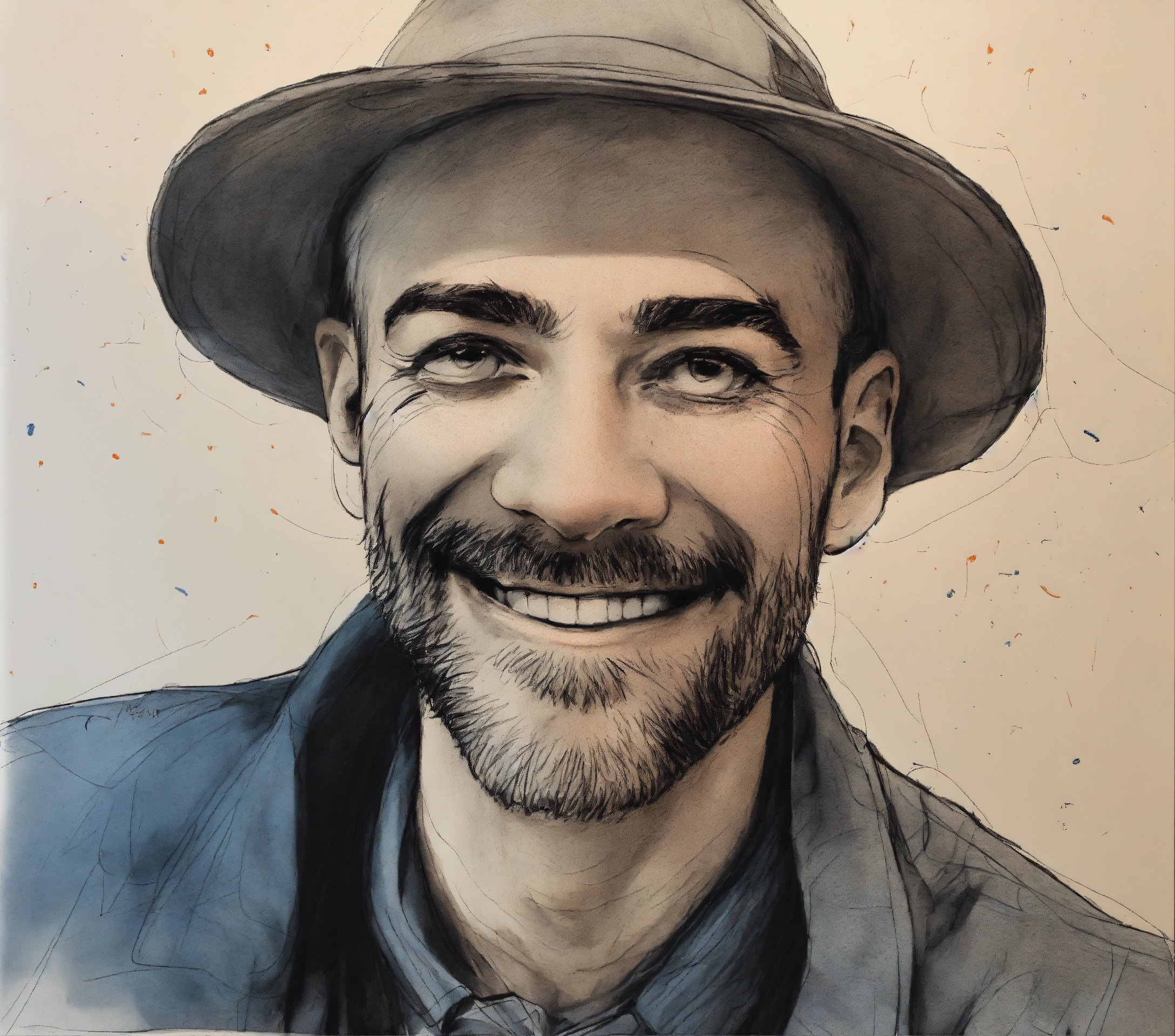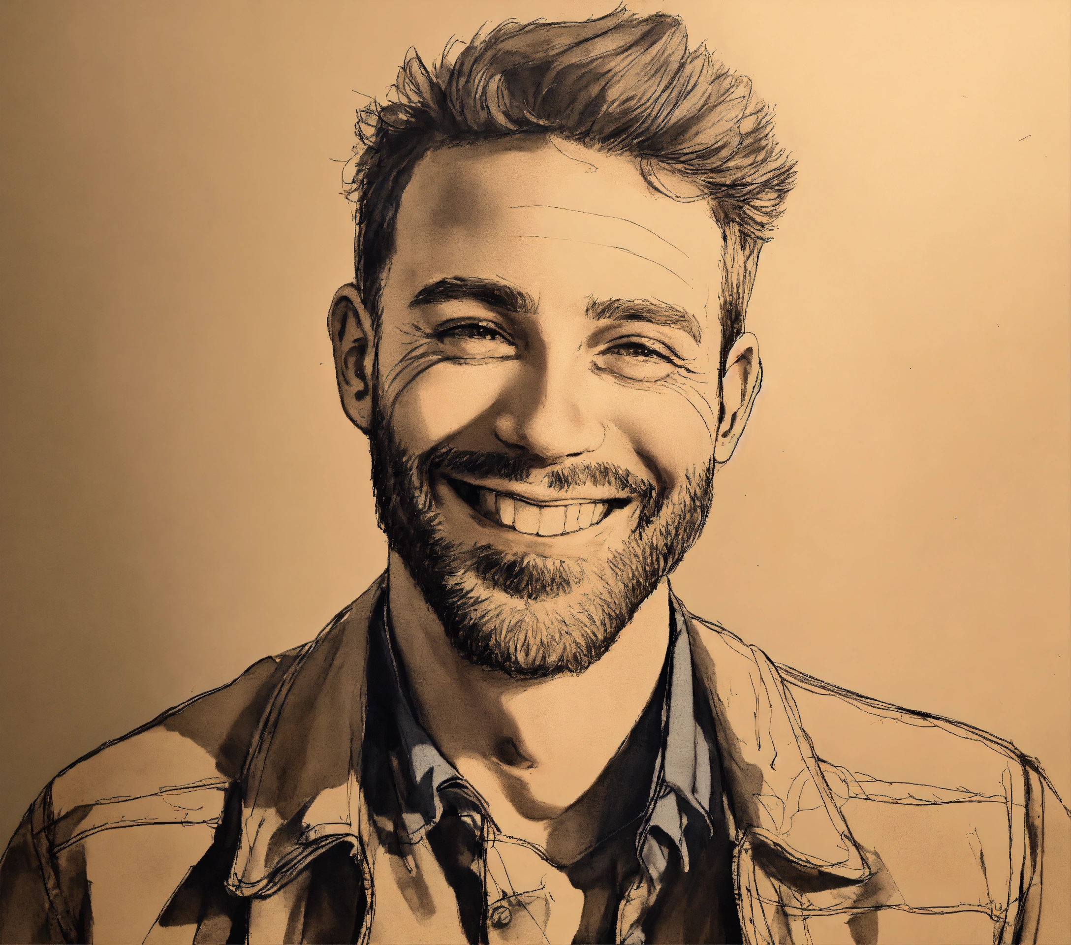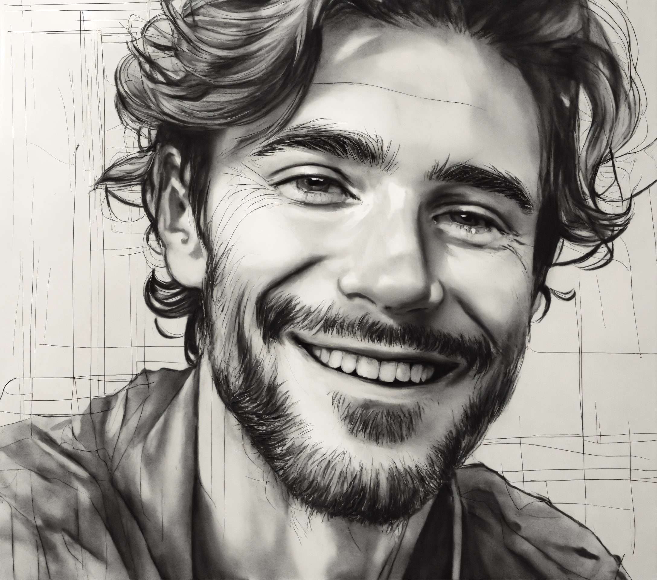 Un portrait en style "one line drawing" d'un homme souriant dans la trentaine réalisé avec un crayon