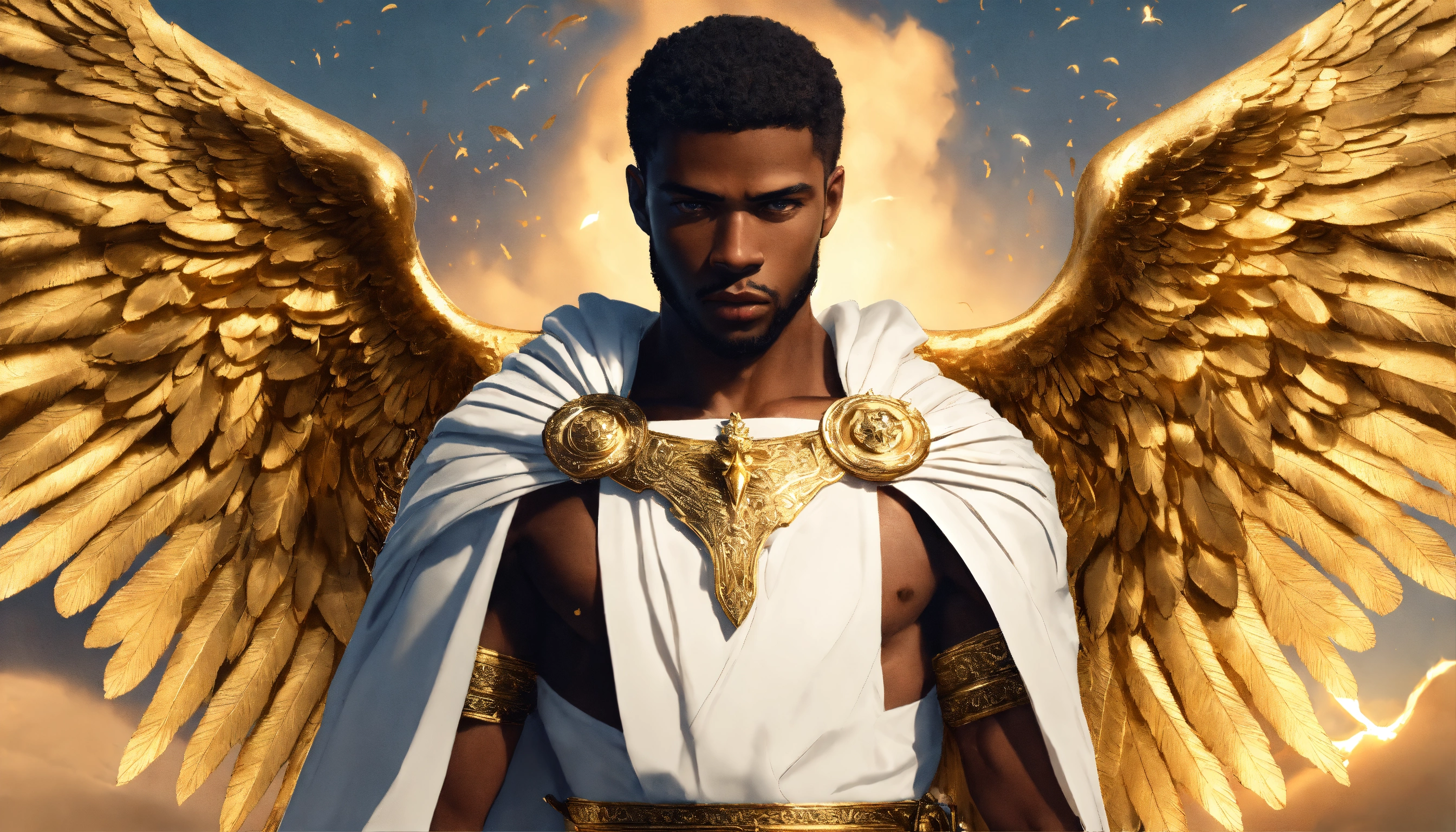 Illustrate a view of a young handsome broad broad-shouldered black man wearing a long glorious white robe with a golden breastplate and gold embroidery, he has shining wings and he is an angel, he stands high in the sky holding a large golden sword, he is ready for revenge, frontal view with the face of a warrior with righteous anger and indignation, ethereal and fantasy photorealistic 8k