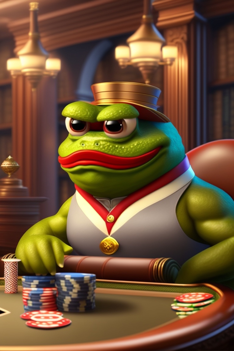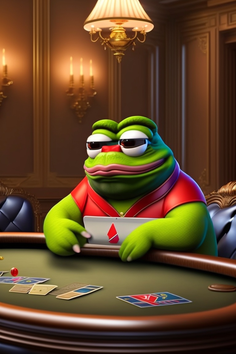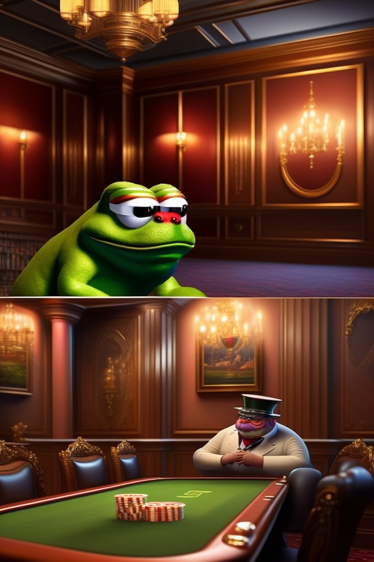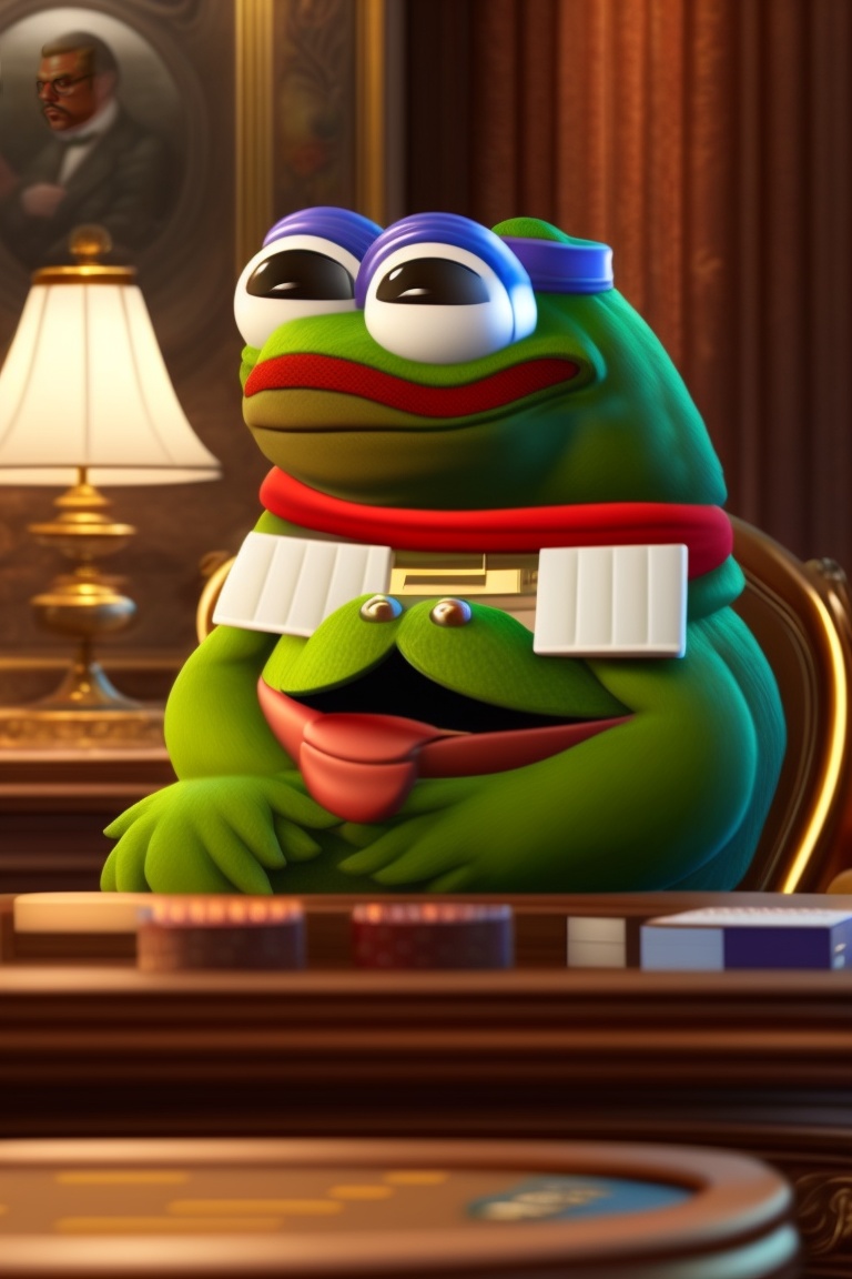 Look up pepe the frog meme on google image search. generate a pepe from the pepe memes playing poker at a poker table with with five non-pepe opponents but who are still cartoon looking so they dont look out of place, pepe the poker player has bigger chip stack than any of his opponents. there’s cigars being smoked, liquor glasses on the table, fine art on the walls, the room is a lounge similar to what a library would look like in an expensive house.
