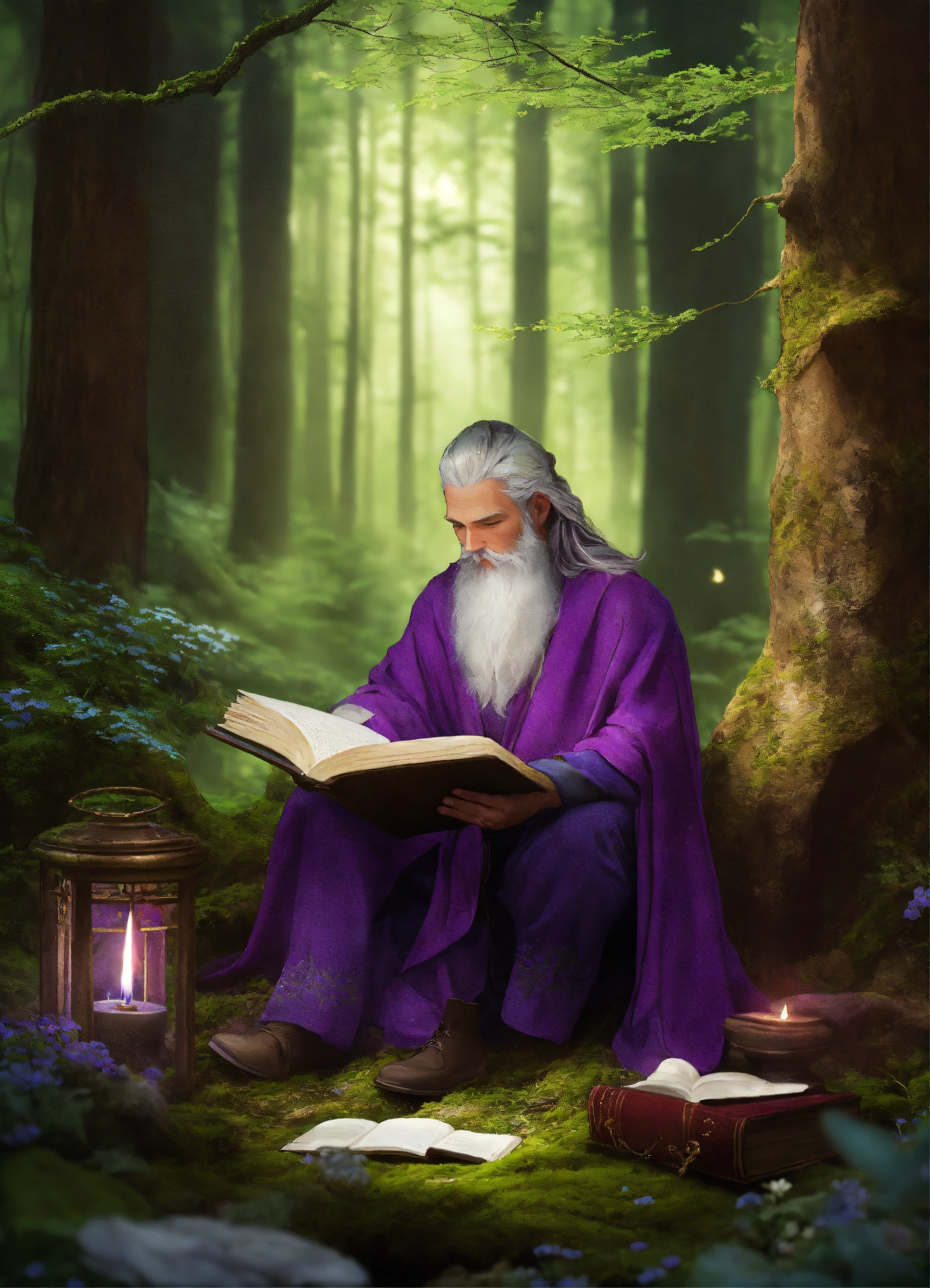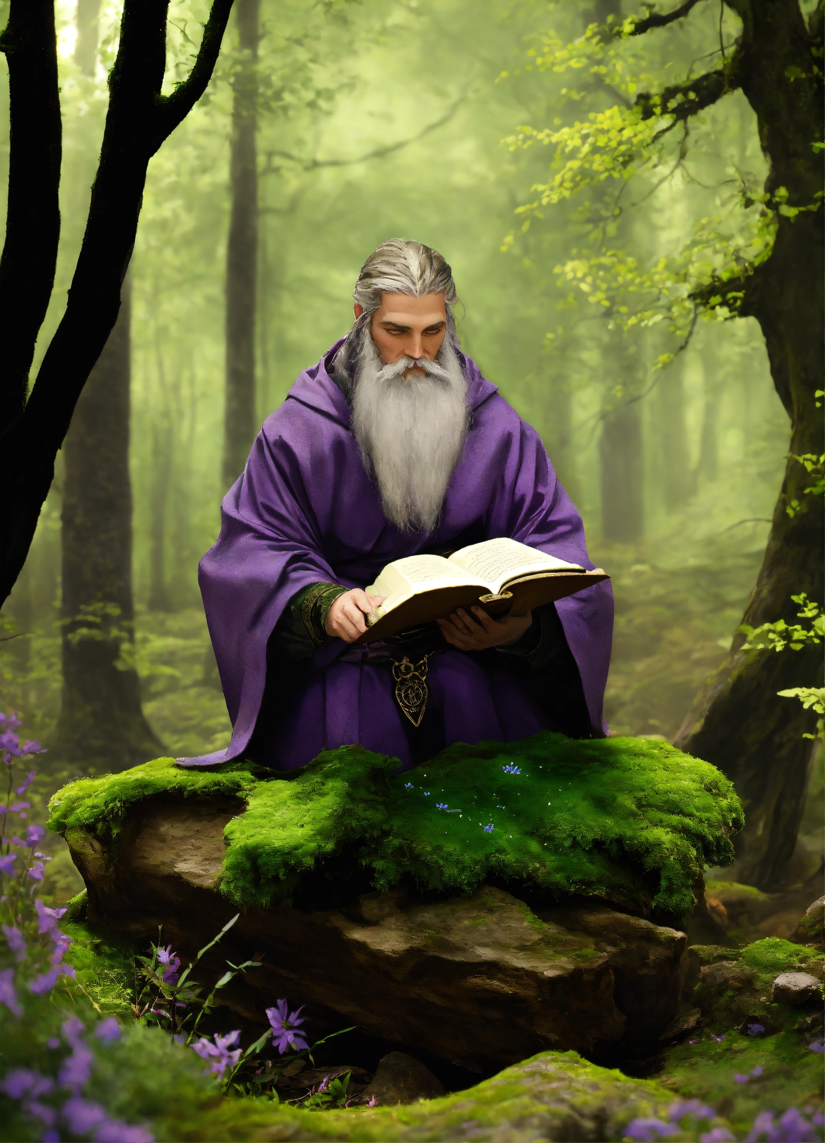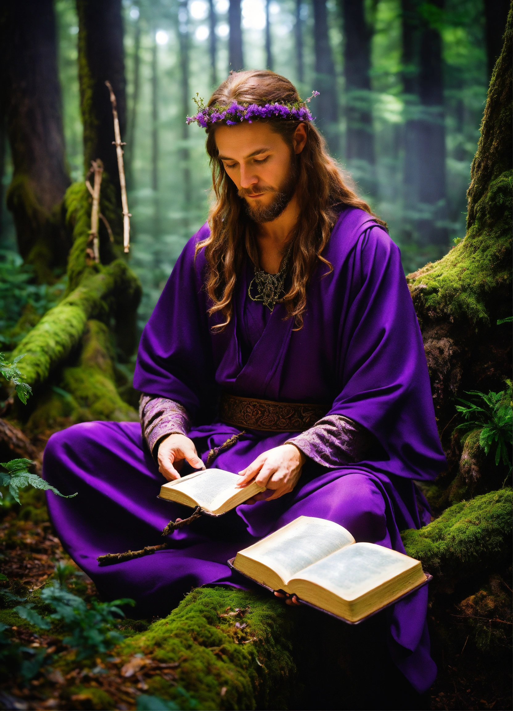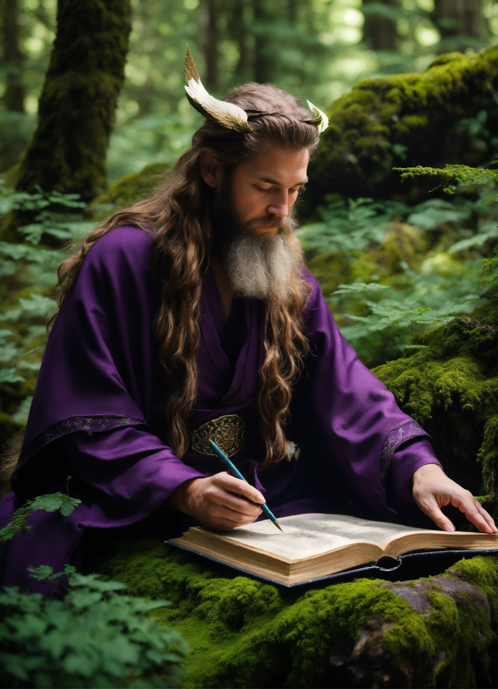 In a dense forest, a solitary druid with a masculine viking appearance in a purple robe writes a sacred book of shadows. their hands glide across the pages, using a white feathered quill. the forest comes alive as the druid writes, protected by ancient trees. moss-covered stones and wildflowers add to the mystery. the druid's quill merges nature and mysticism, creating a book of shadows that holds the universe's secrets.