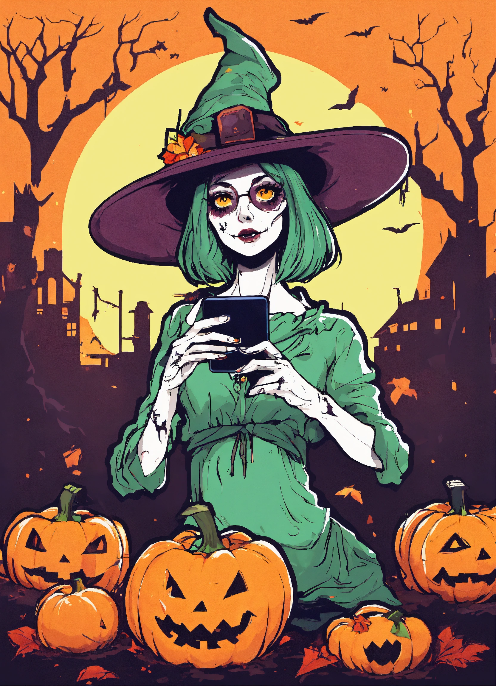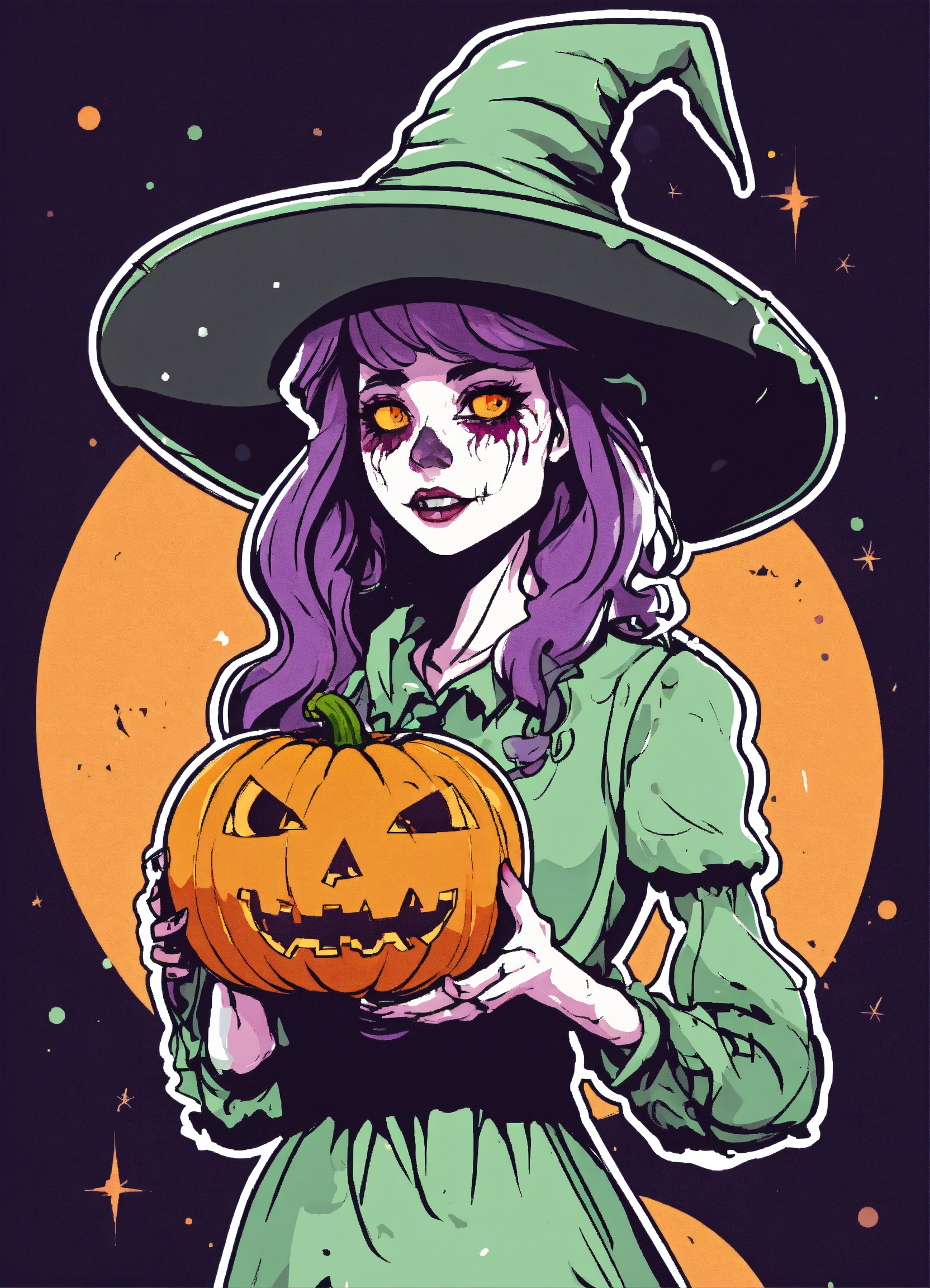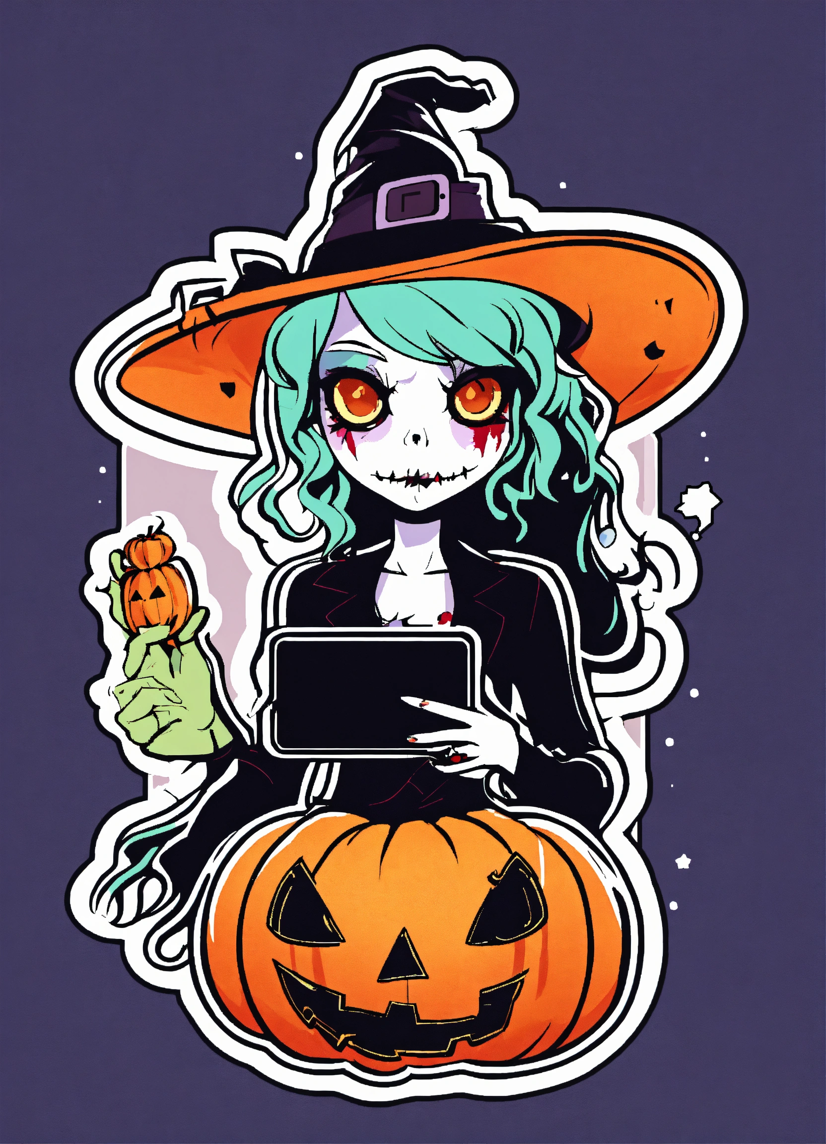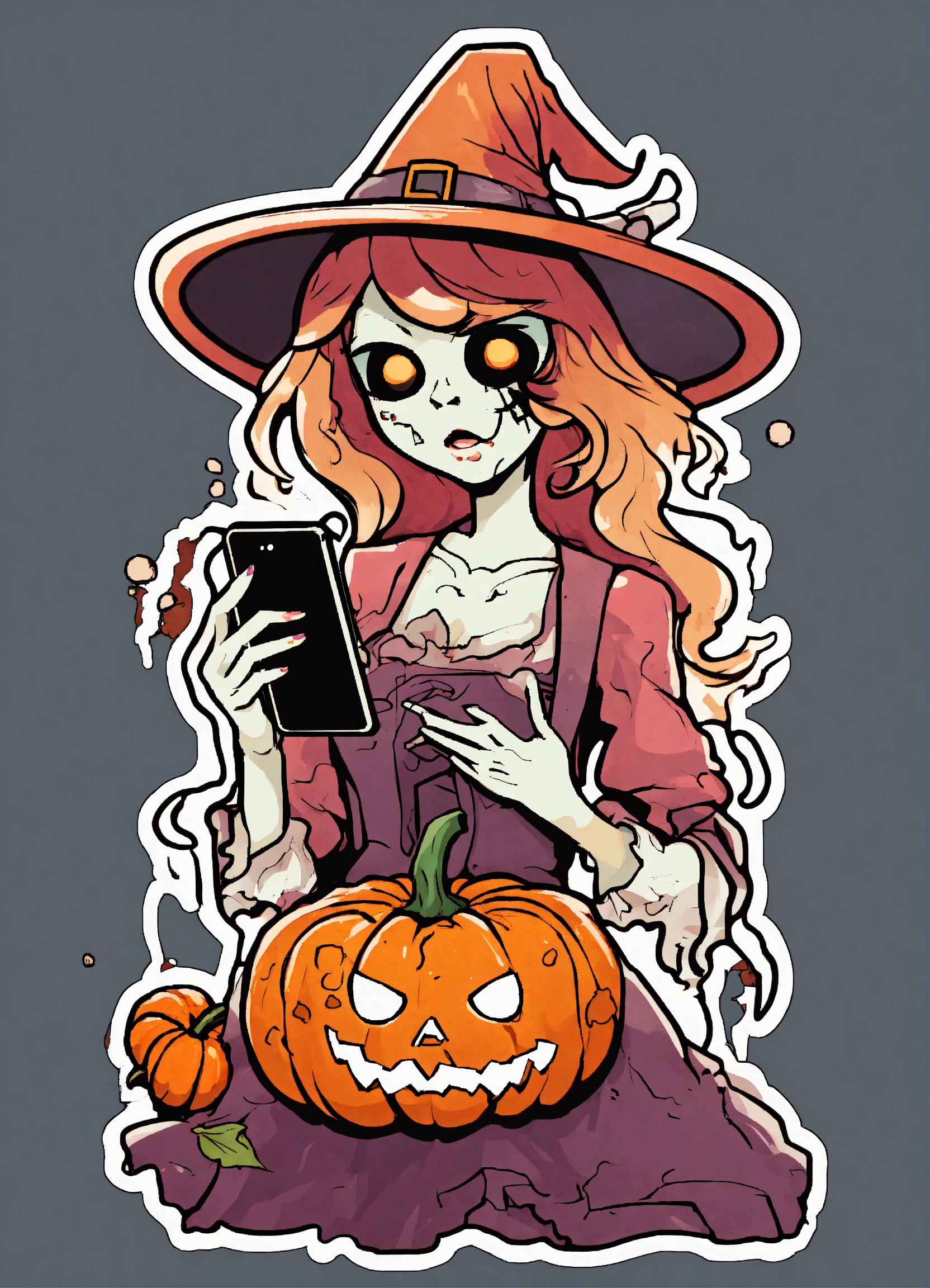 Sticker, outline art, minimalist, white background, a female zombie wearing witch hat, taking a selfie with a pumpkin, complete with a crumbling smartphone, full body, stir, contour, colorful, vector, kawaii