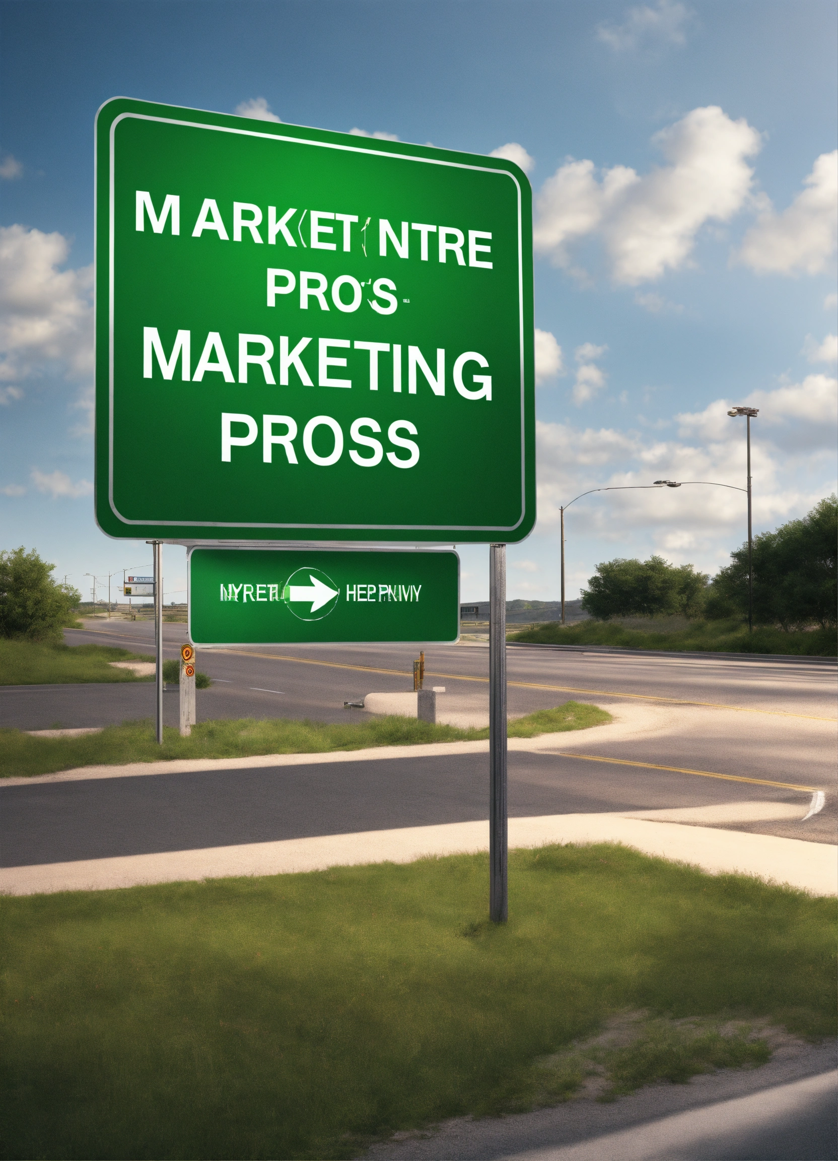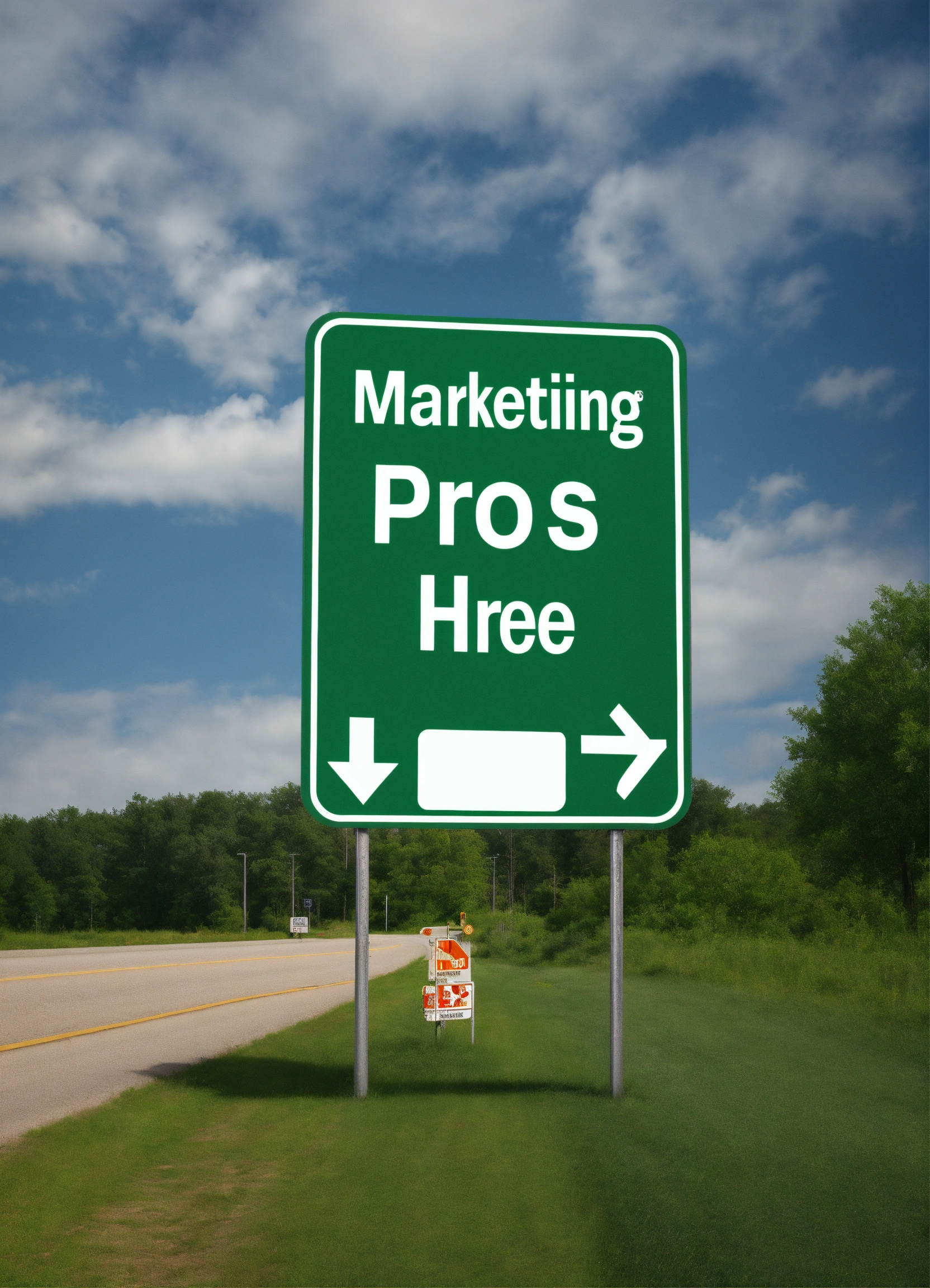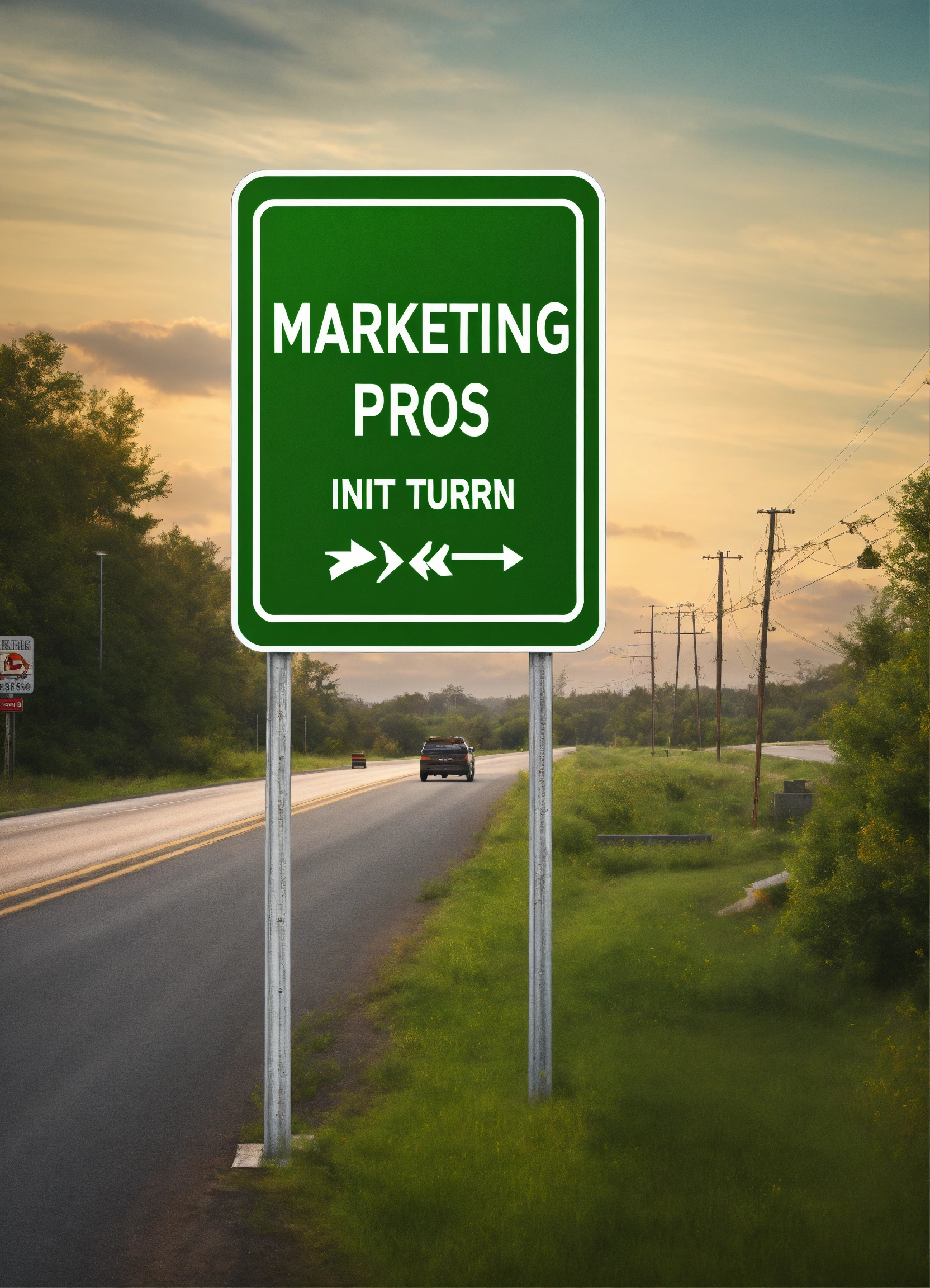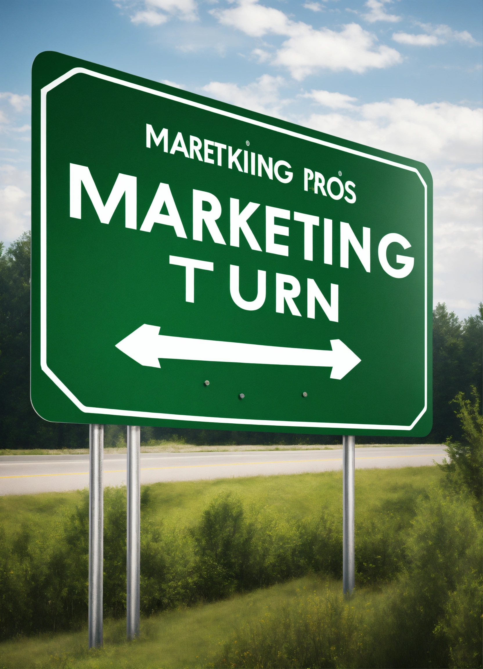Large green rectangular interstate road sign says "marketing pros turn here" in text, 8k, art station, 169, hyperrealism, photorealistic, aluminum posts
