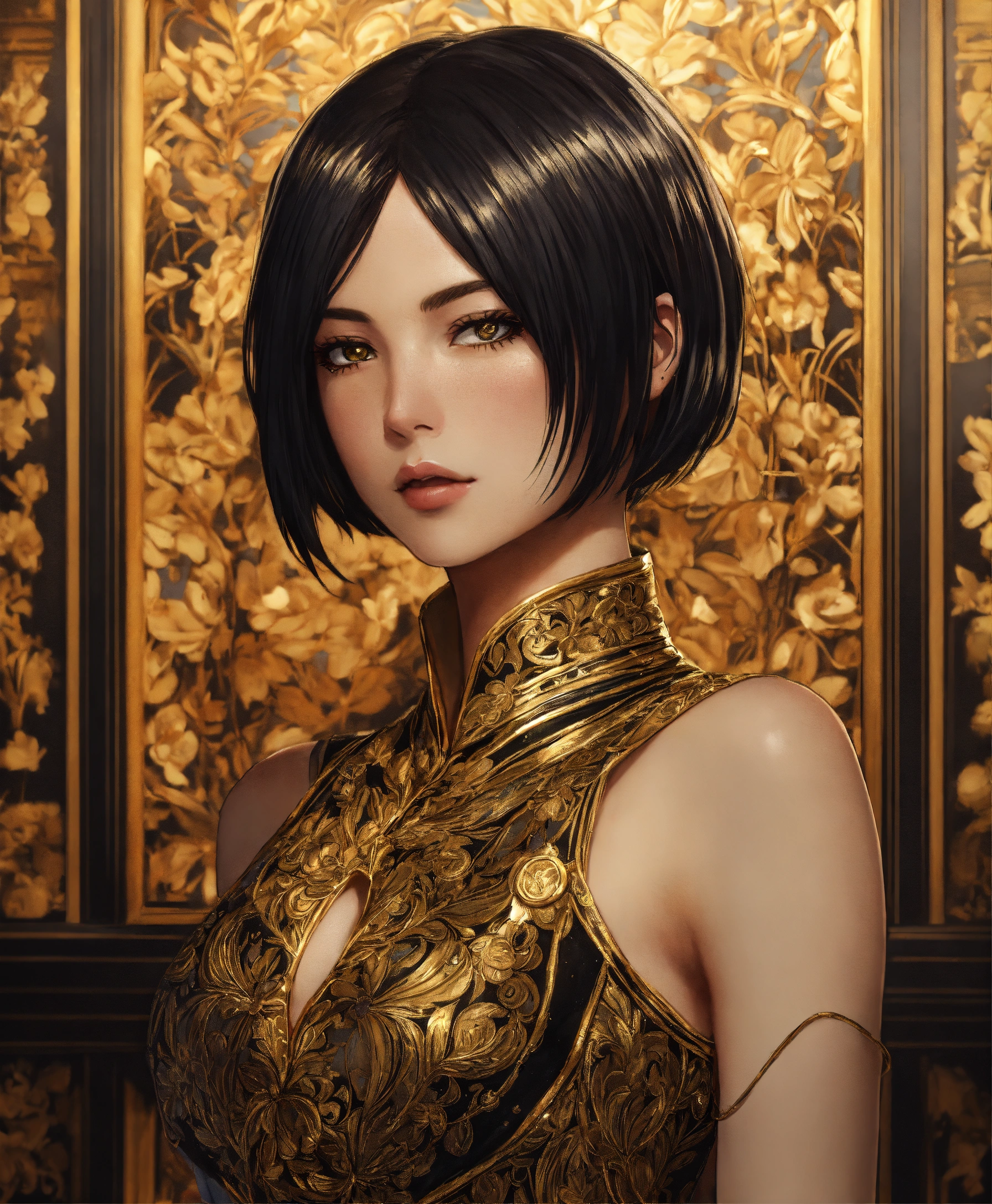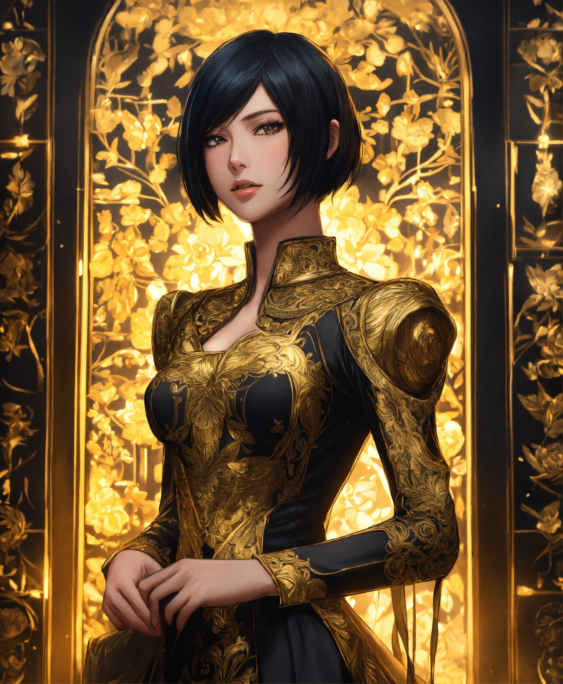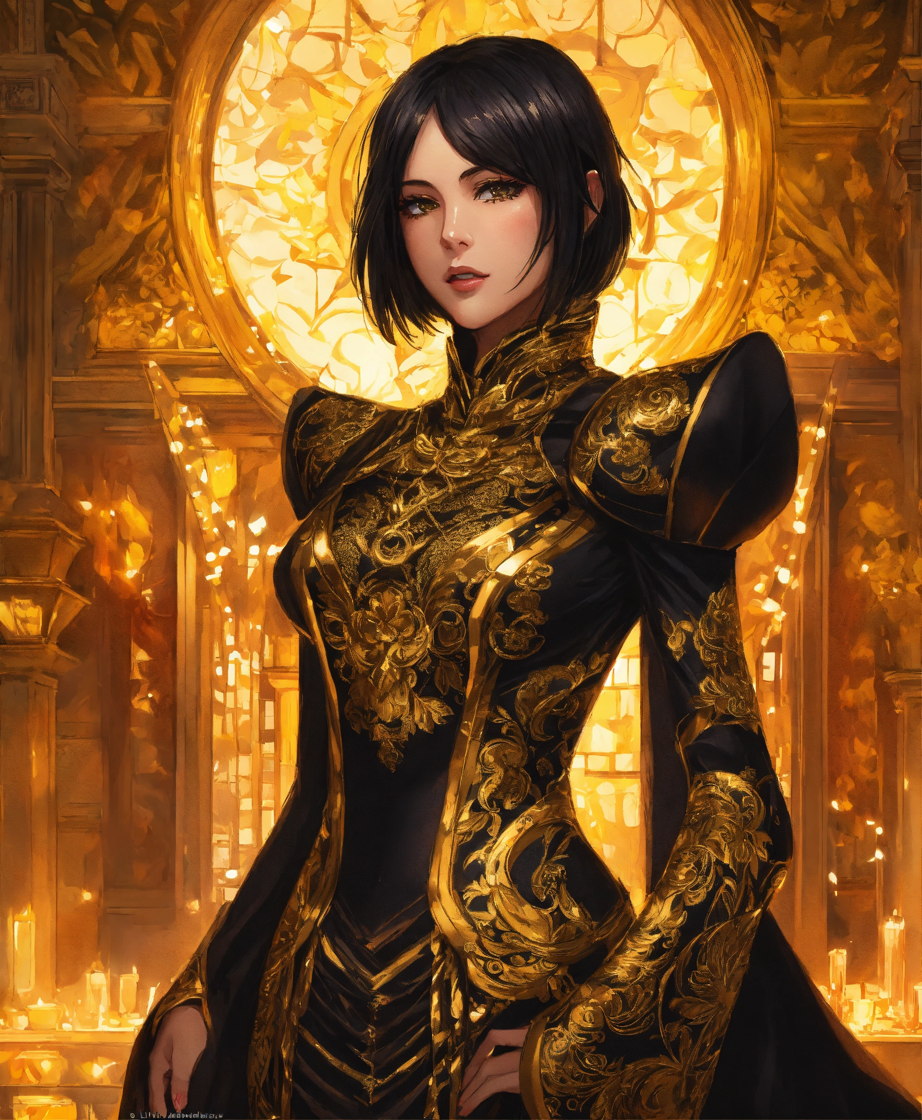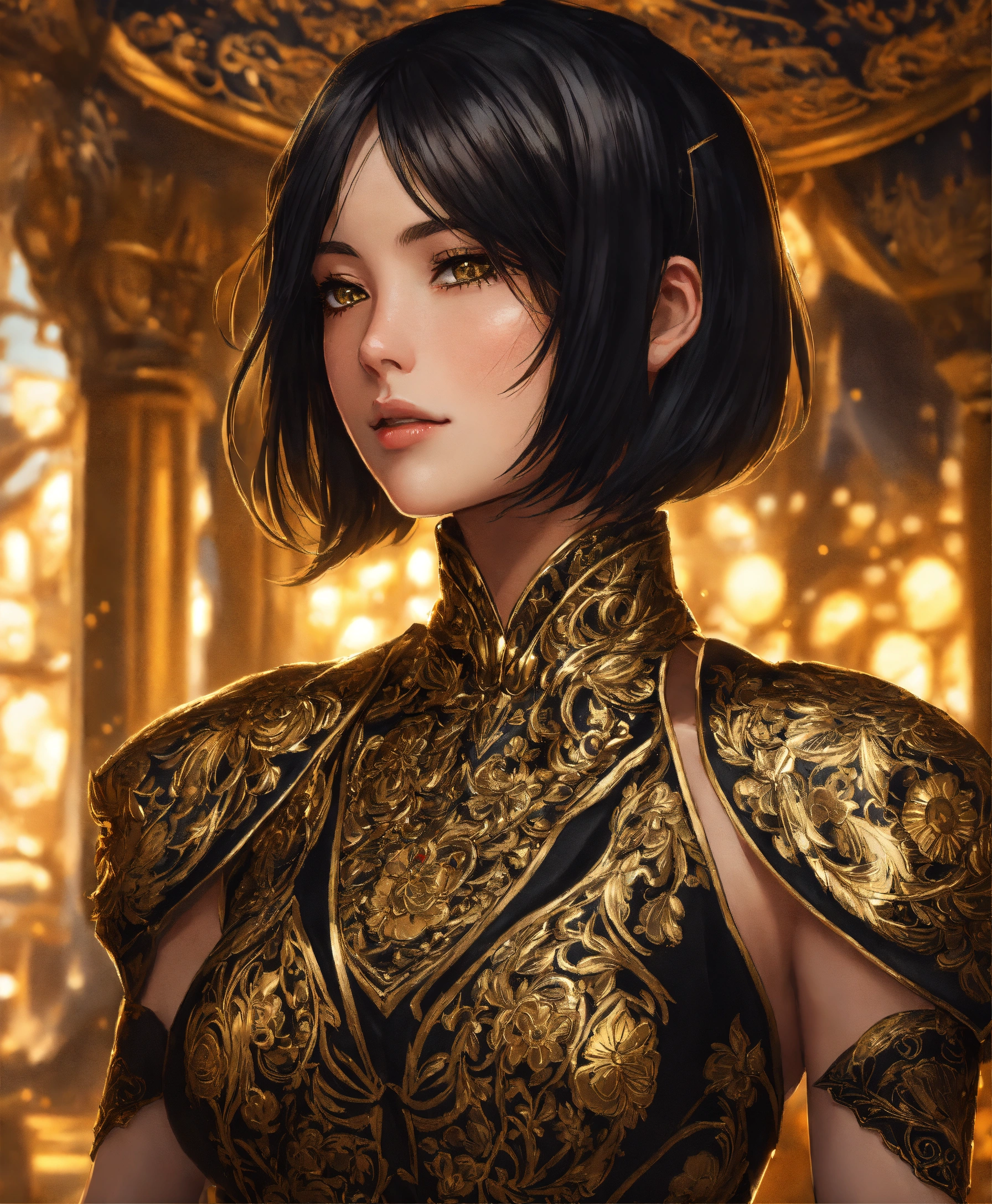 Mikasa ackerman in a detailed intricate gold and black dress, by olivia de berardinis art style, 8k, stunning intricate details