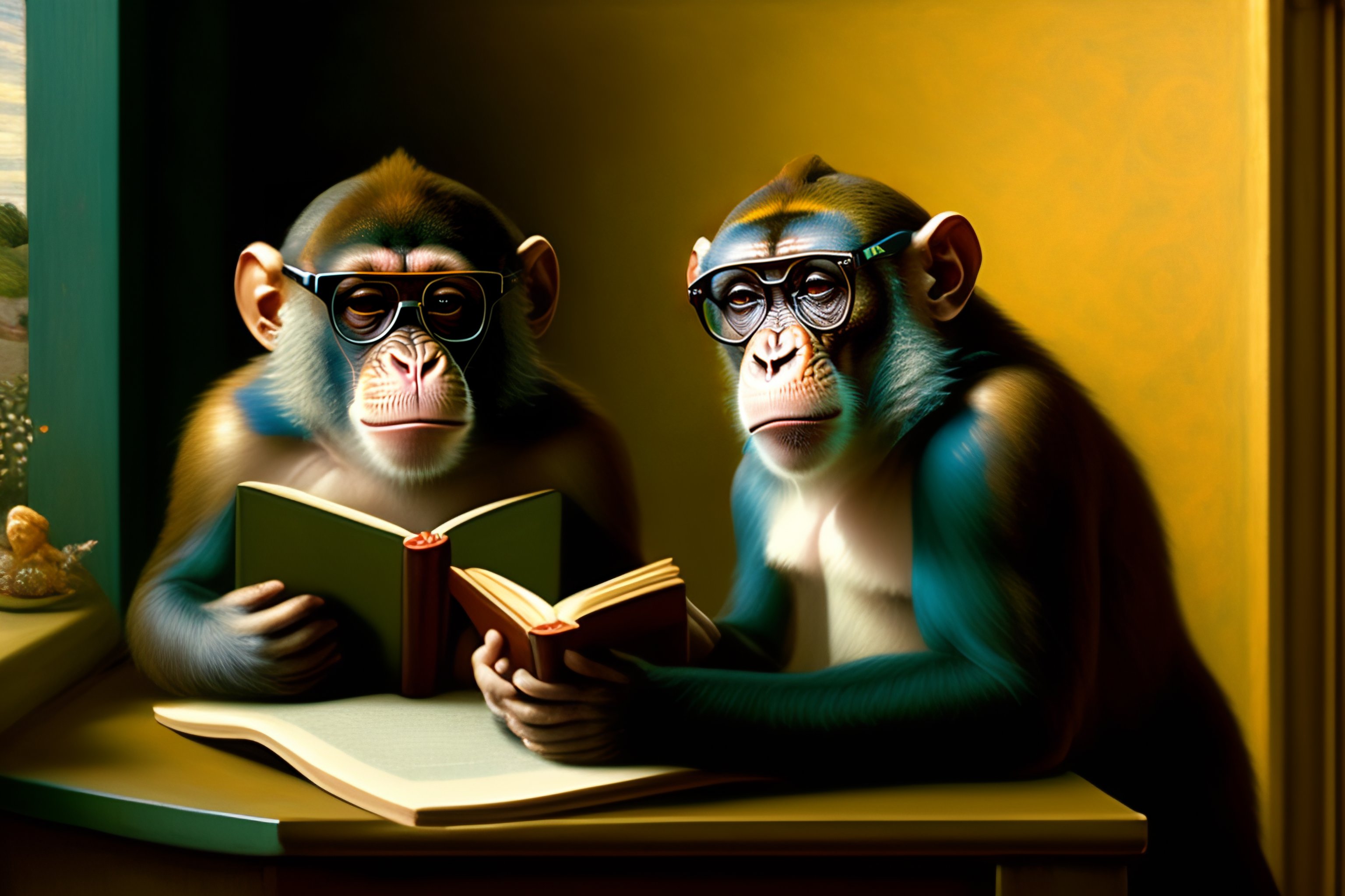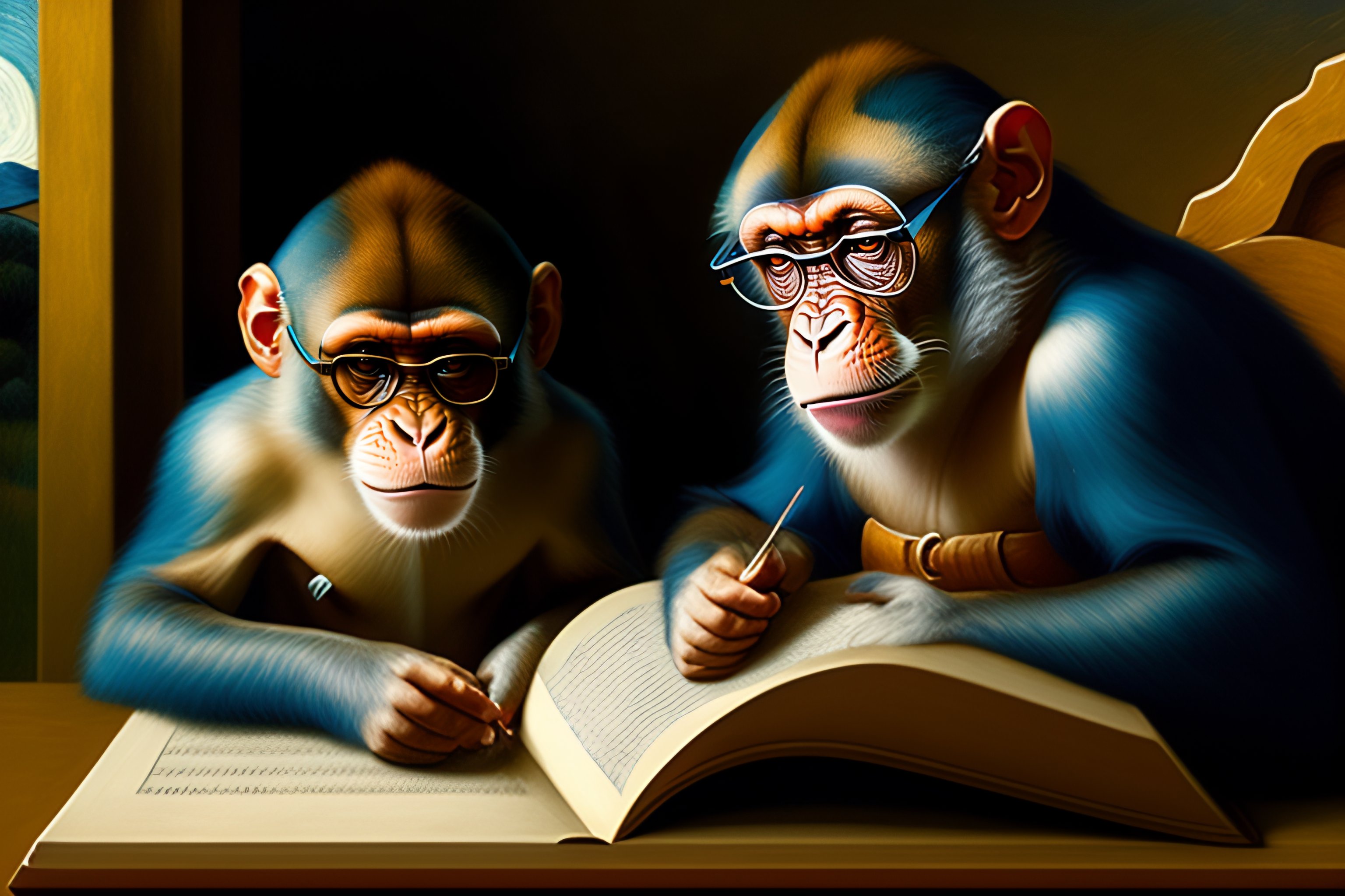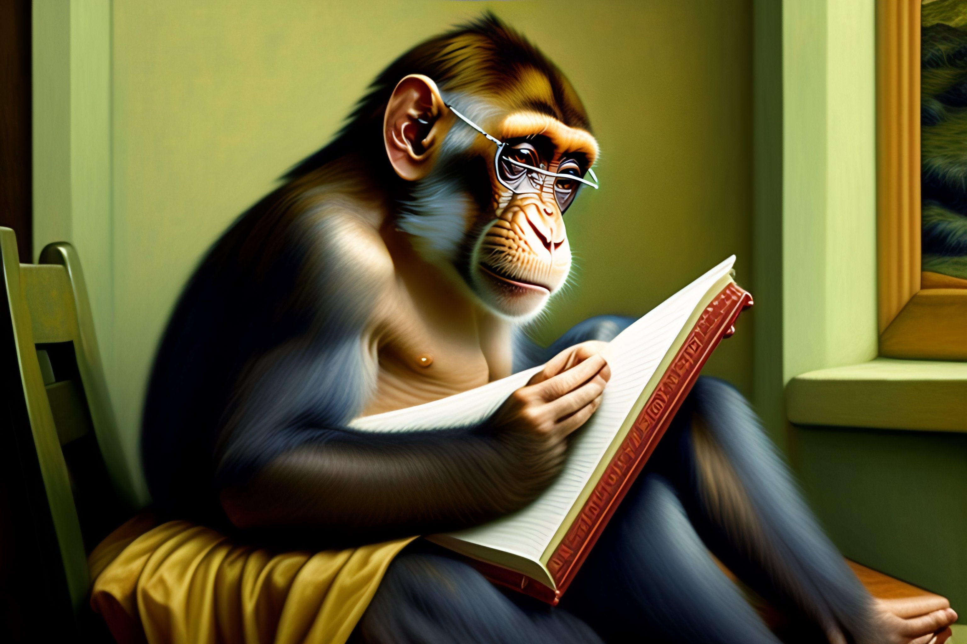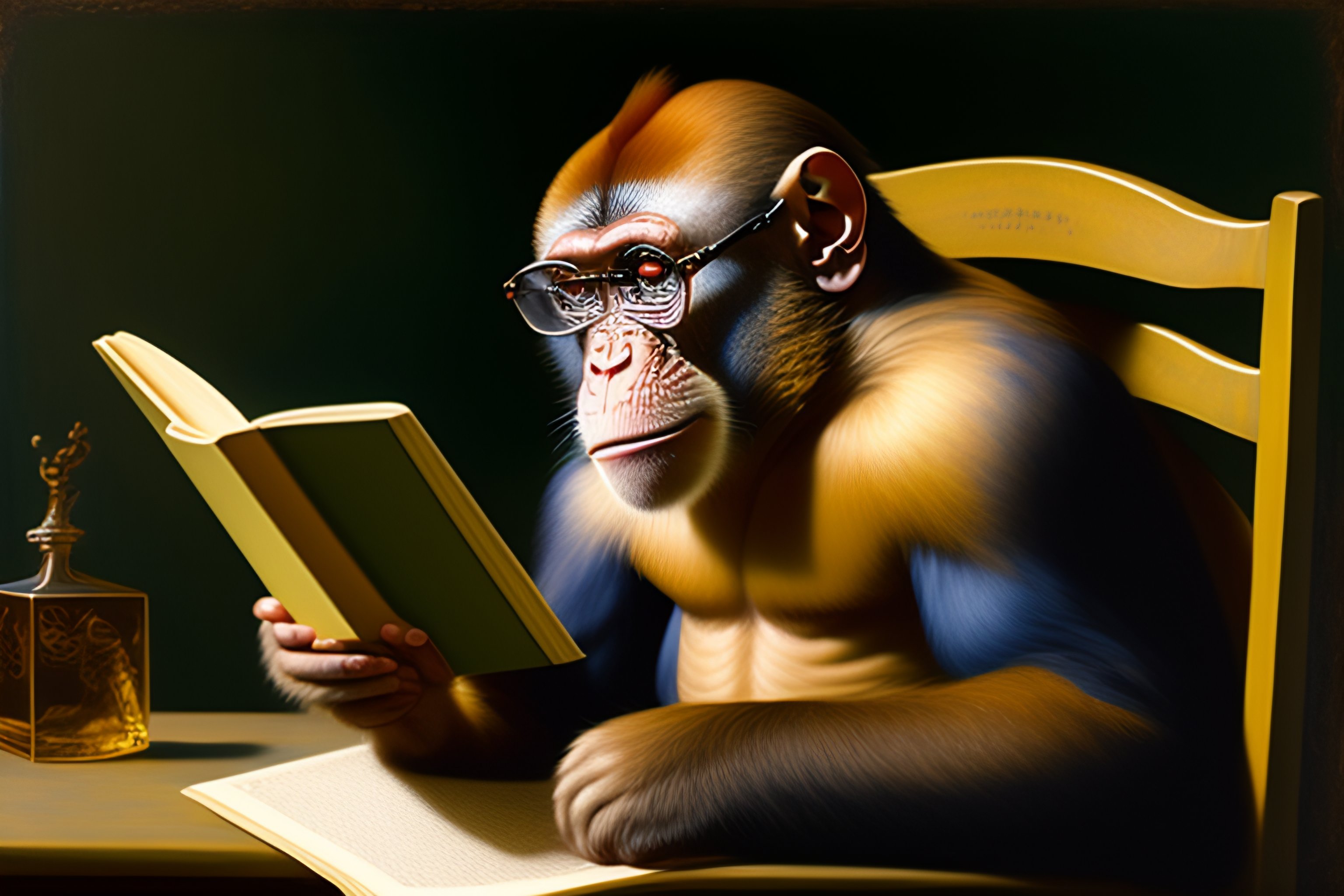 Monkey reading a book with glasses renaissance painting