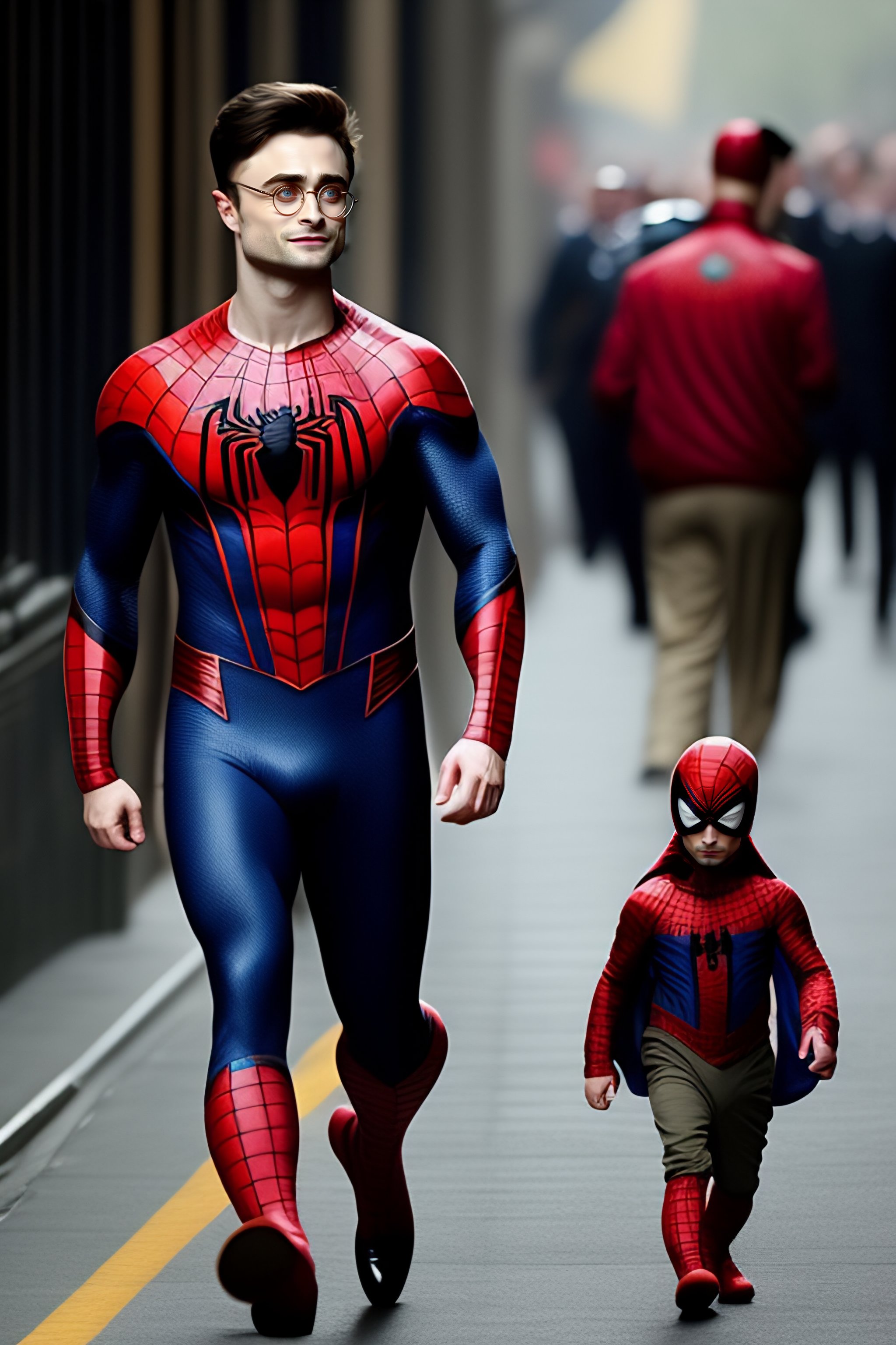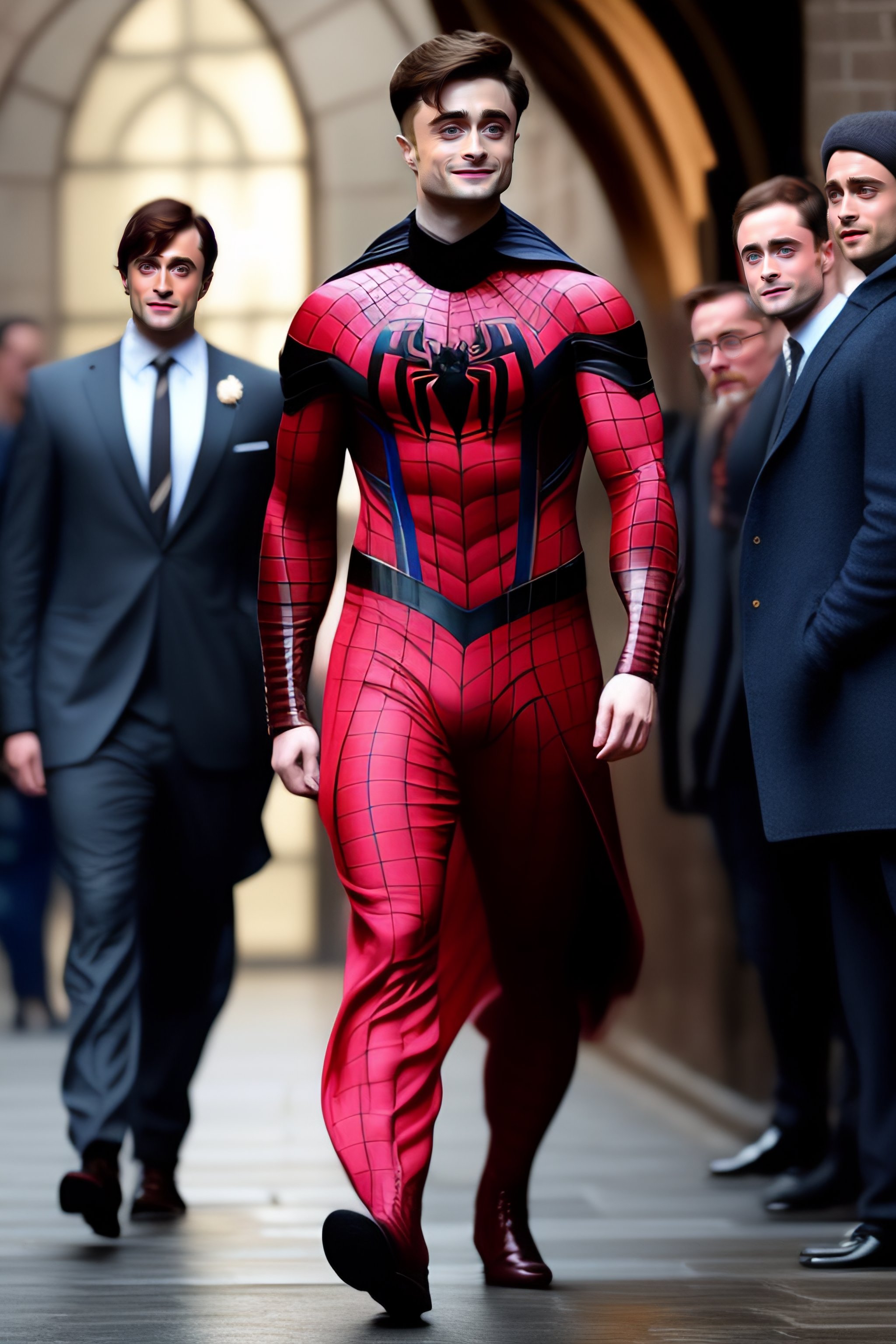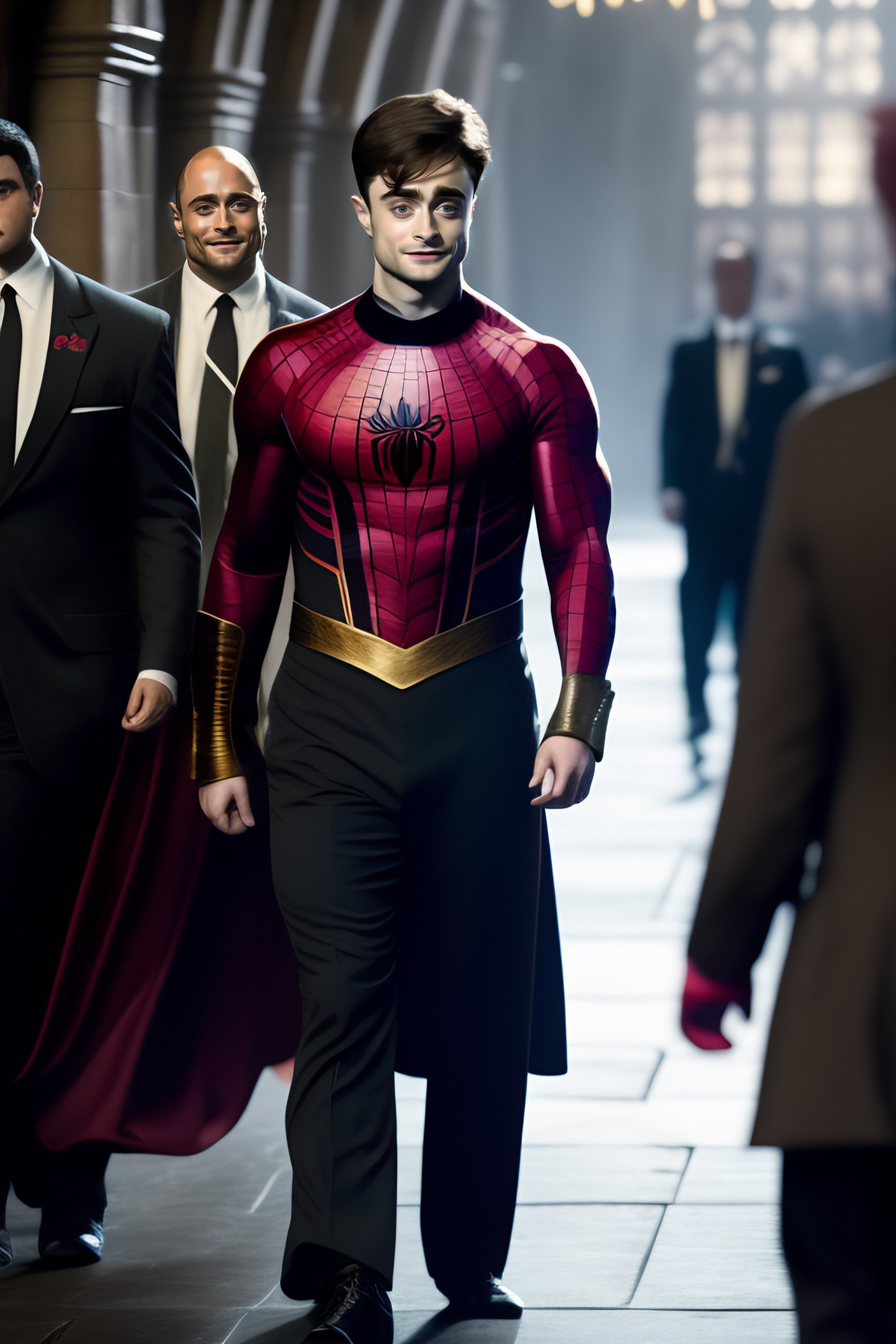 Daniel radcliffe in spider-man costume and walking around hogwarts