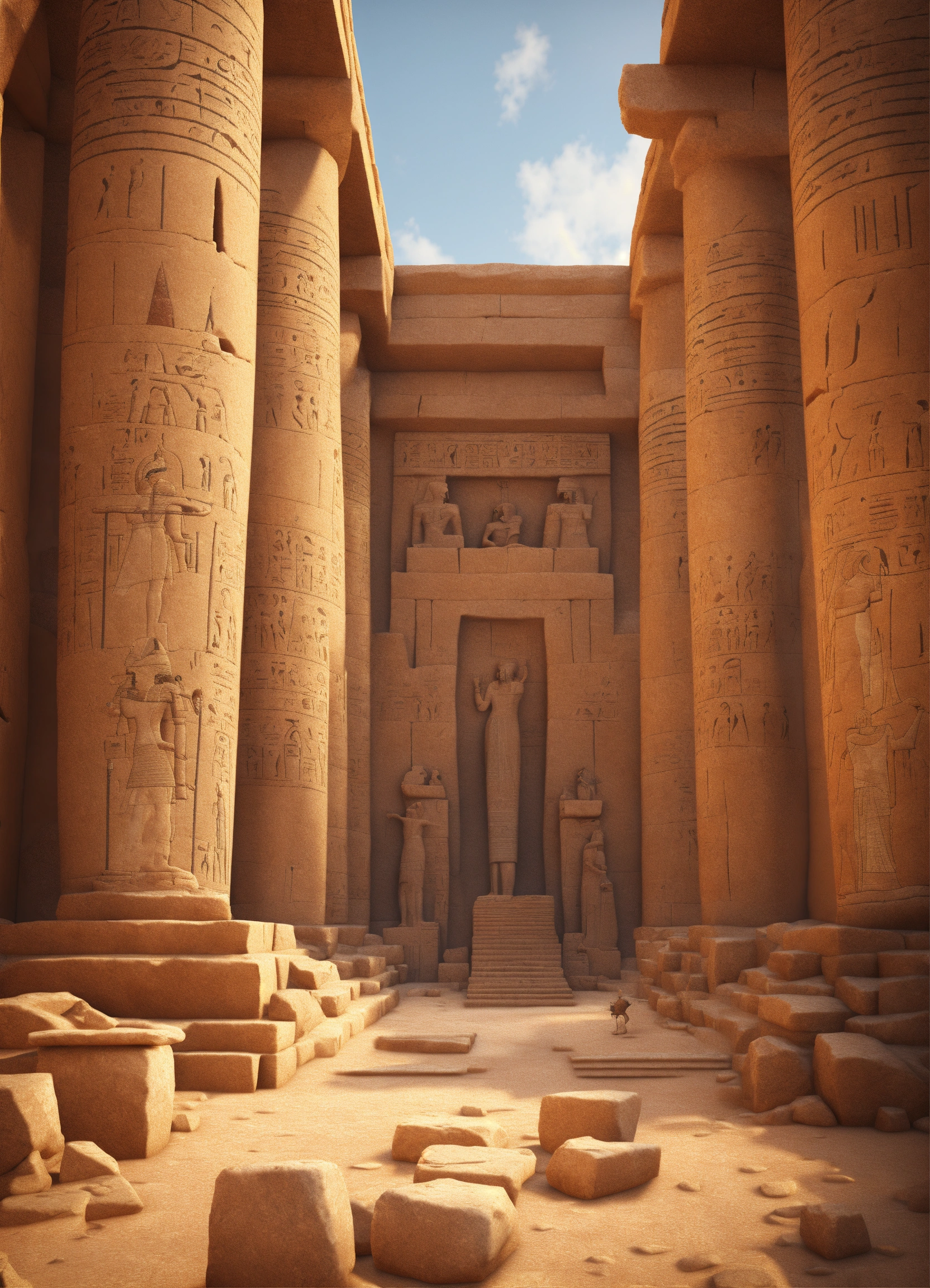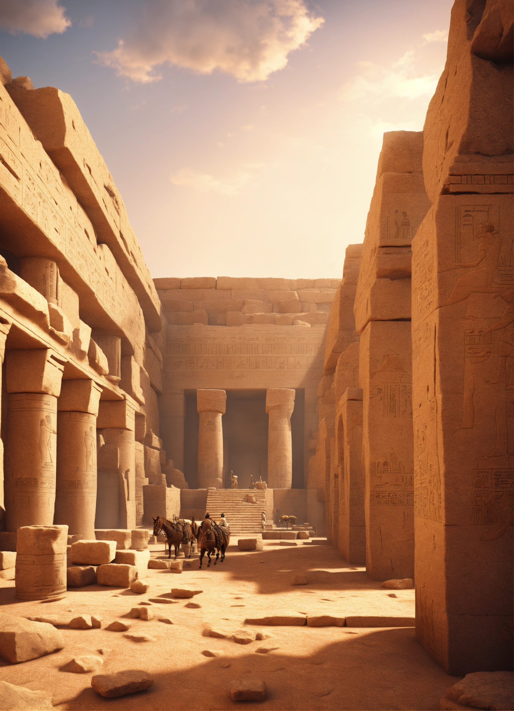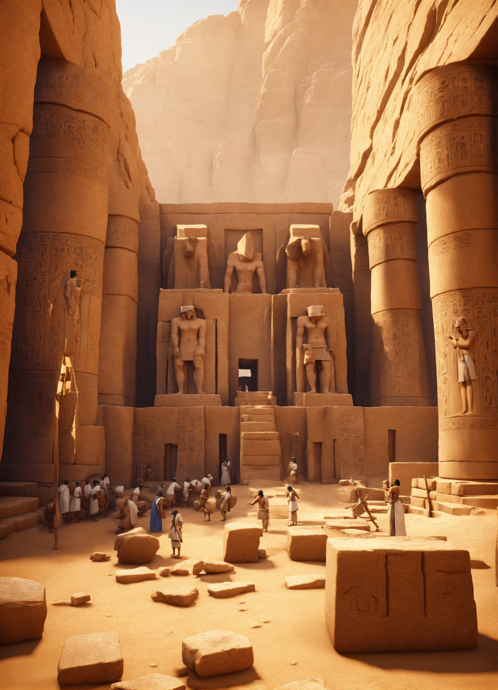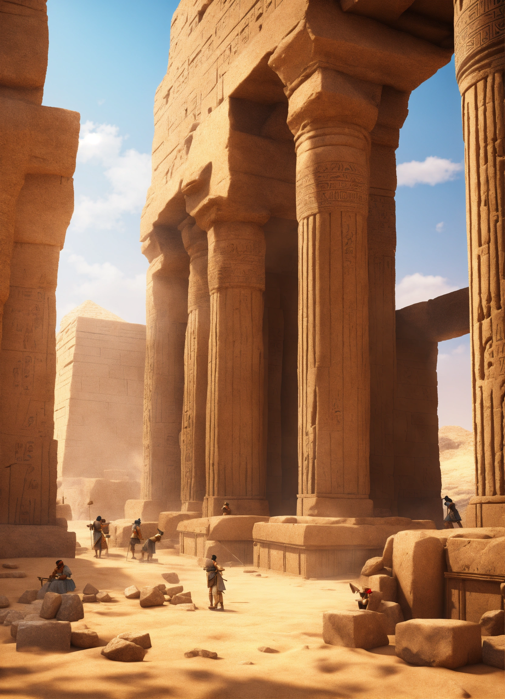 An epic fantasy scene in ancient egypt featuring how the workers cut large sandstone blocks. 3 d modeling, sharp details, digital art, cinematic view.