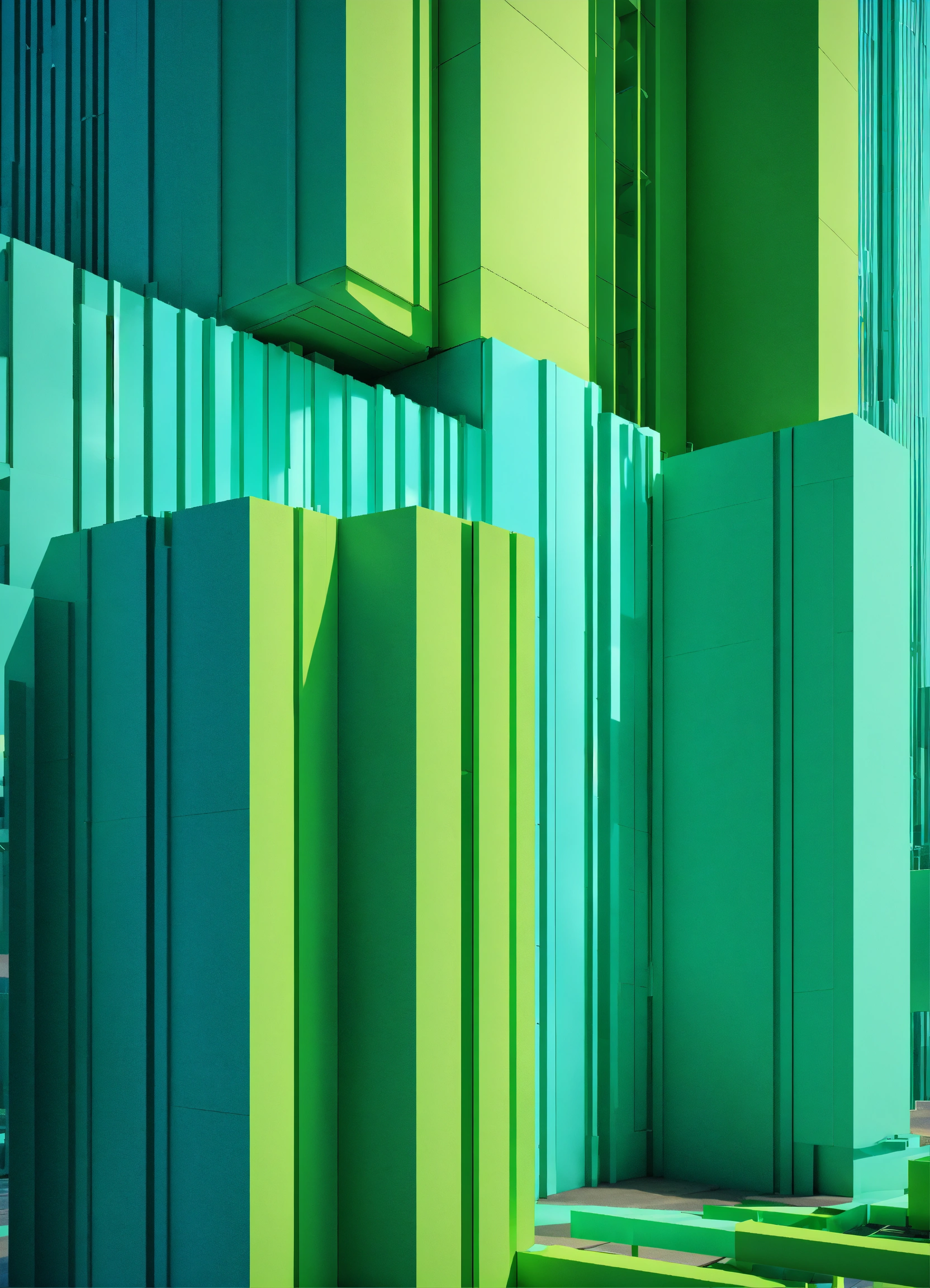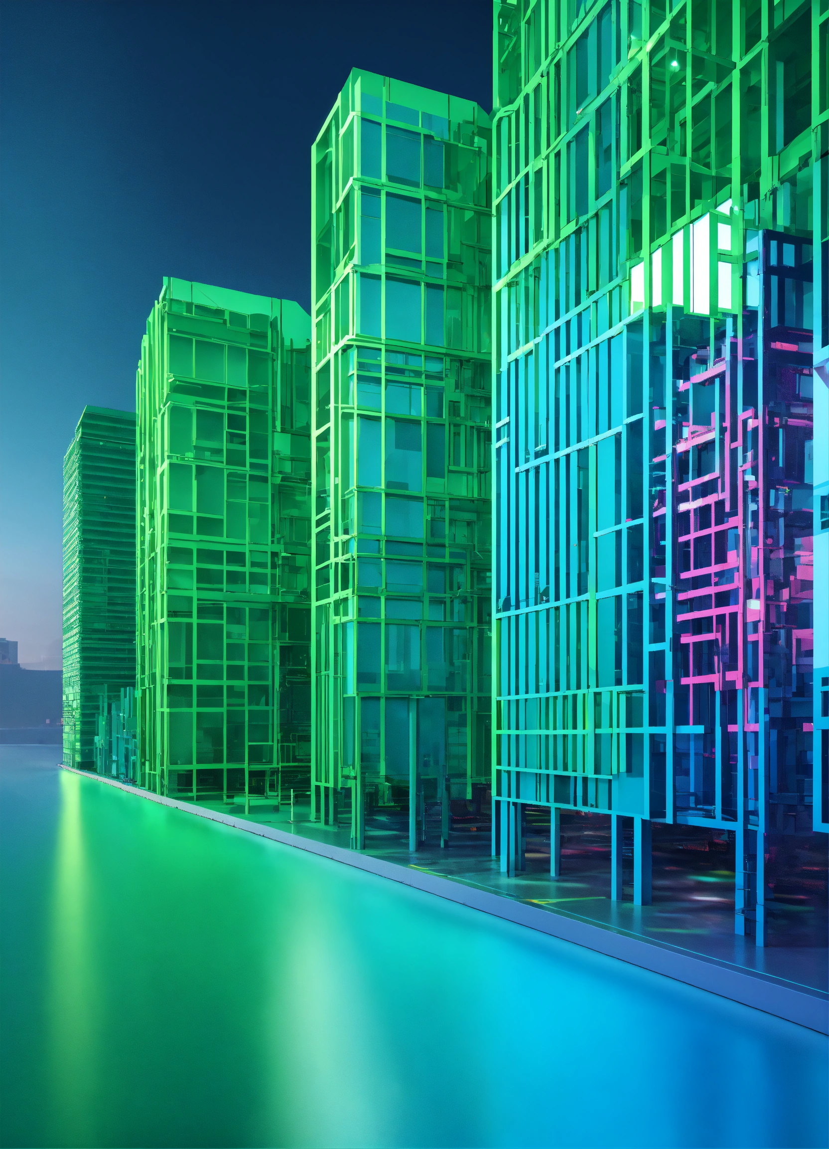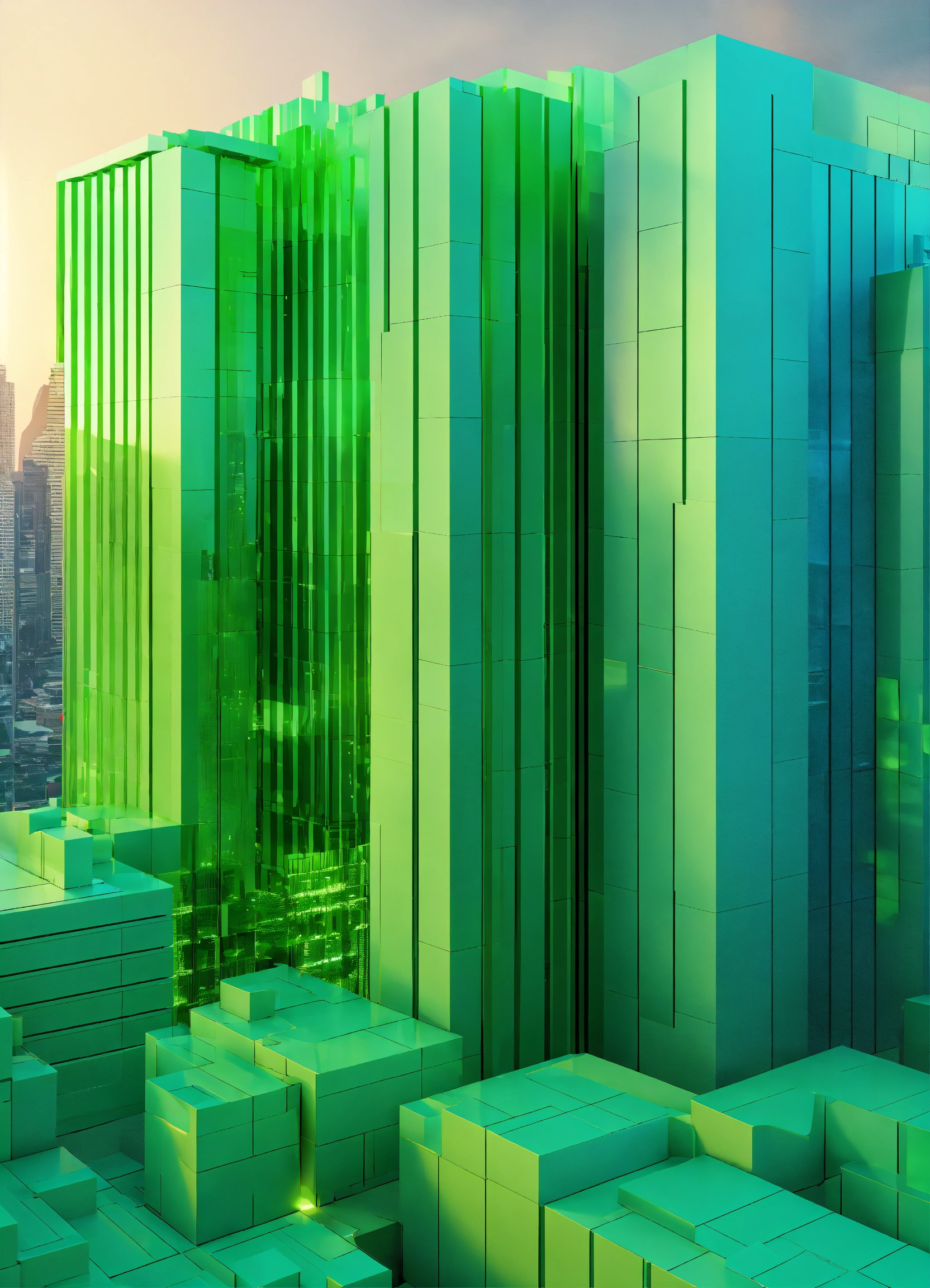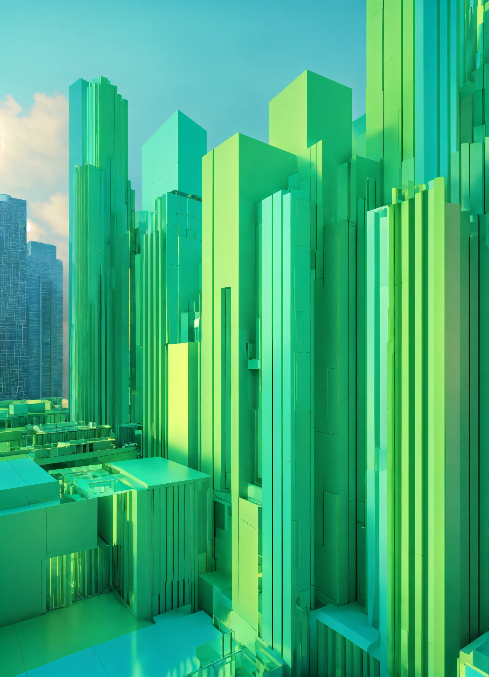 3d geometric skyscrapers, green colors, unsplash wallpaper, 3d render, abstract background, light blue, saturated bright colors, lights and shadows