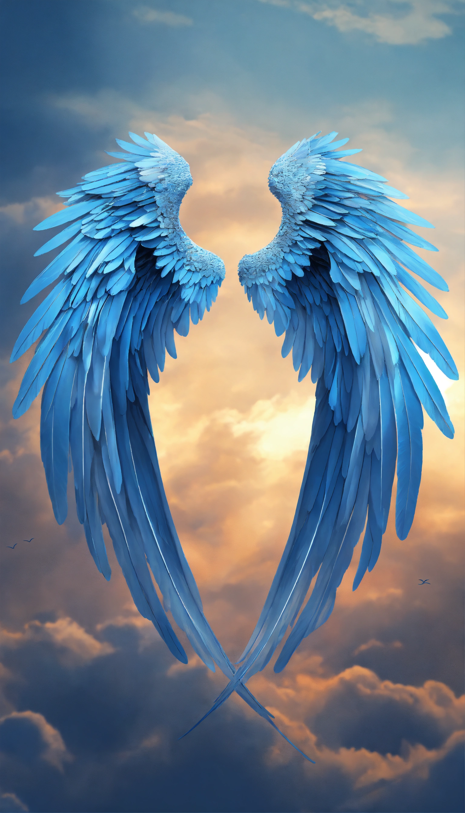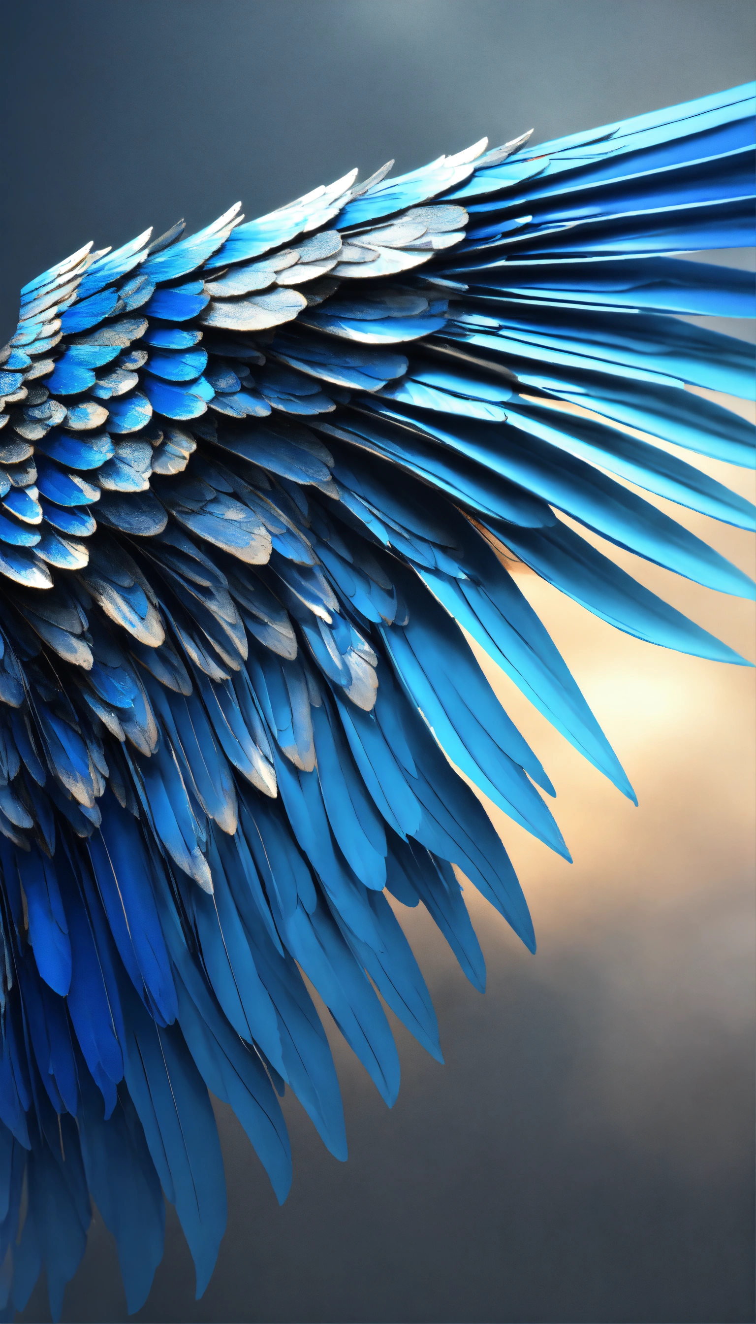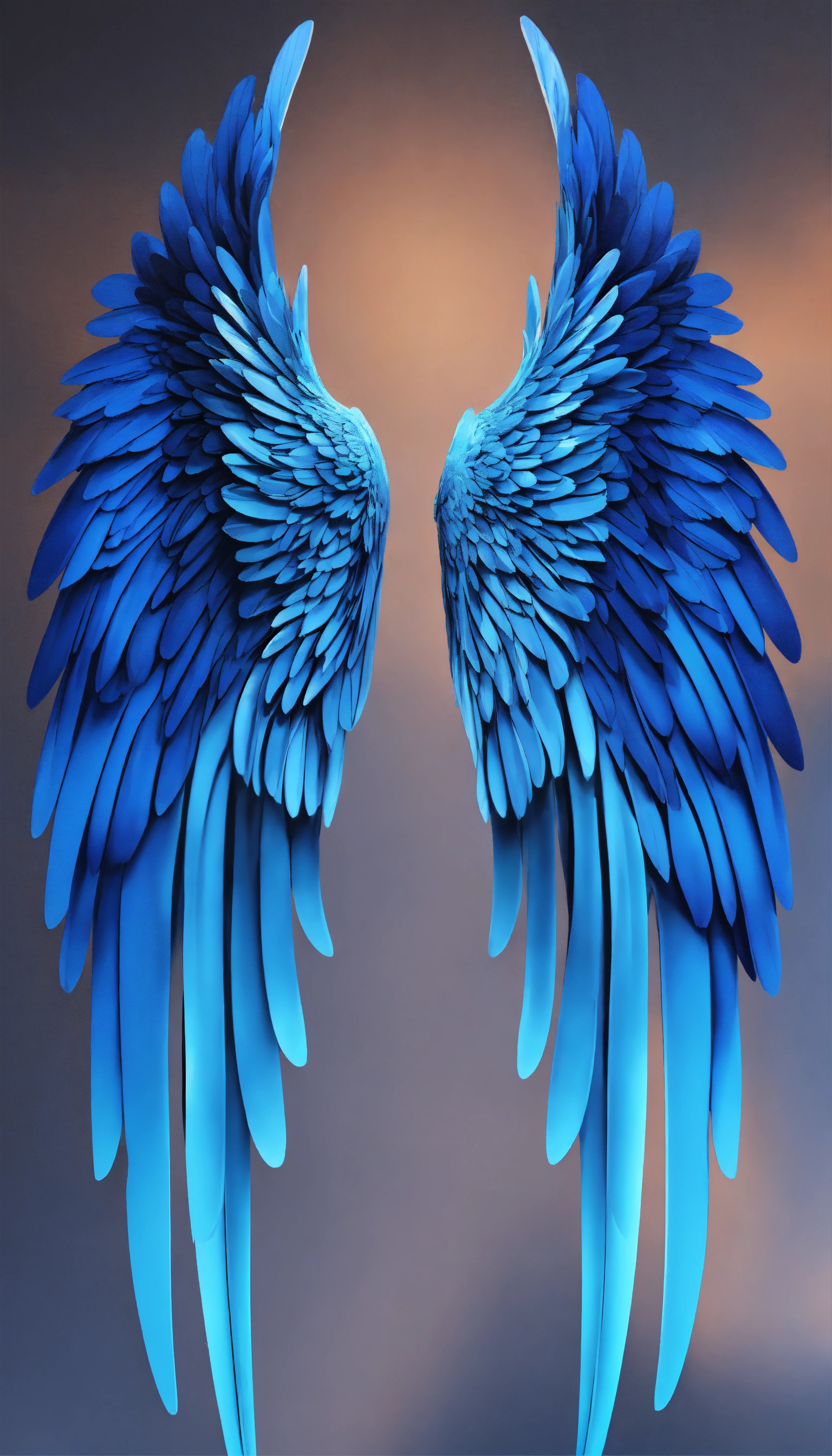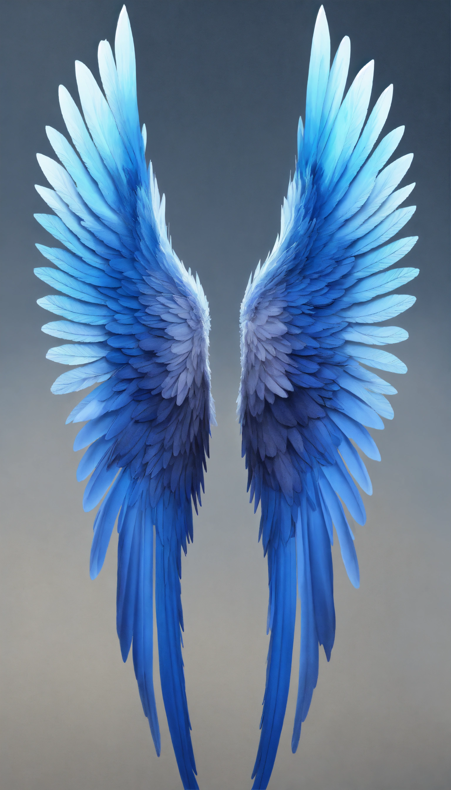 Beautiful and perfect angel wings of strong blue and light blue color and abstract 0late color. just a pair of big, full blue gradient color wings. abstract wings. wings with a decoration in shades of blue and silver. small wings complete both the right wing and the left wing, 3d, masterpiece. hd. realism. high resolution. high quality. digital art. 8k