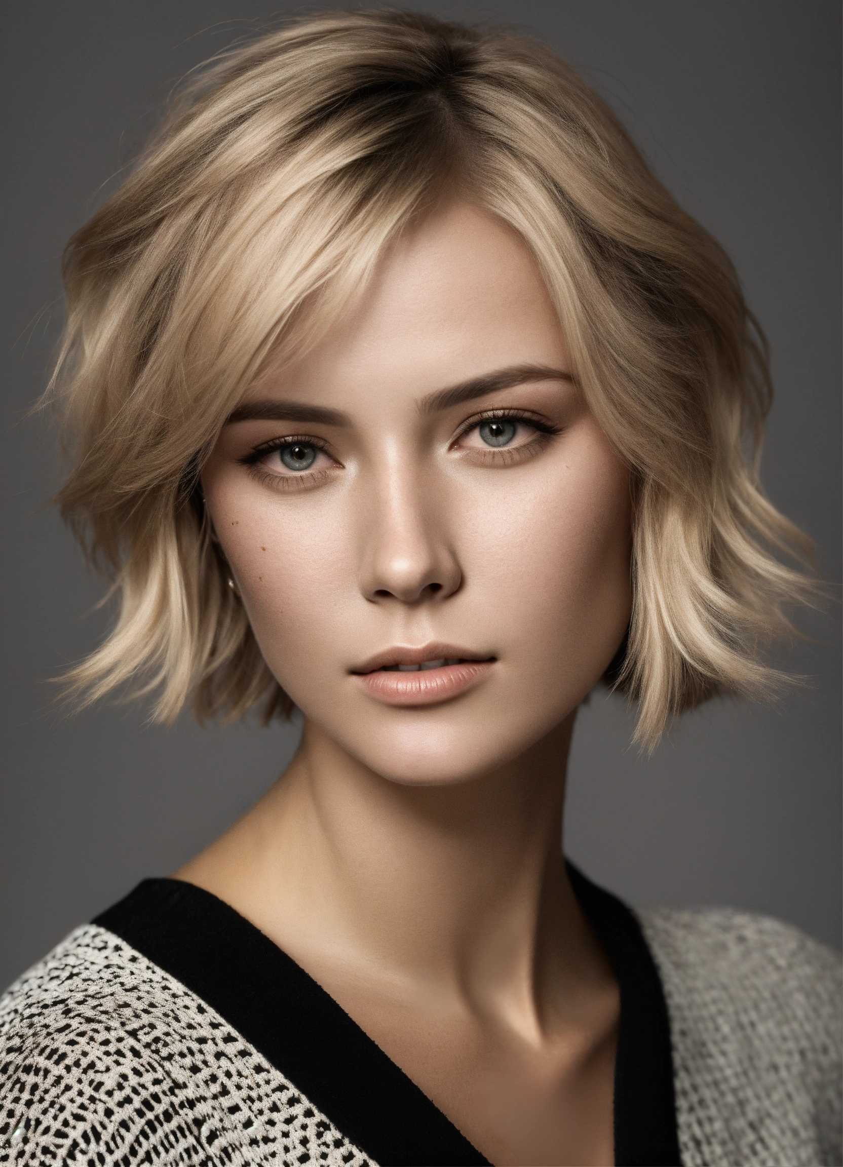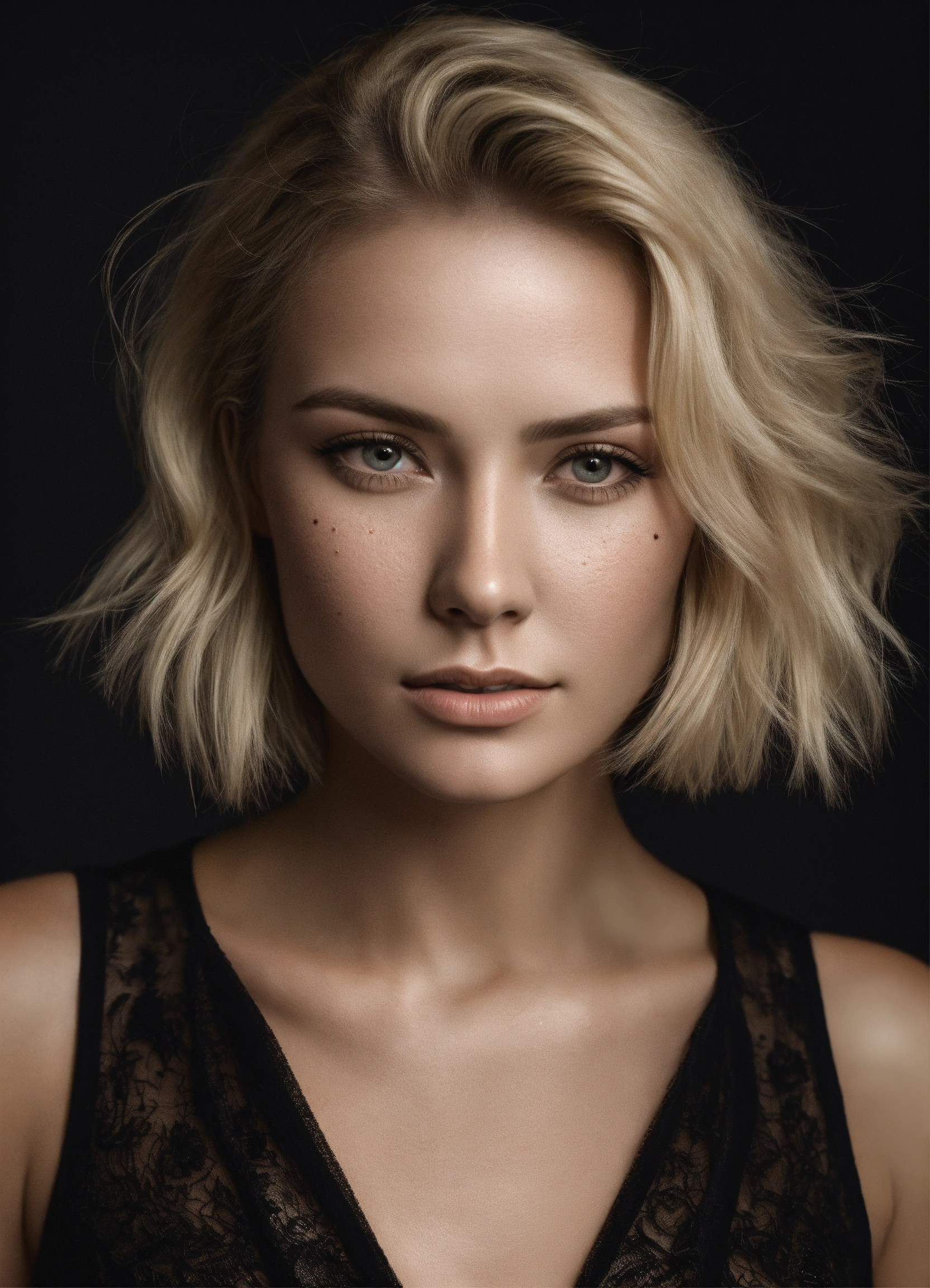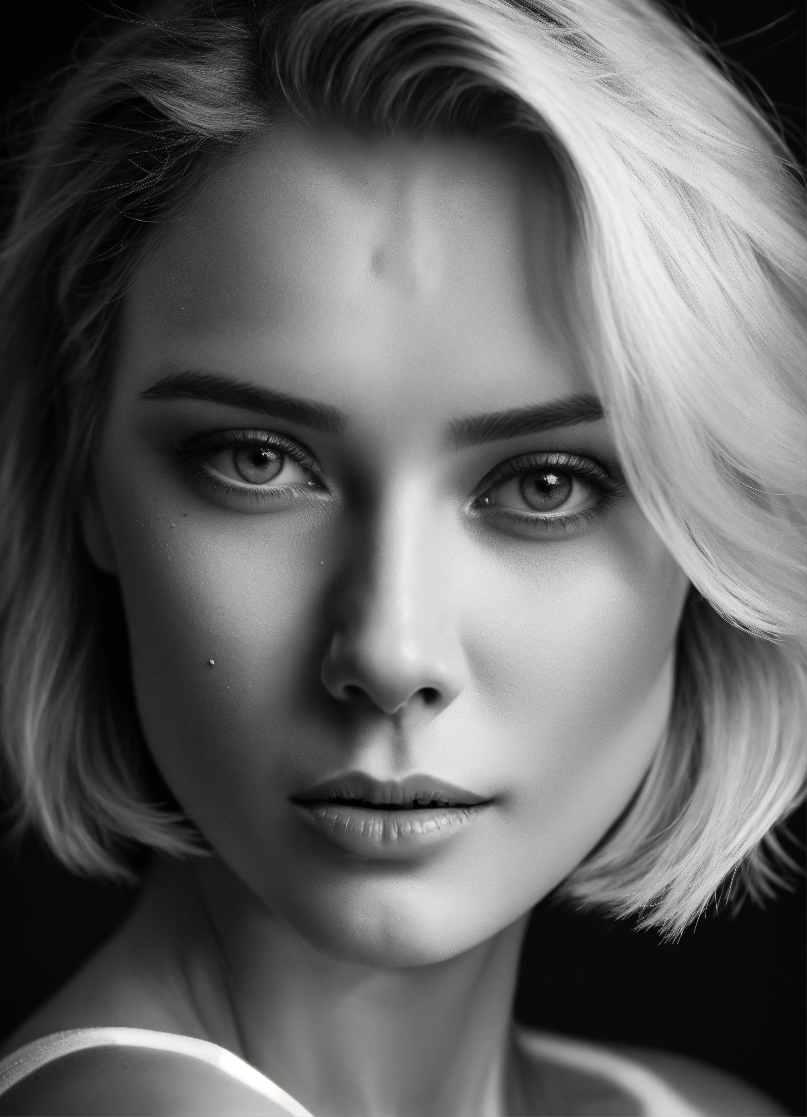 Photo portrait of a blonde woman, short hair, with light eyes, with a mole, with skin details, 16k image quality, ultra-realistic, black and white, professional photo studio, high definition, harcourt studio style, with a shadow on the face, black background