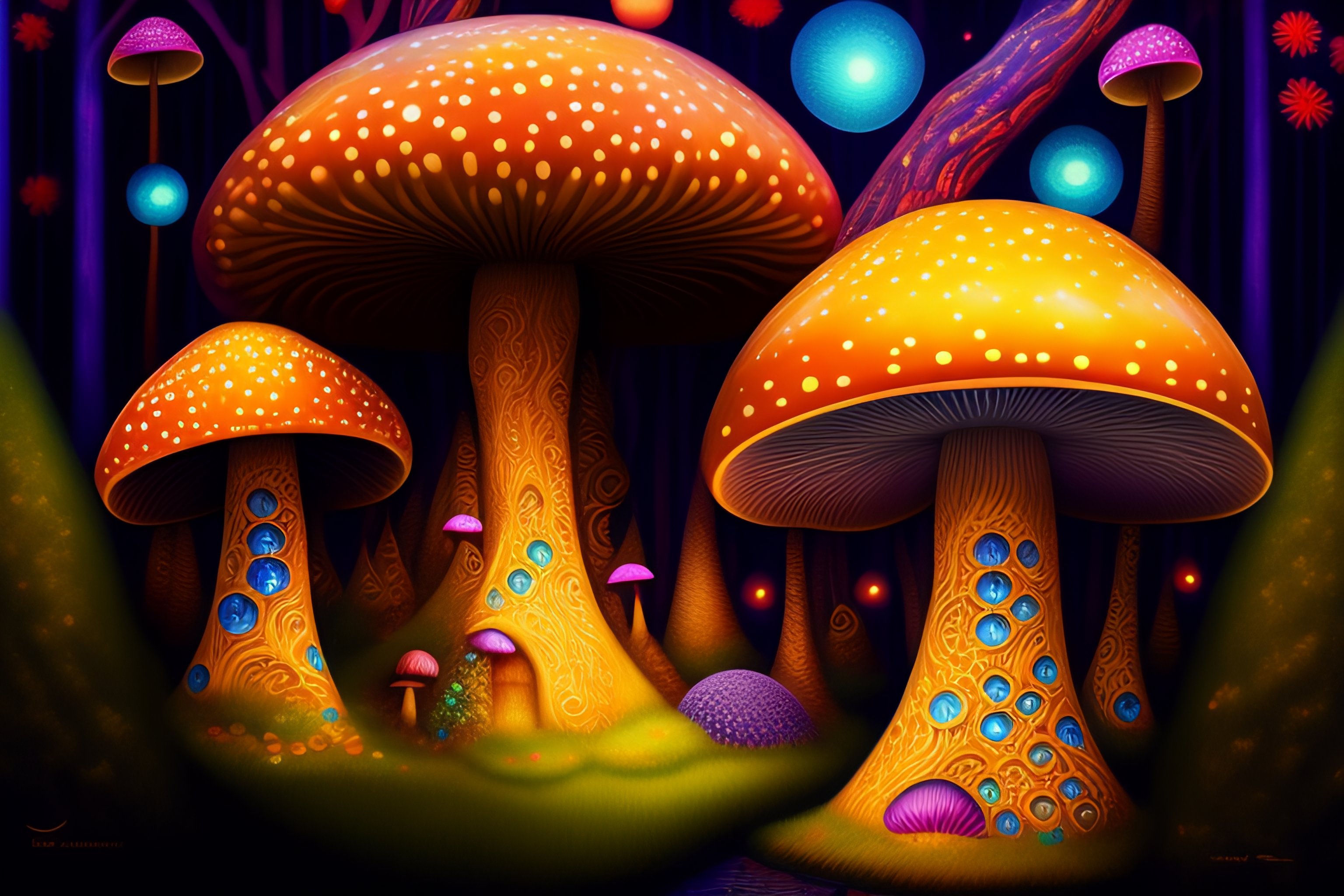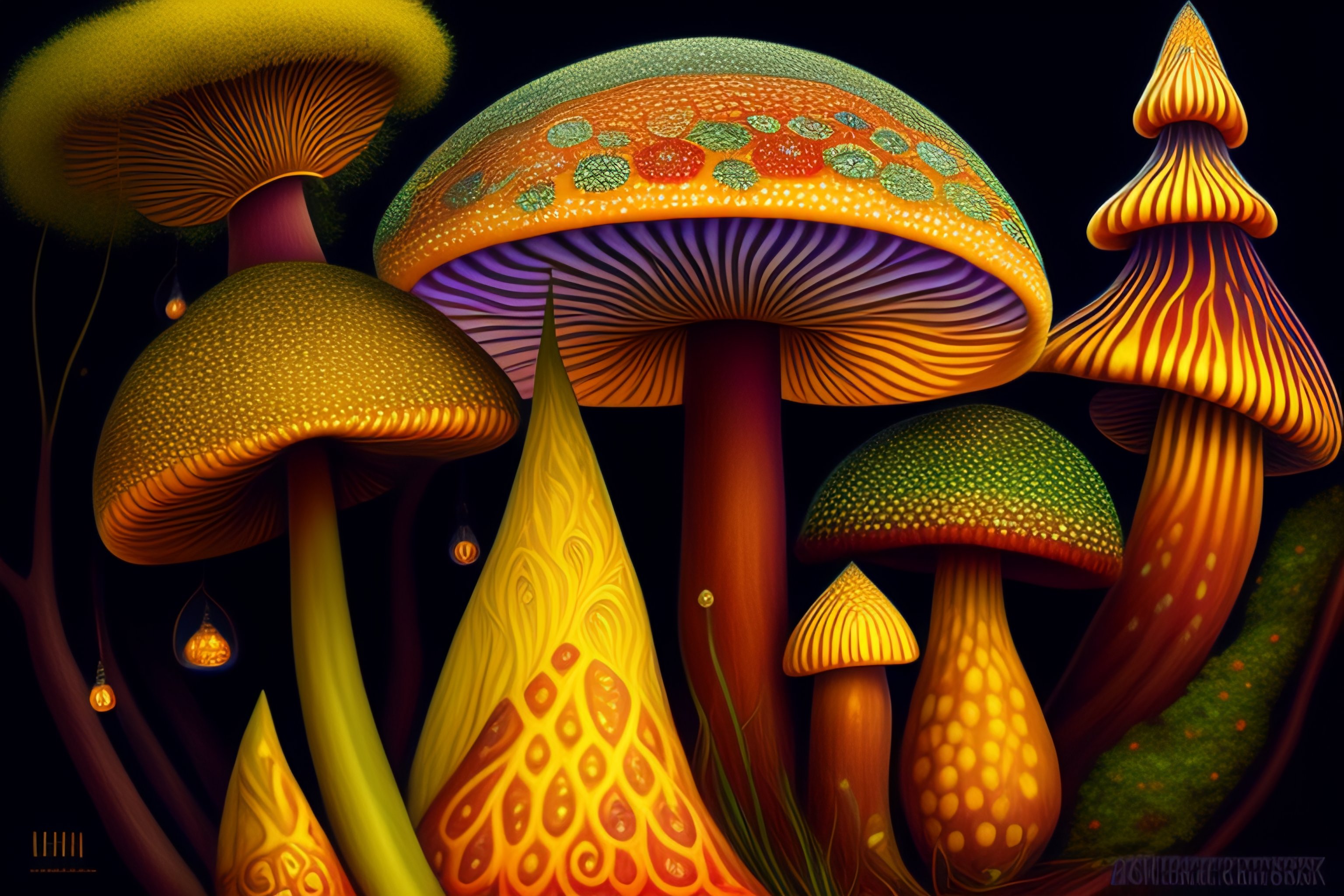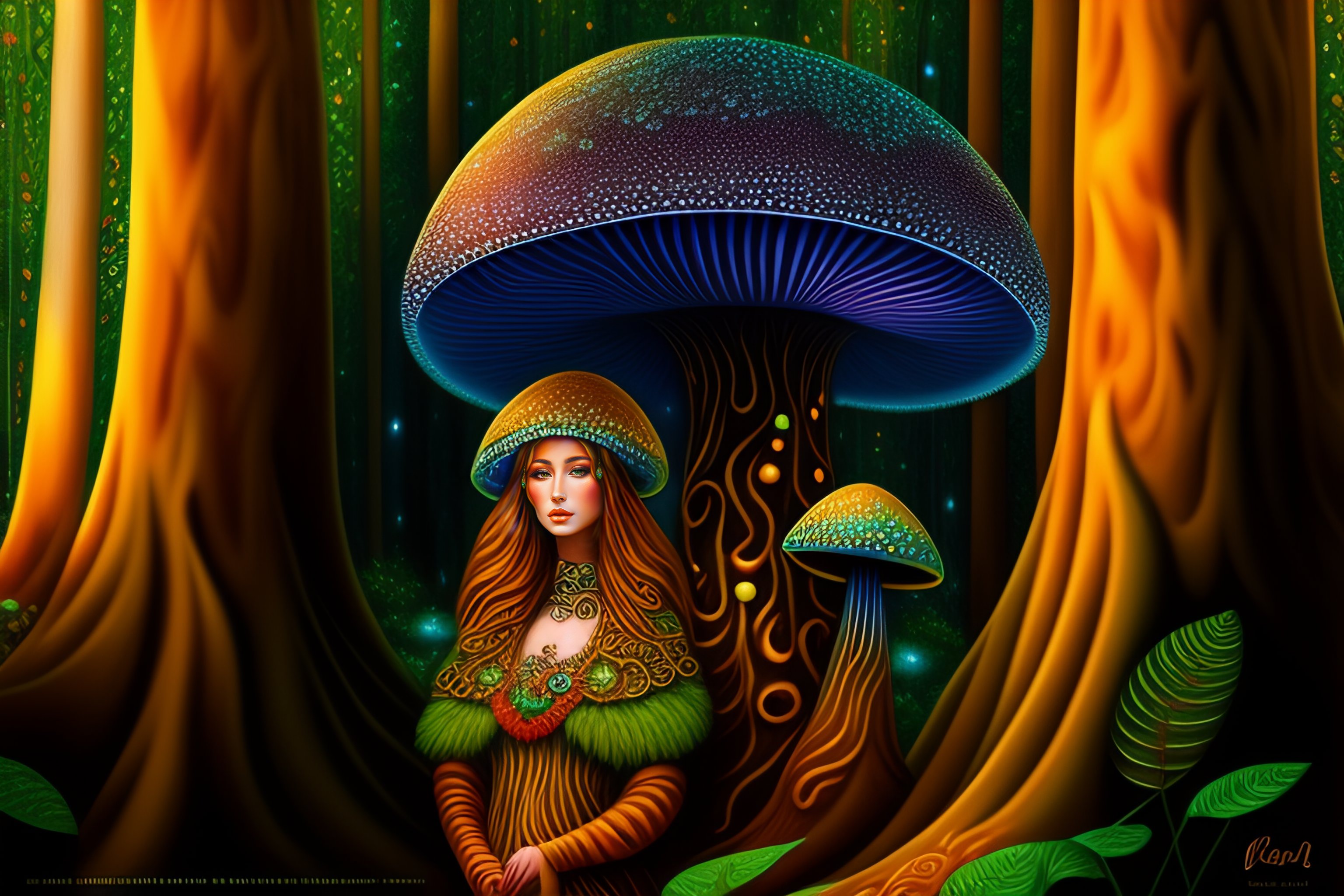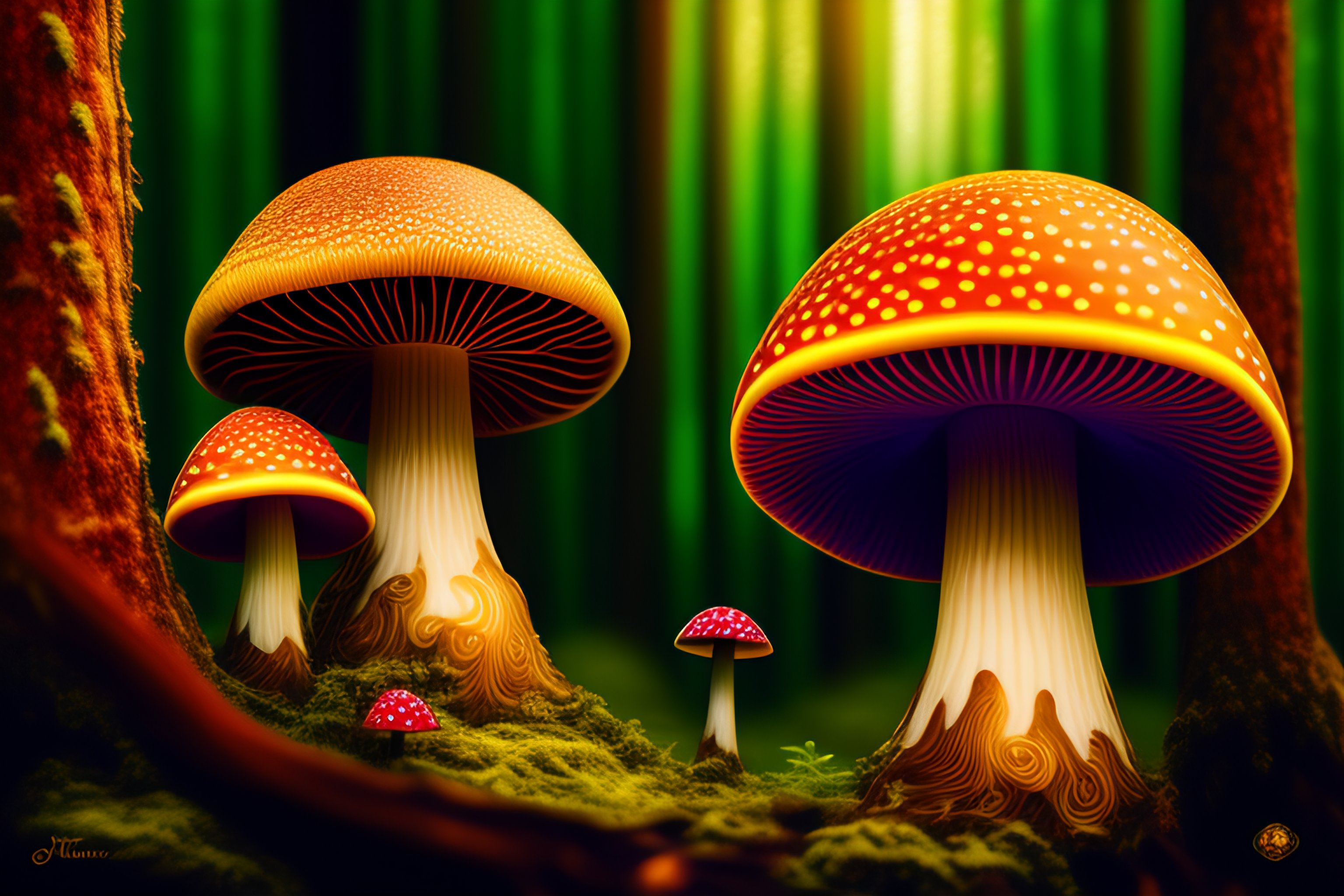 Mushroom gods in the enchanted forest, in the style of gustav klimt style futuristic color very detailed, very sophisticated, lots of mushroom, lots of jewels, futuristic and spatial touch