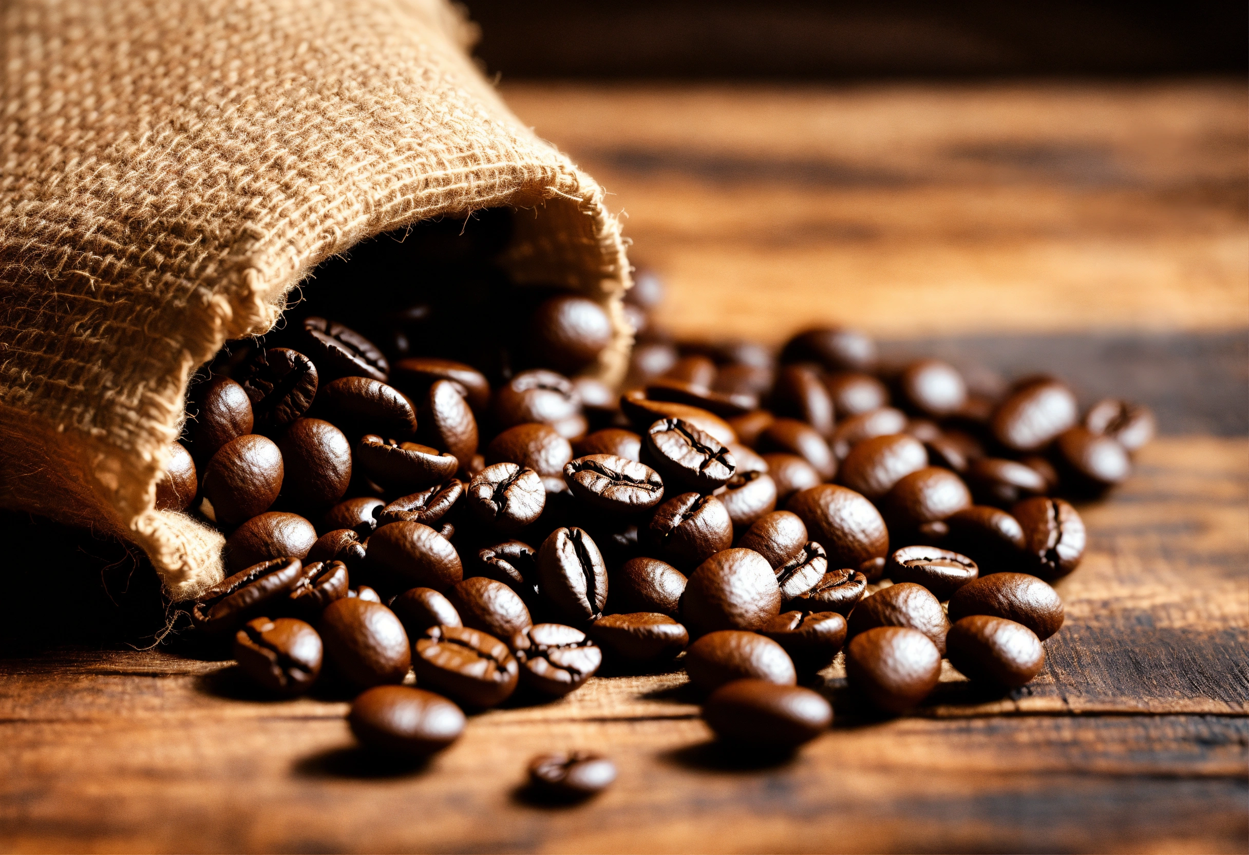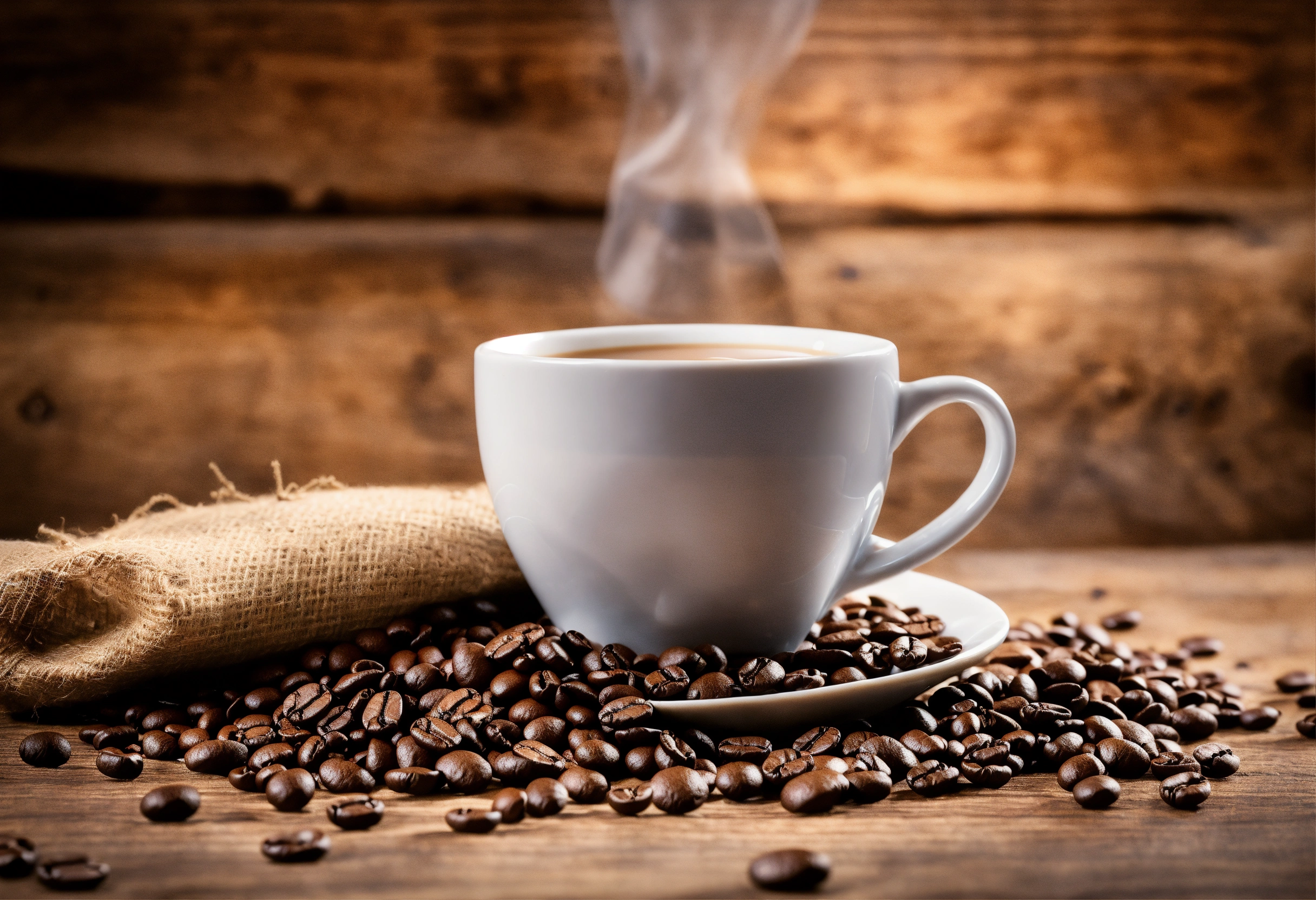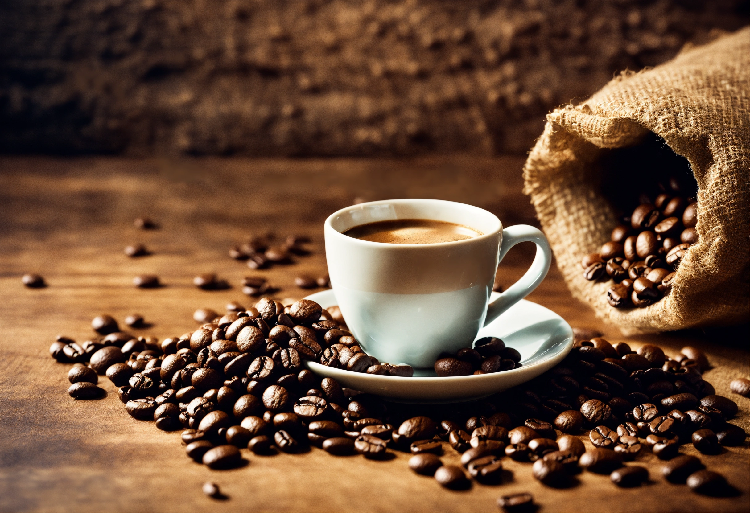 Create a photo-realistic product photography image of coffee beans cascading out of a burlap sack, wooden background, next to a modern coffee cup filled with coffee, product photography, rustic and natural ultra realistic.