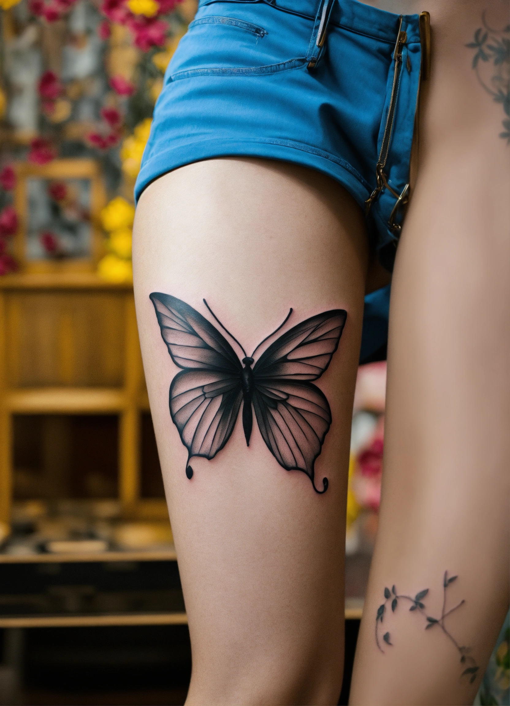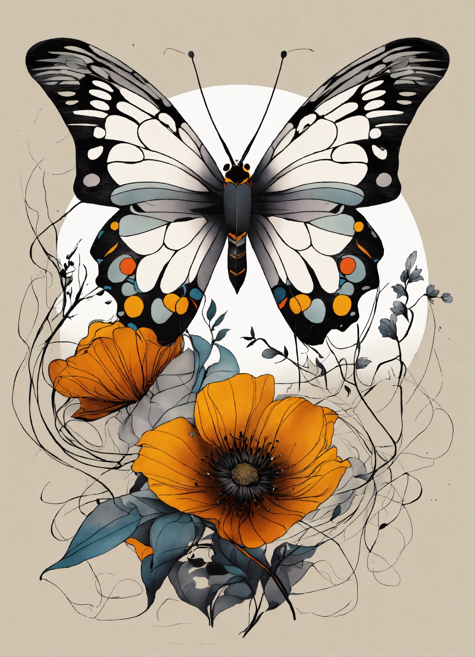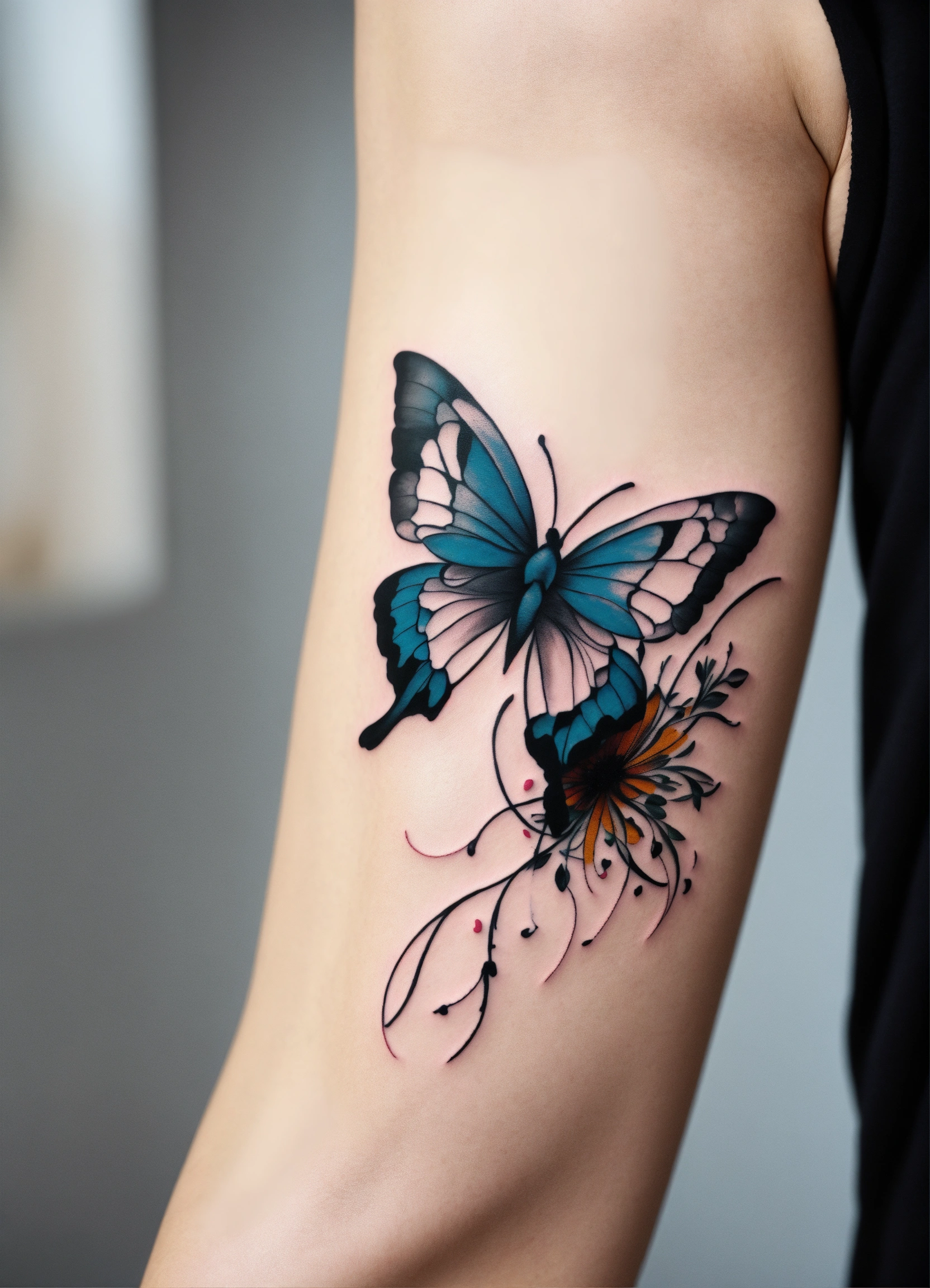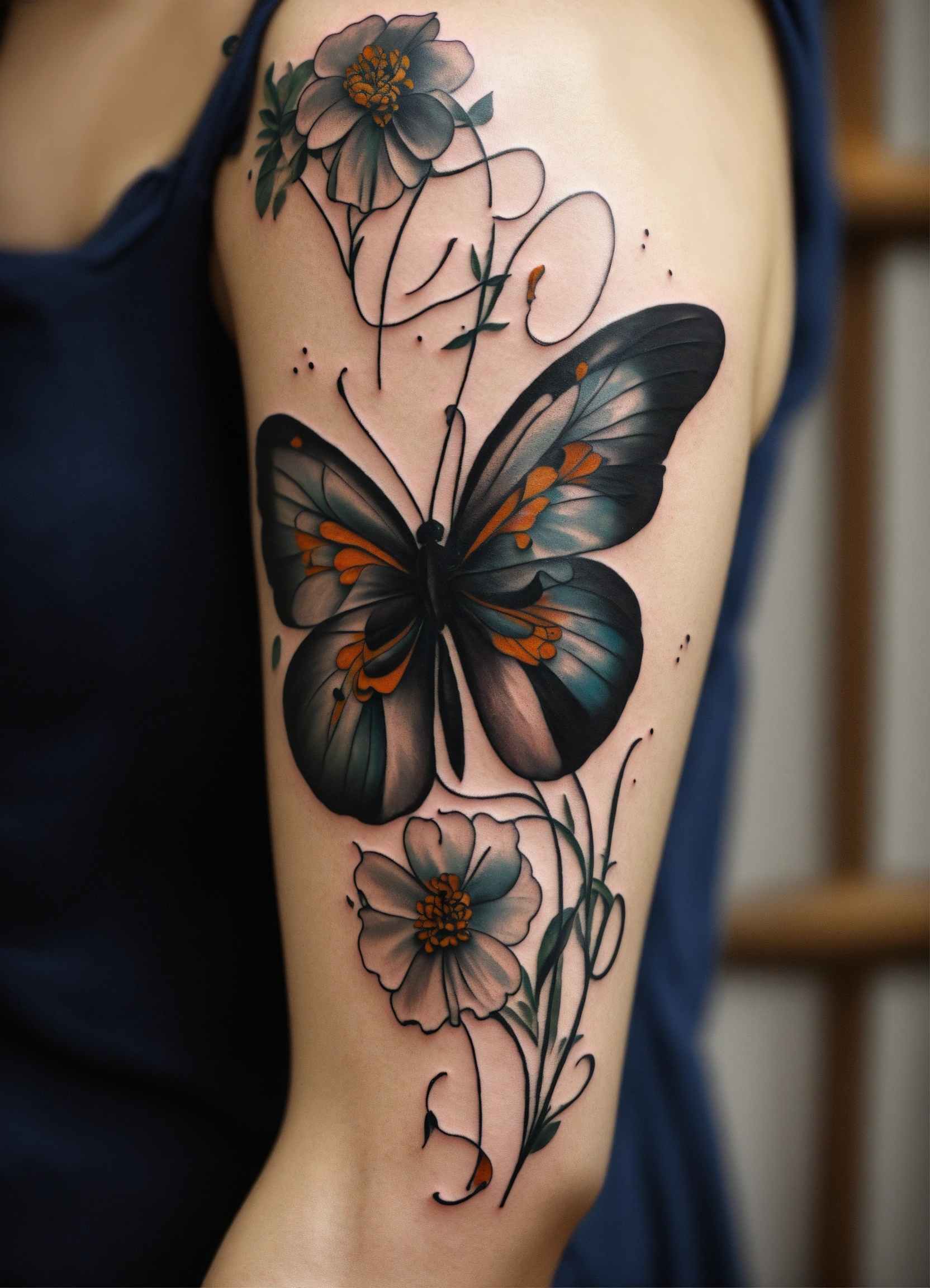 Tattoo dali papillon noir gris lignes minimaliste courbes fleurs couleurs arm tattoo