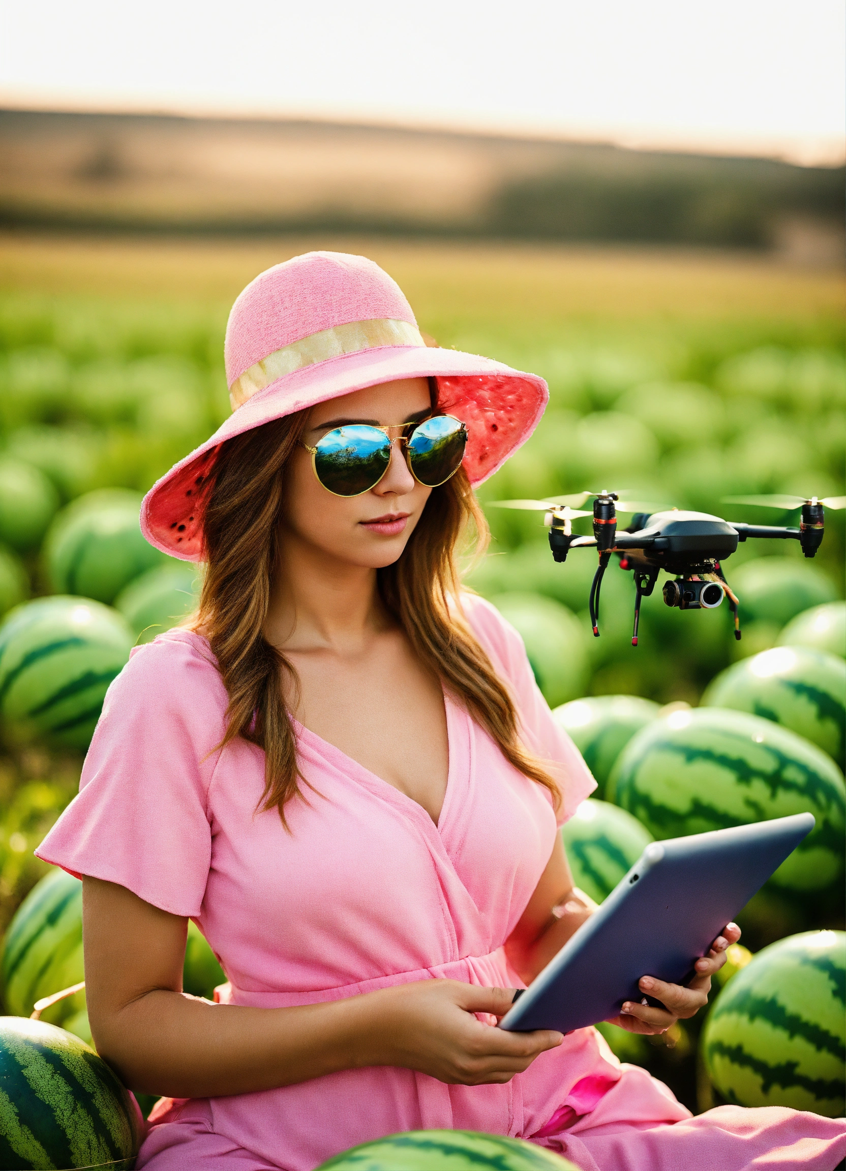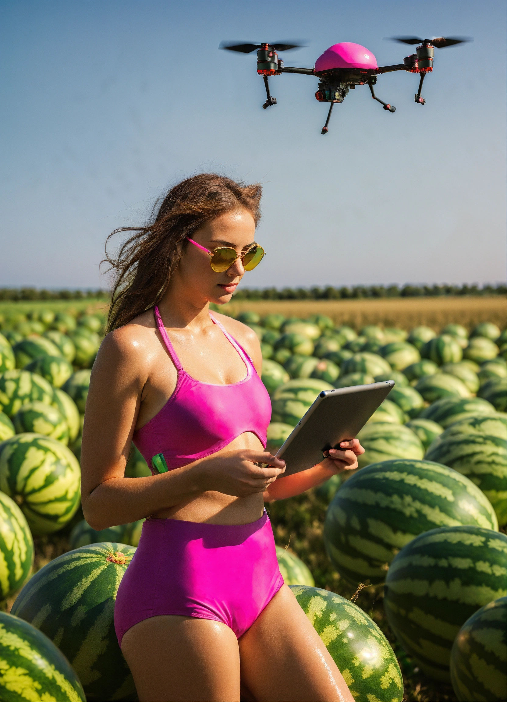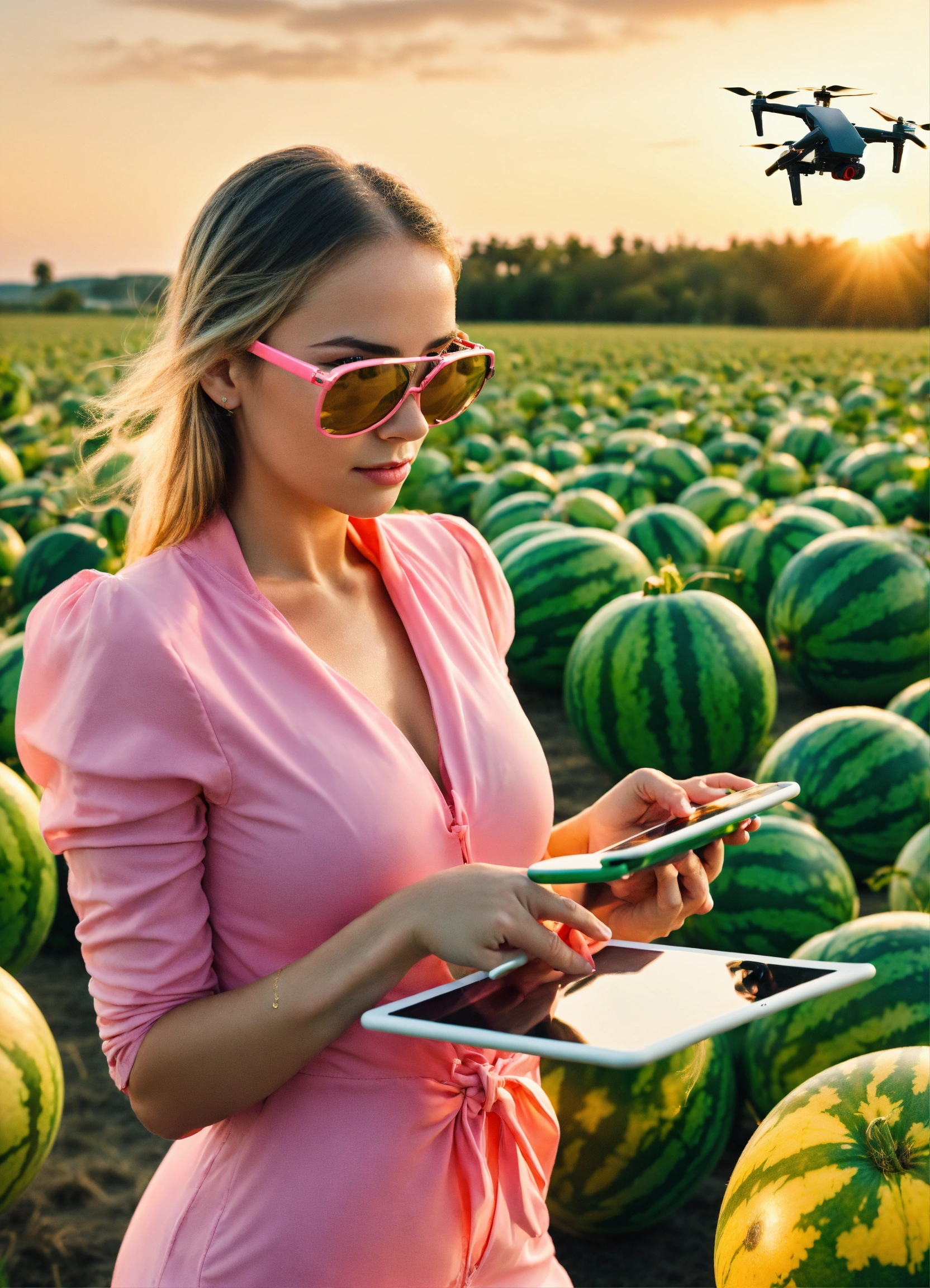 Female in a pink swimming suits and round gold frame sun glasses in crimea counting watermelons in a field with a drone and tablet pc, drone flying over the field at the background