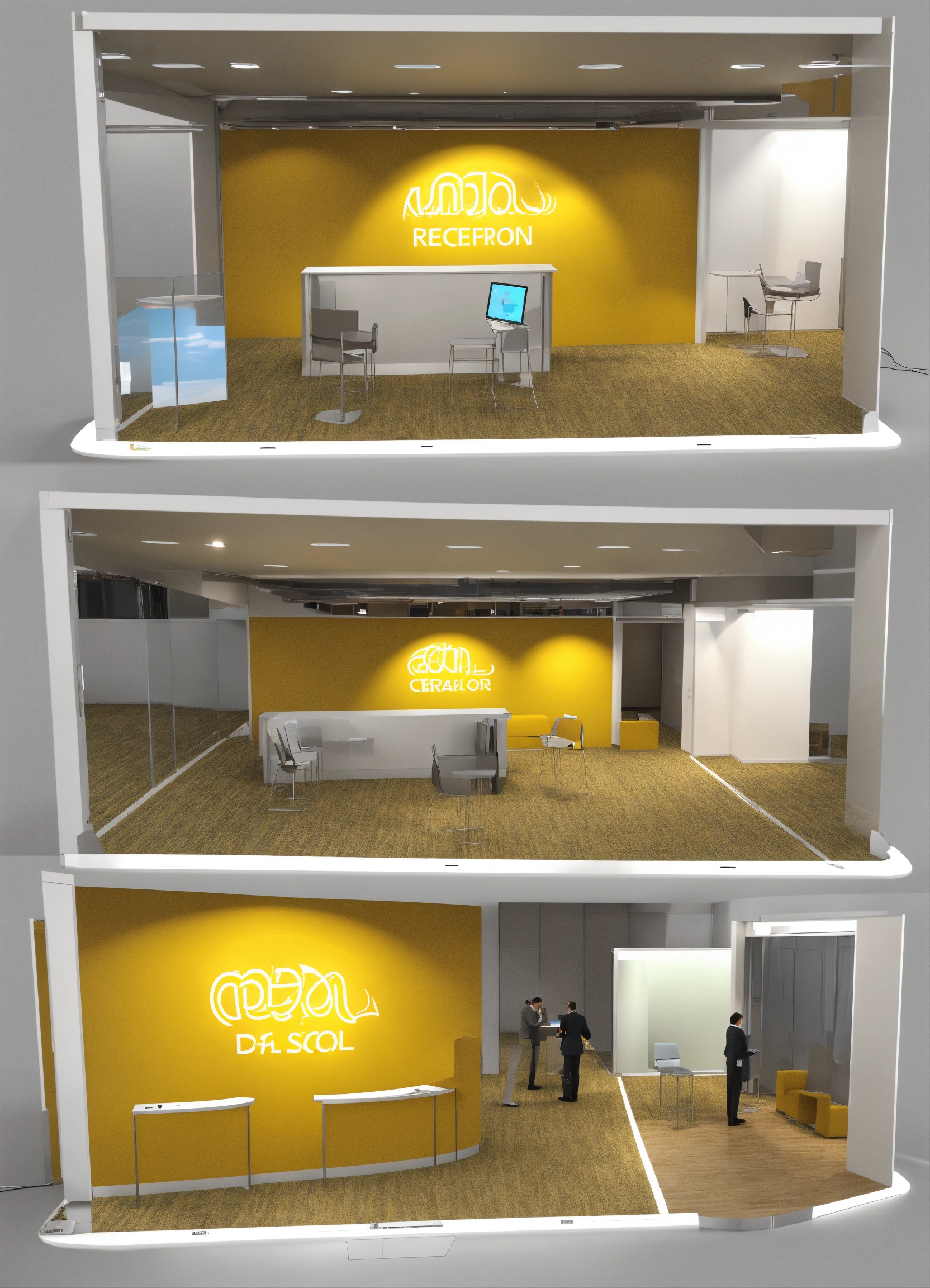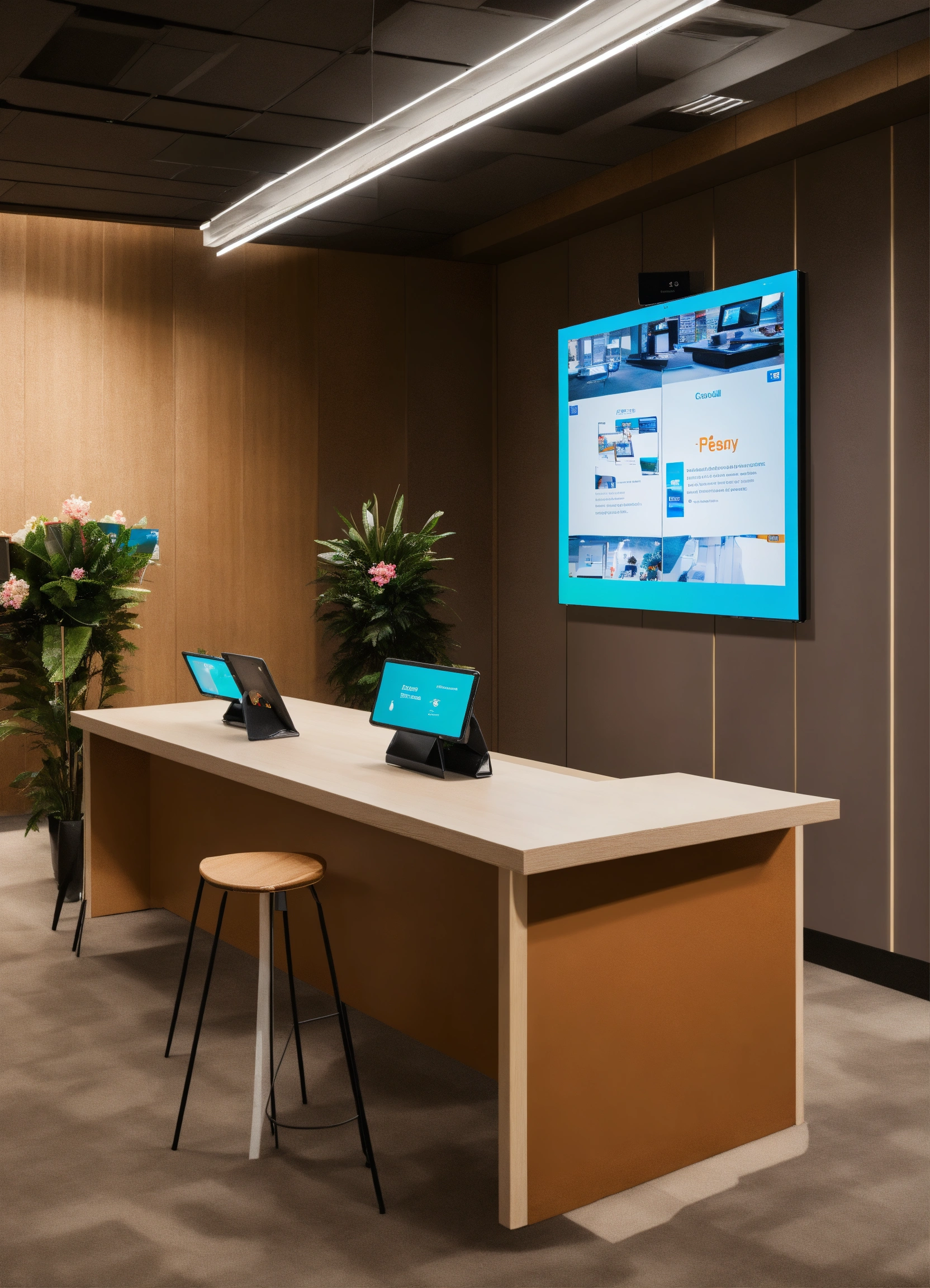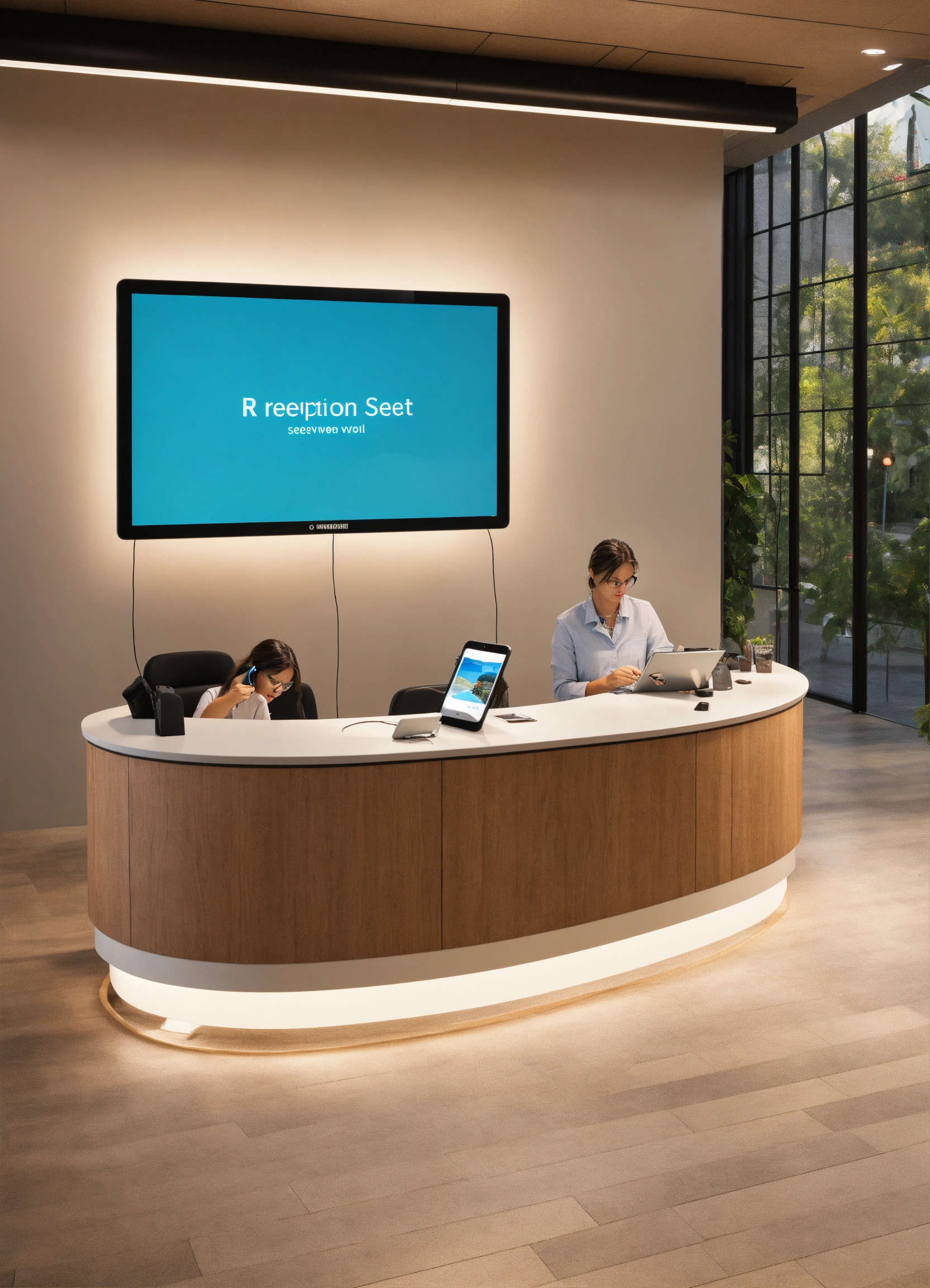 Create a reception area where two person serves, where there is a cell phone a tablet demonstrating visuals, giant monitor