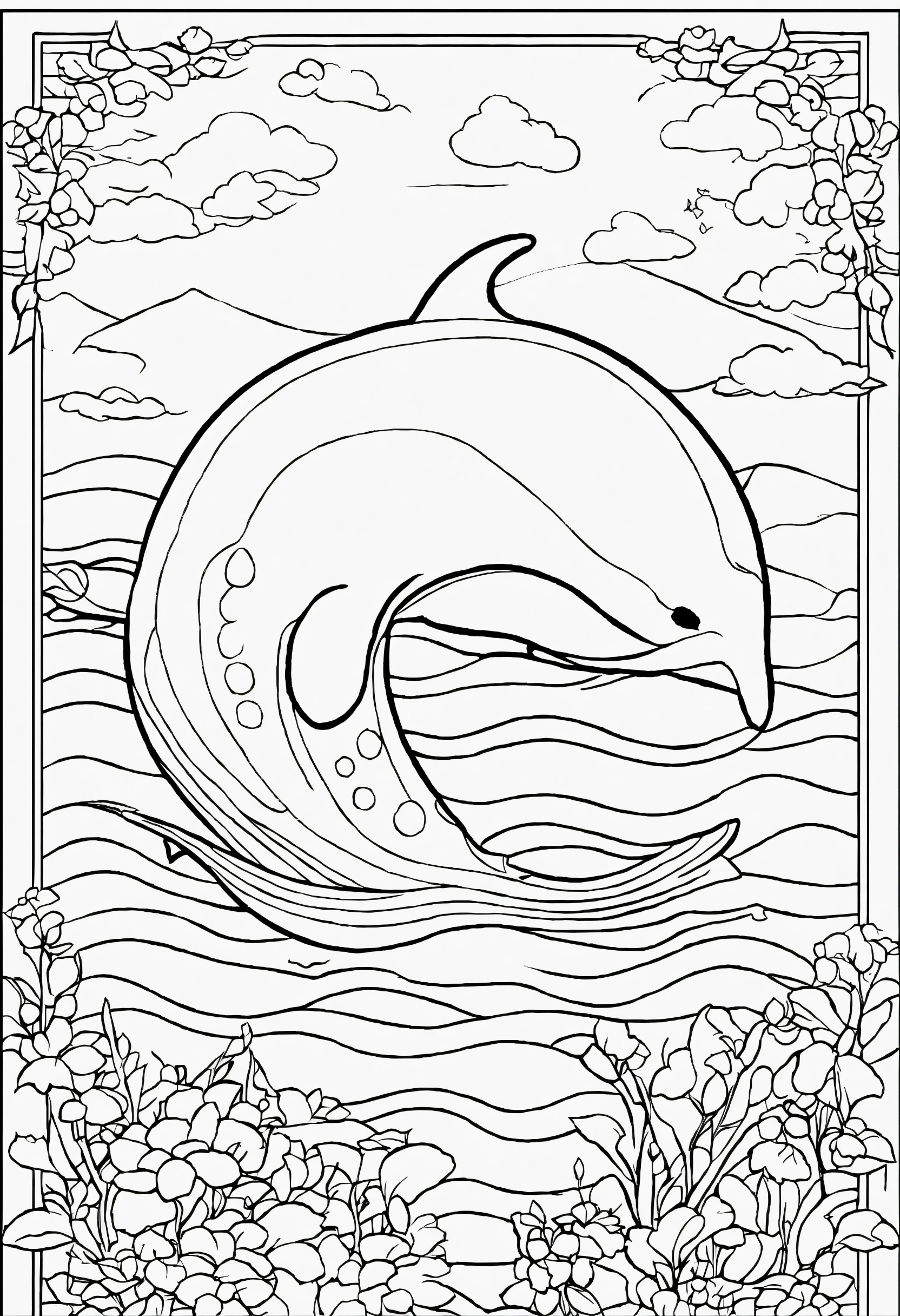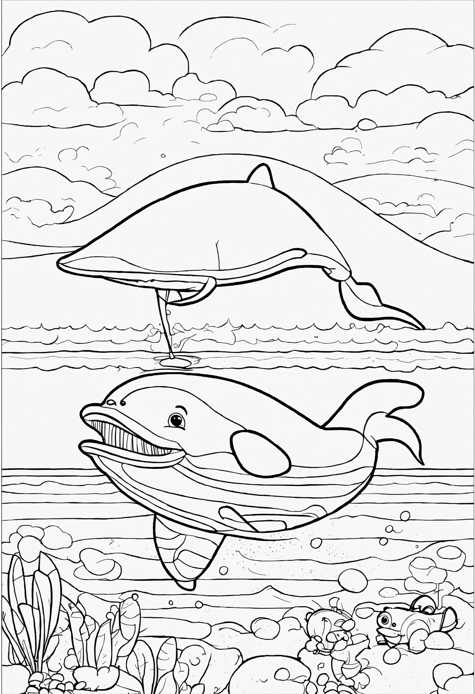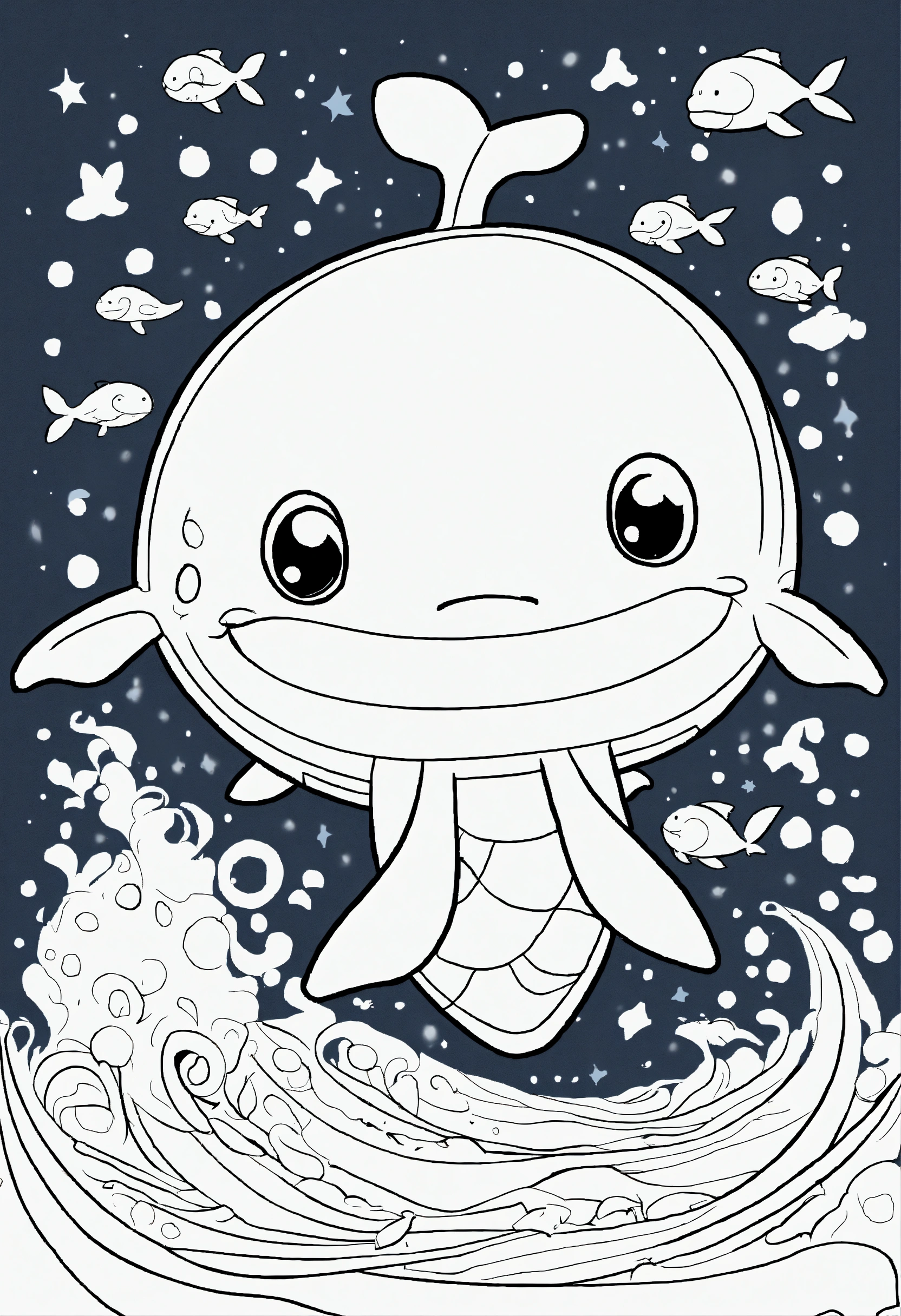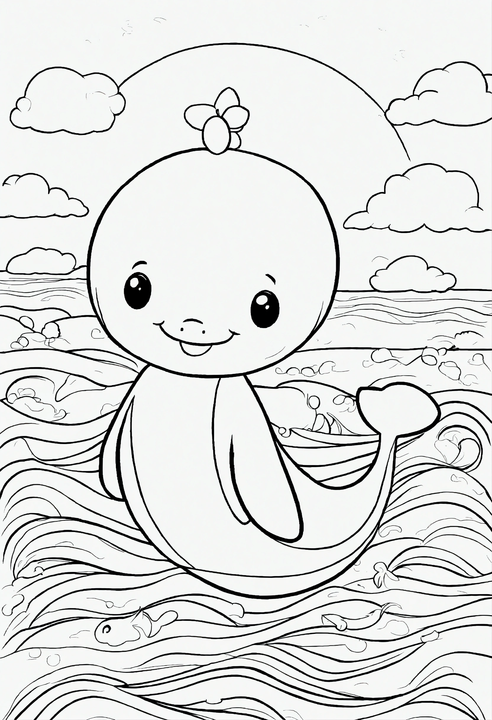 Coloring book for preschoolers, simple lines drawings, no lines inside of the drawing, cut baby whale, cartoon, full body, outline of the drawing in bold line, symmetrical, white background., no background image.