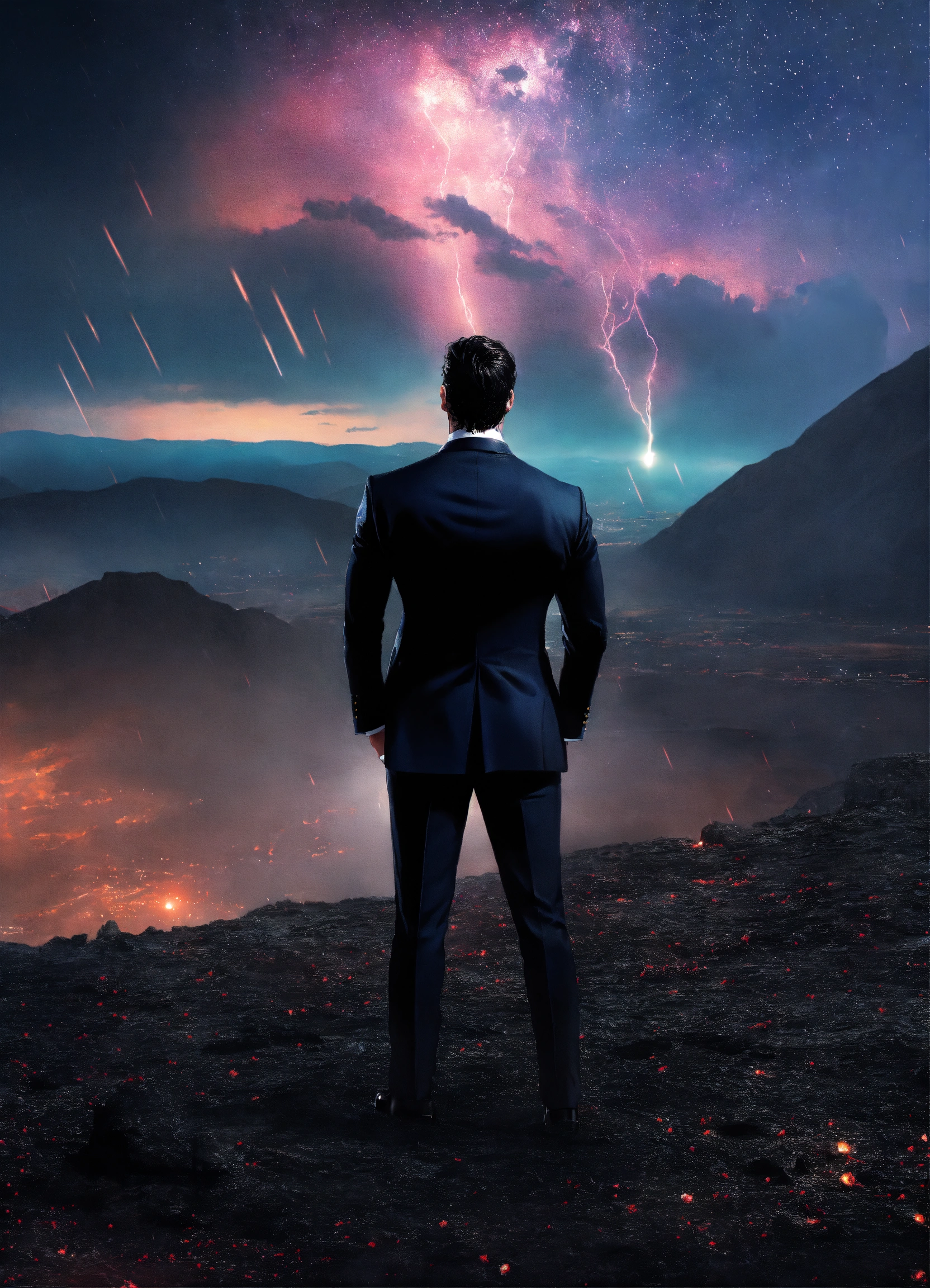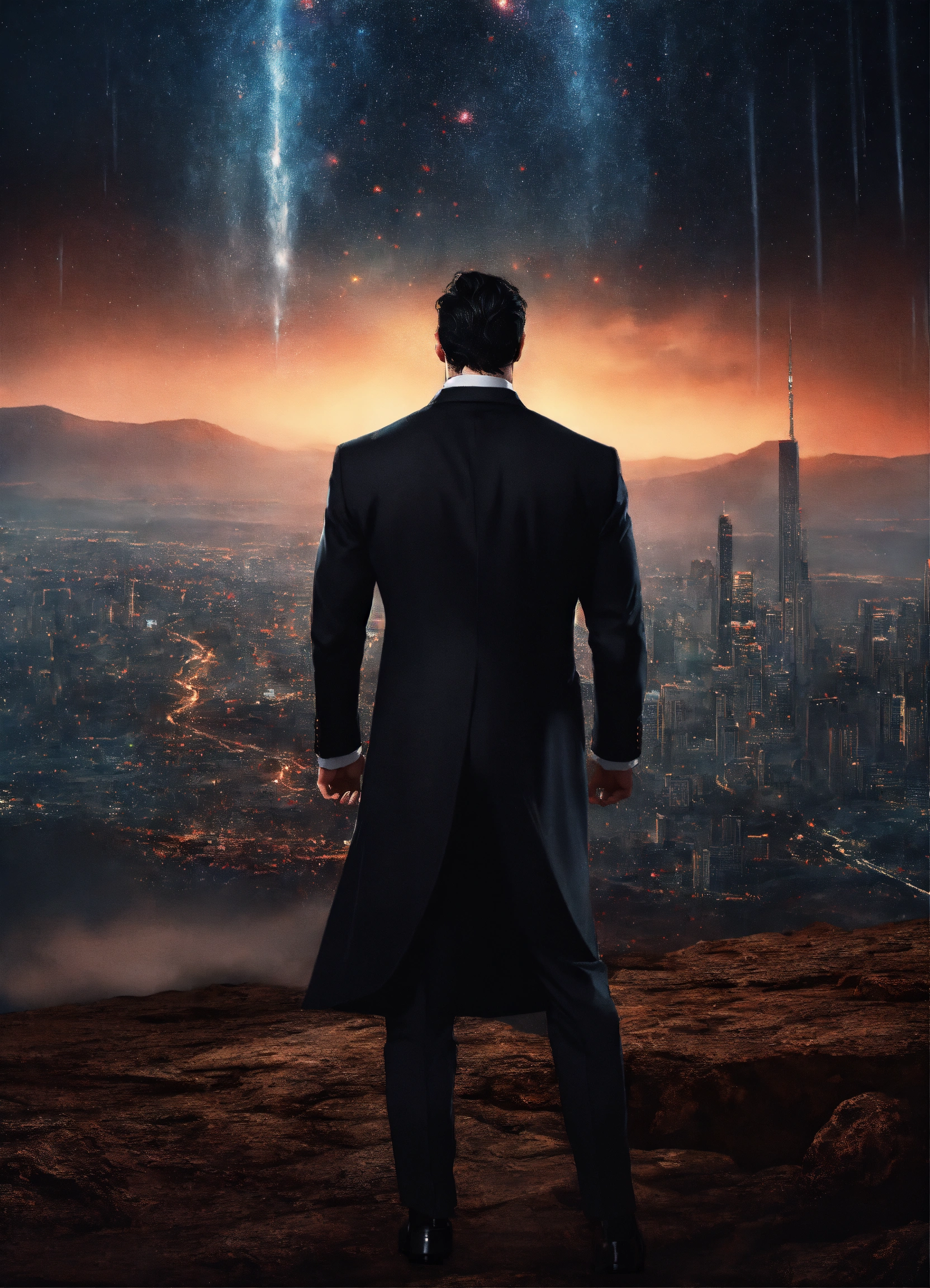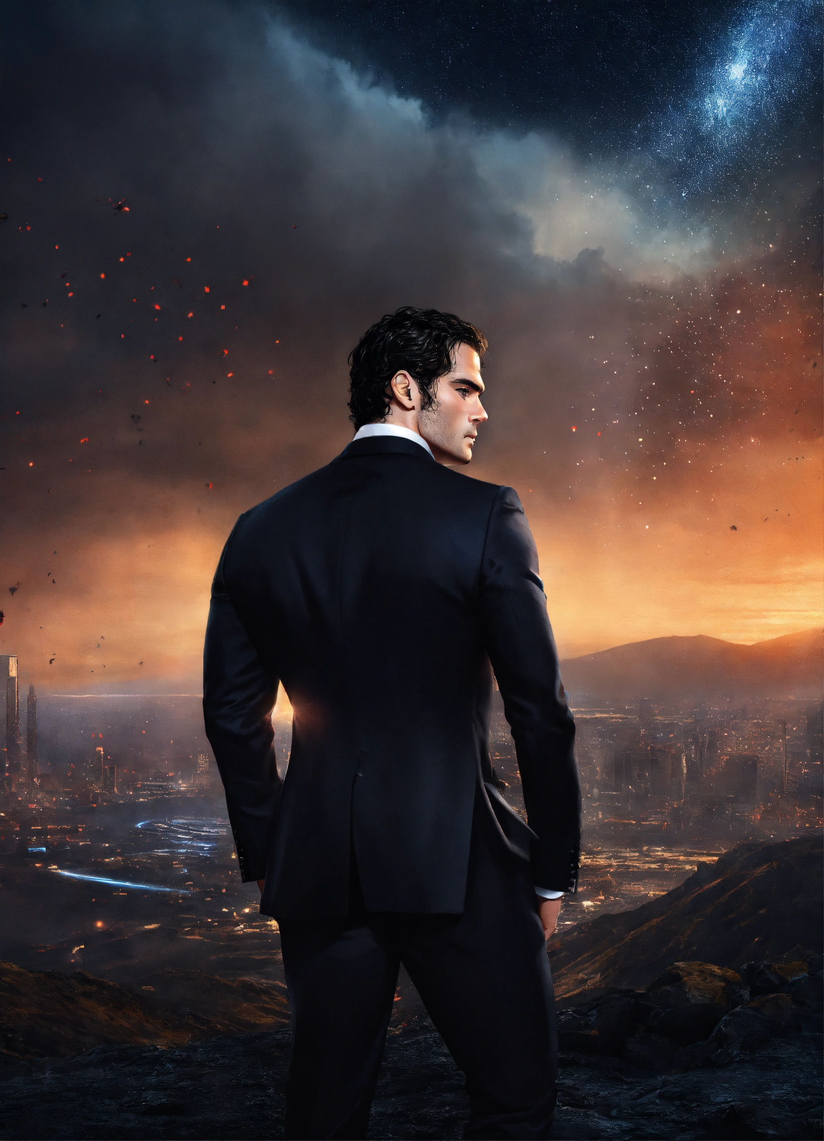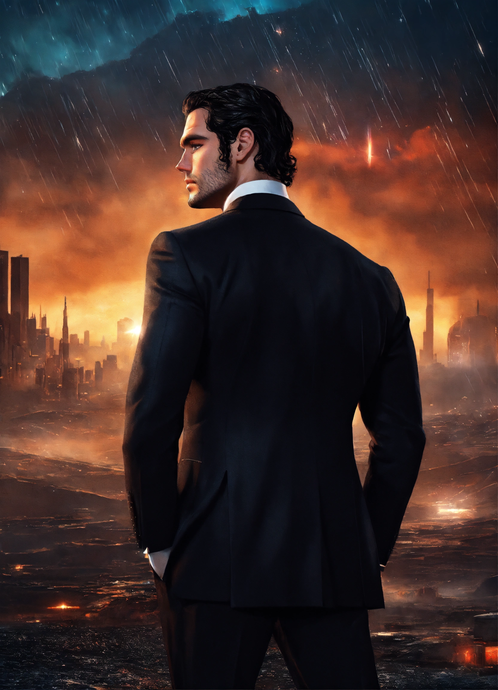Henry cavill, in a black tuxedo, with tattoos, dark hues, in a futuristic landscape, back turned, full body, stars raining down, sunrise, realistic, photoshoot