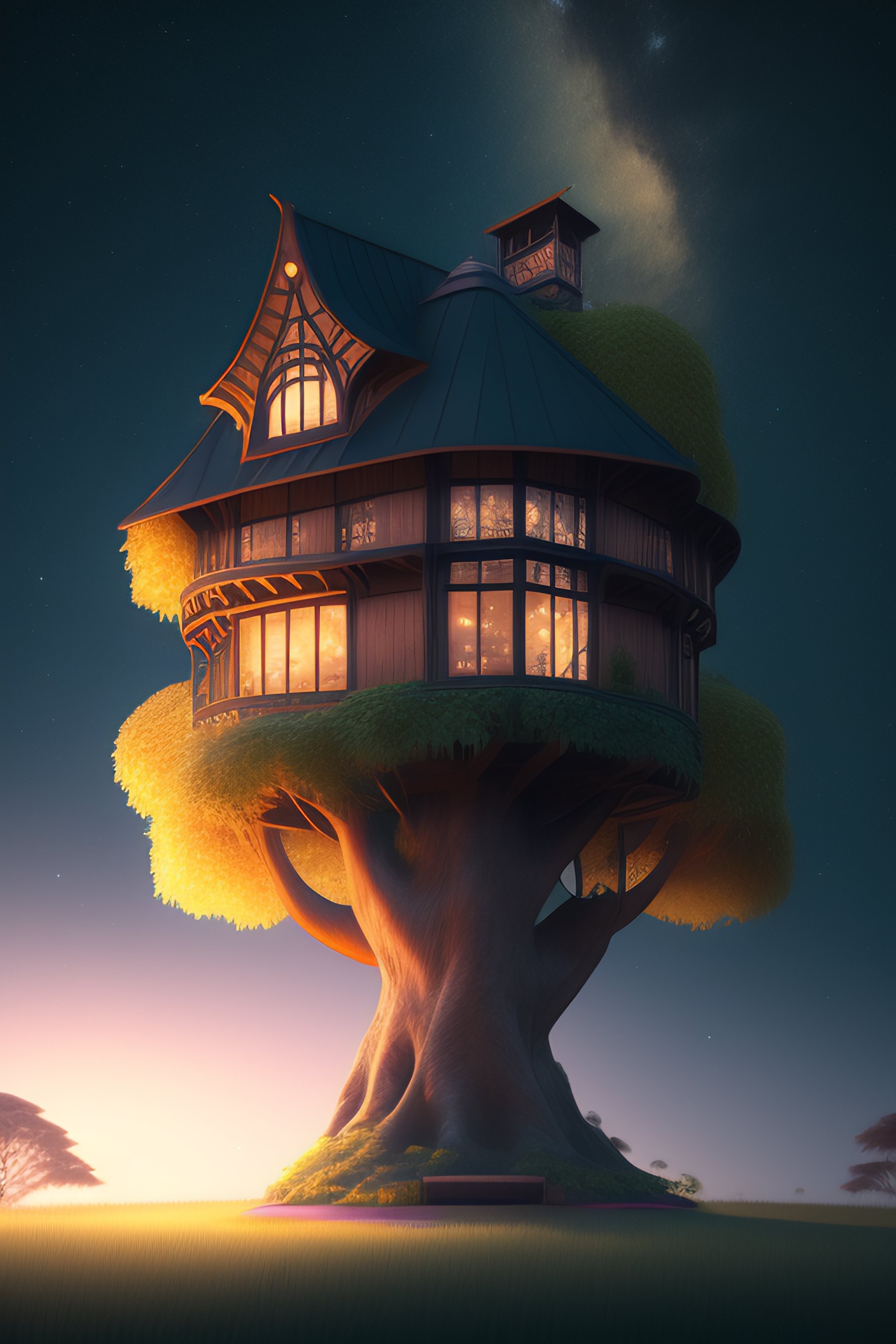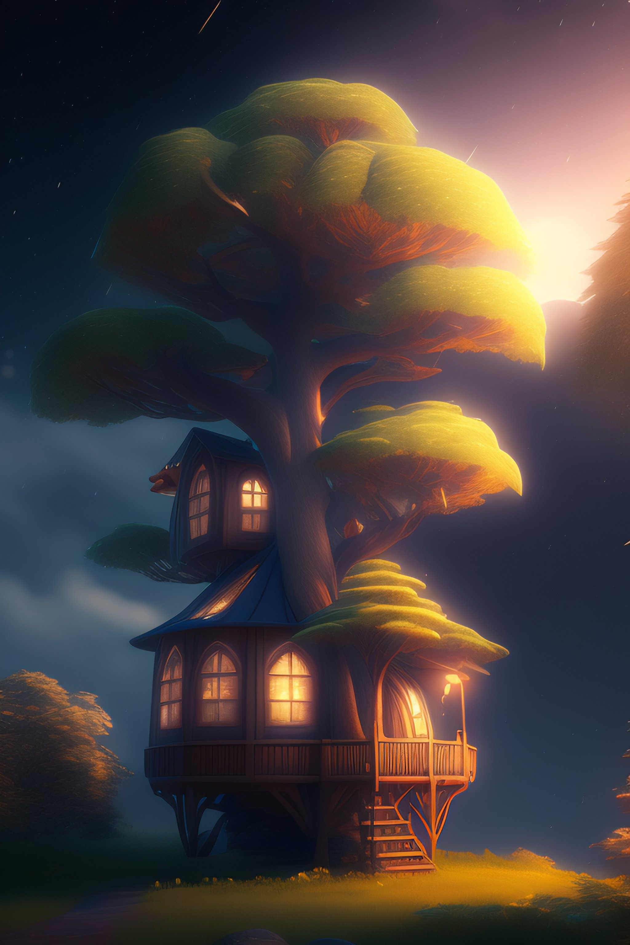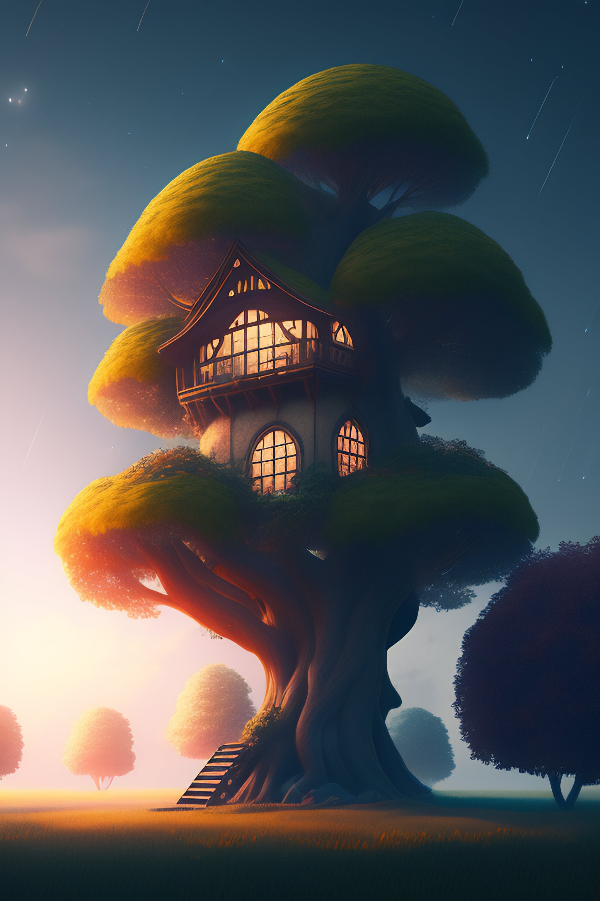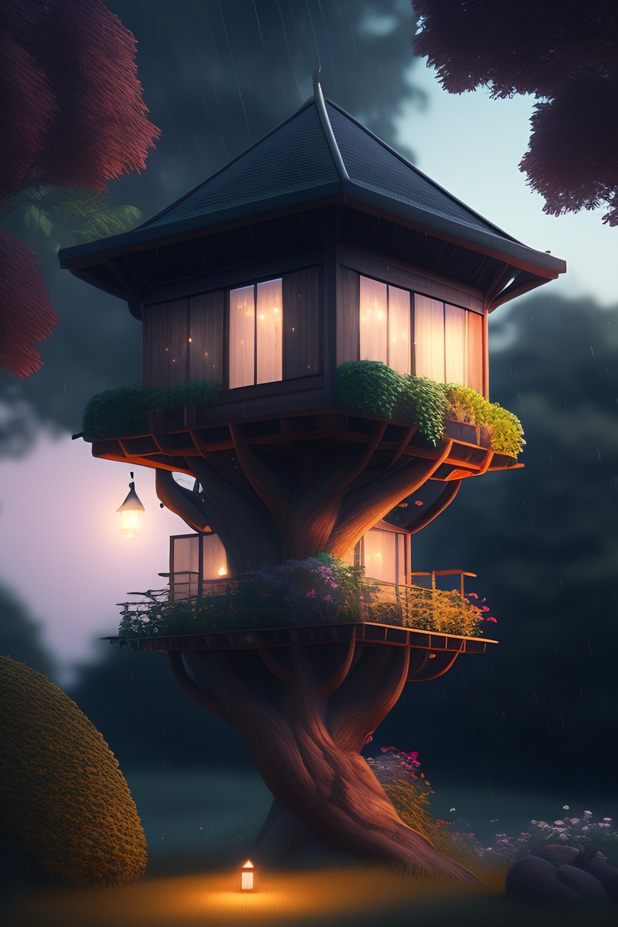 Rain - tree house with windows, night, stars in the sky, landscape, octane rendering, wide angle lens, trending on artstation