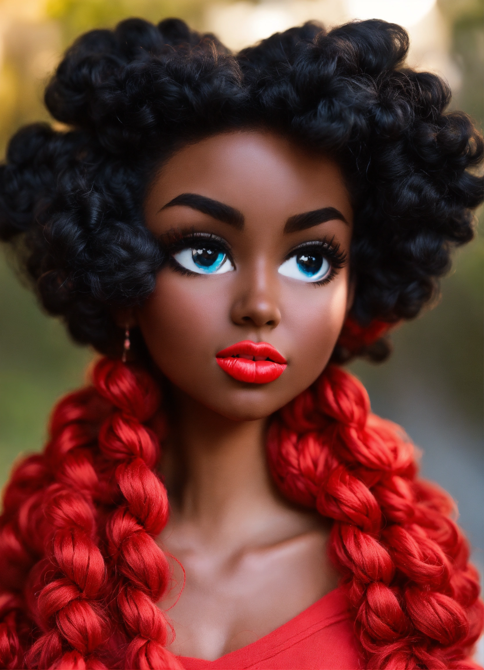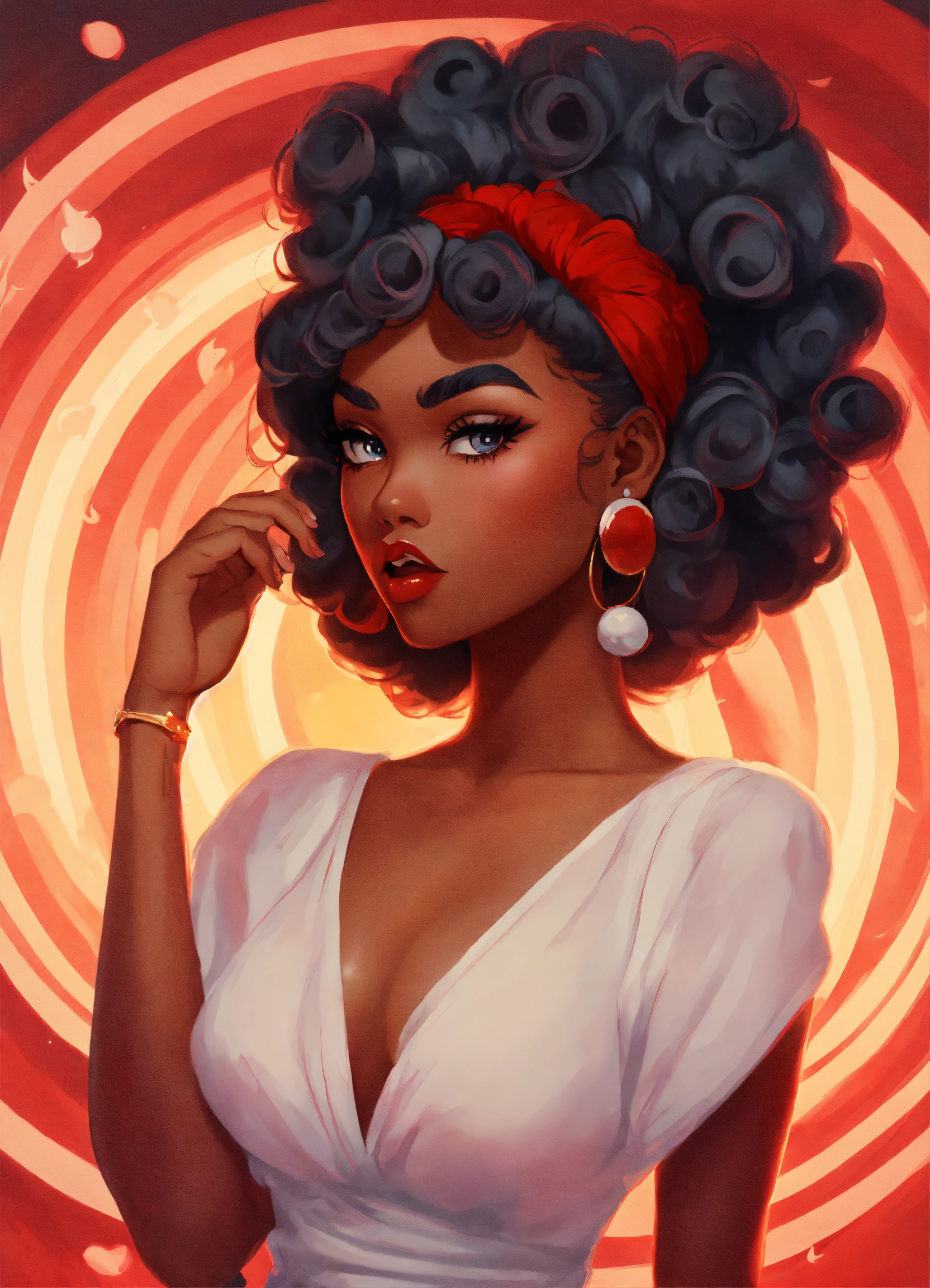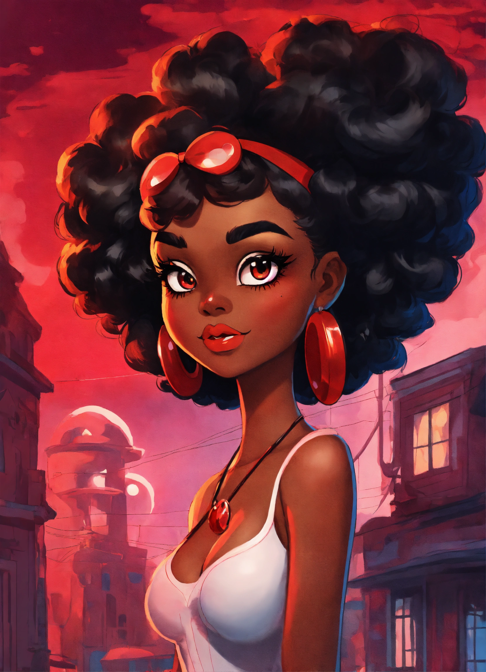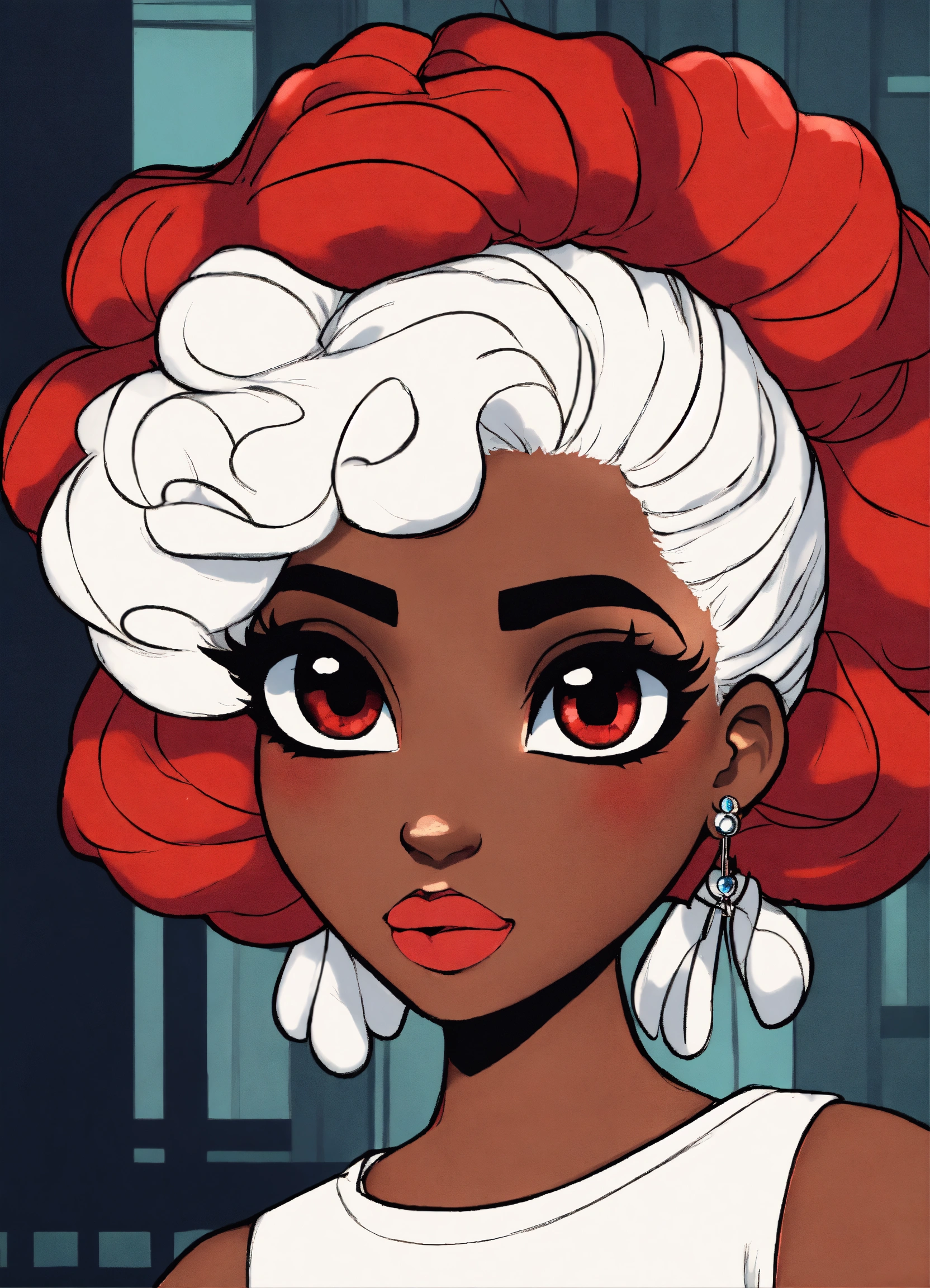 Create a stern powerpuff girl meets betty boop inspired black female character in white with oversized red flowing yarn hair and big gorgeous eyes, retro 1940’s anime