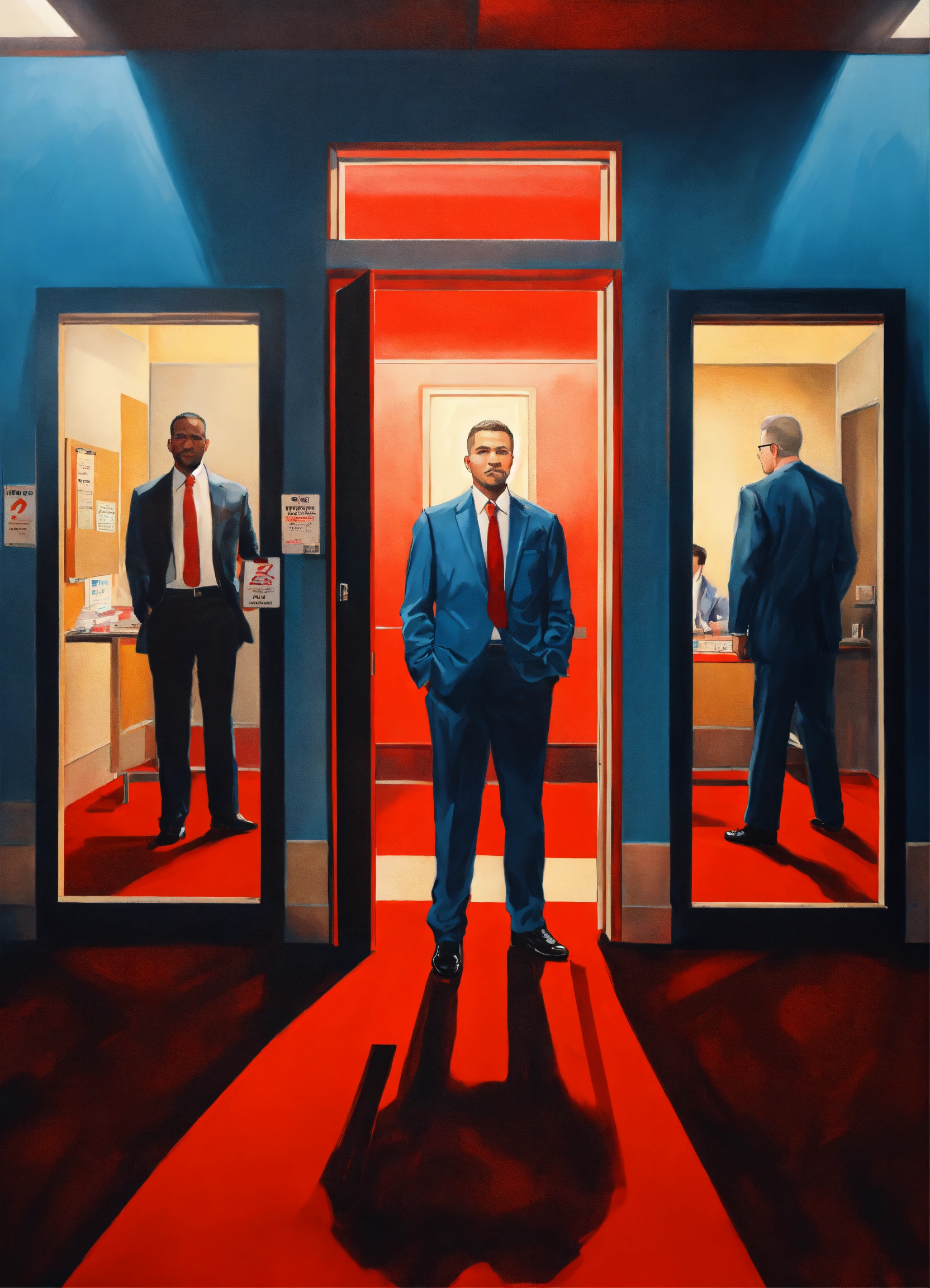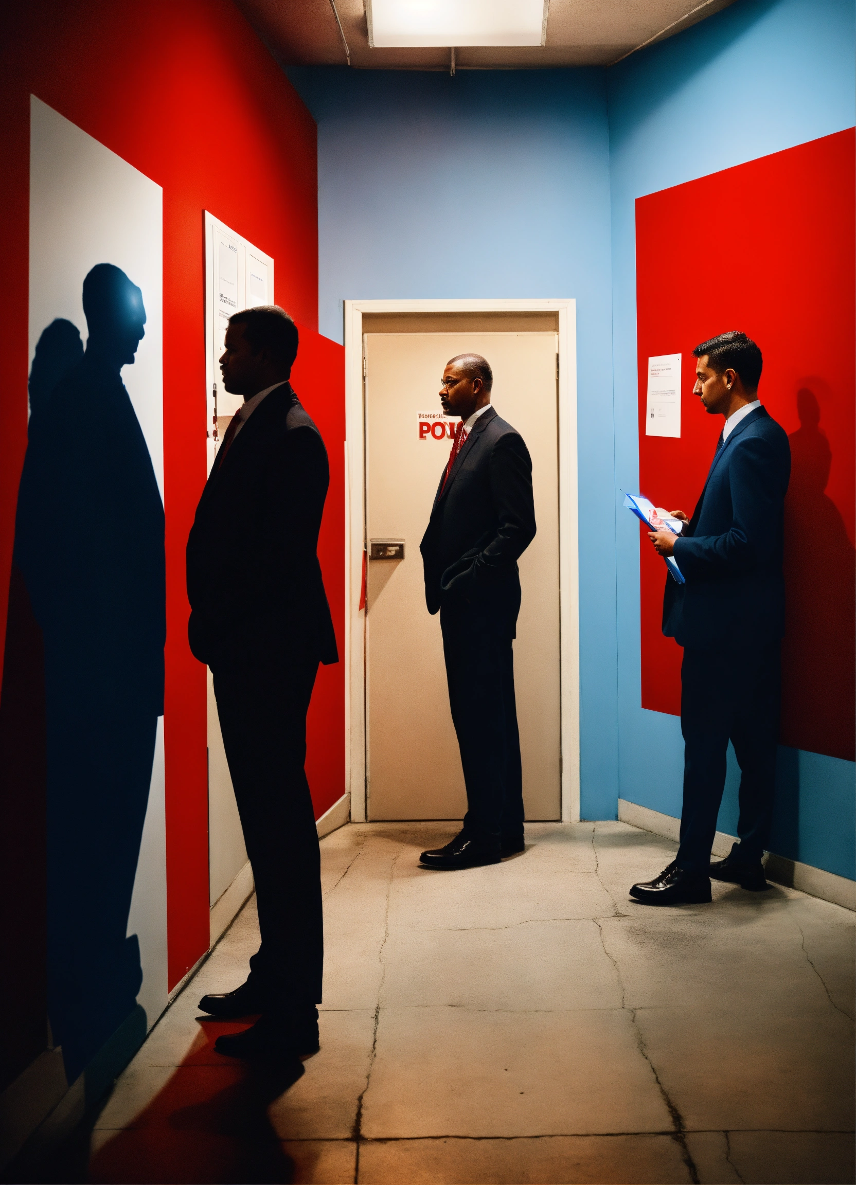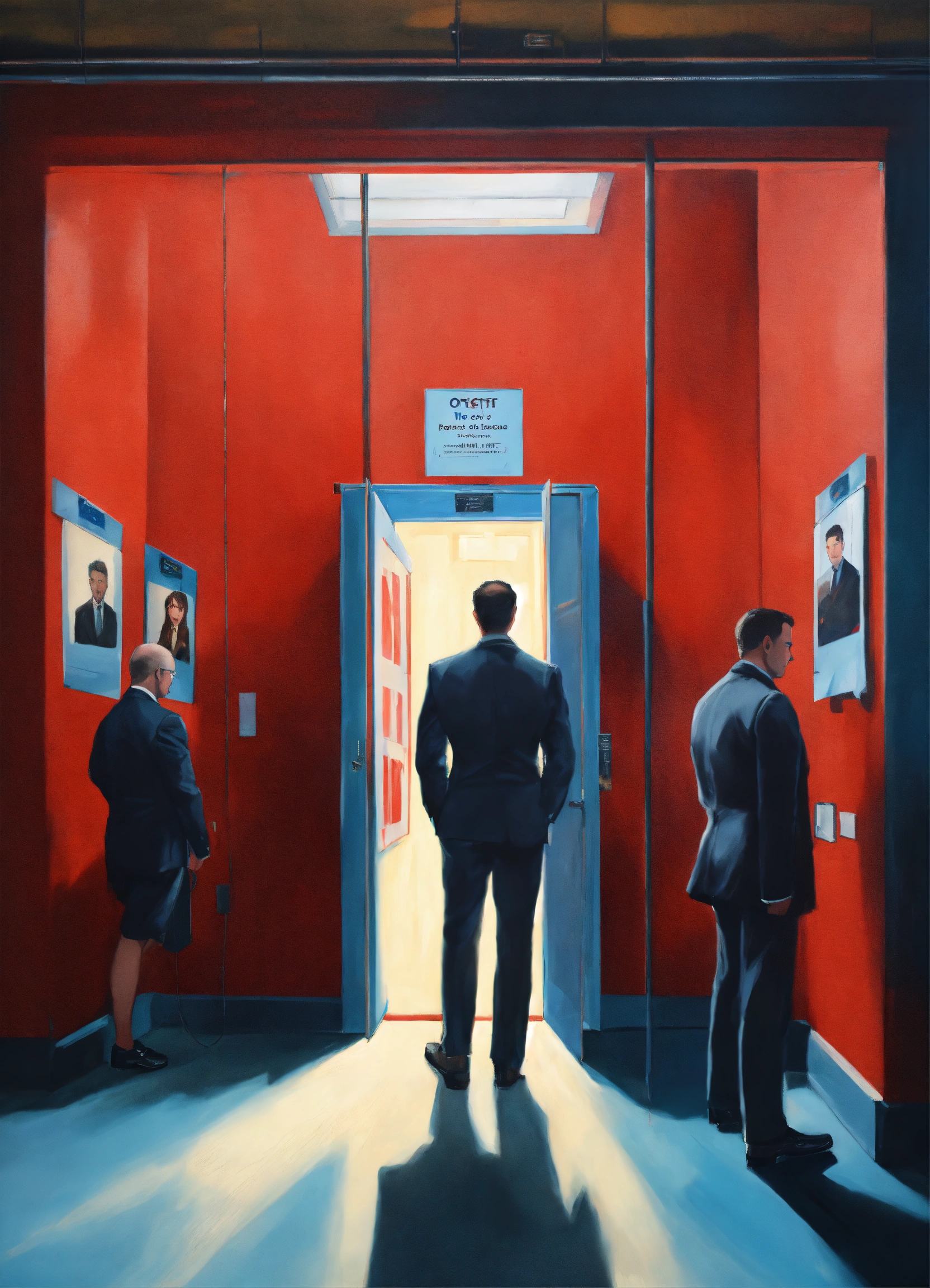 Superrealist style, urban style, indoors, people voting on a poll, election day, three portraits of a business person oon the wall, security guard at the door, red shadows, pale blue, ivory, glowing lights