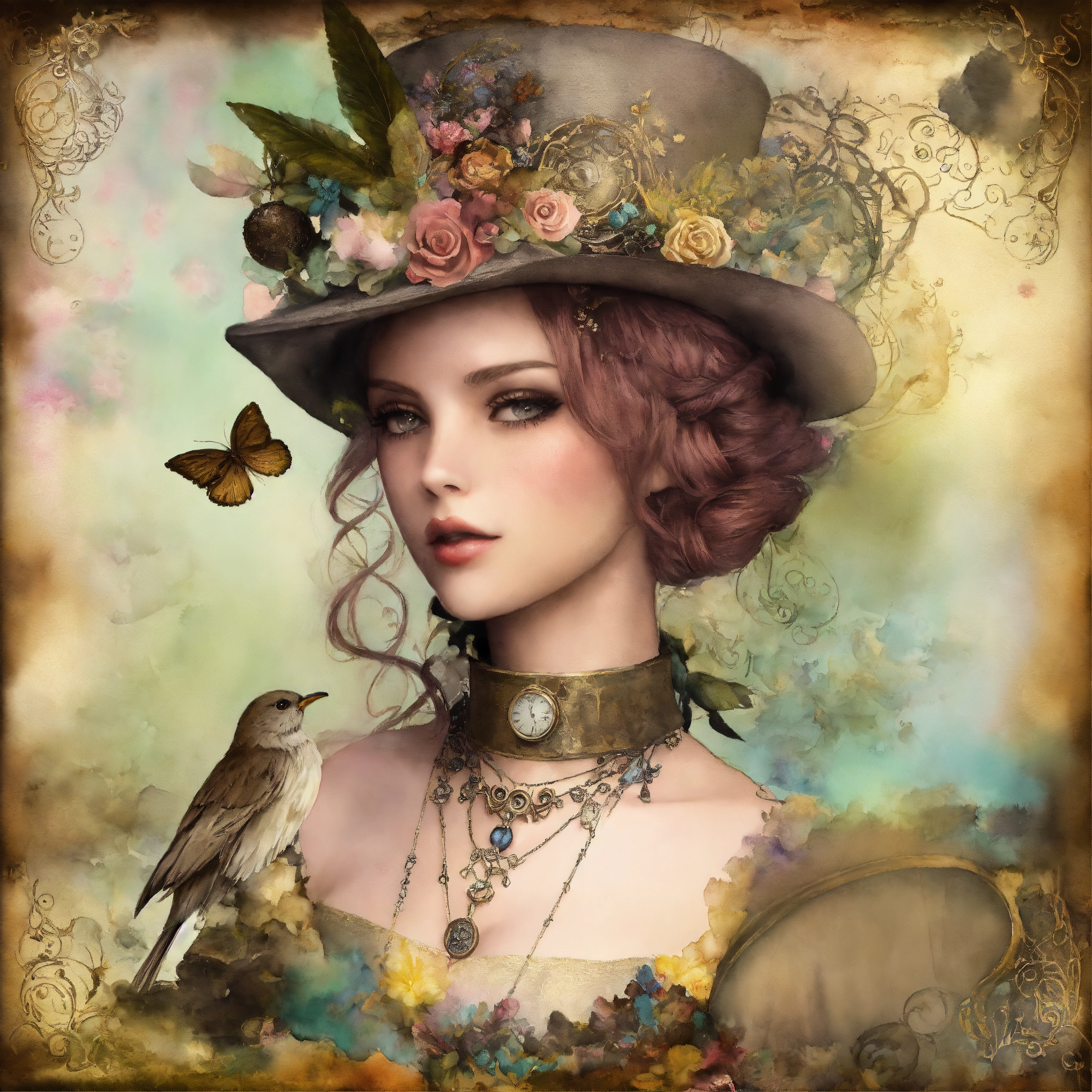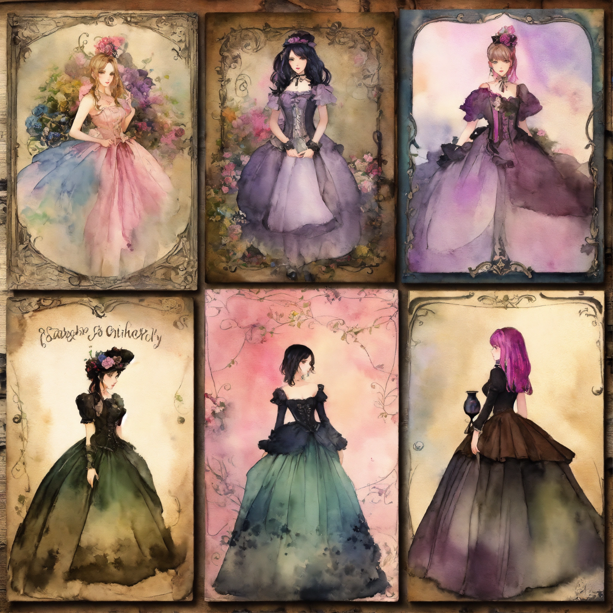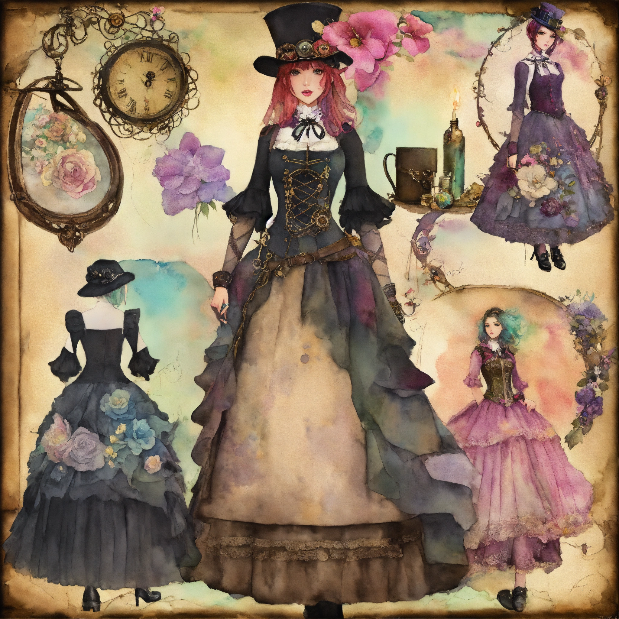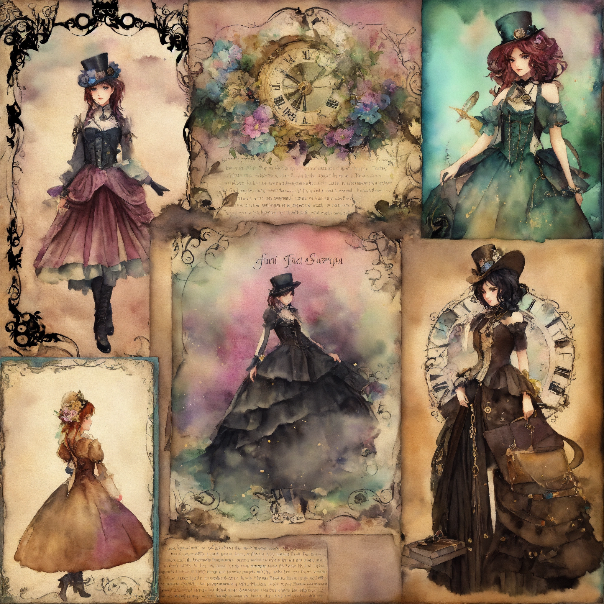 Shabby chic dreamy mist pastel junk journals create detailed watercolor illustrations of goth steampunk girls in full figures, each as separate png images suitable for cutting out and using in various paper crafts such as card making, scrapbooking, junk journaling, and more. the digital clipart should capture the essence of gothic fantasy and steampunk aesthetics, offering a versatile resource for creative projects. each girl should be uniquely designed and easily adaptable to a range of crafting styles. swirling magical fairytale abstract art style