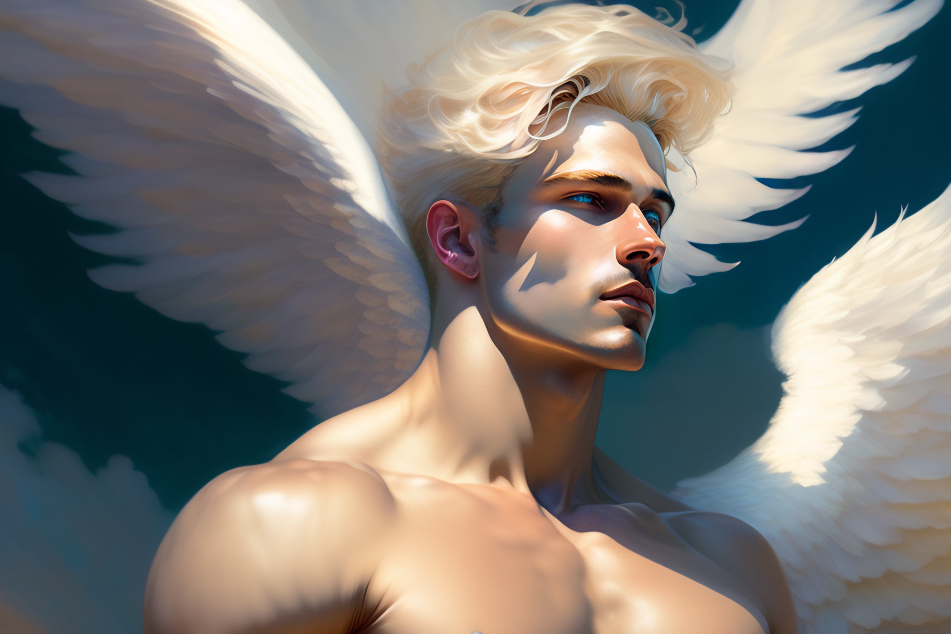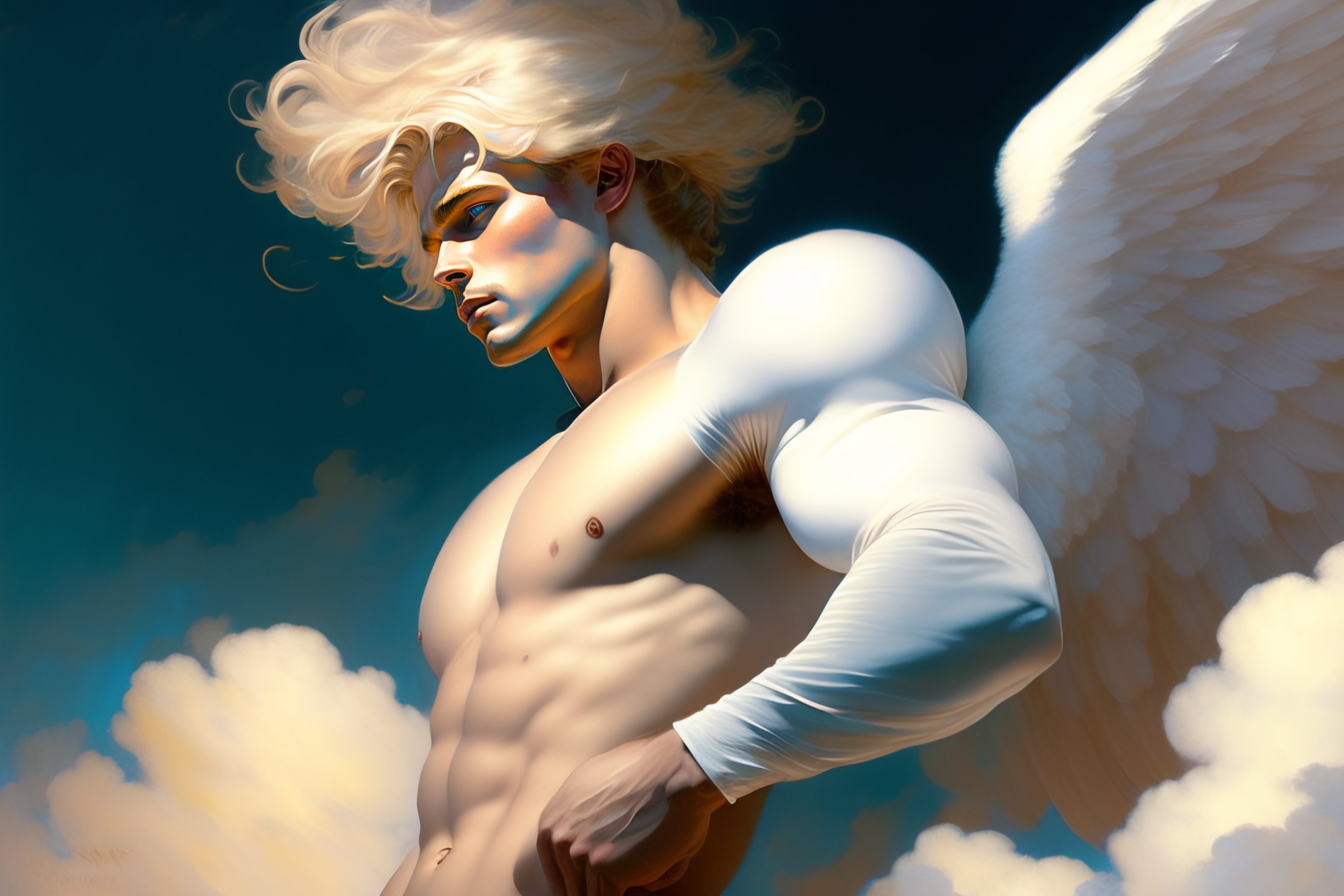 A male angel flying and dancing among the clouds, blond hair, in the center of the images, hyper realistic, ultra realistic, intricate, dynamic, white pants, detailed torso, 8k, art by krenz cushart and artem demura and alphonse mucha