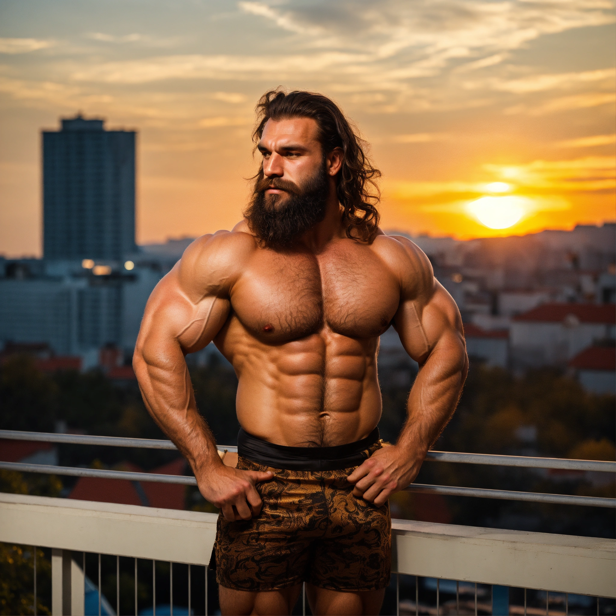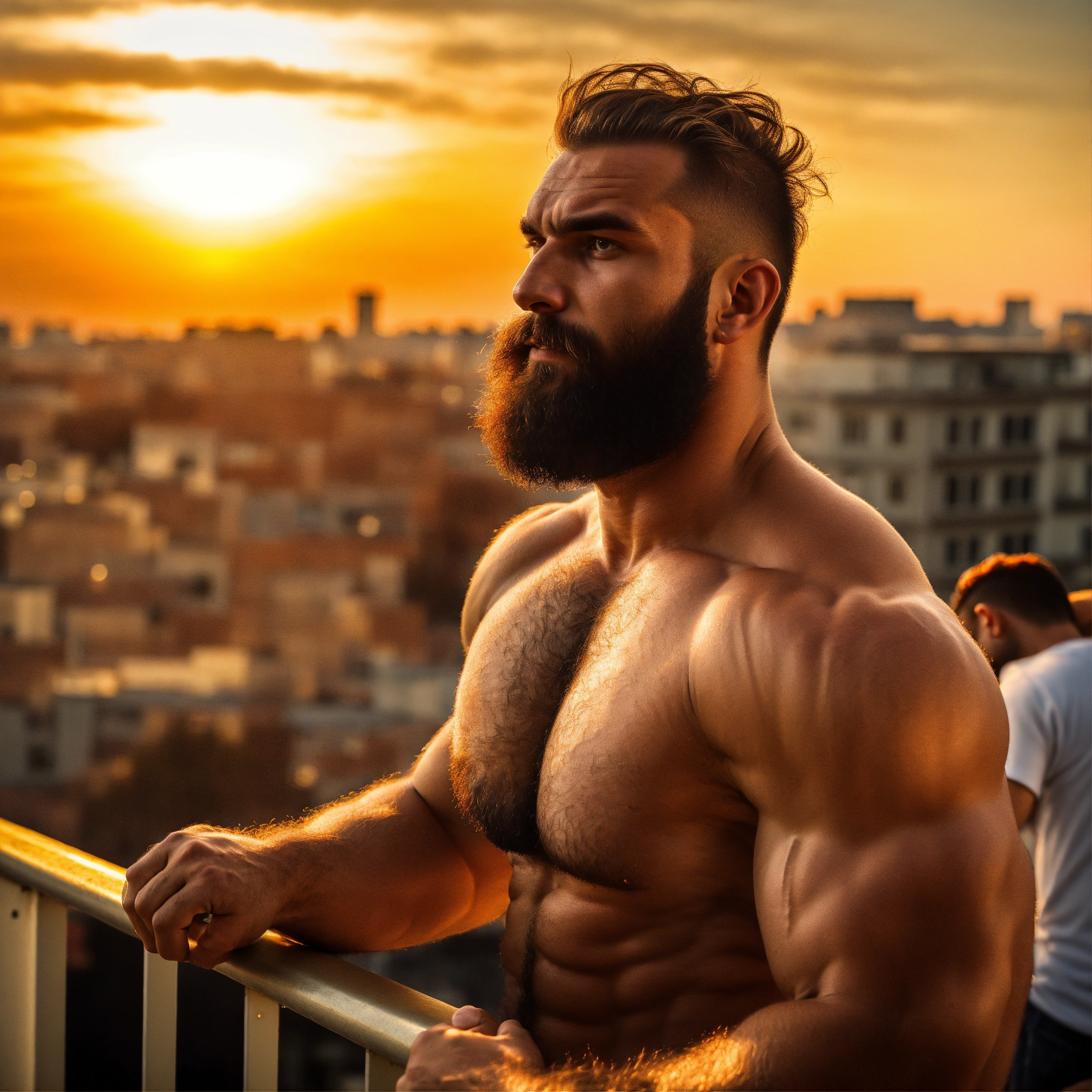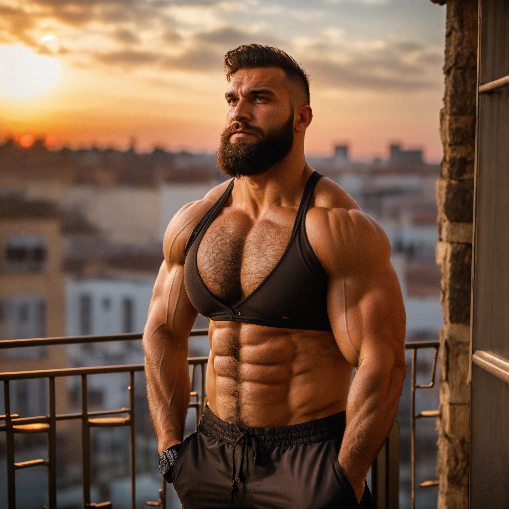 30-year-old hairy serbian man with big muscles, big bodybuilder, body like a wrestler, on a balcony at sunset
