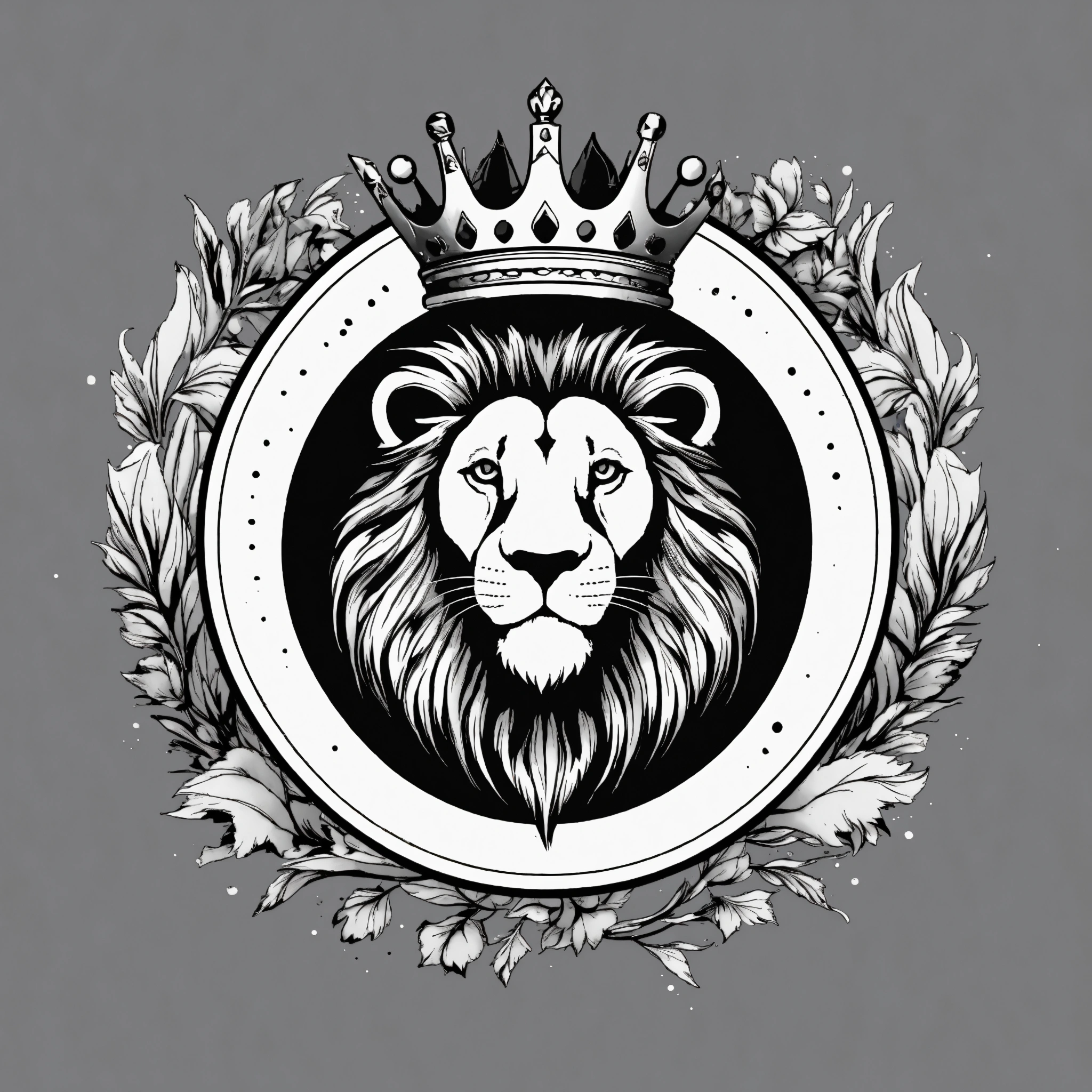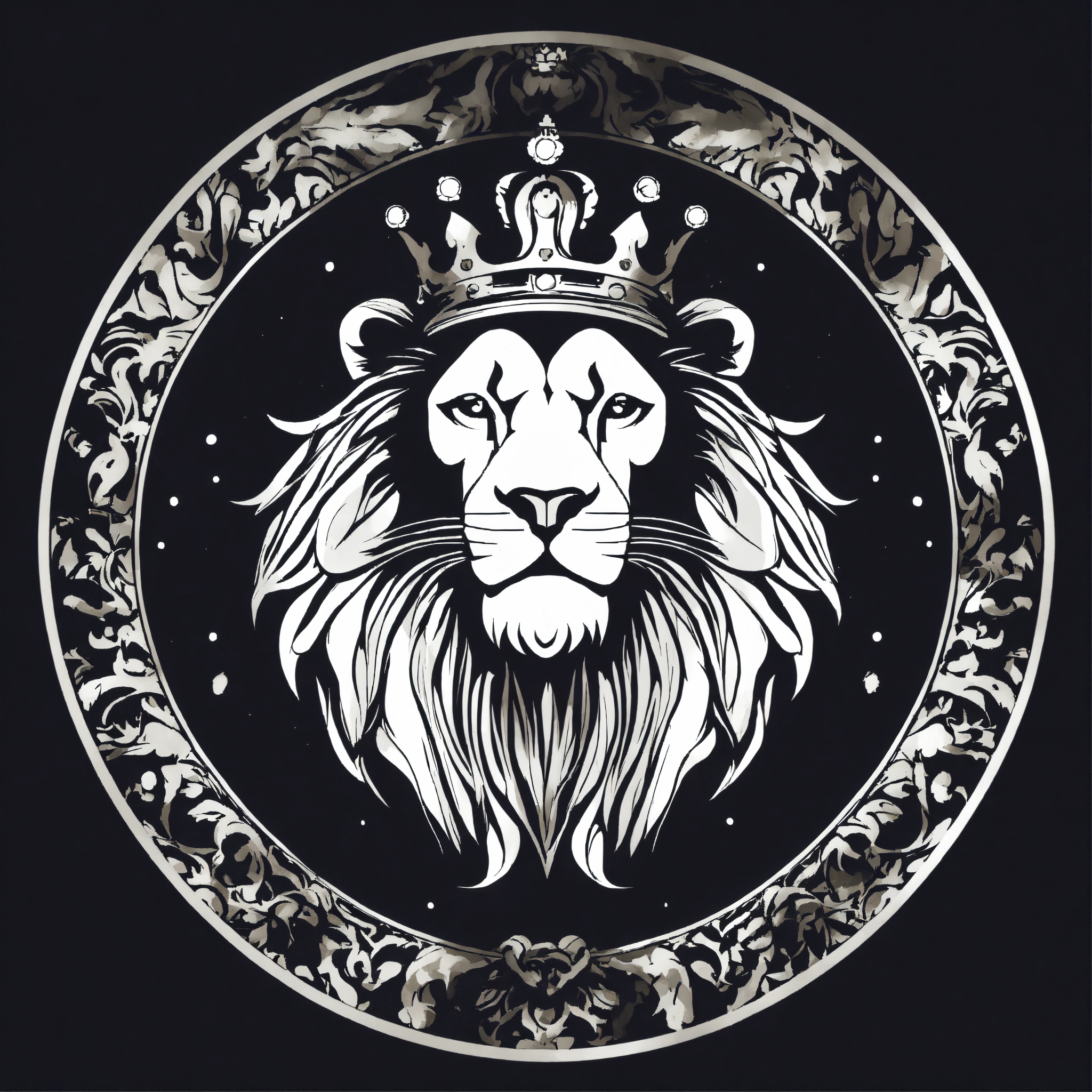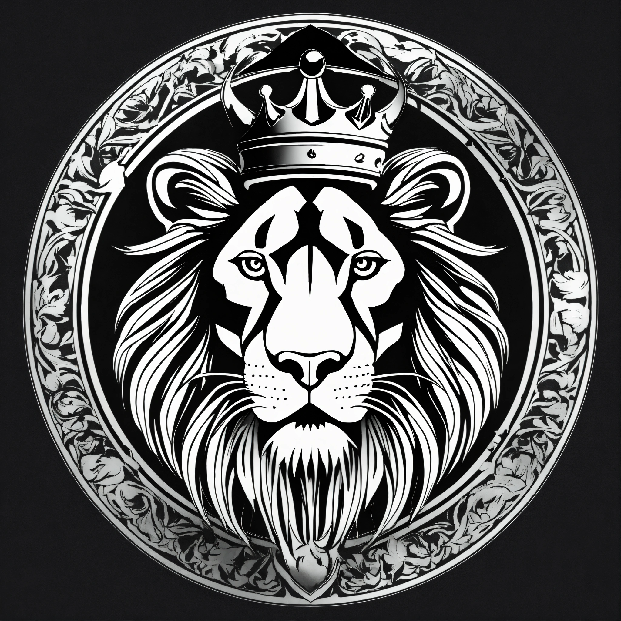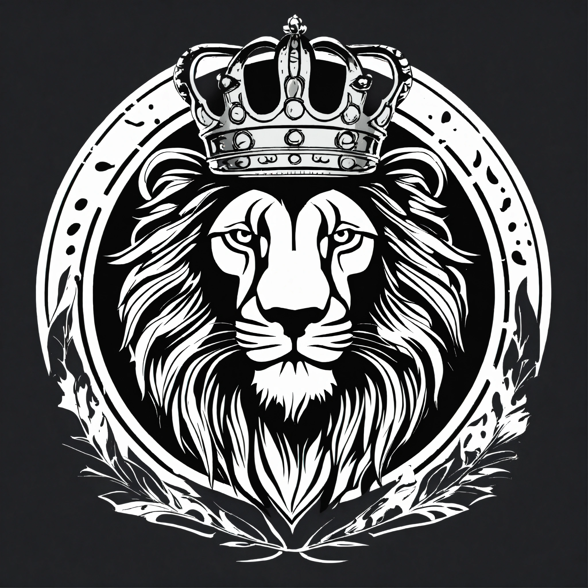 Logo rond arrogant d'un lion enragé avec une couronne en noir et blanc