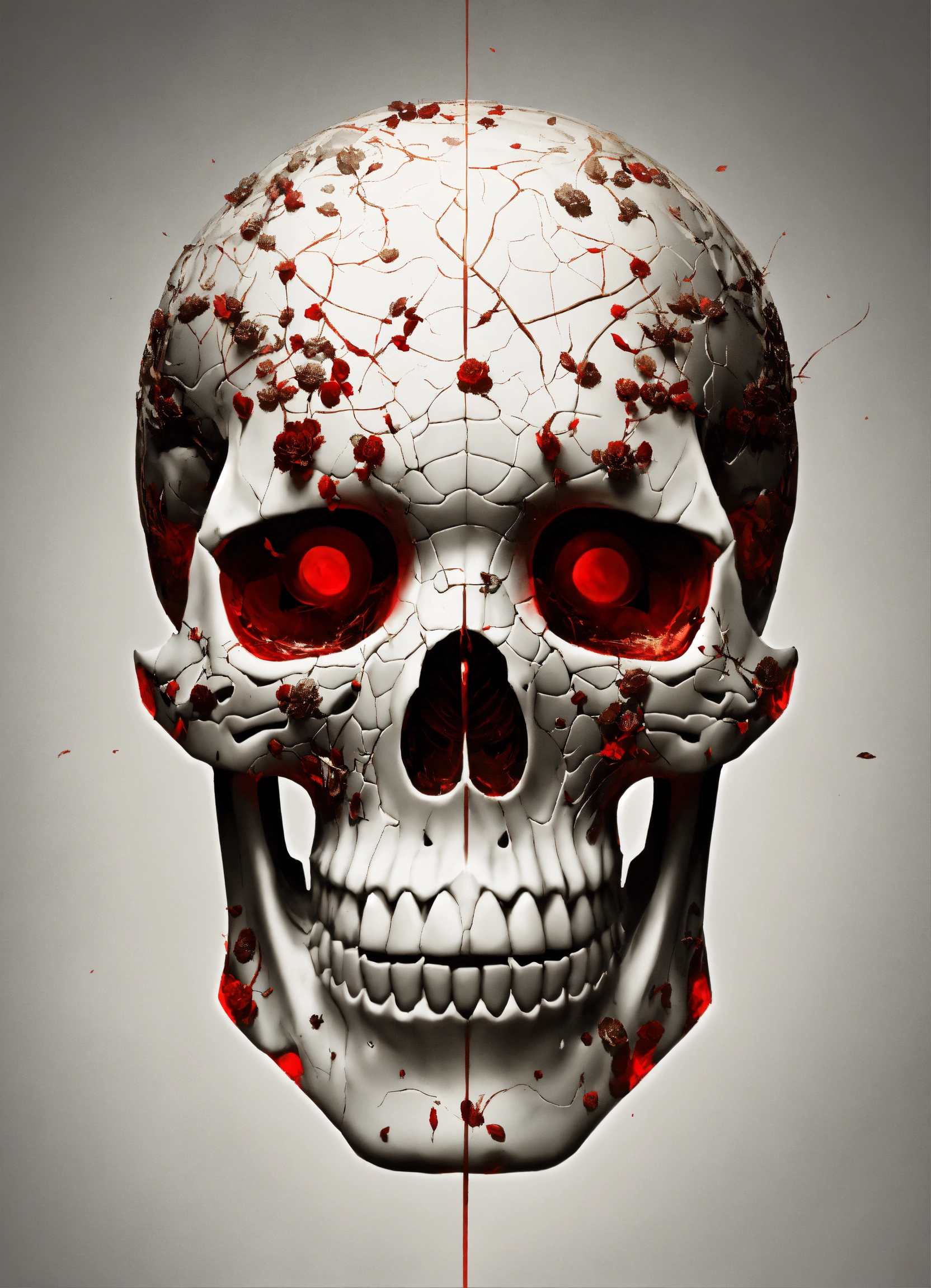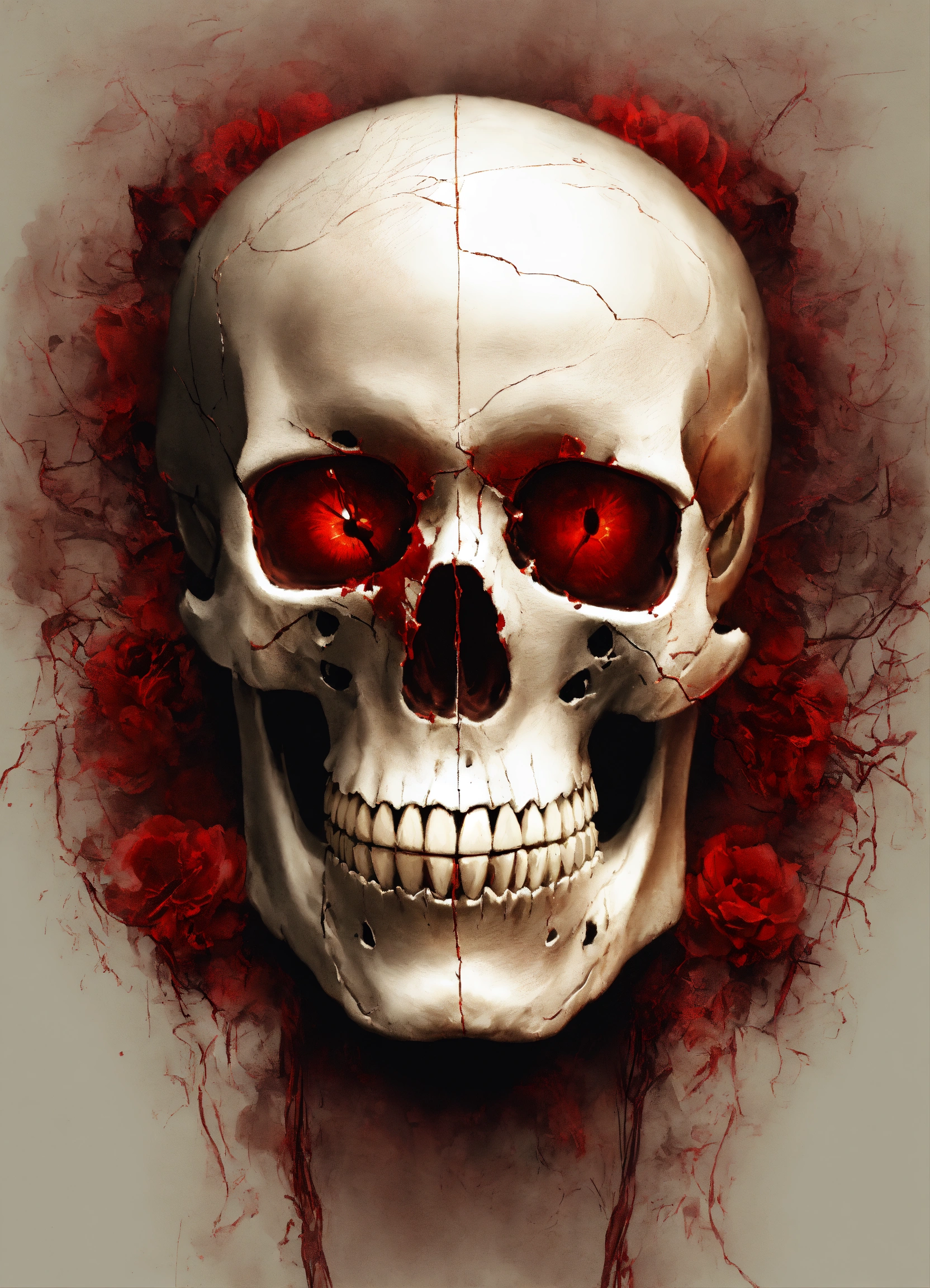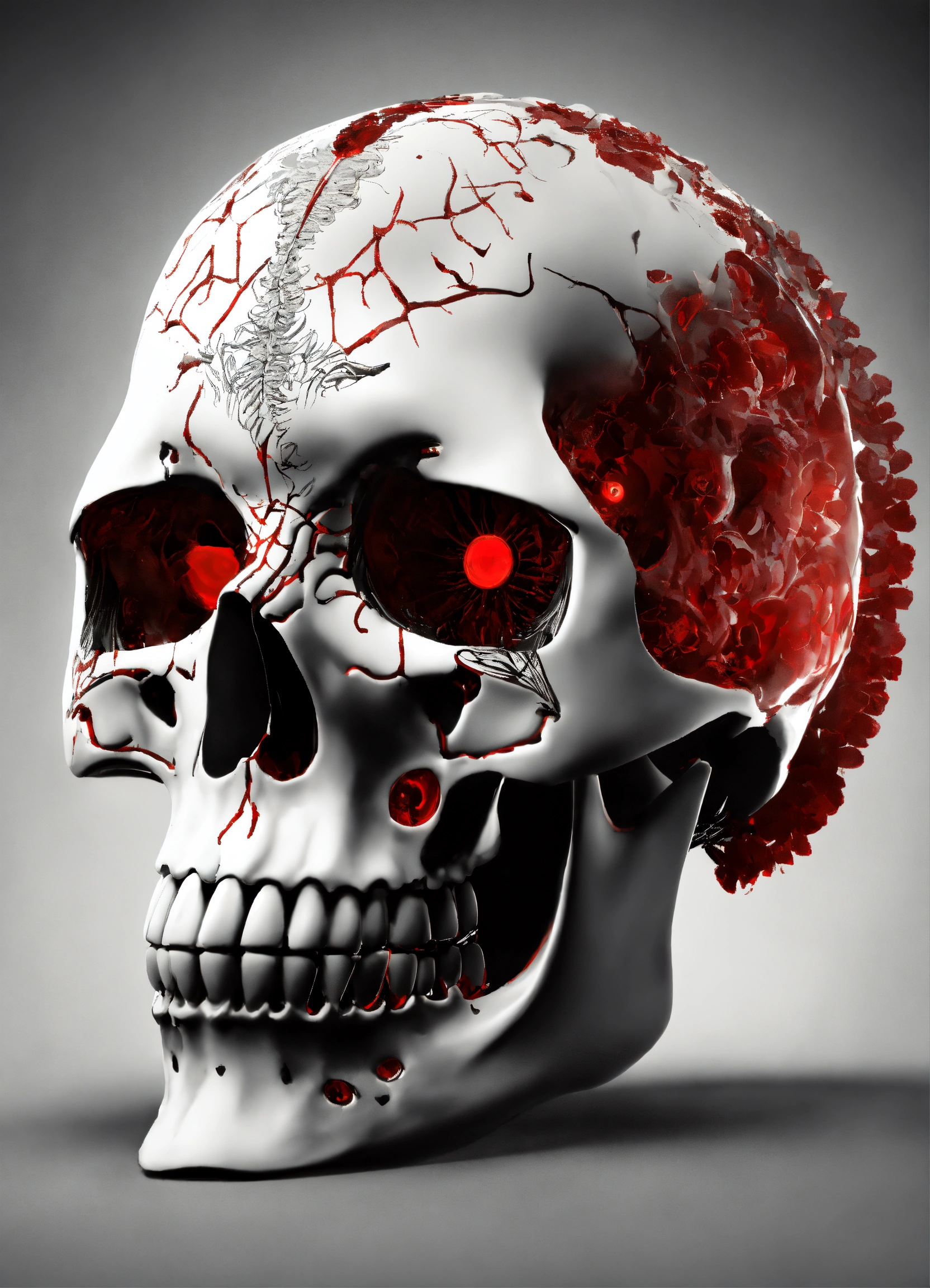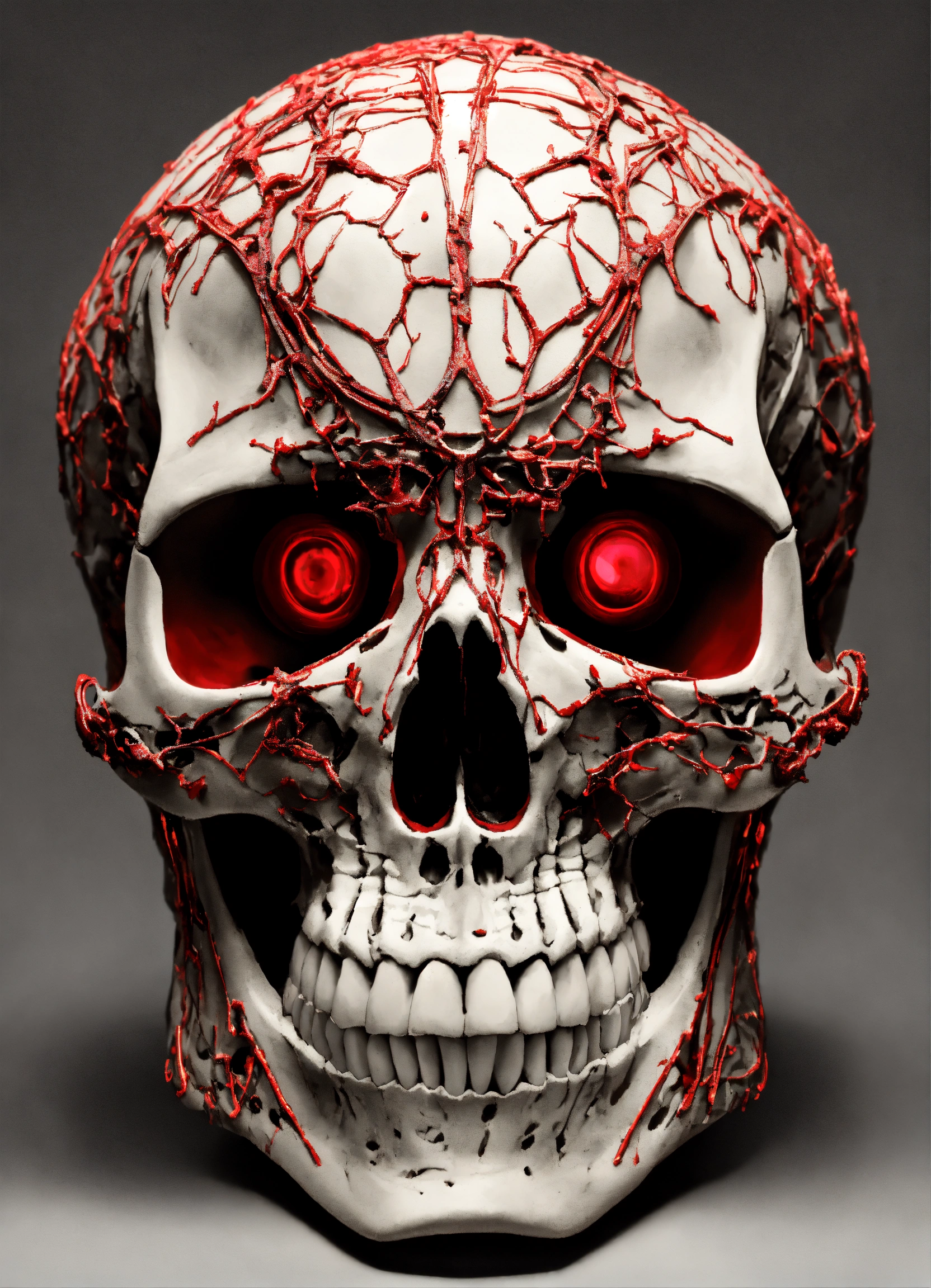 Create for me an image of a spine-tingling skull with red eyes on a white background