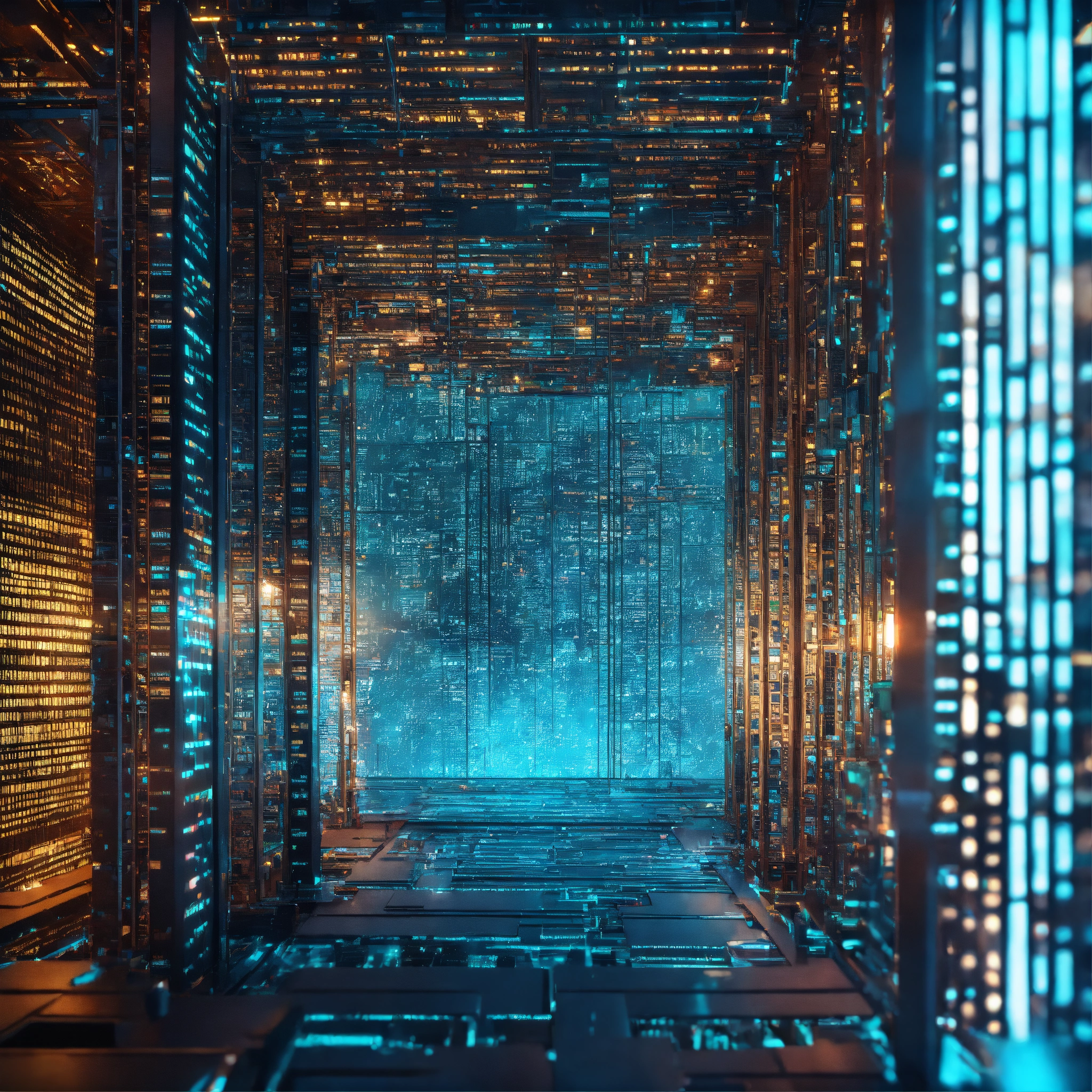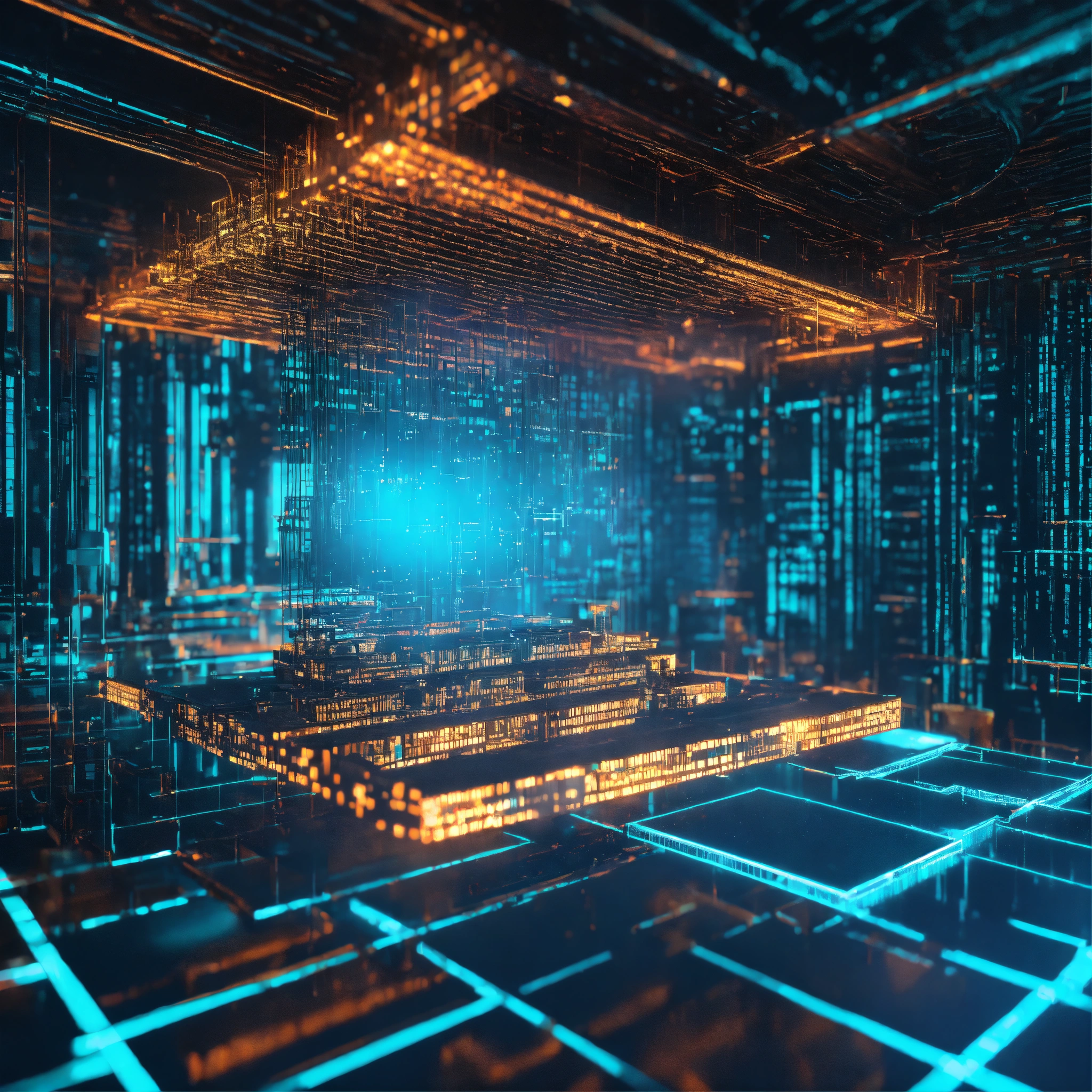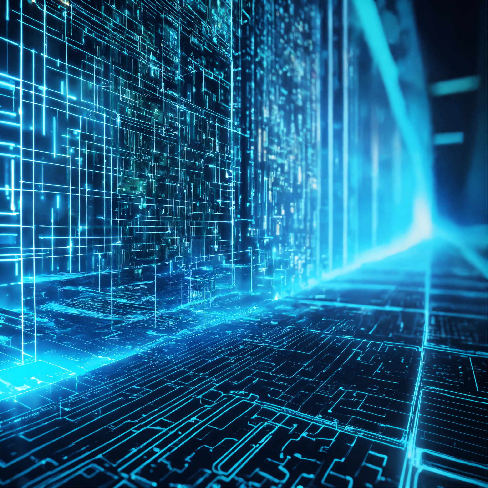 Ultra realistic bright photo of a very high tech 3d software code structure lit with bright blue and turquoise light