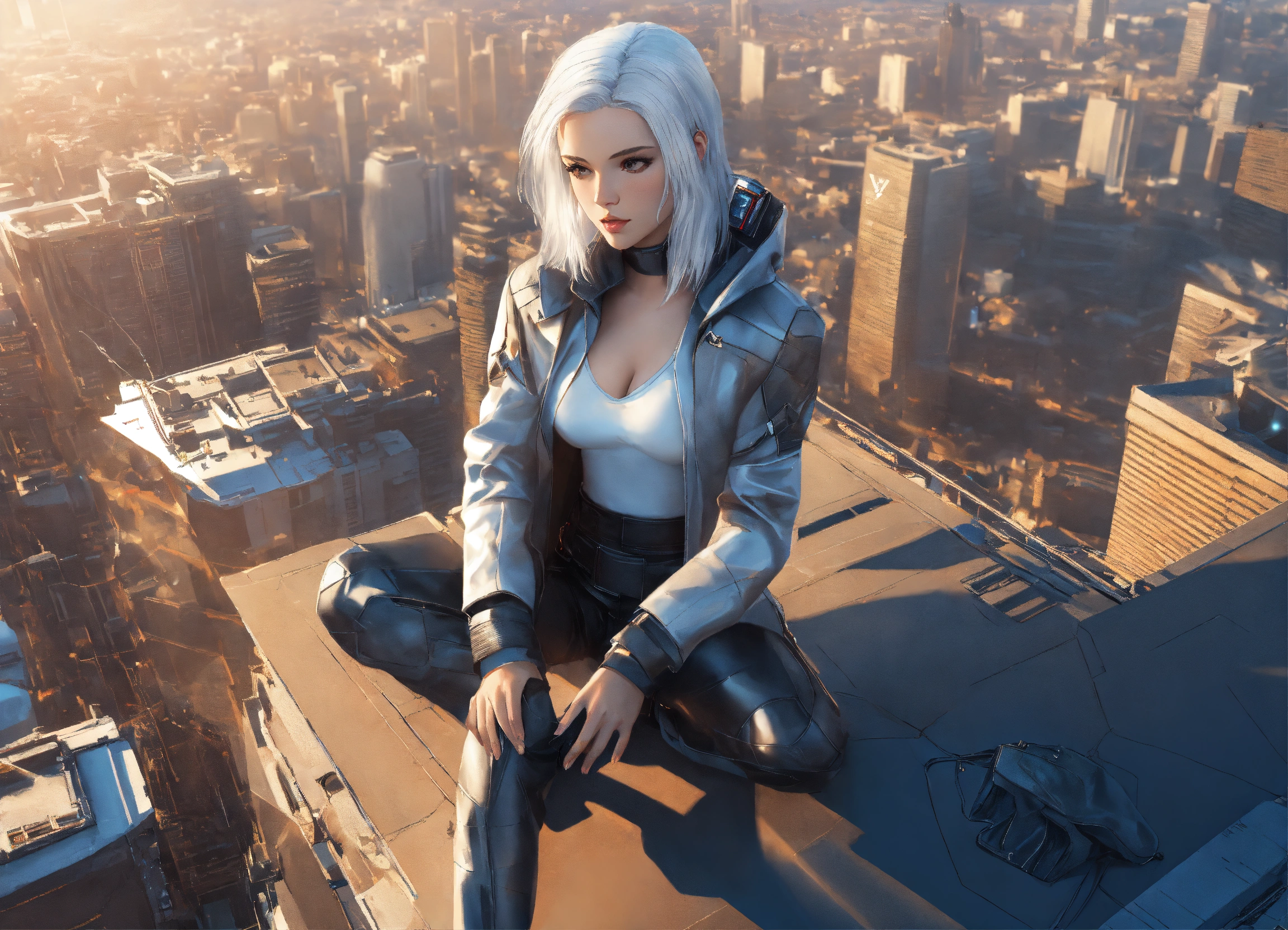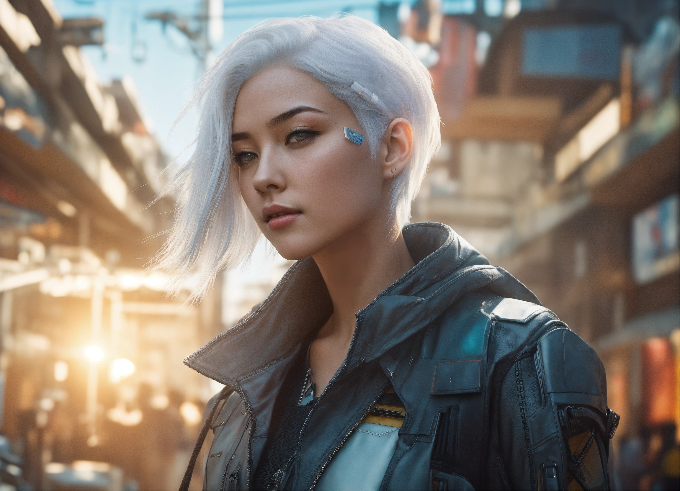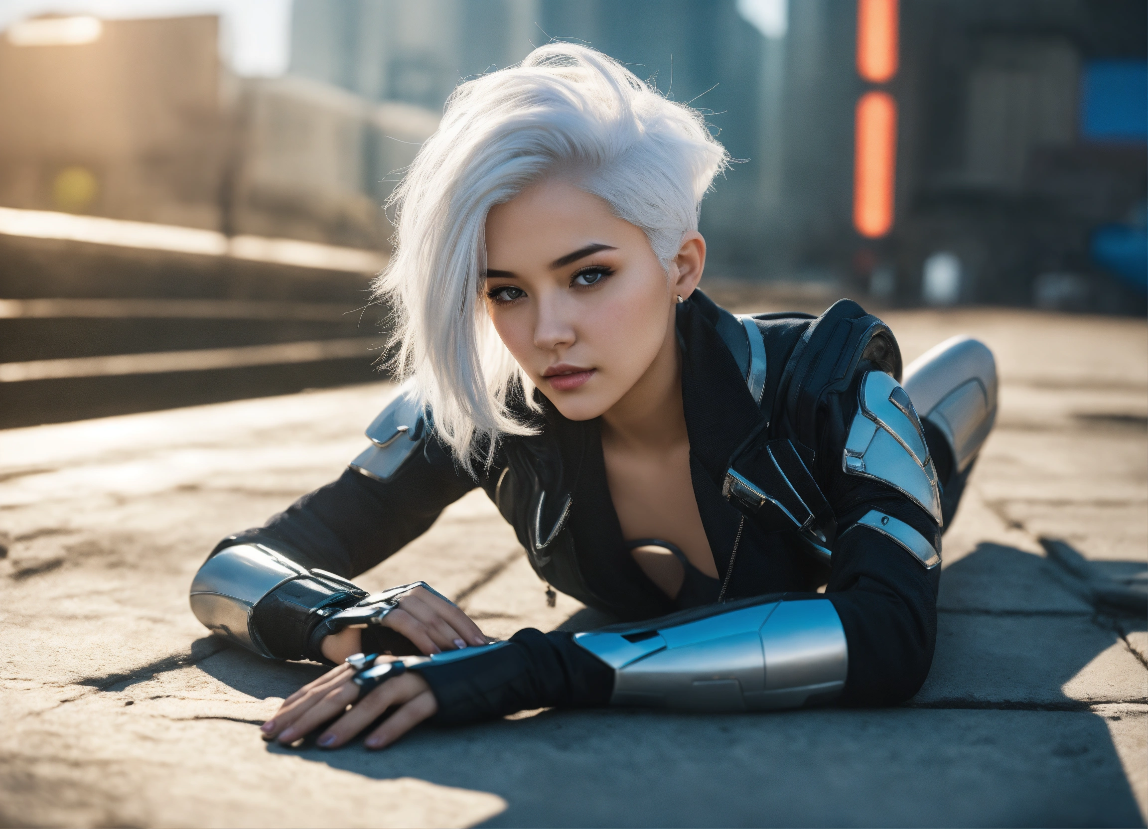 Top view full body high detailed photo realistic natural photo cyberpunk dream girl, futuristic, sunny weather. x-men white hair silver