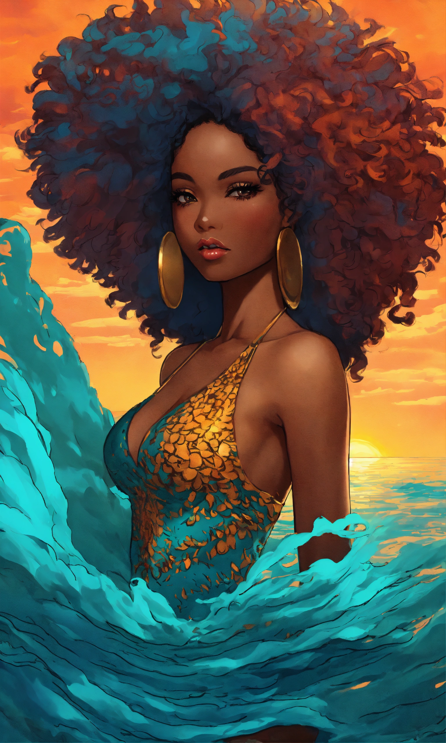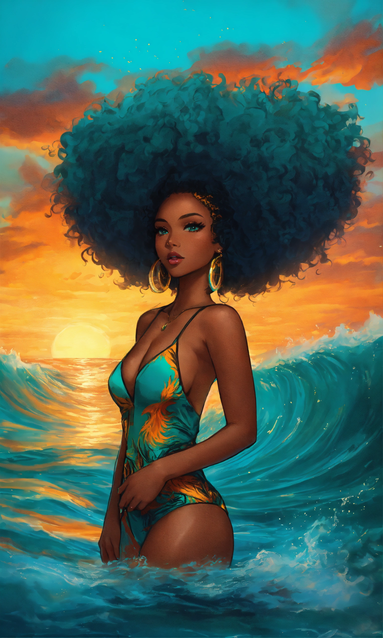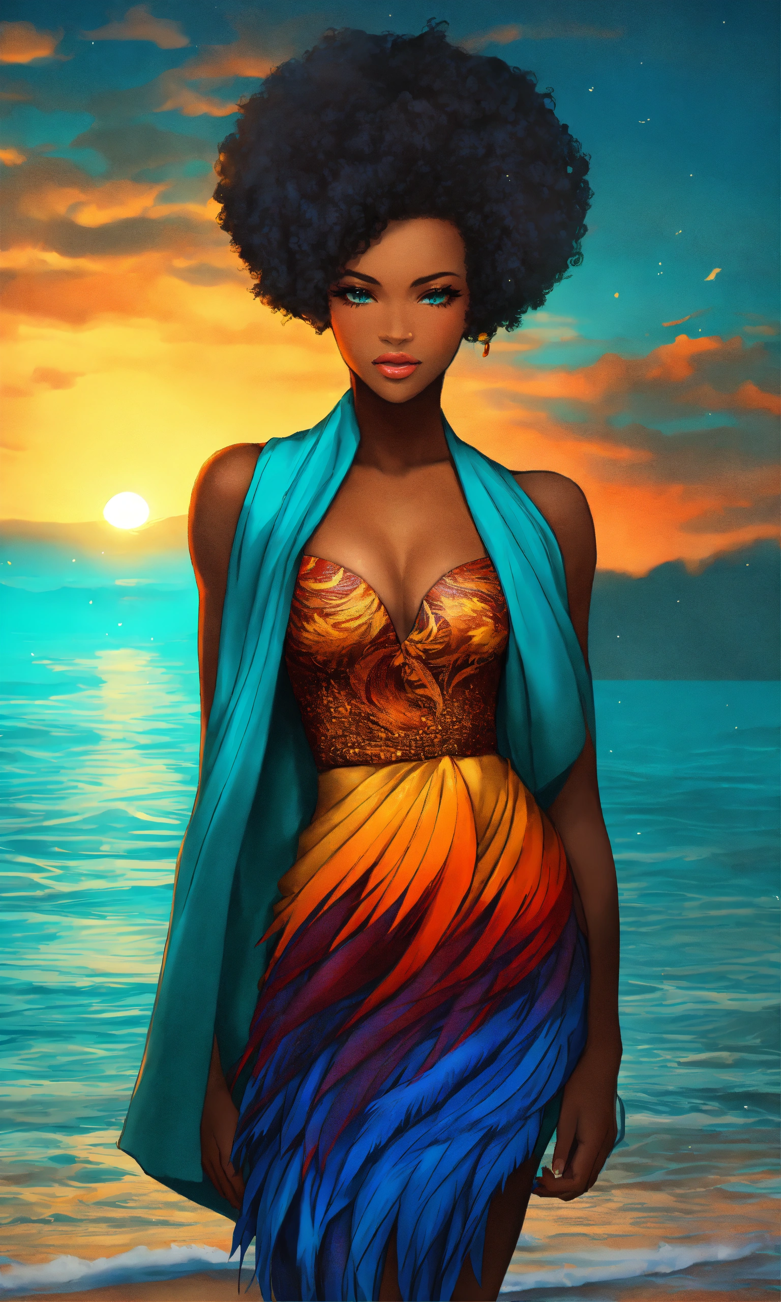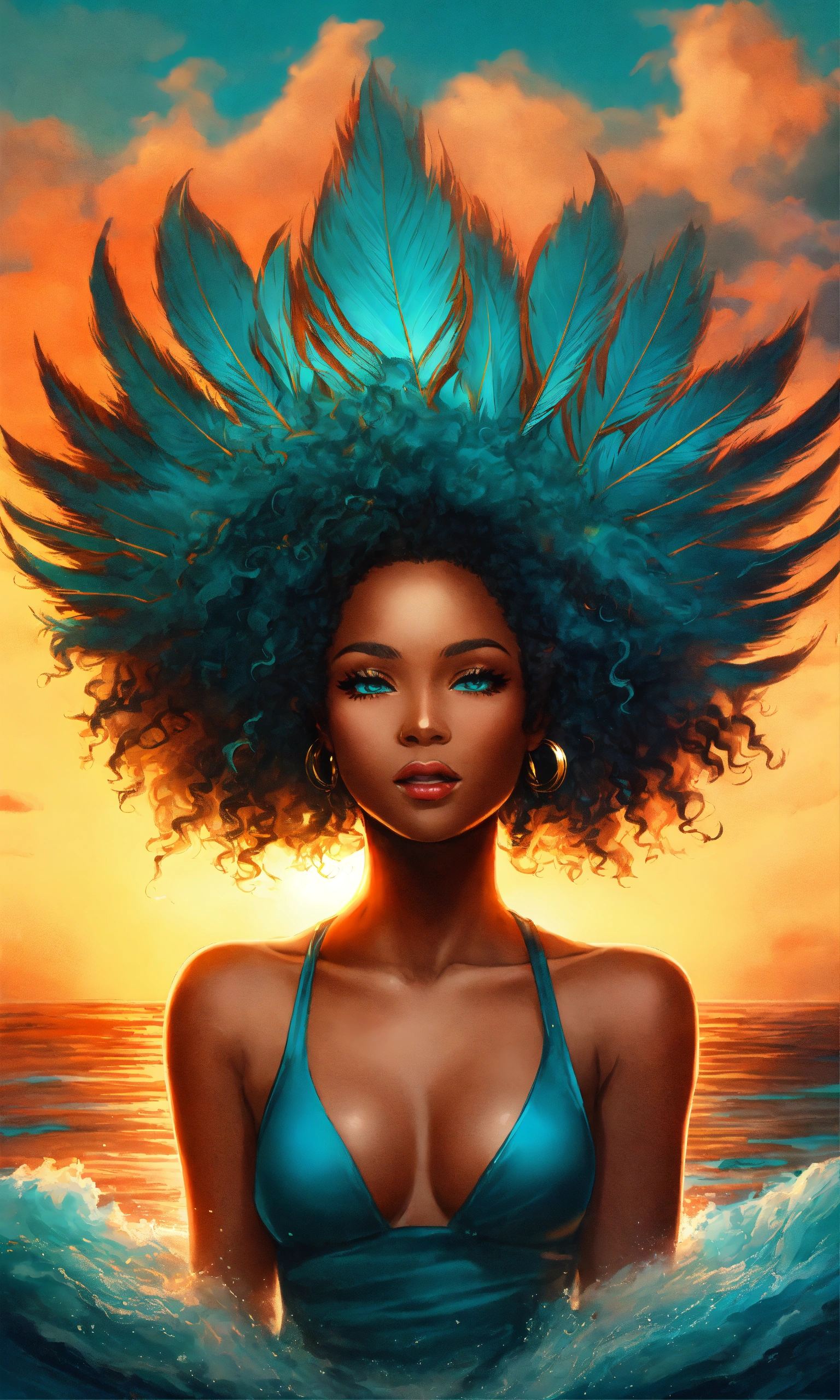 “i will rise as a phoenix before i drown in self doubt“ afrocentric woman, woman’s hair gradually transitions ombré fashion from brown/ black hair texture into blazing phoenix feathers, full body, deep turquoise/ blue water, sunset sunrise blended background, manga kewpie