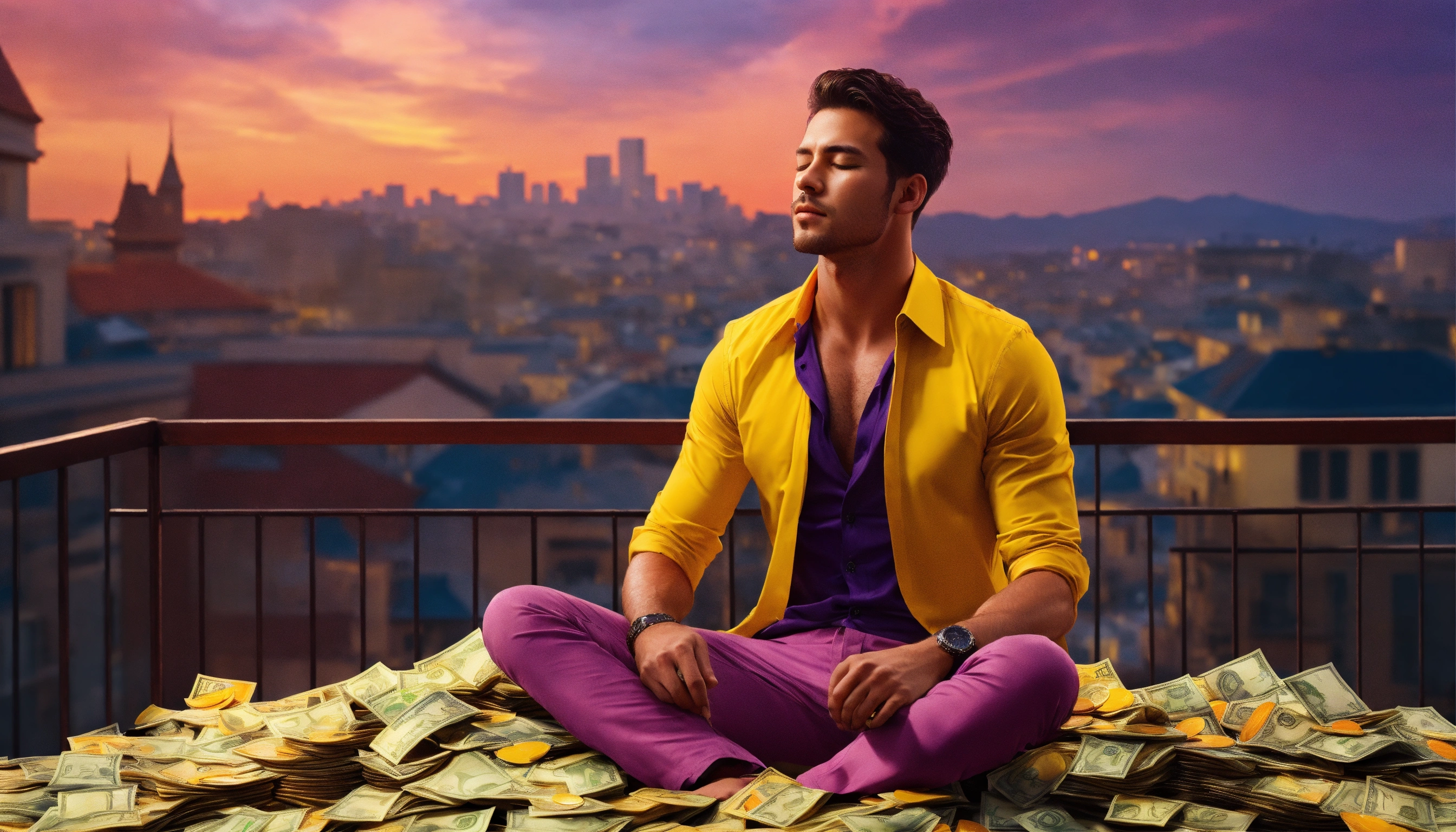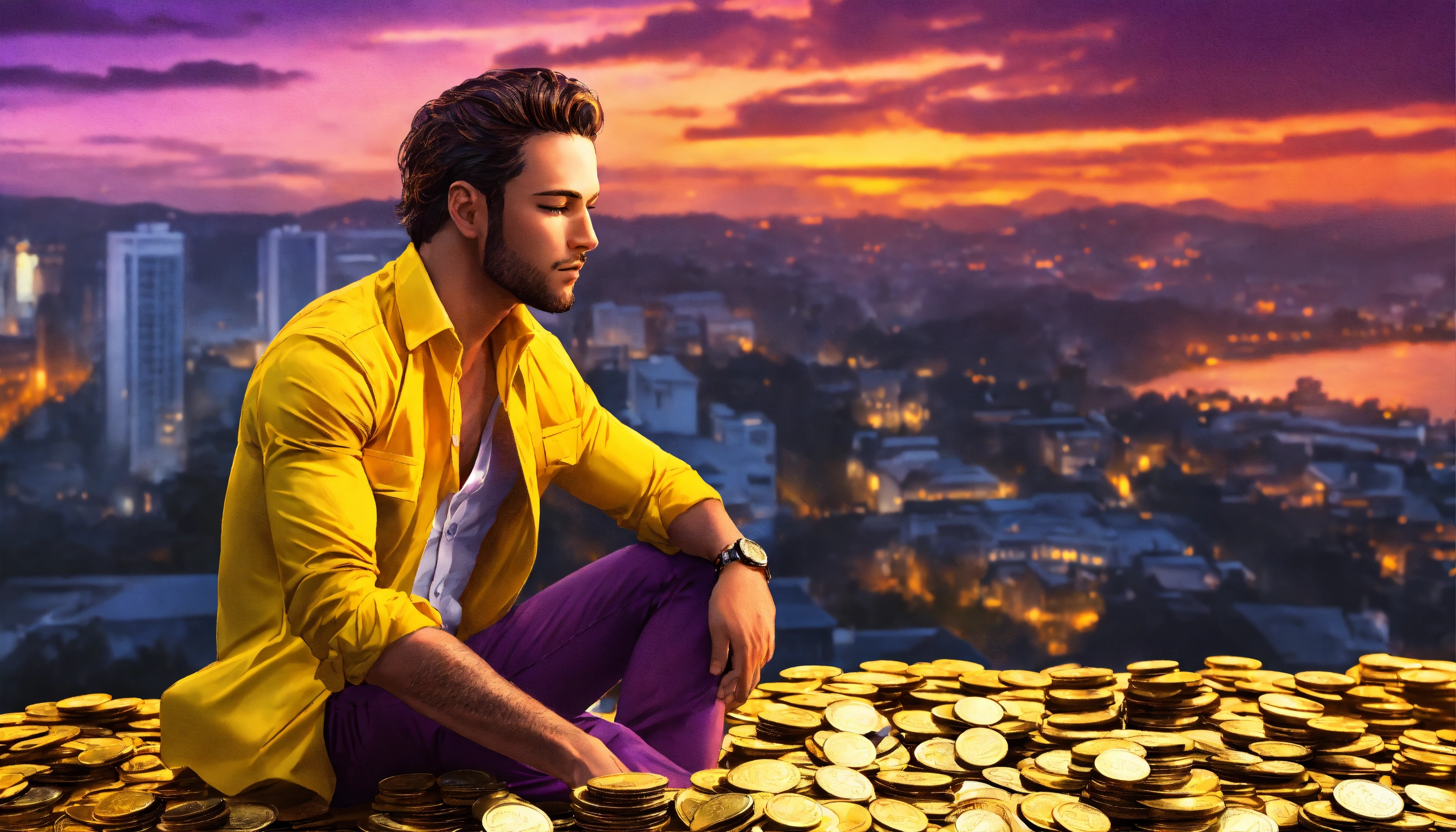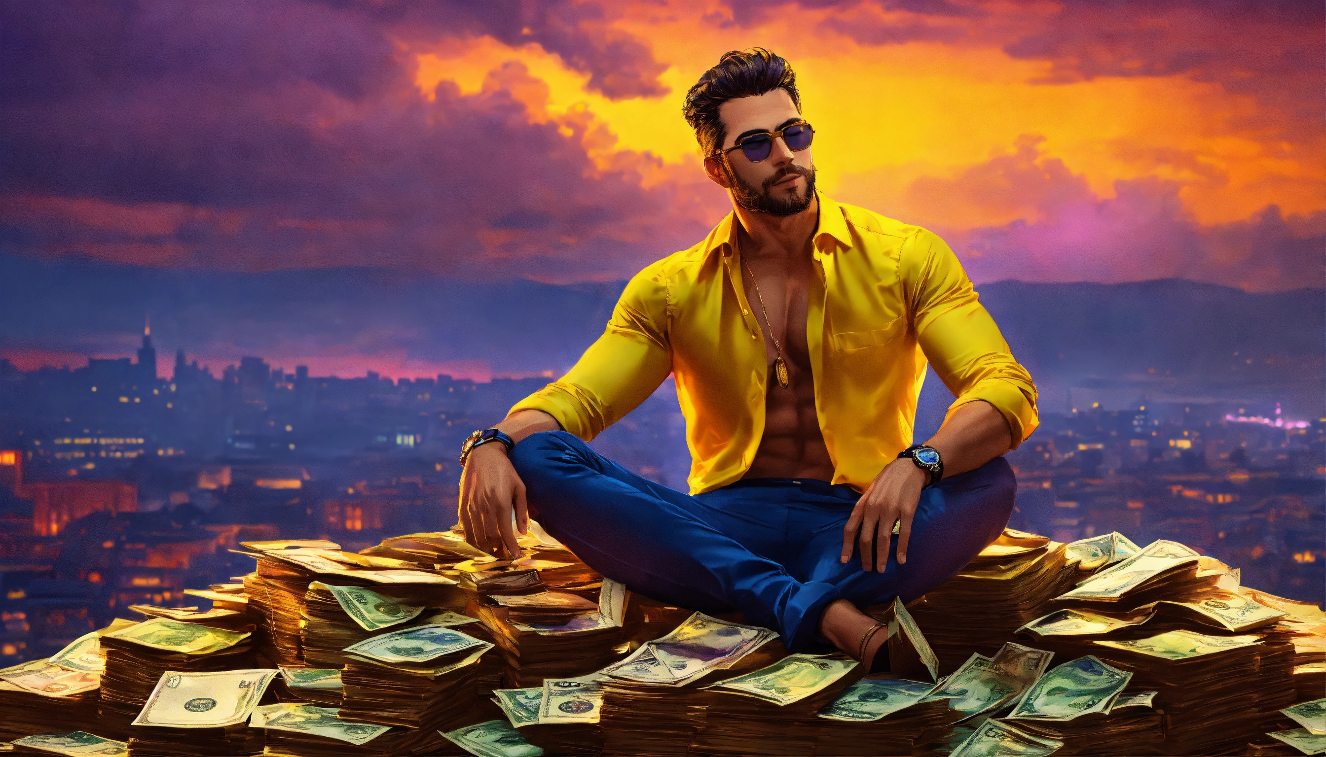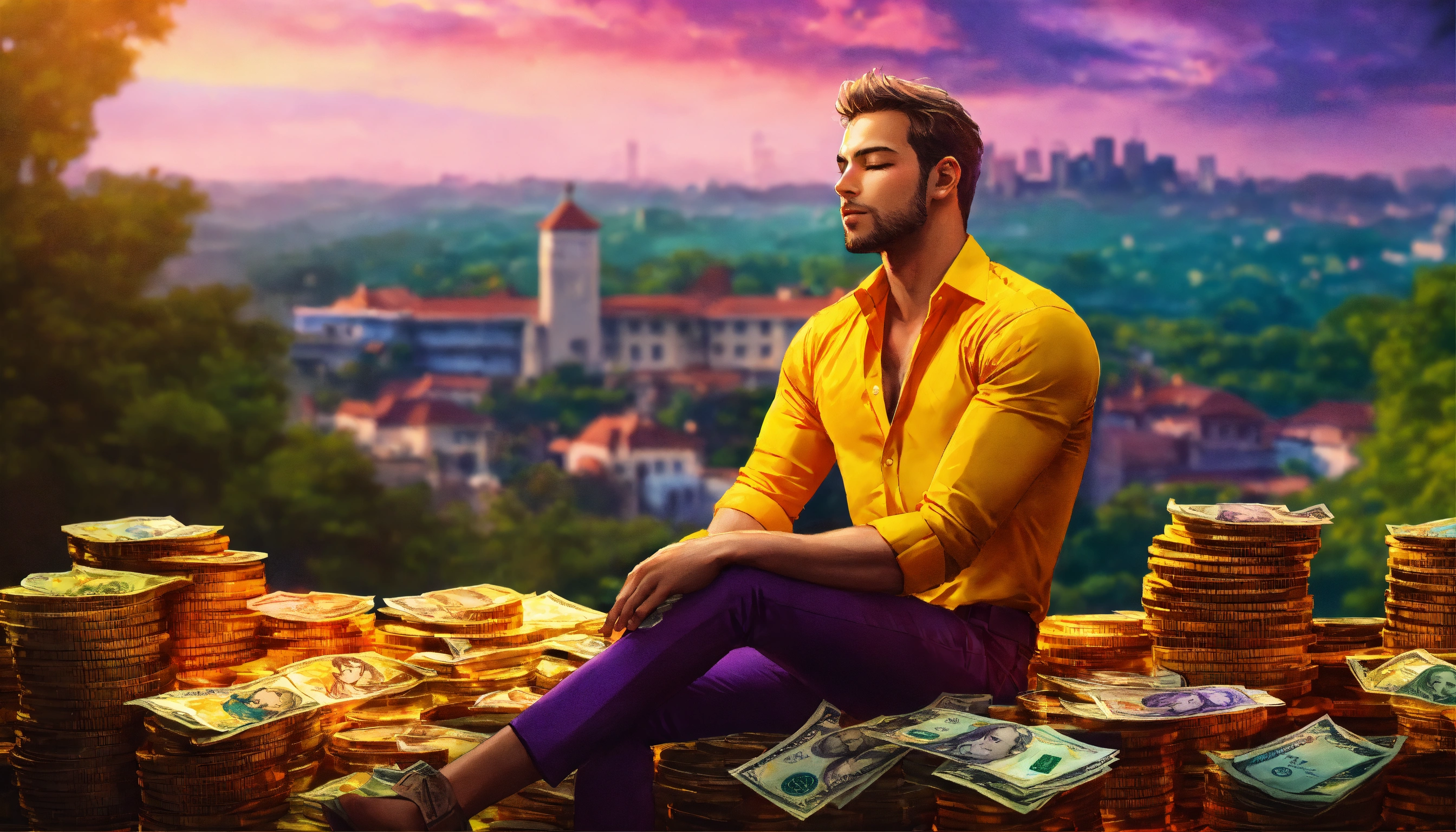 Handsome man, shirt unbuttoned, bright yellow shirt, eyes closed, mansion in the background, cityscape, bright orange, purple, bright red and bright yellow sky, sitting on a pile of bank notes and coins, 4k resolution, photo realistic