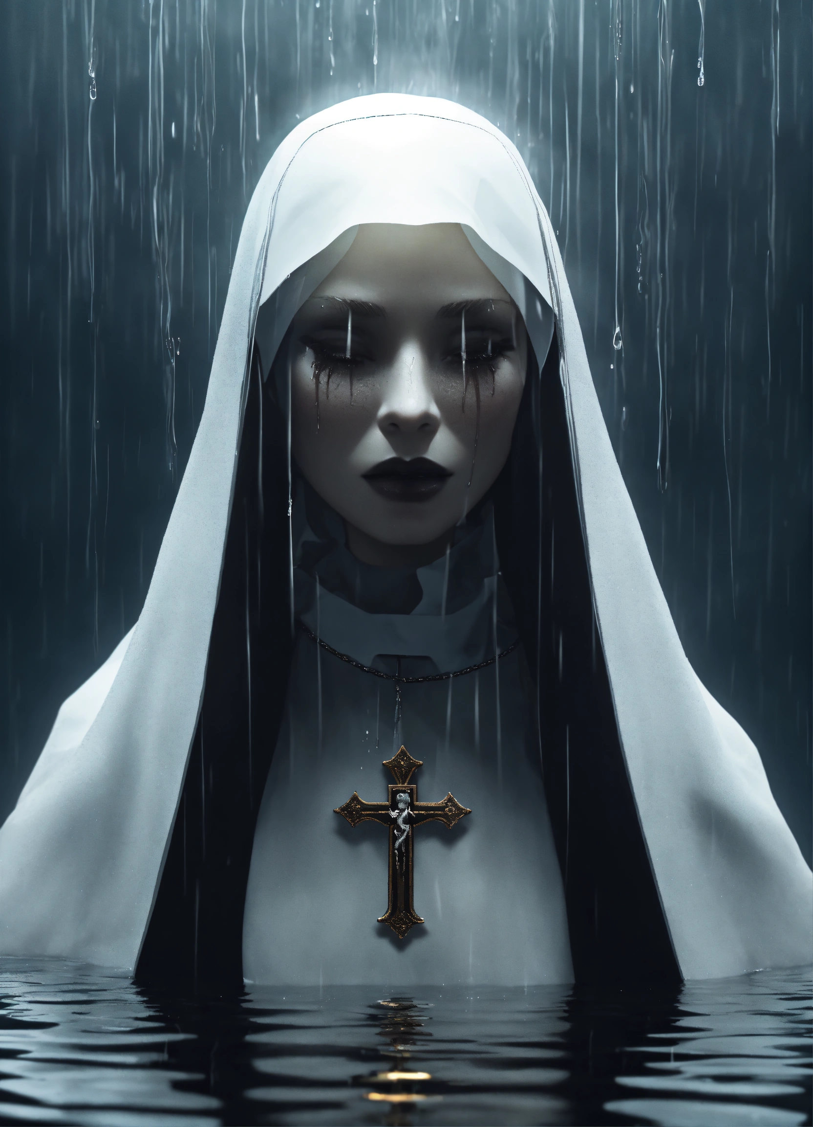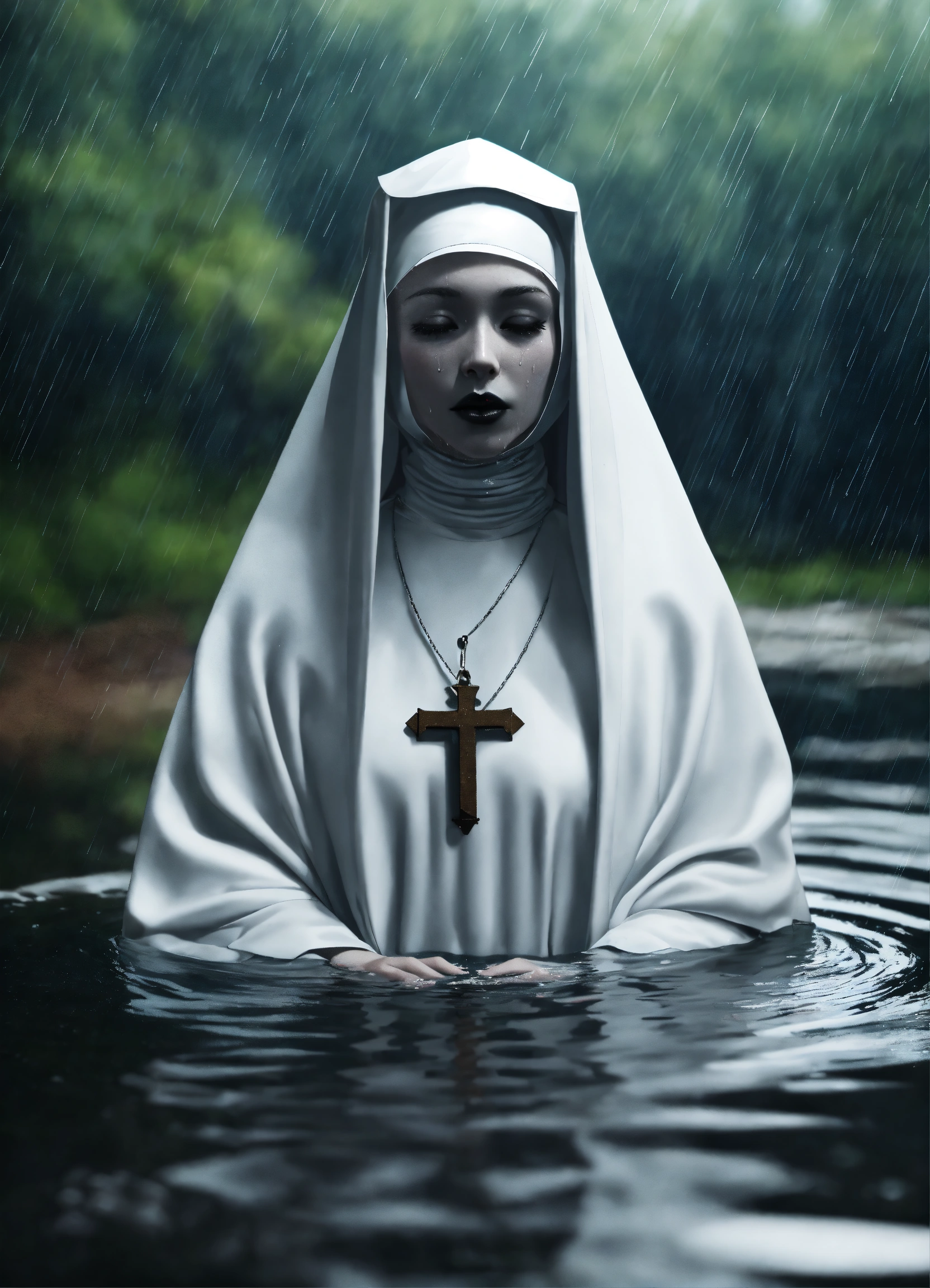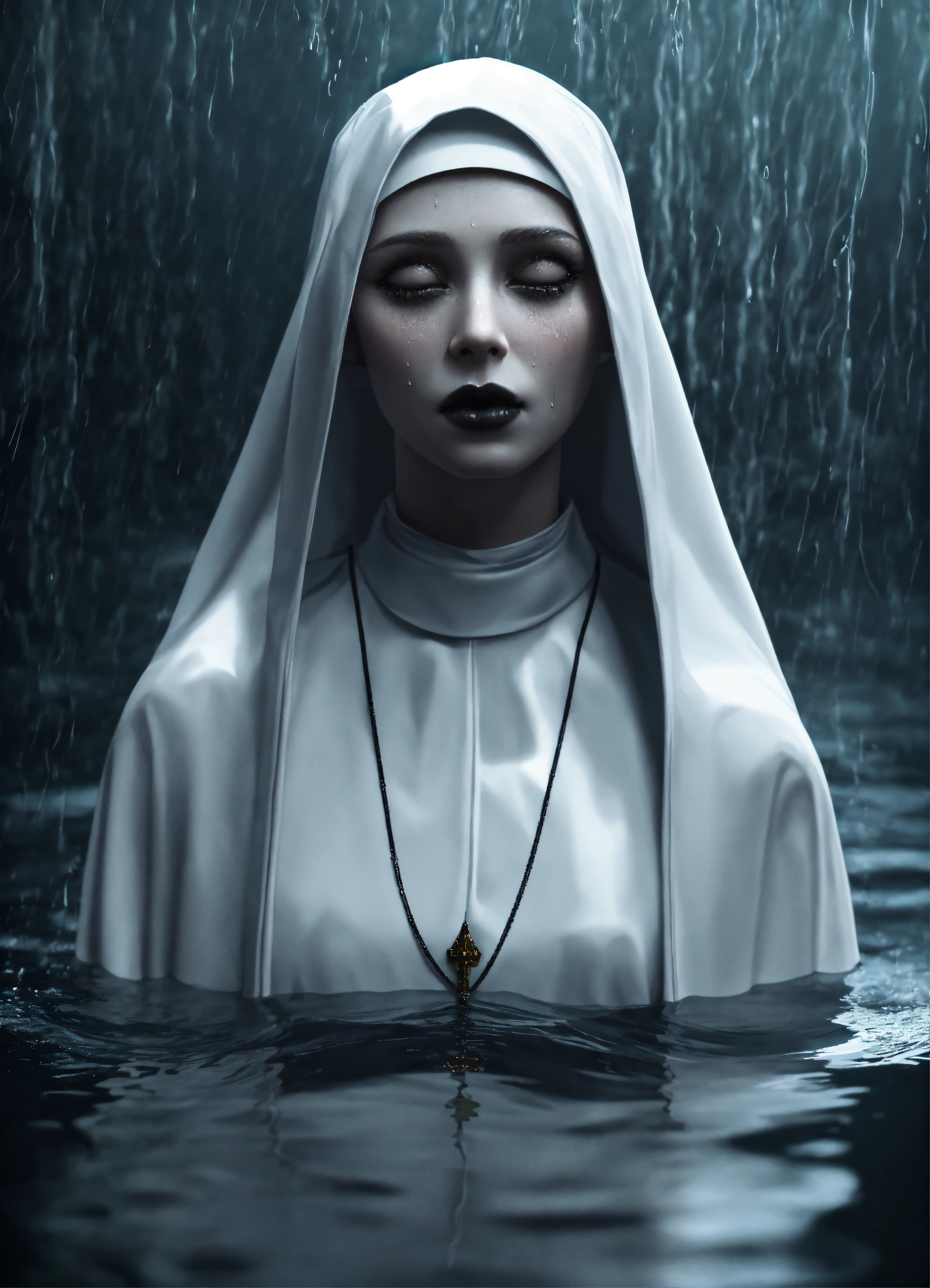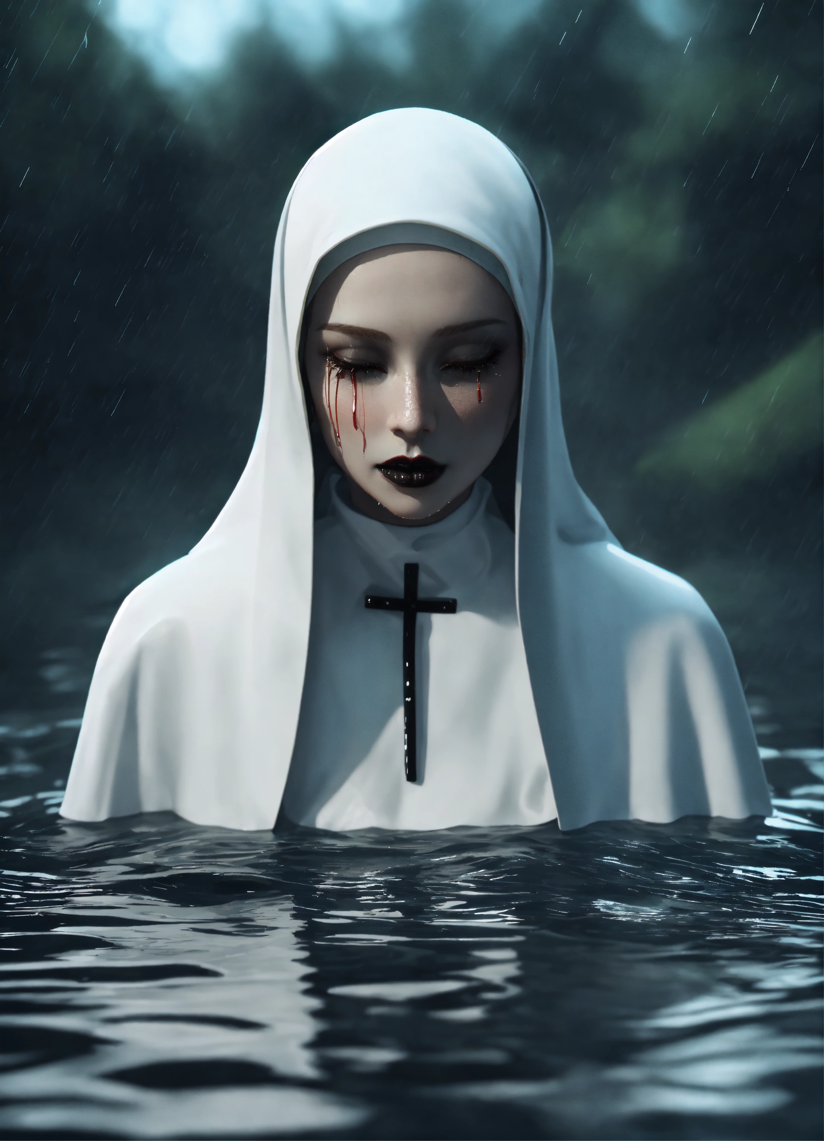 A scary nun in white in water. only the head and shoulders peep out of the water. she has no eyes, only black. she has black lips. she is wet. 3d model. dark. mist. rain