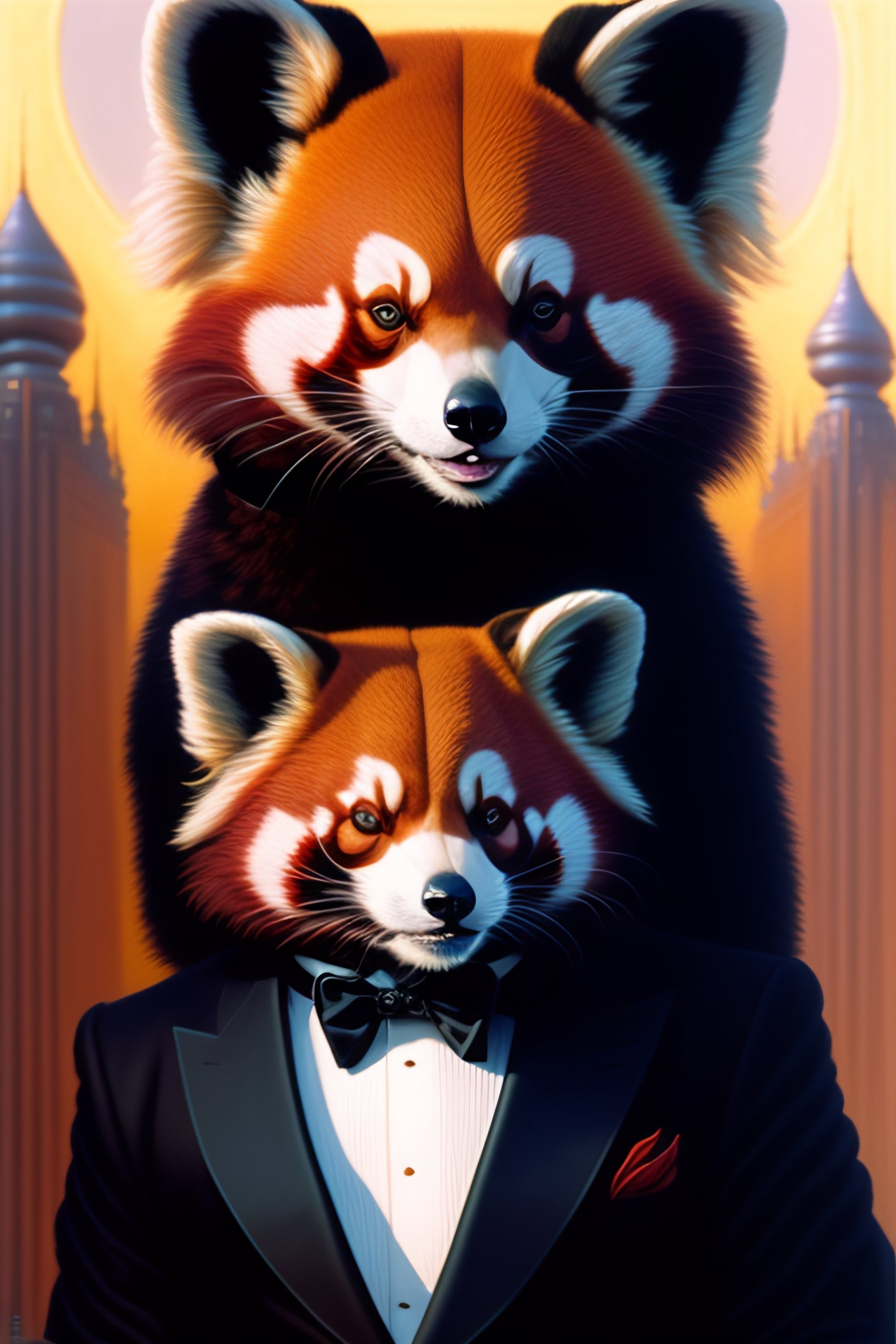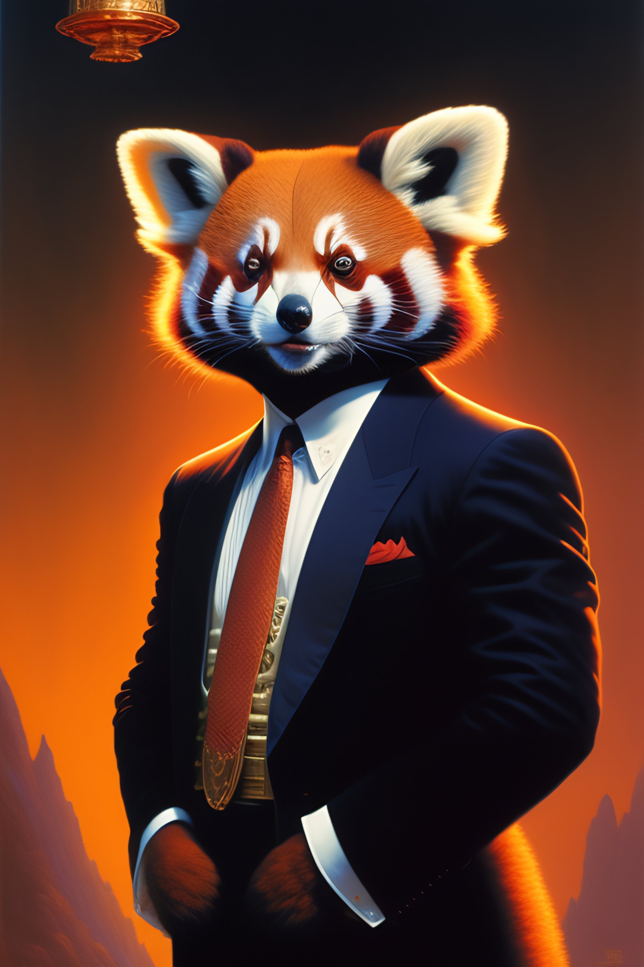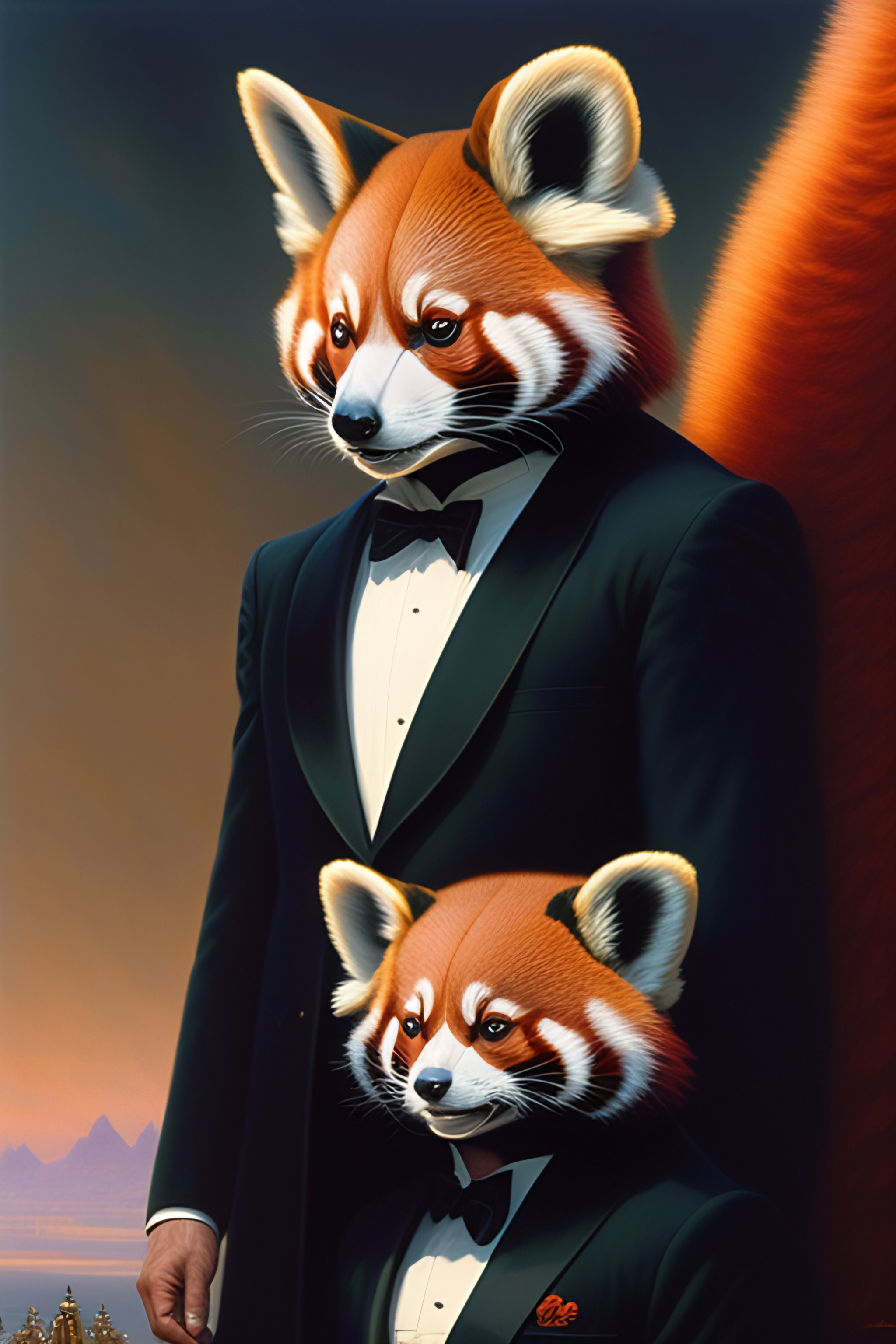 Anthropomorphic red panda in a bodyguard black suit, smiling face, equirectangular projection tim hildebrandt, wayne barlowe, bruce pennington, donato giancola, trending on artstation, cinematic composition, beautiful lighting, hyper detailed, 8 k, oil on canvas