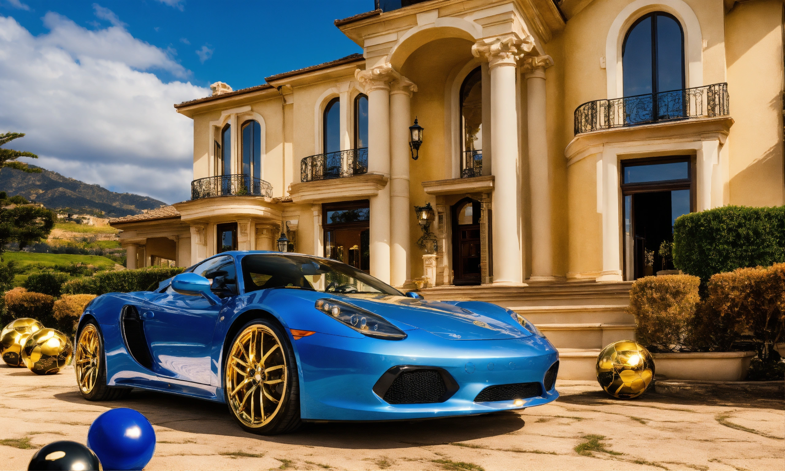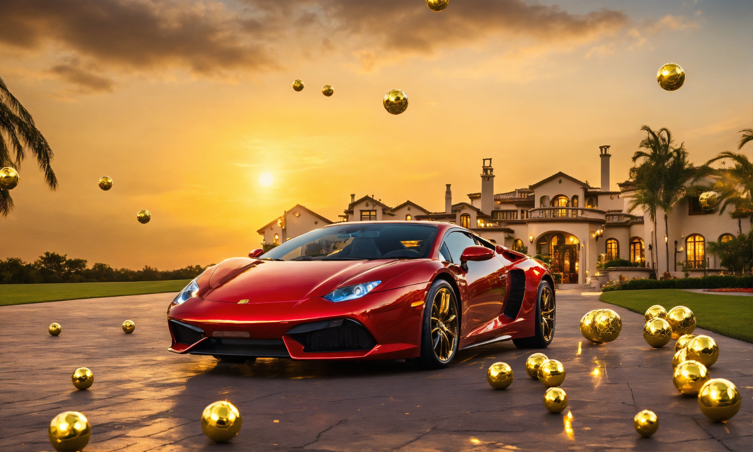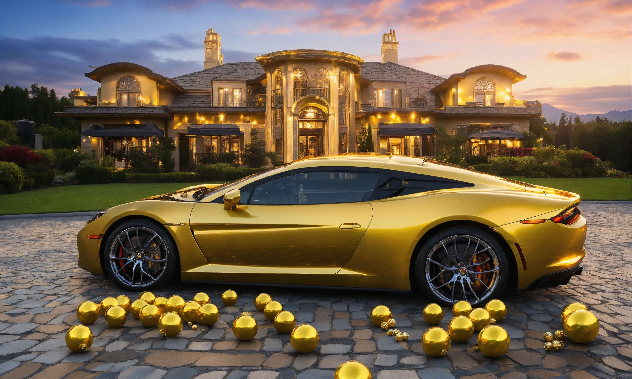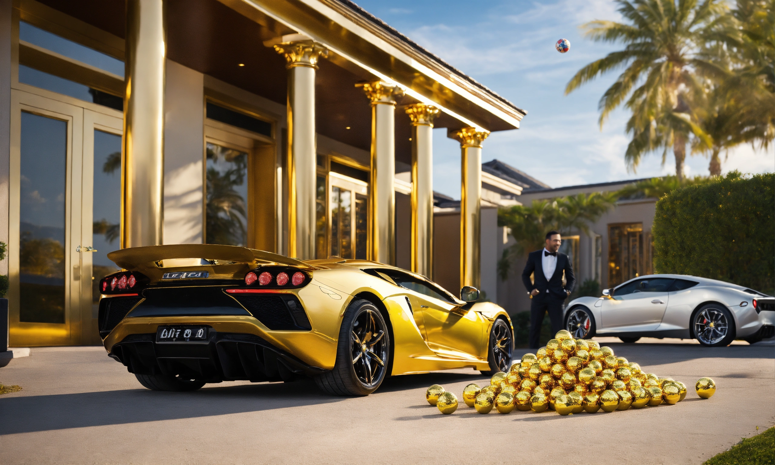 Lotto balls in front of luxurious gold mansion and gold sports car gold sky's and happy winner lotto balls scratch tickets