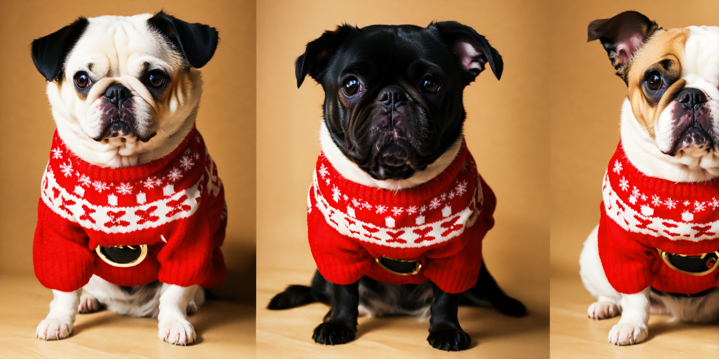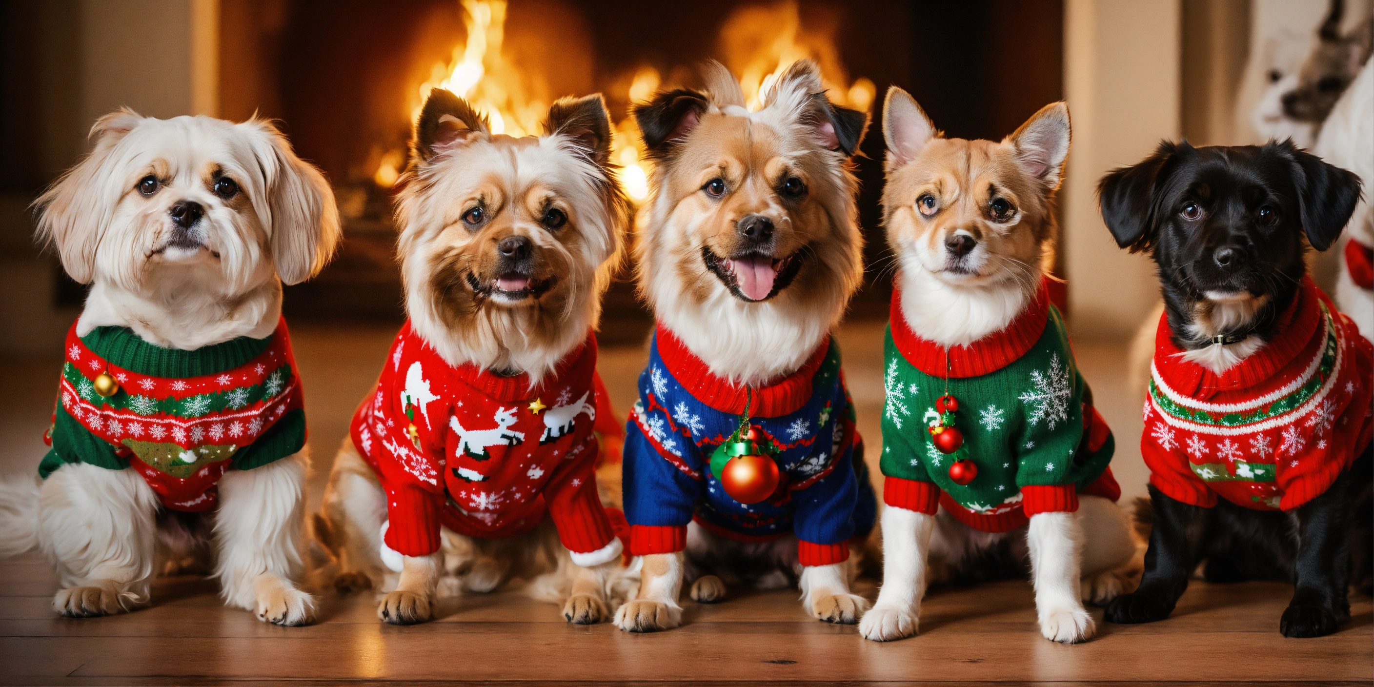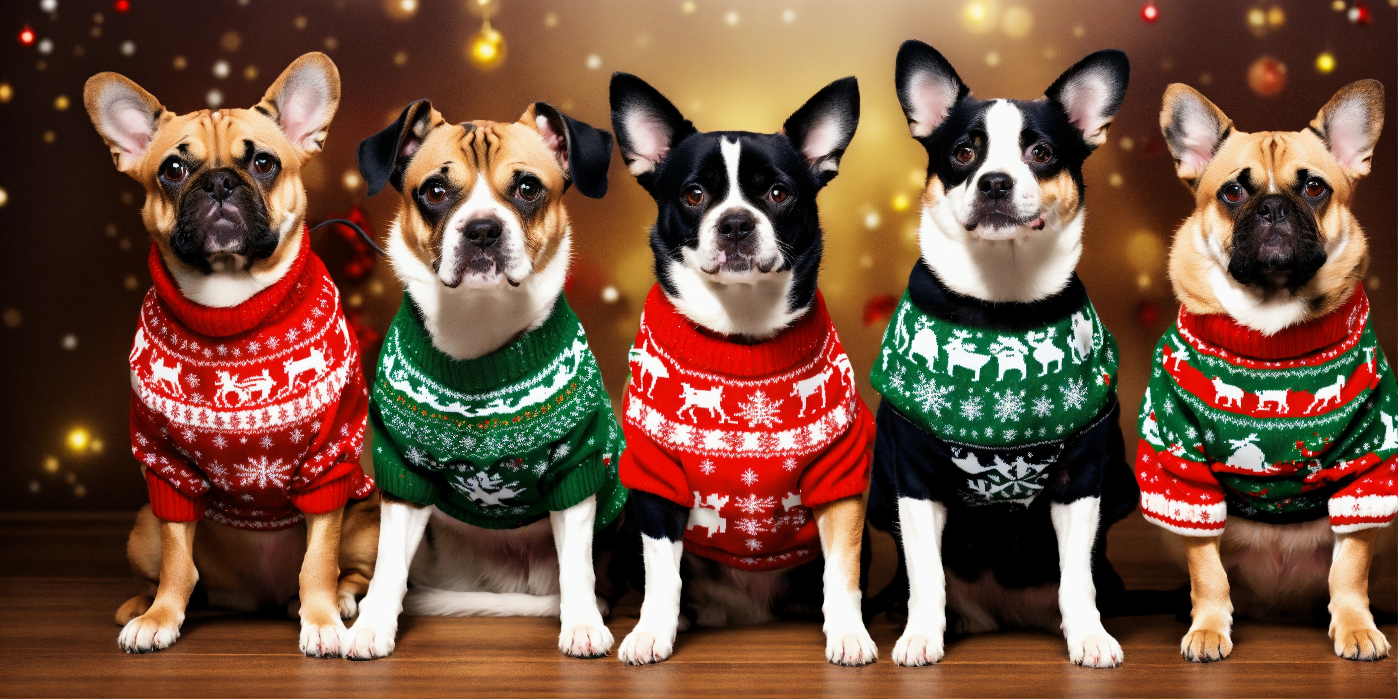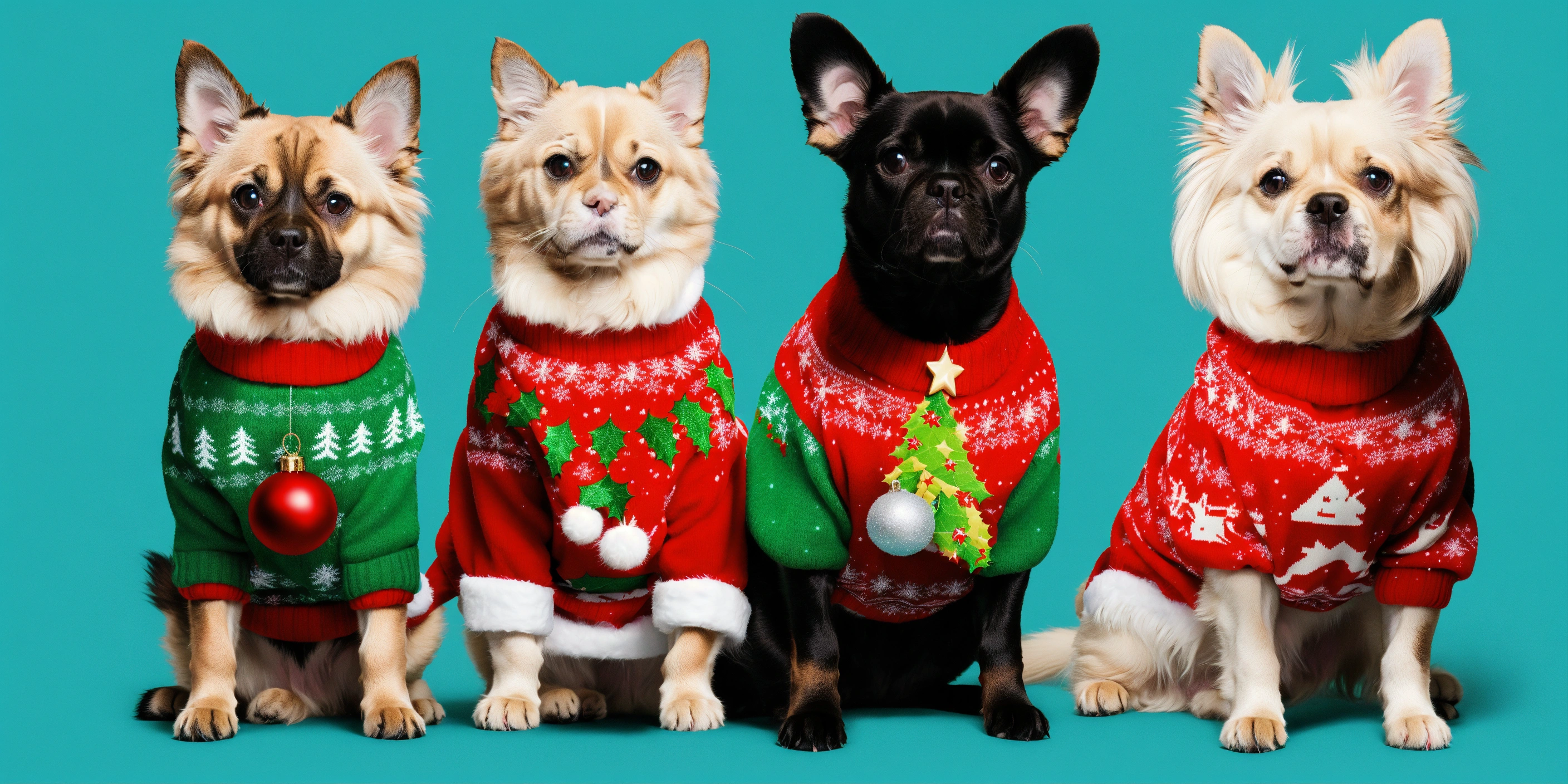 Dogs and cats wearing christmas's ugly human sweater