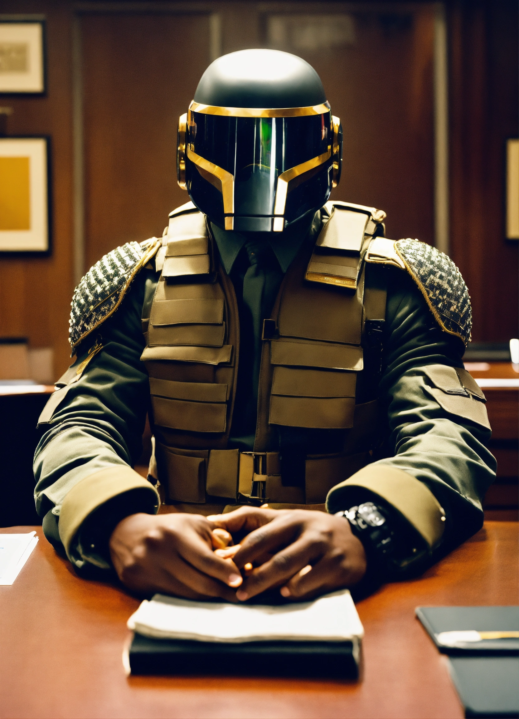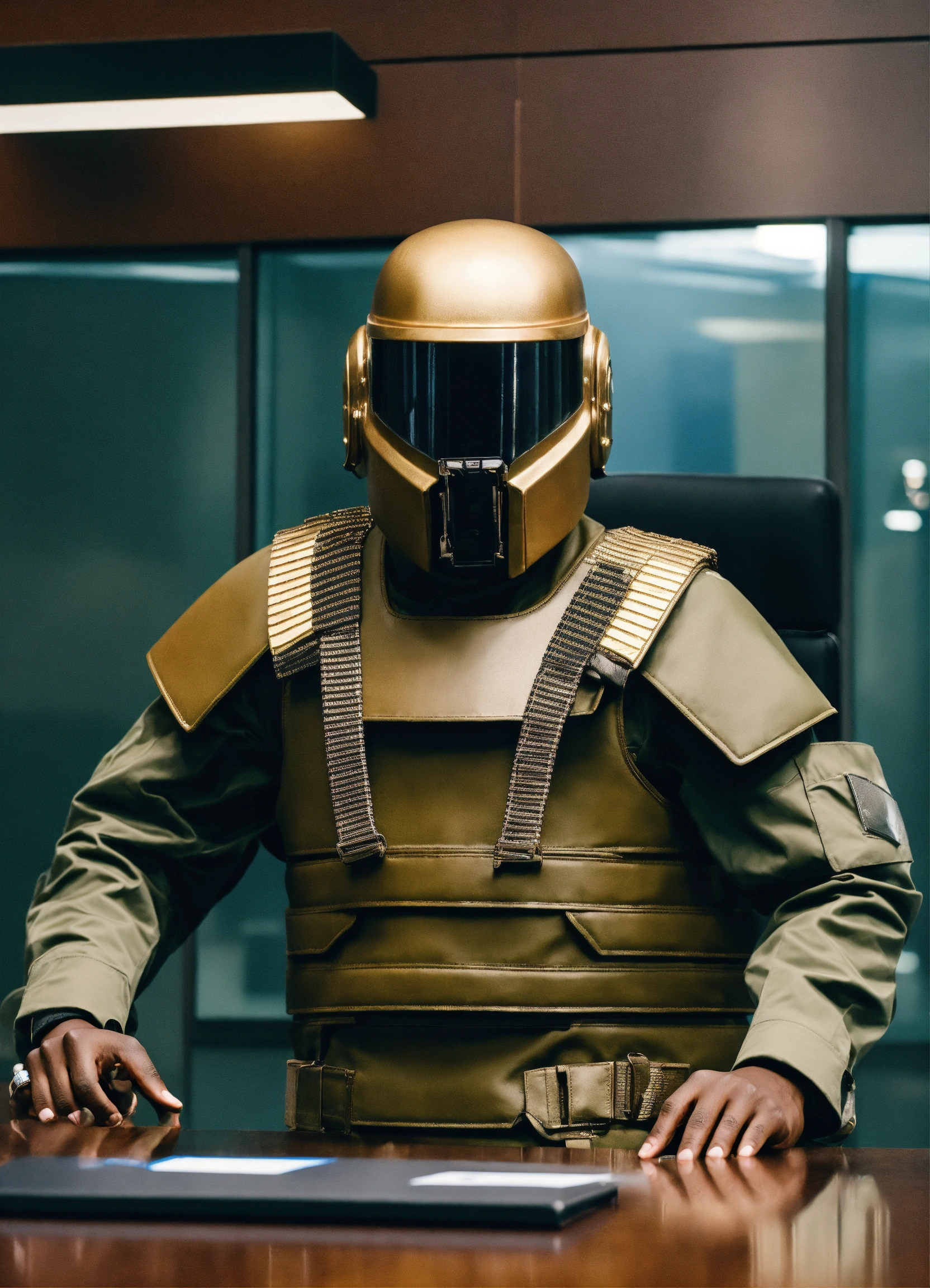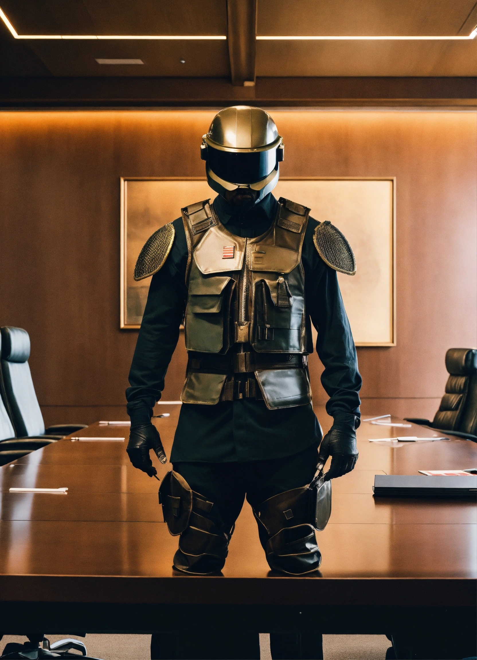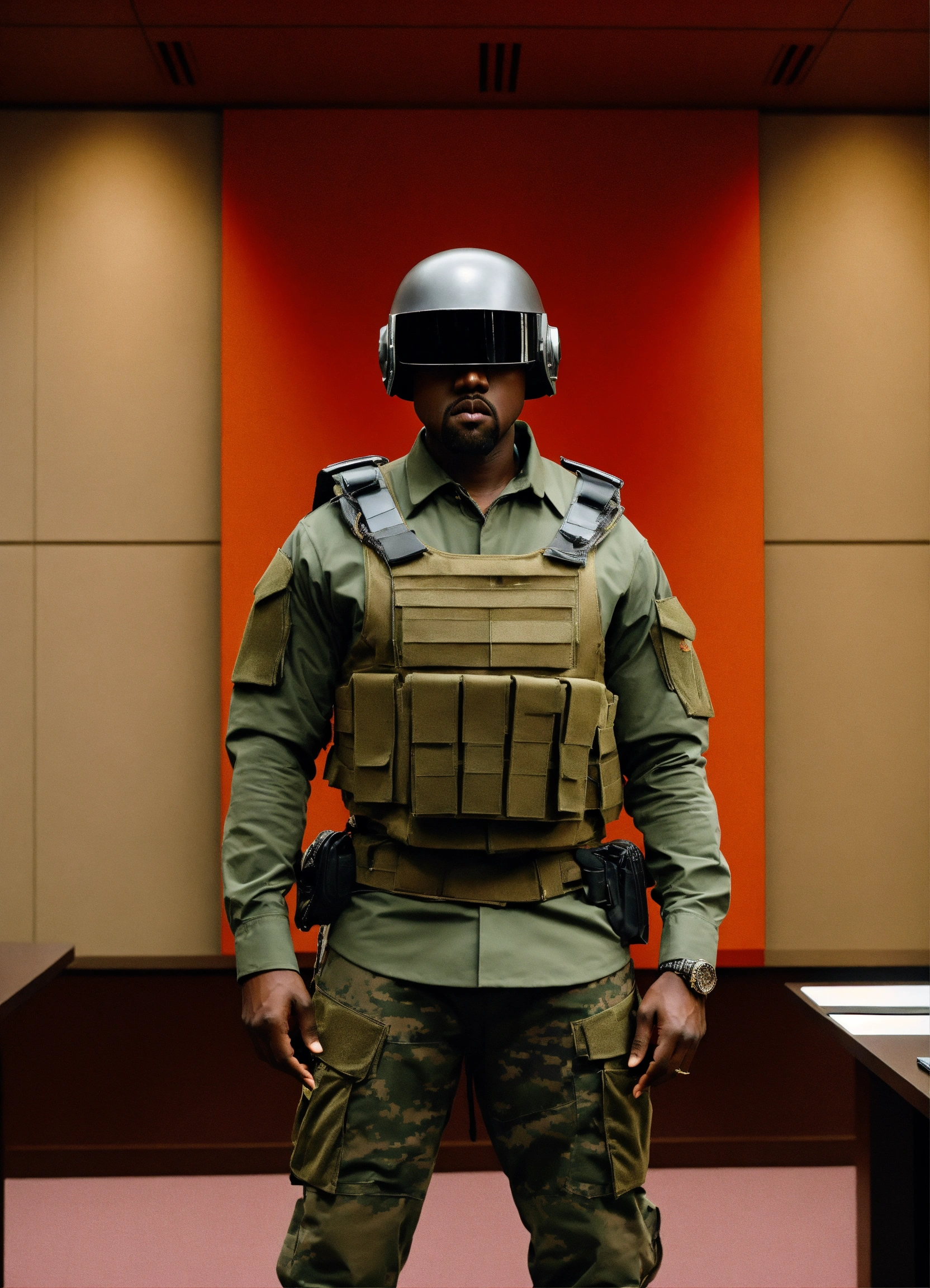 Futuristic kanye west with bullet proof vest on and military general helmet in a corporate boardroom