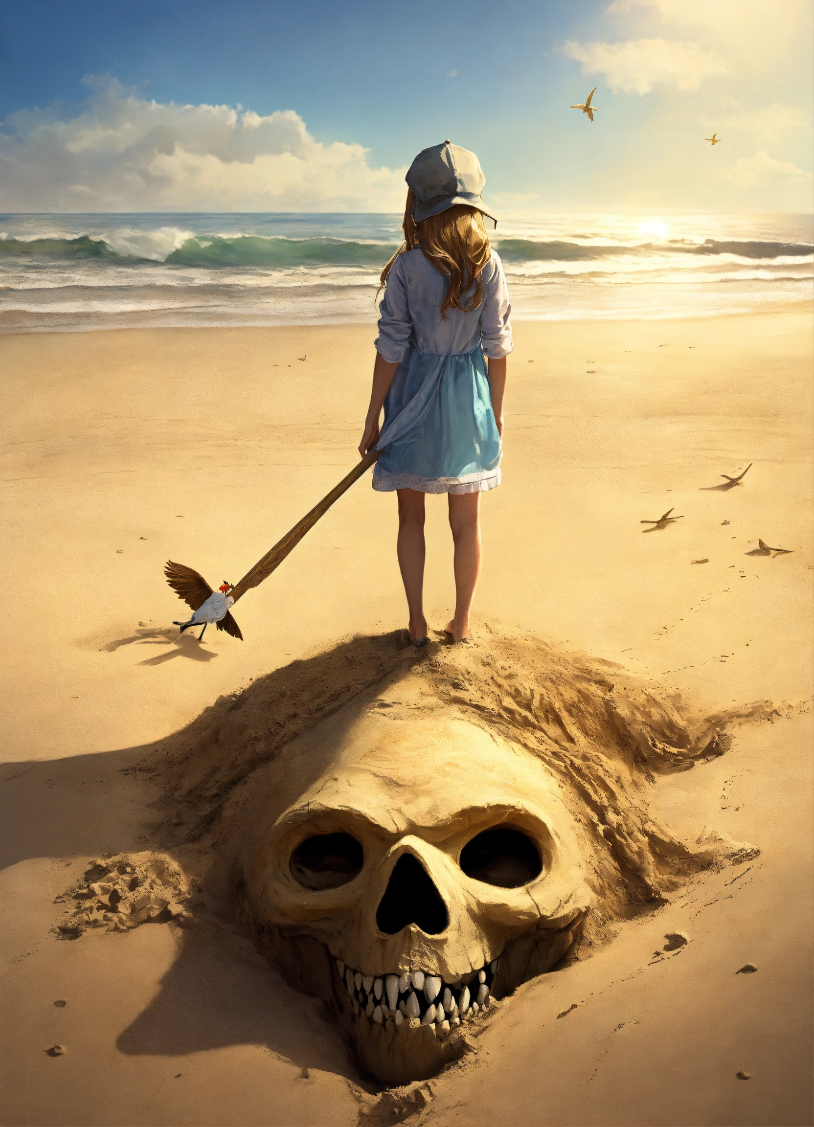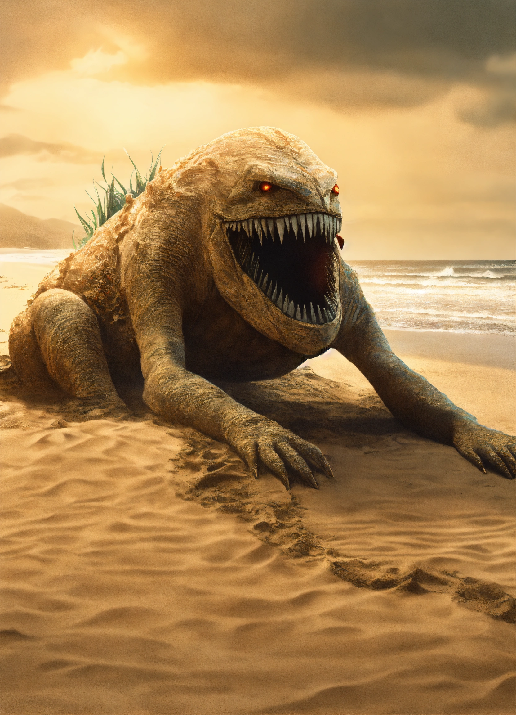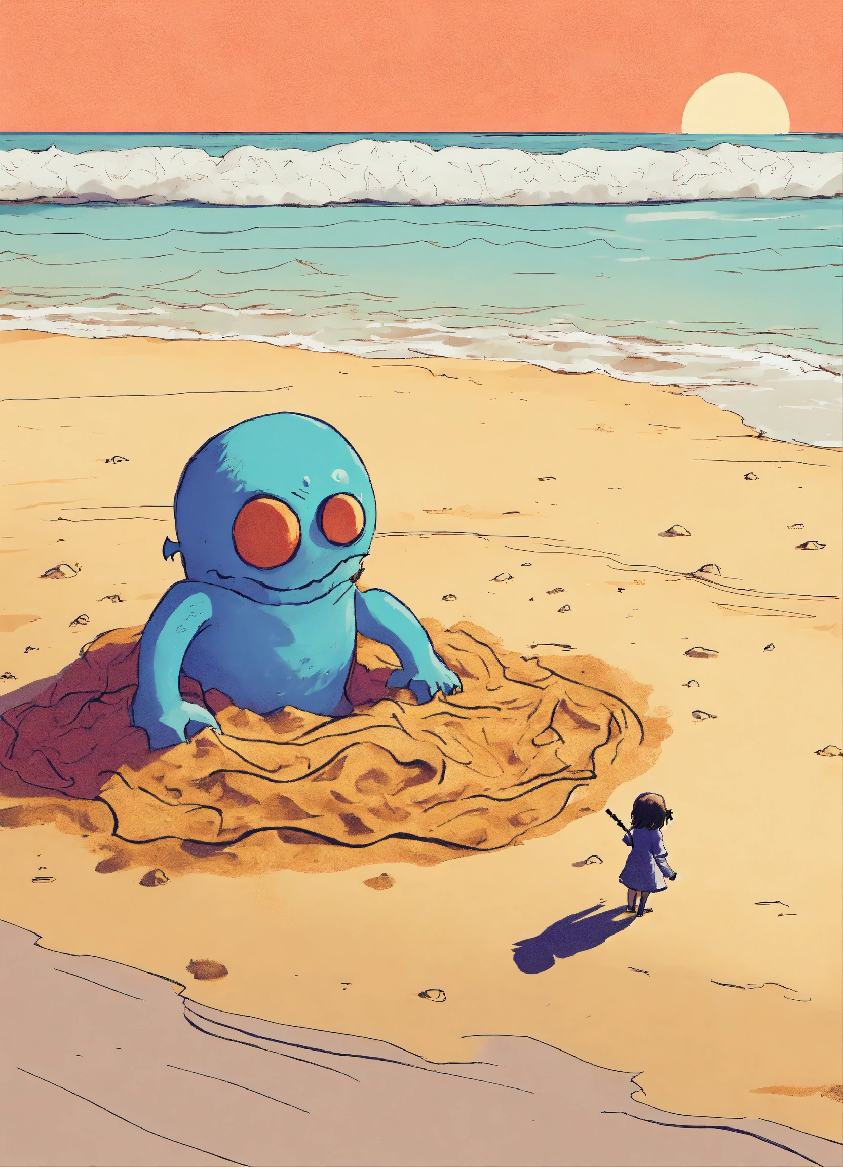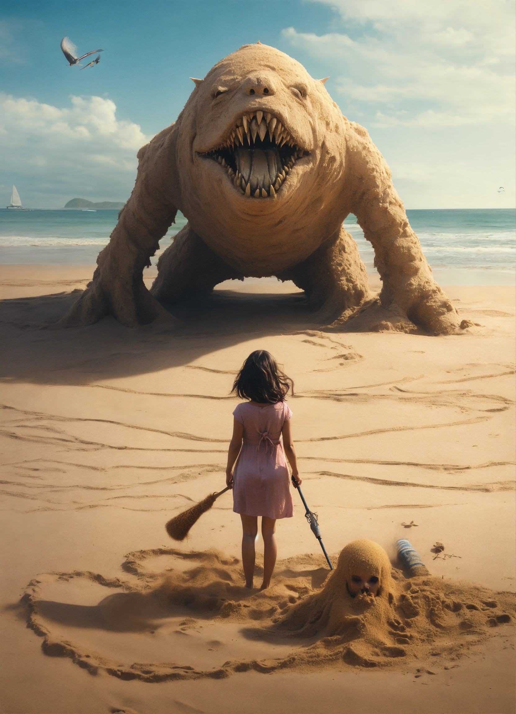 A monster under the sand on a beach, using the girl as a crafty decoy to become a part of 'her' and draw in unwitting prey.