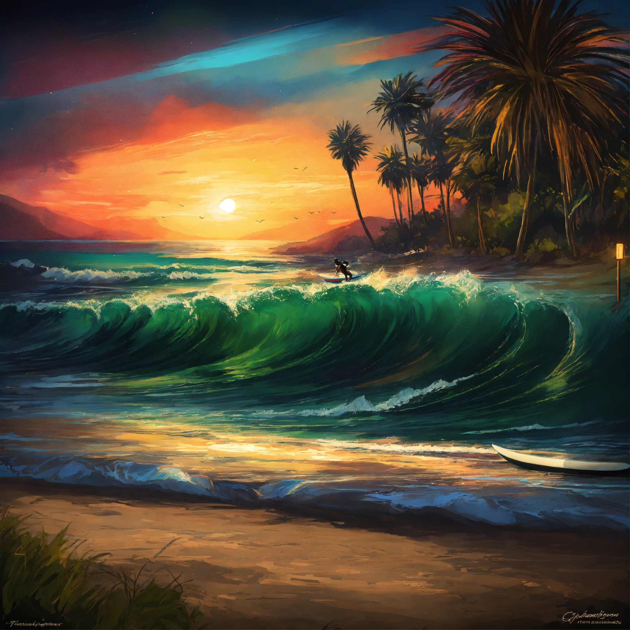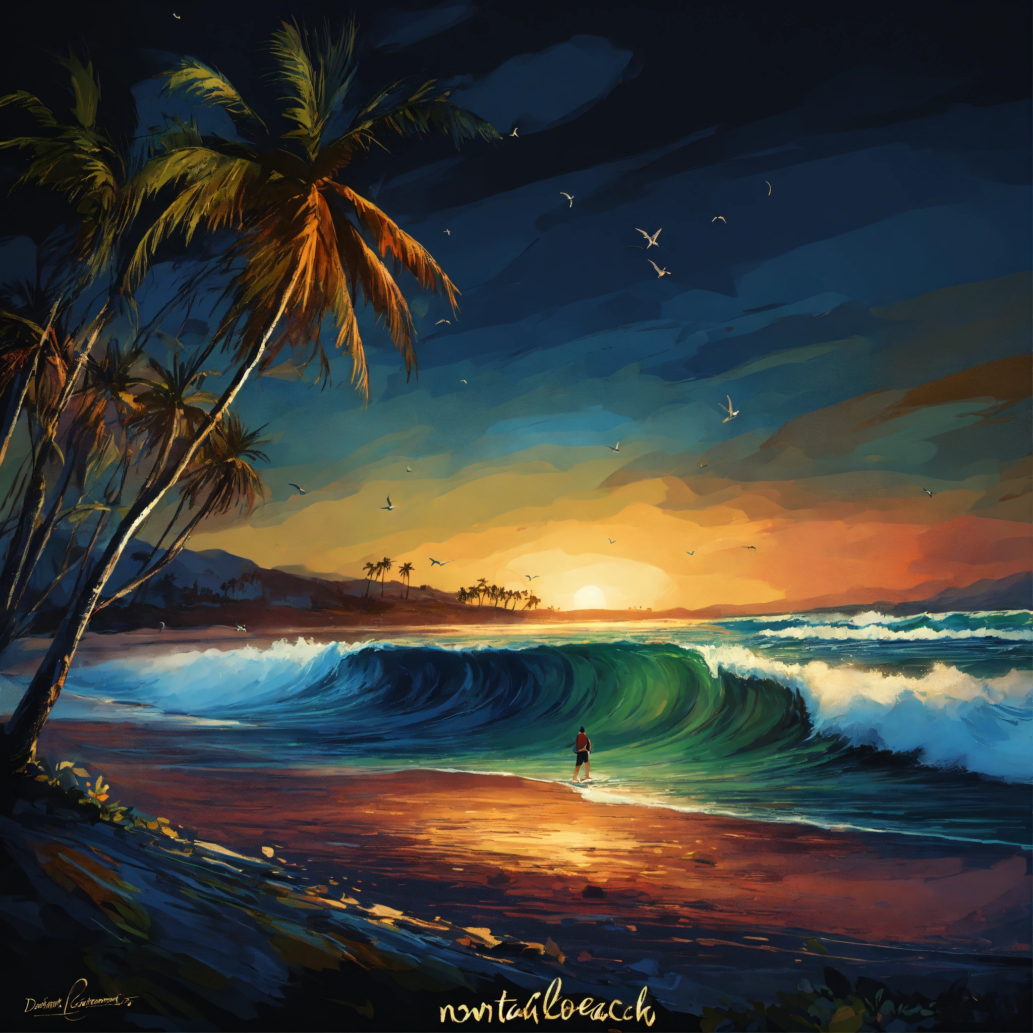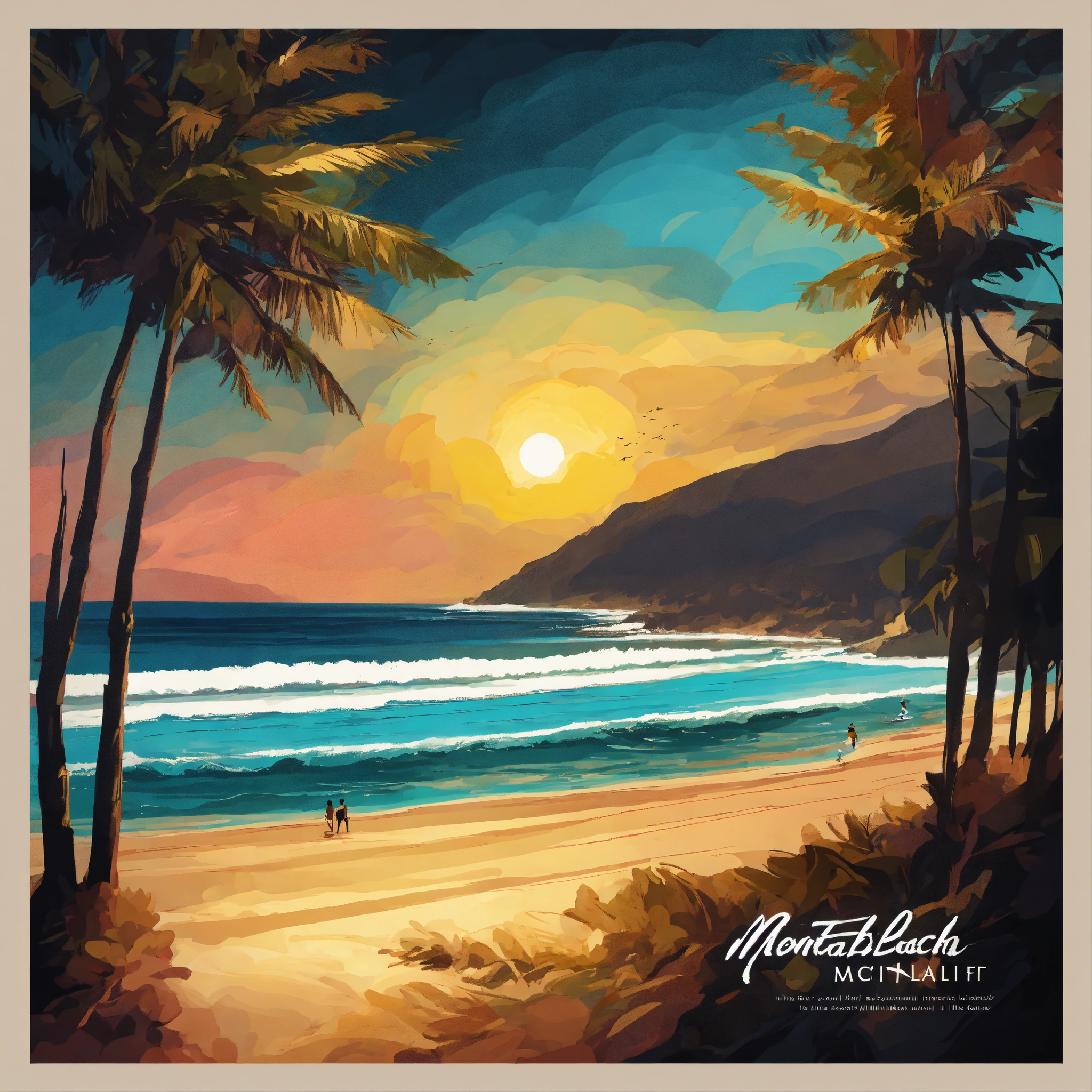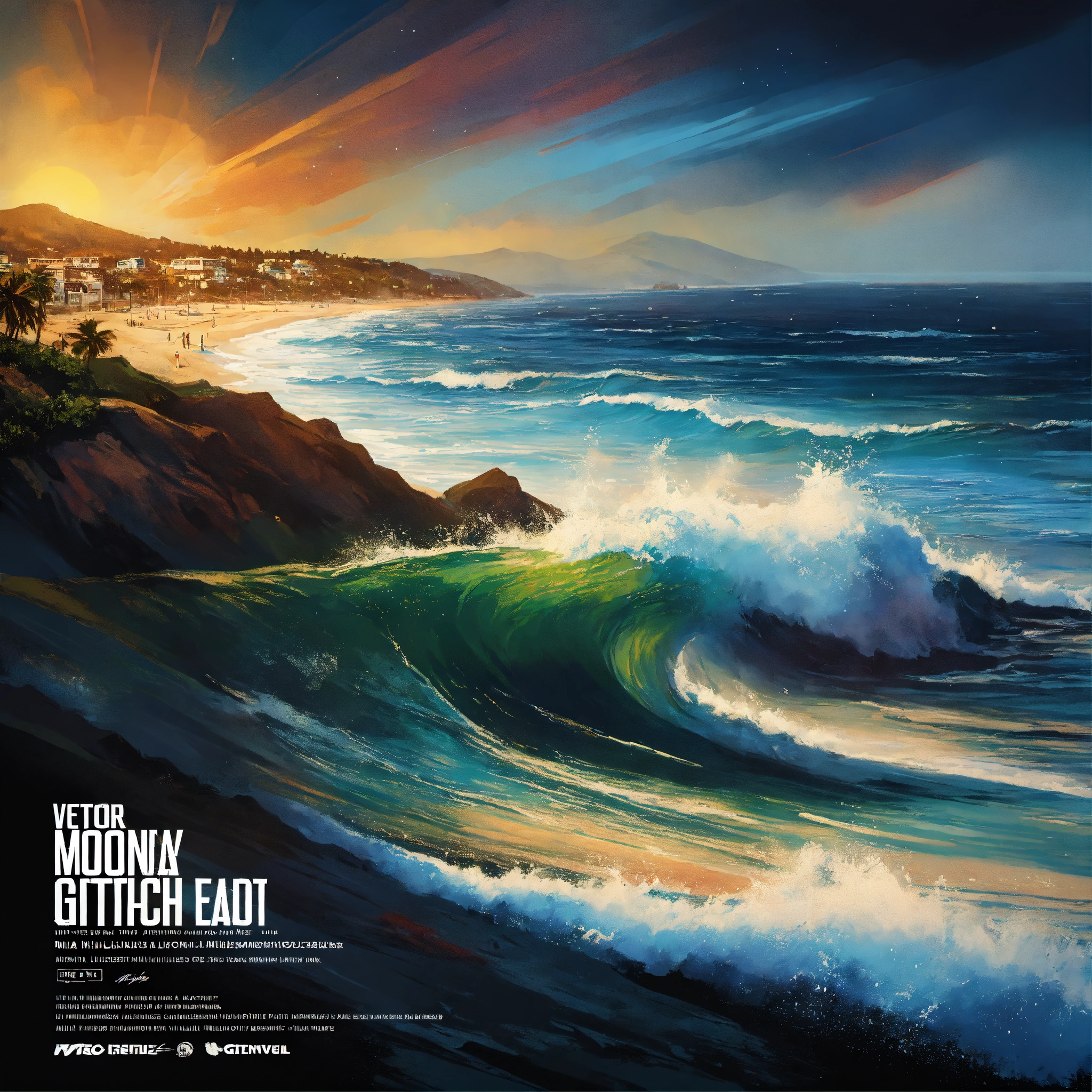Vector"montabeach" a poster with ultra realistic surf, with the words of daniel castancarne griffithsandreas lieruss millsleonid afremov, black background