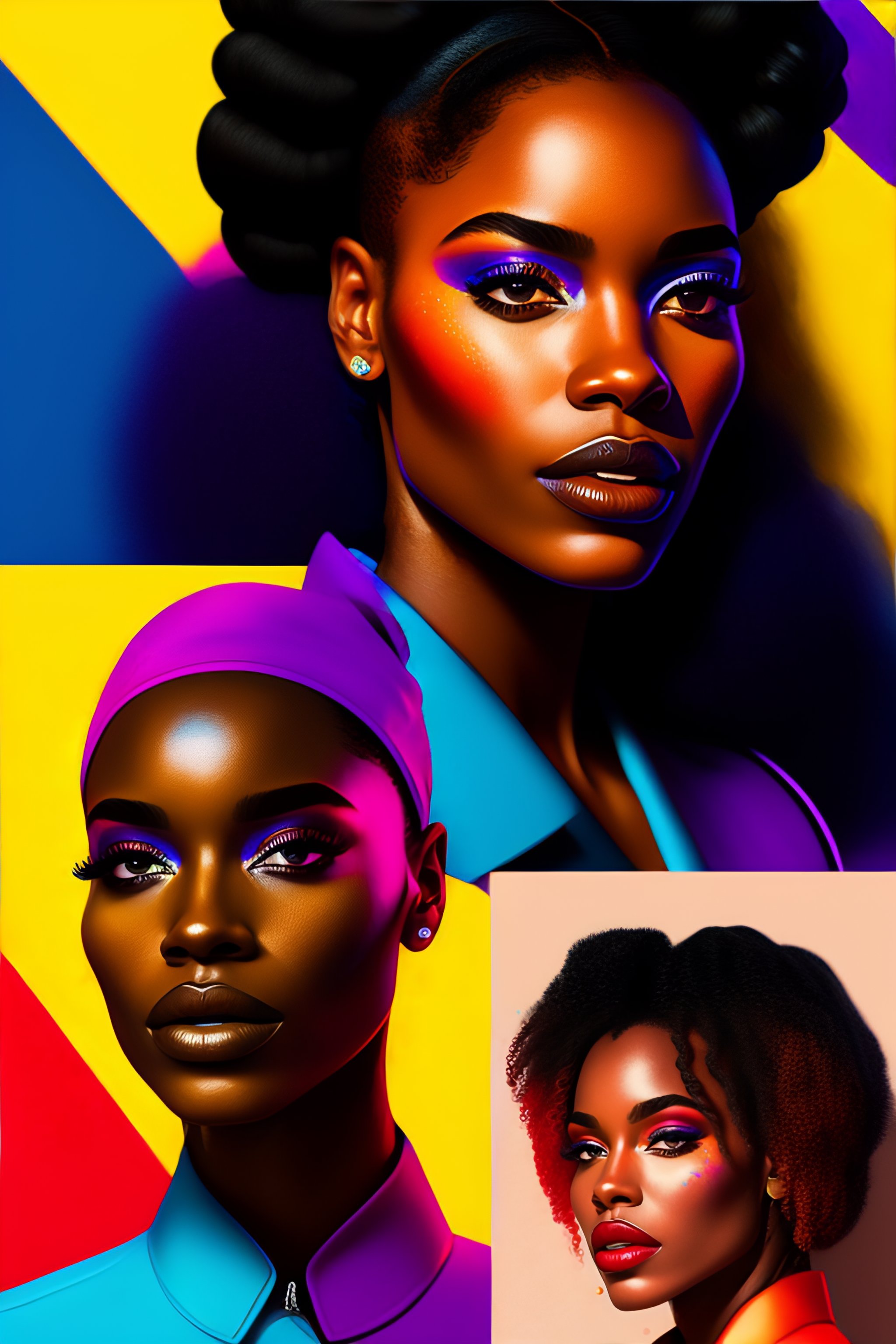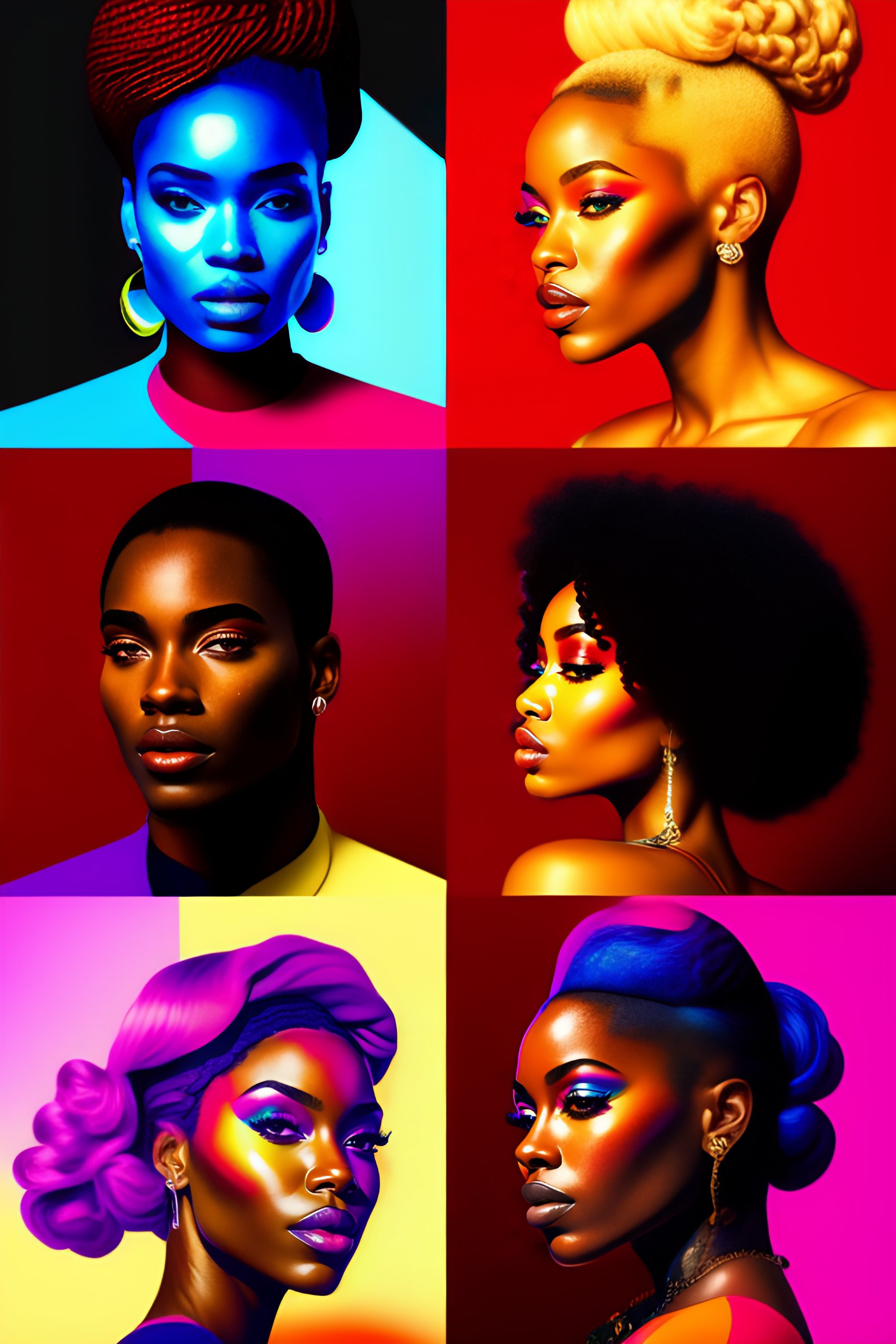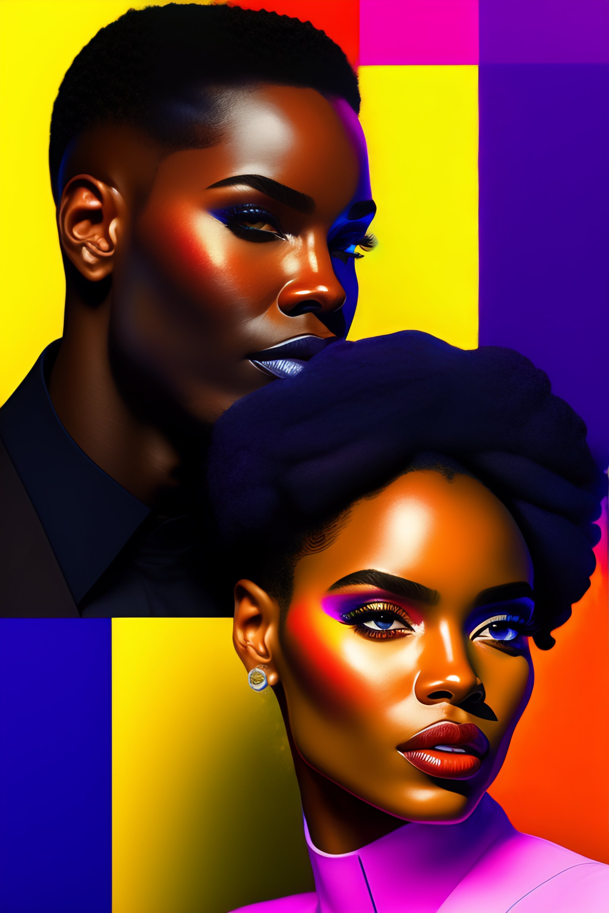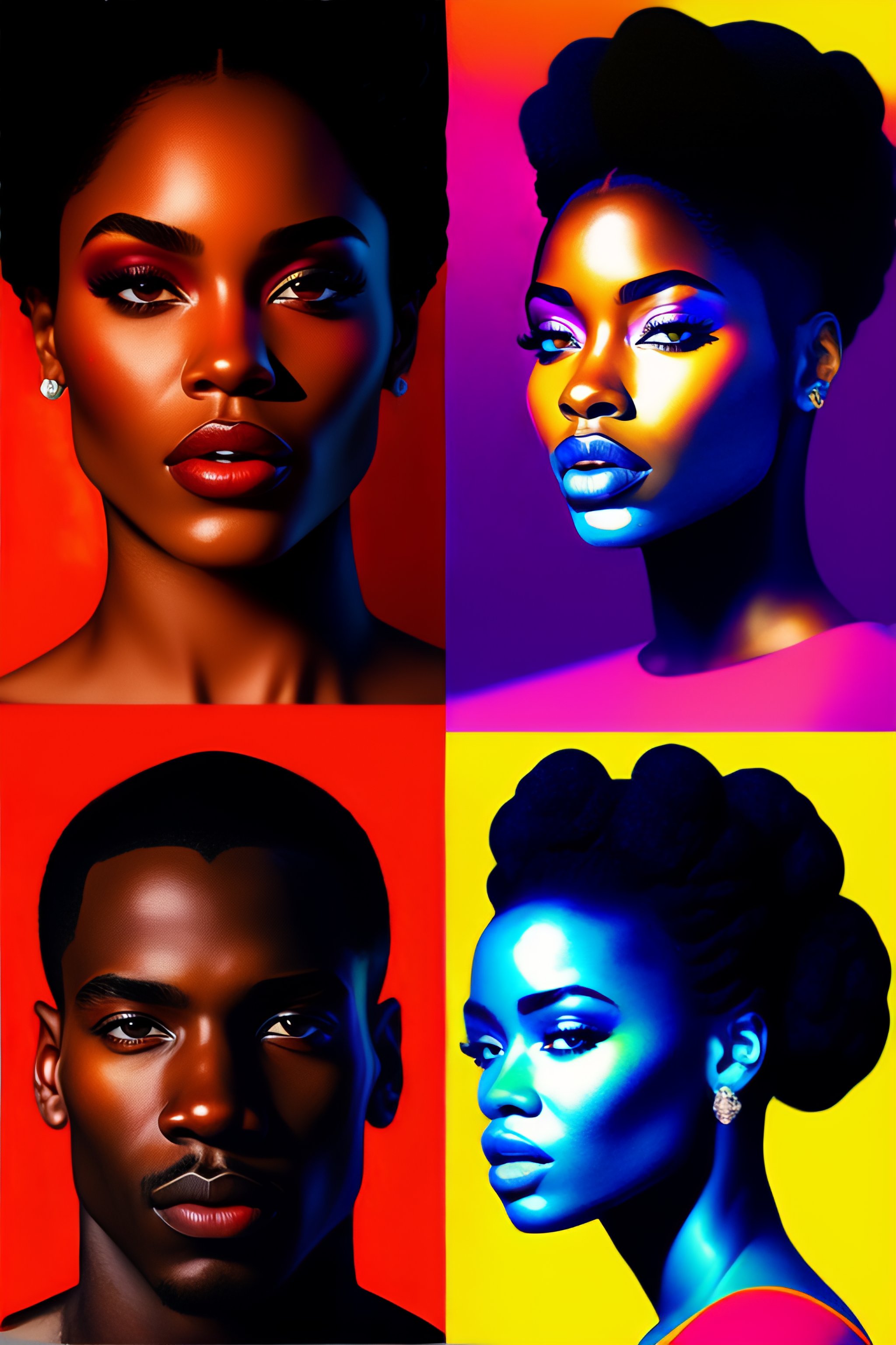 Pop art in 4 squares, hyperrealist portrait of black man and black woman, colorful painting, fantasy art, photo realistic, dynamic lighting, artstation, poster, volumetric lighting, very detailed faces, 4 k, award winning