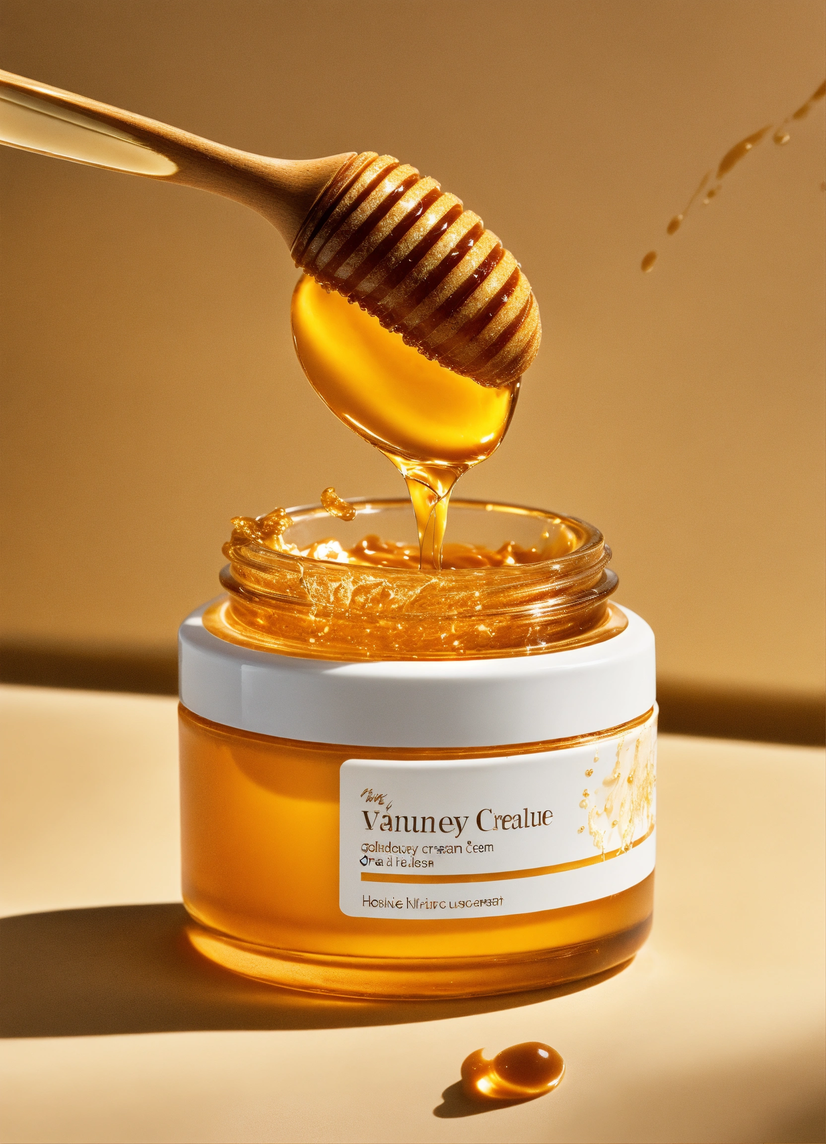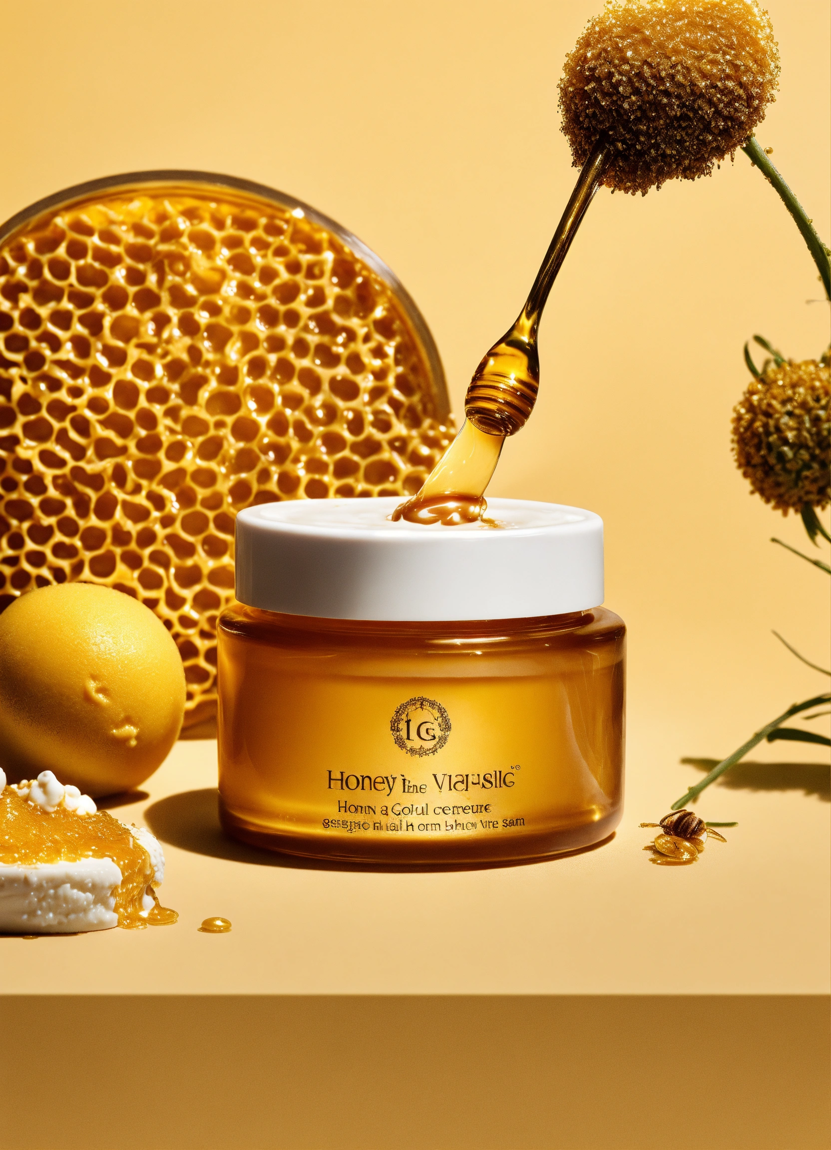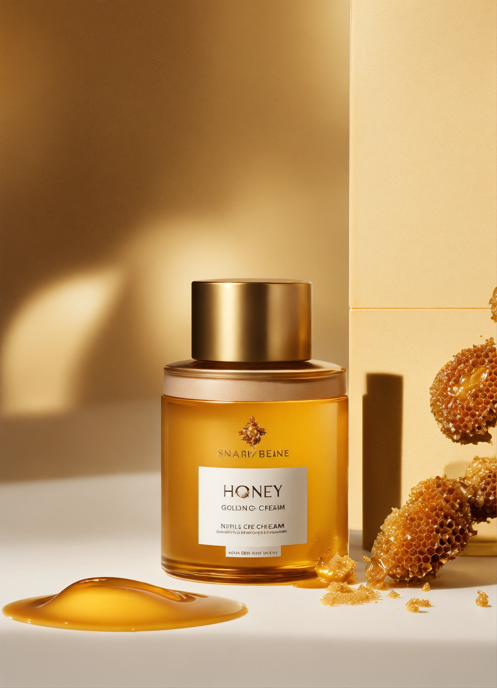 Construct an image that highlights a skincare cream product, positioning it against a stark white backdrop. the product's design and overall aesthetic should deeply resonate with the rich, golden hues and the viscous texture of honey. honey, being symbolic of healing, nourishment, and natural sweetness, should be the pivotal inspiration for this visual.