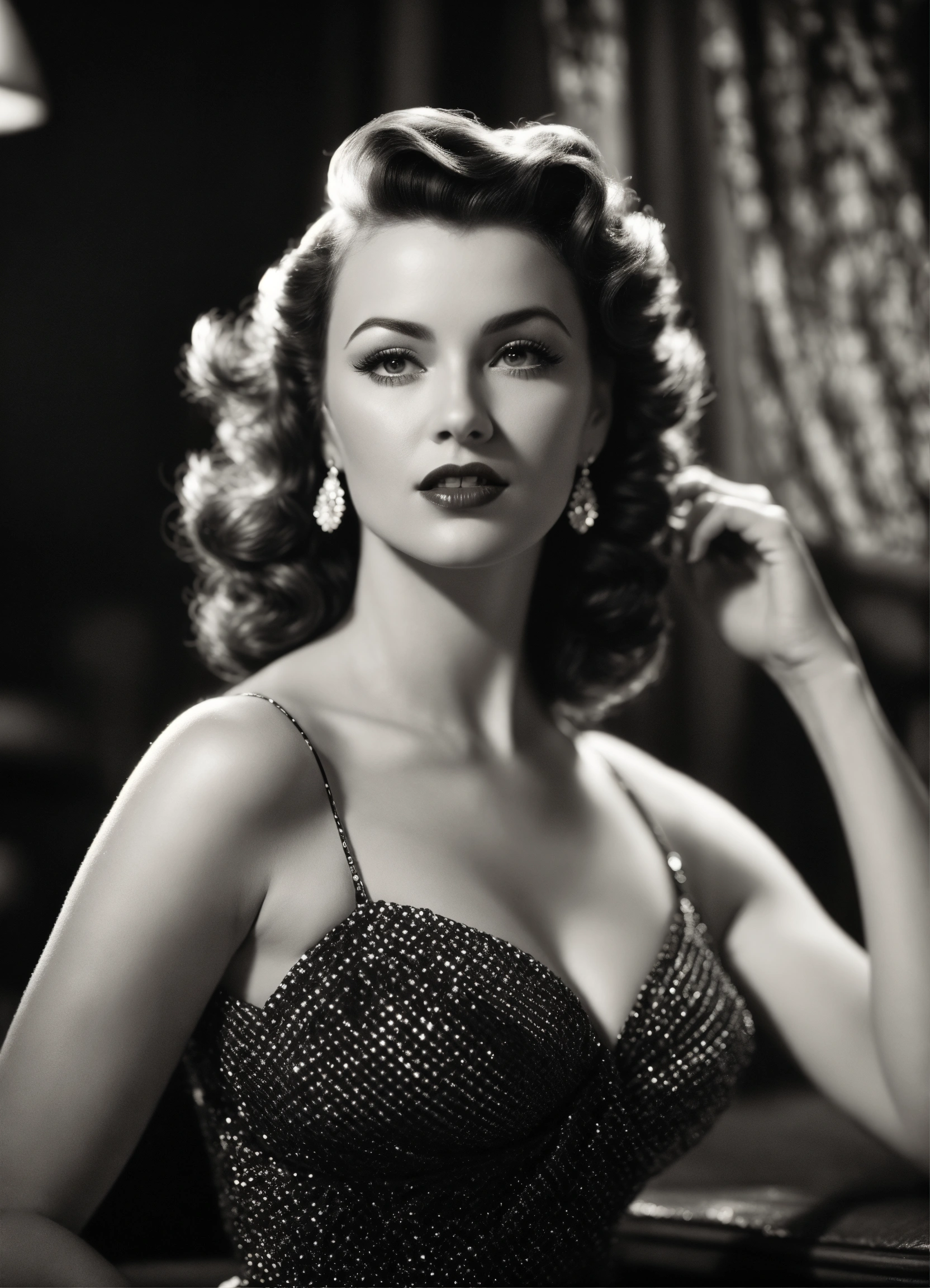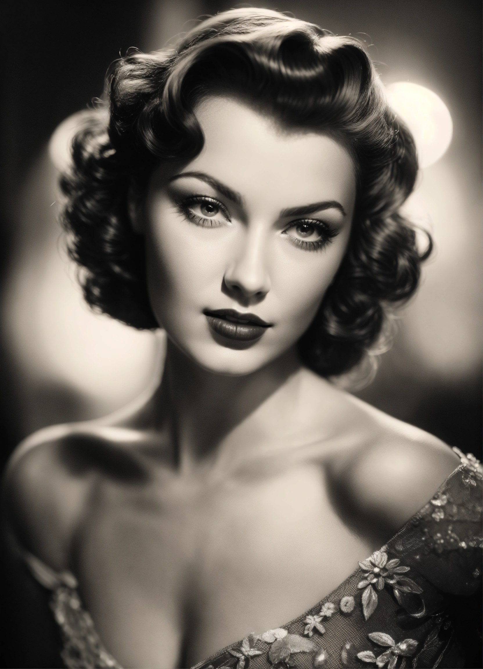Photorealistic, blackandwhite, hollywood goddess, 40s style, cool and classy attitute, pin up, set card, moviestar, detailed, soft focus, 8k, q2