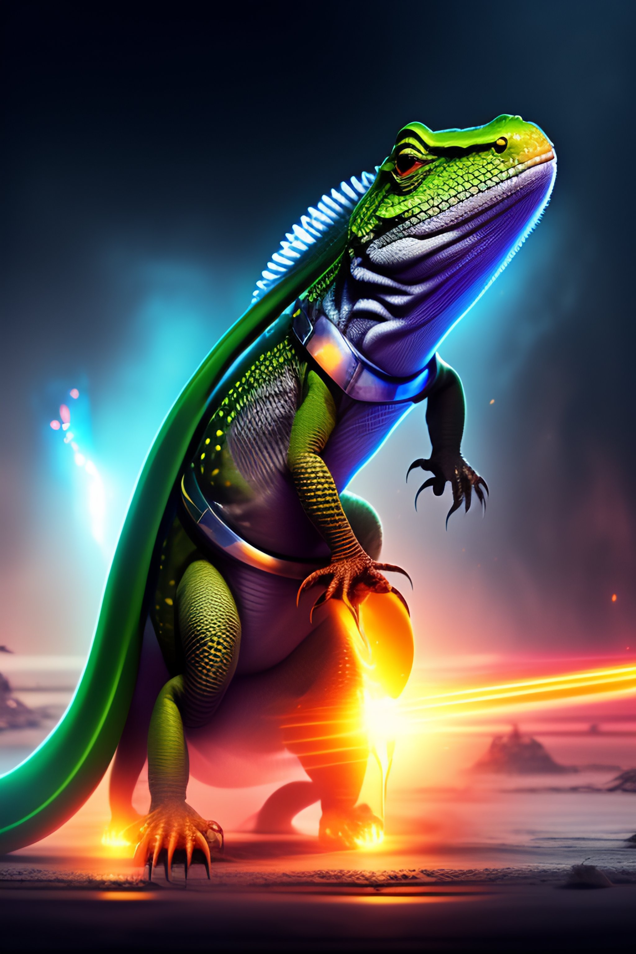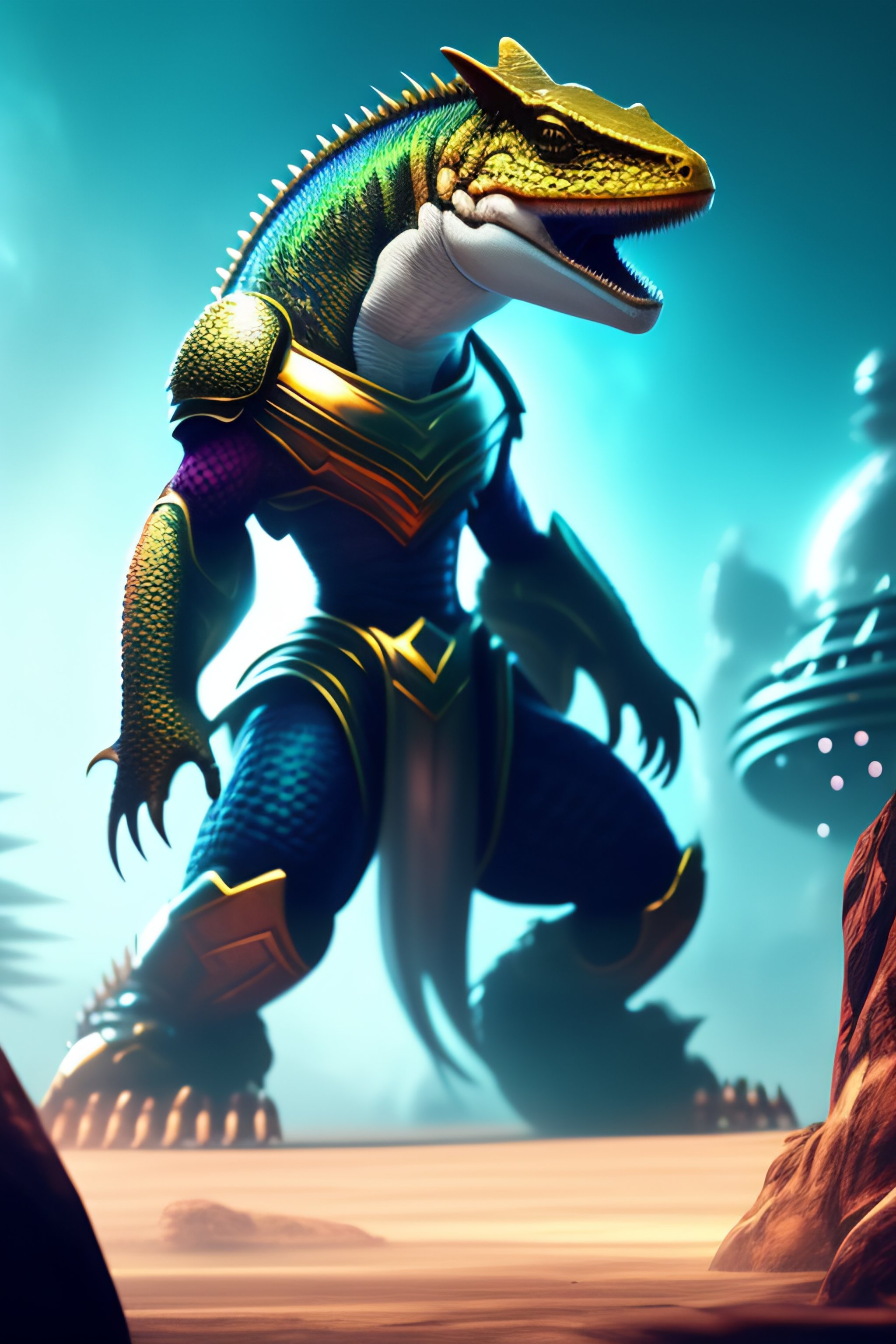 Create an image of a 'lizard' who is an alien fighting against another alien in a futuristic arena, give the gladiator-alien a unique appearance and clothing and also give the opponent-alien unique features, feel free to add other elements such as futuristic weapons or backgrounds