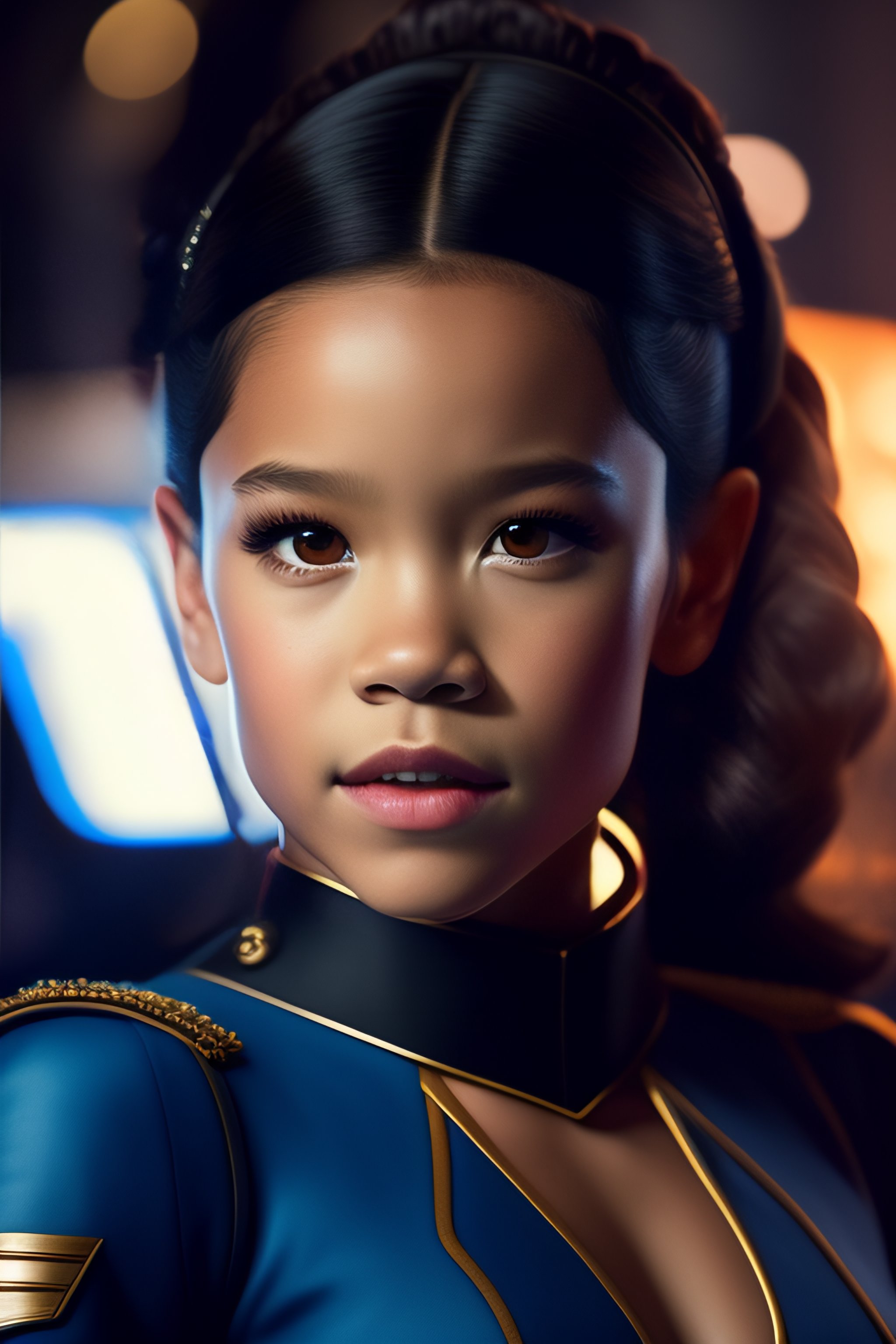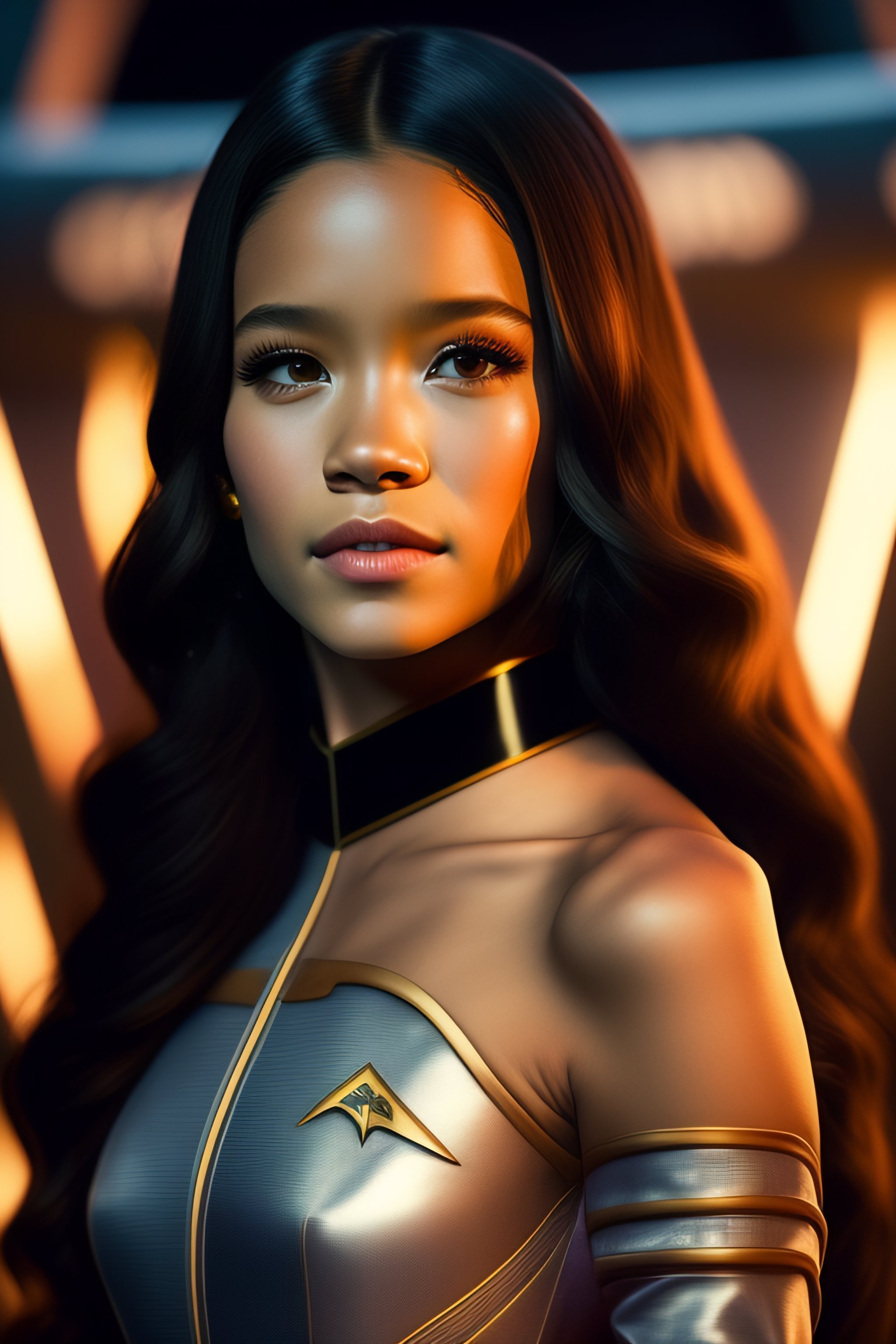 Jenna ortega as startrek captain in silver corset sitting in the star trek captainschair