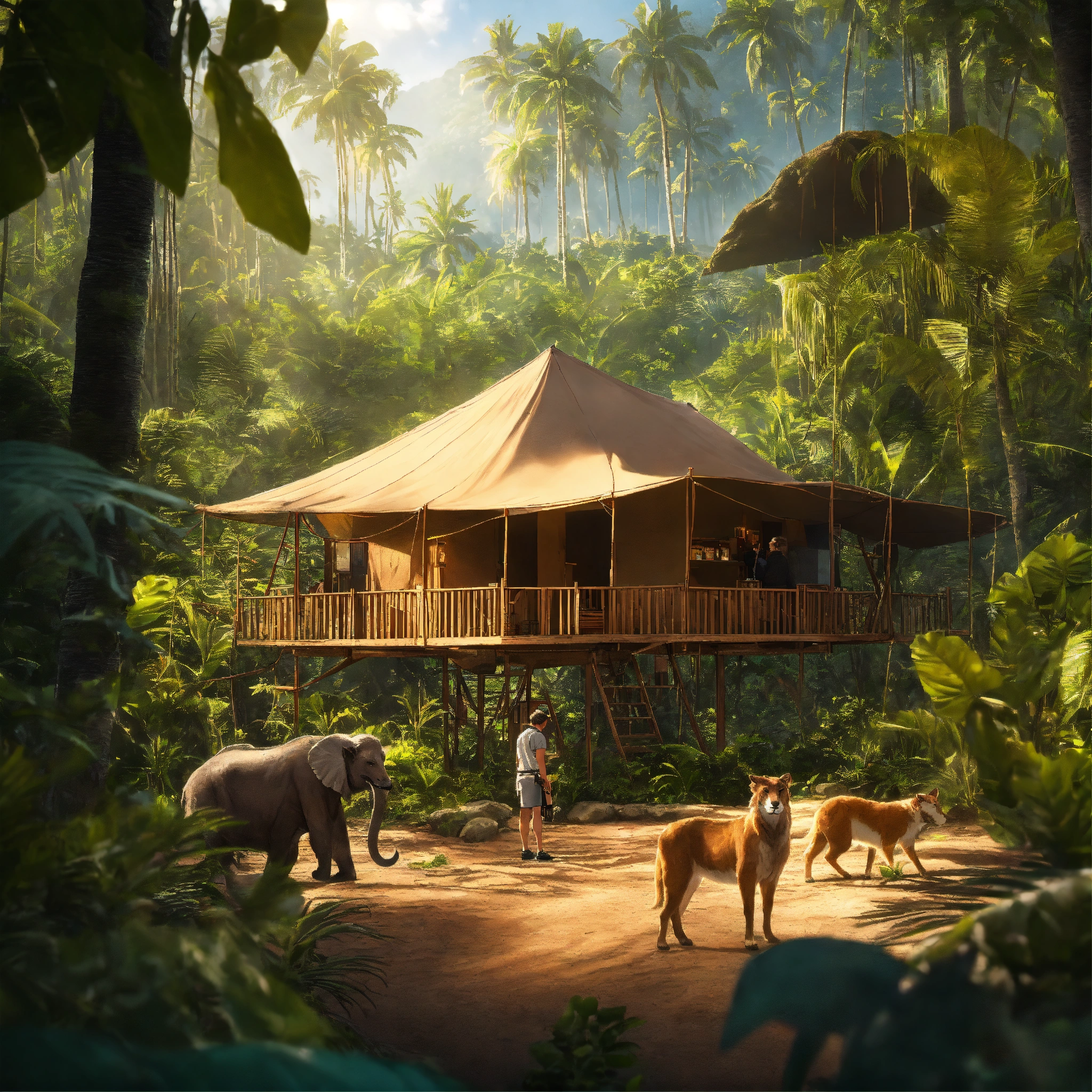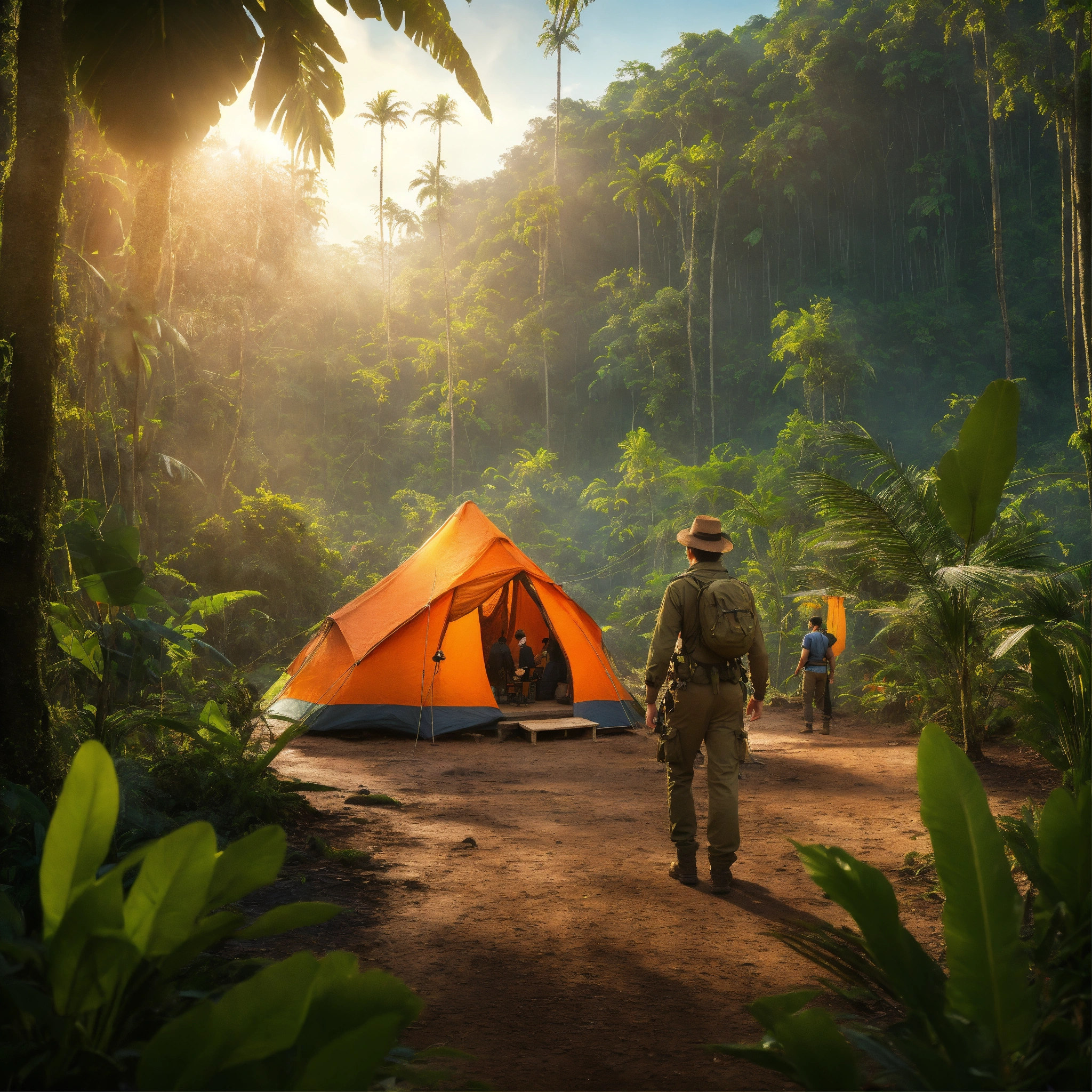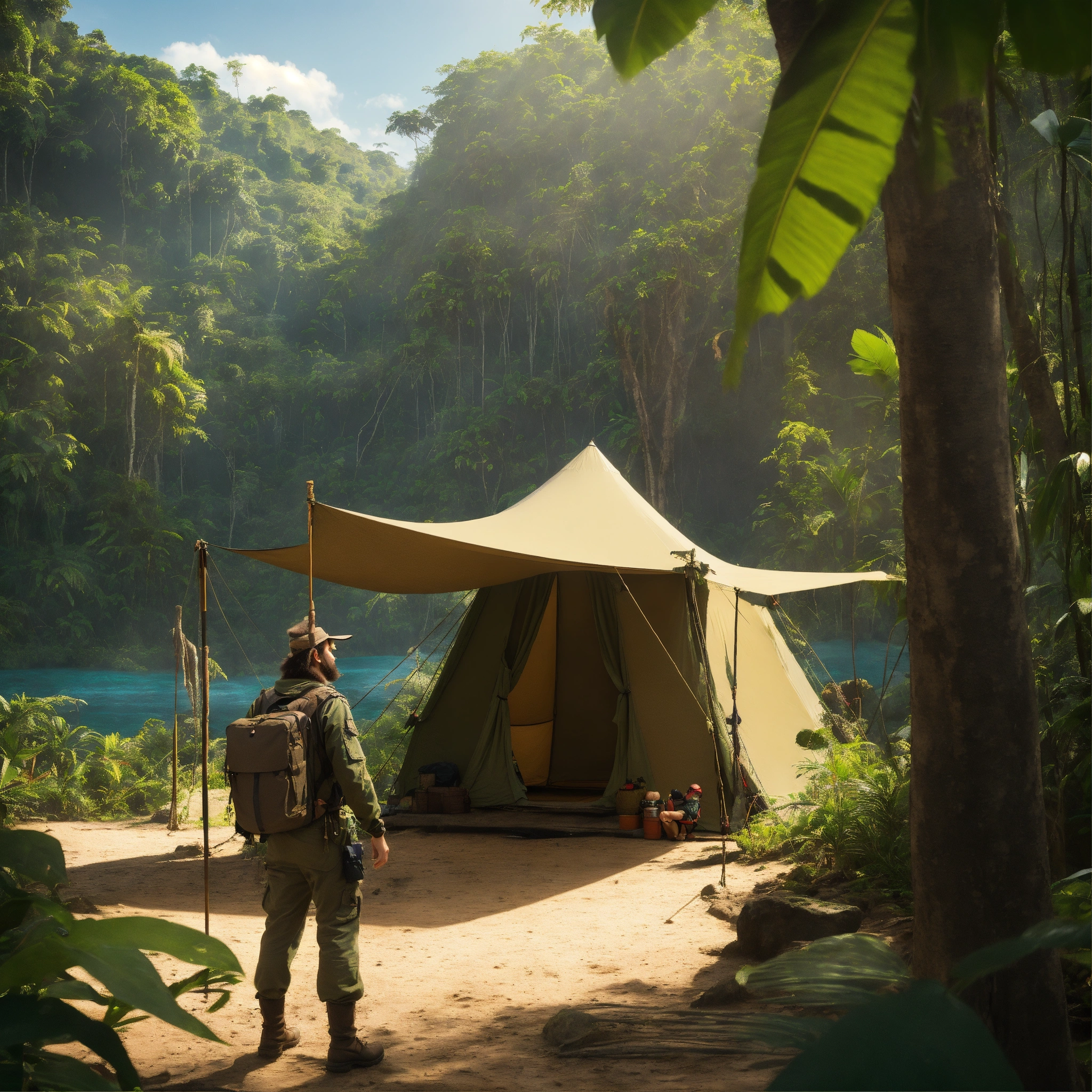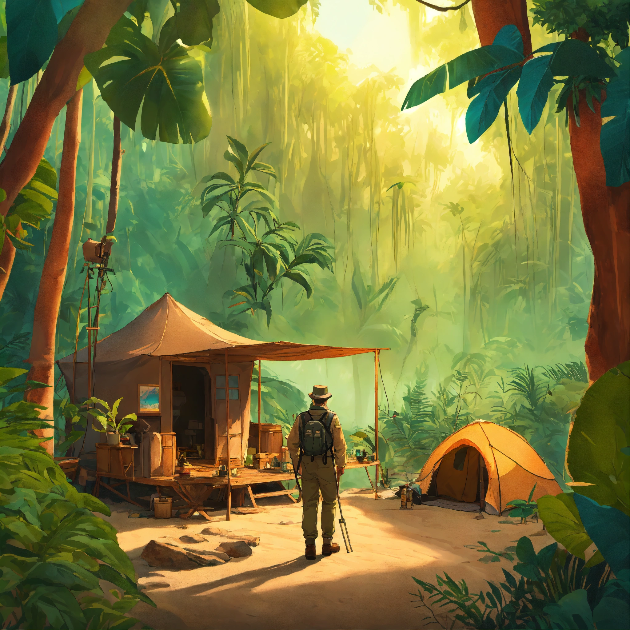 Plan américain d'un explorateur de film d'animation, biologiste de la faune sauvage devant un camp d'explorateur en second plan, dans une jungle tropicale luxuriante en arrière plan