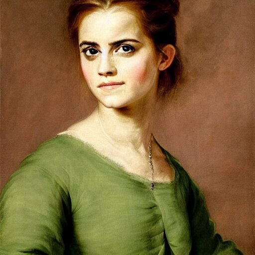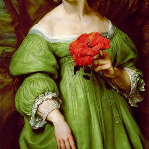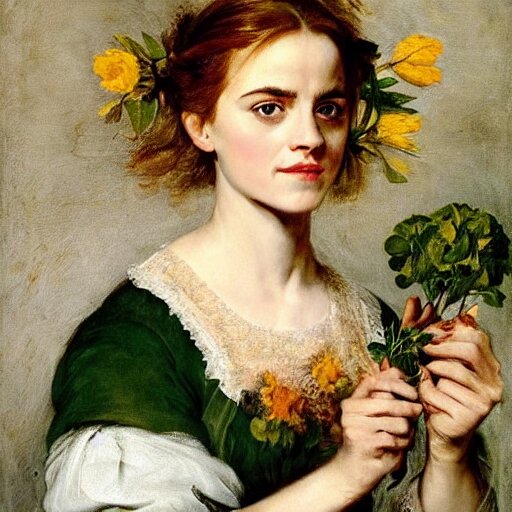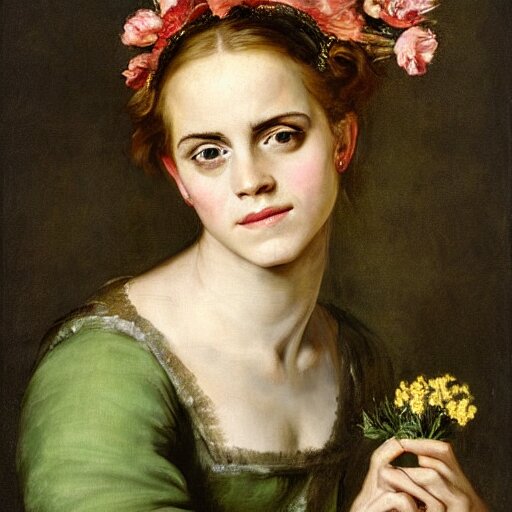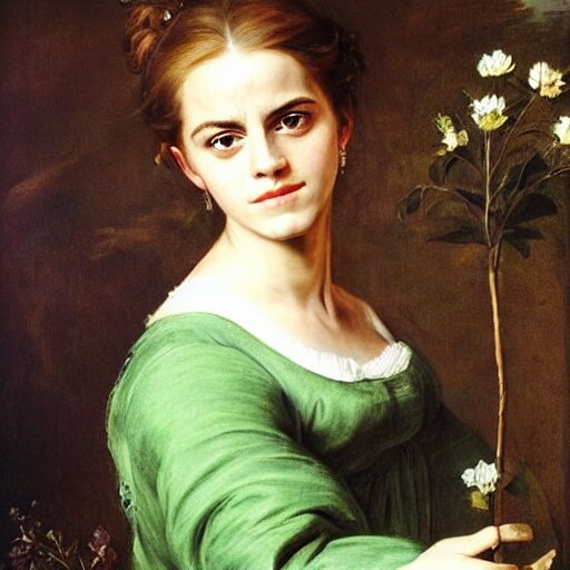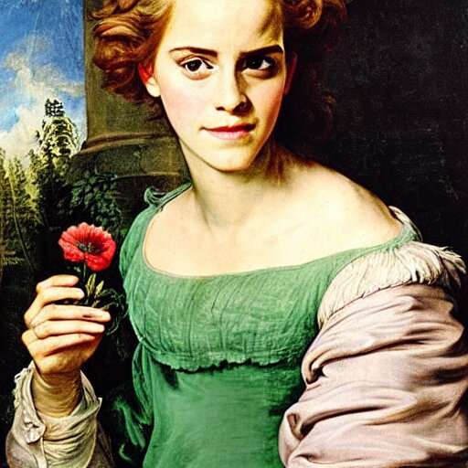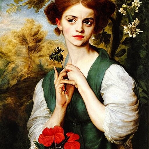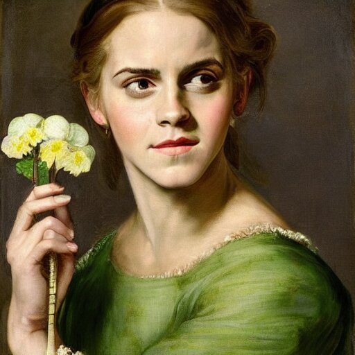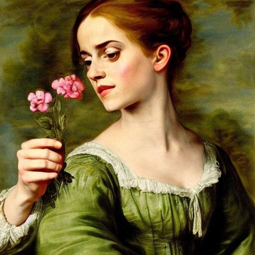 Emma watson wearing green tunic holding a flower. painted by rubens