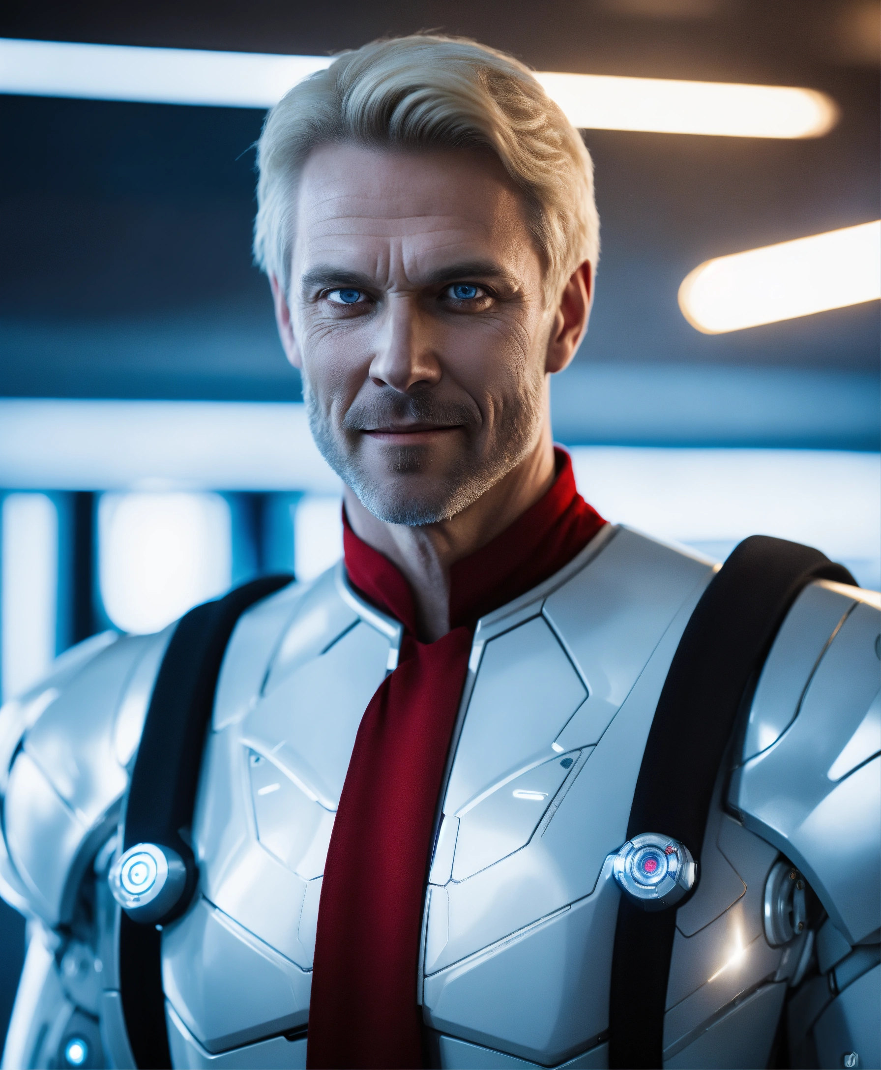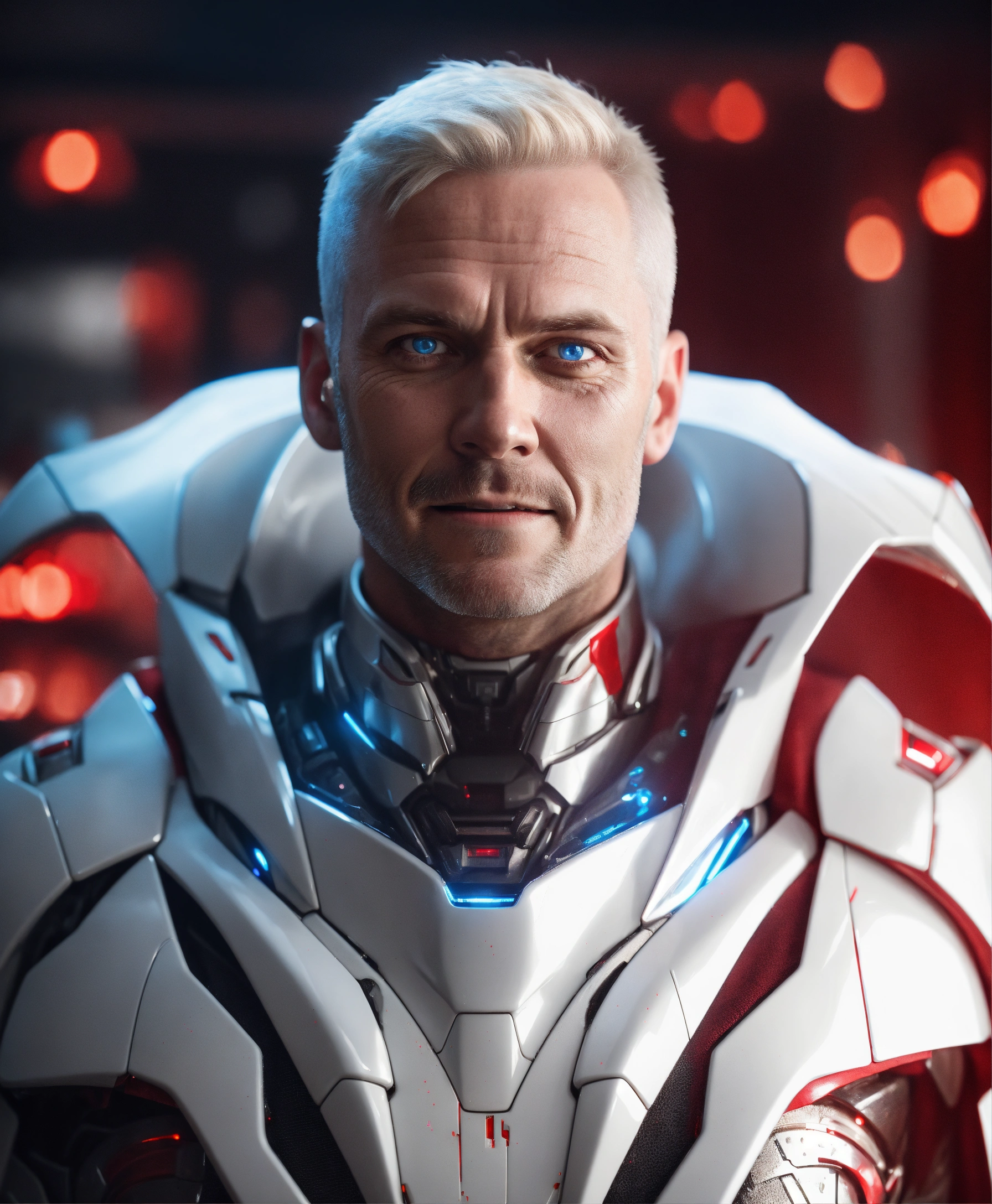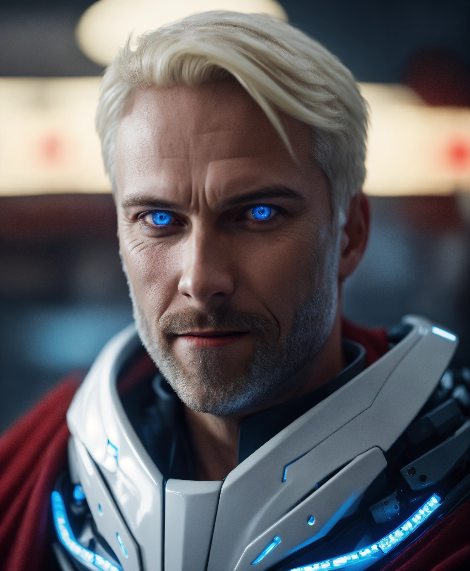 A realistic photo of psychopath 45 years old scary man with deep blue eyes, intimidating traits, creepy psycho smiling face, slim face, sharp nose, white blonde well groomed short hair, angry expression, wearing a white sci-fi robotic armor, with a red cape, dramatic ilumination, hyperrealistic, hyperdetailed, 8 k