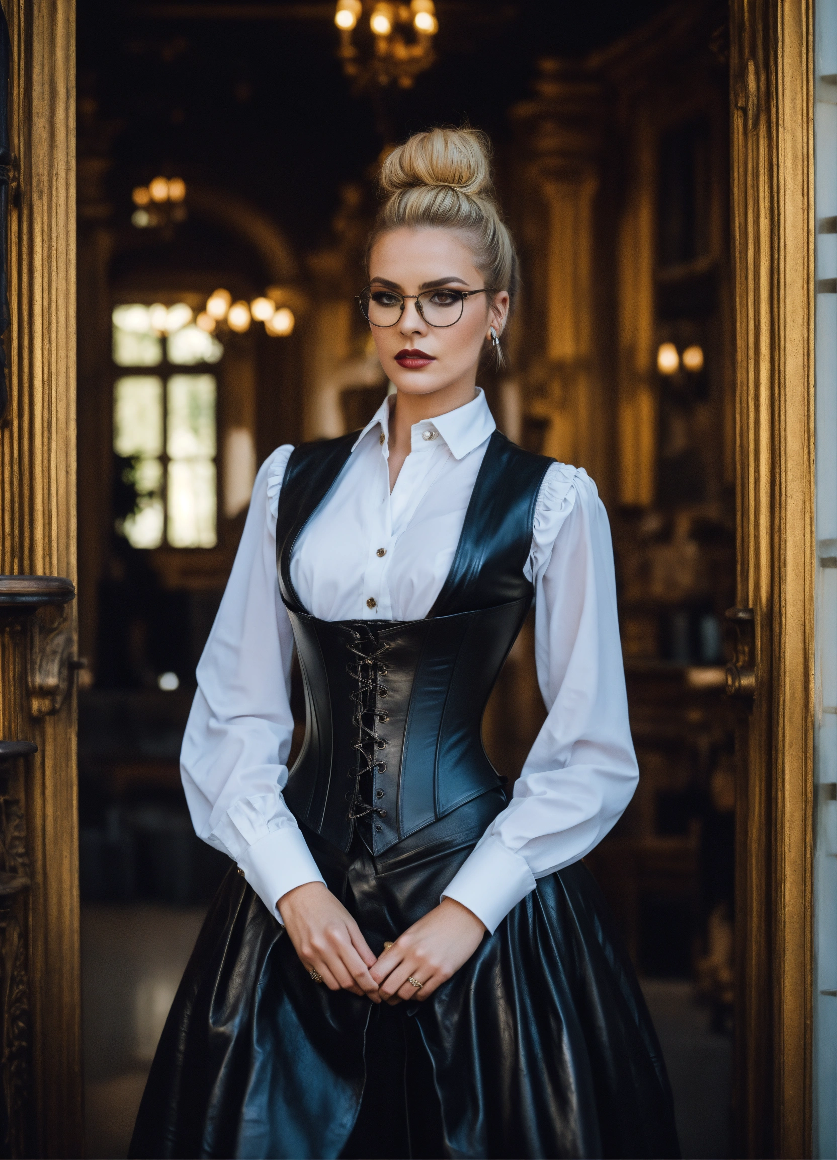 Stunning strict arrogant looking french seductress woman fashion model, blonde hair bun, glasses, strict victorian governess black leather corset dress vest and big buttons, black leather skirt, white office shirt with big closed shirt collar and long puff sleeves, eyeliner makeup, leather boots, mansion park