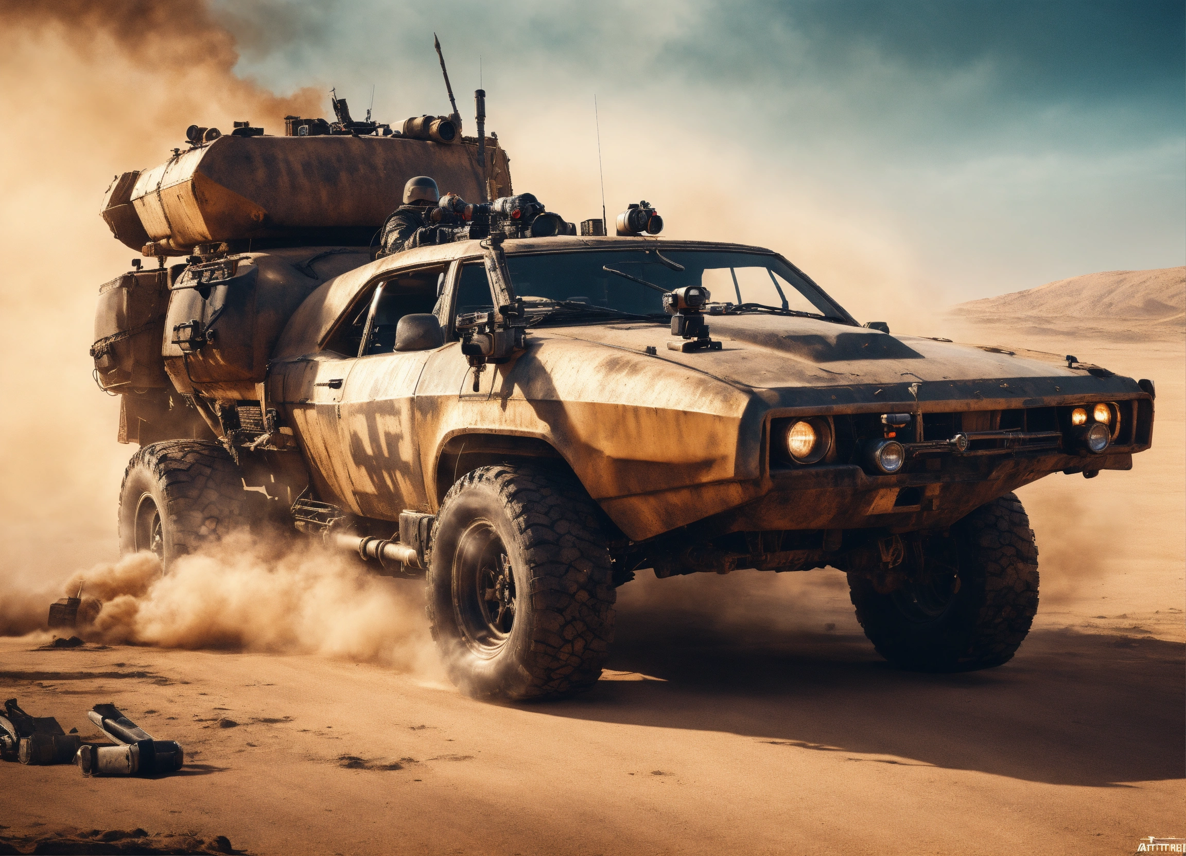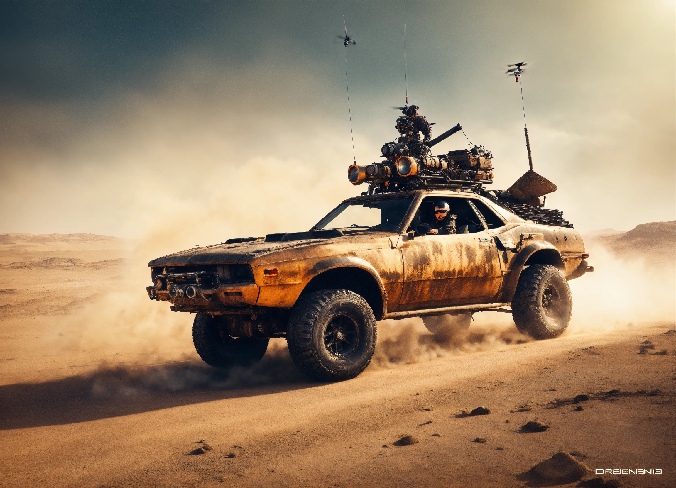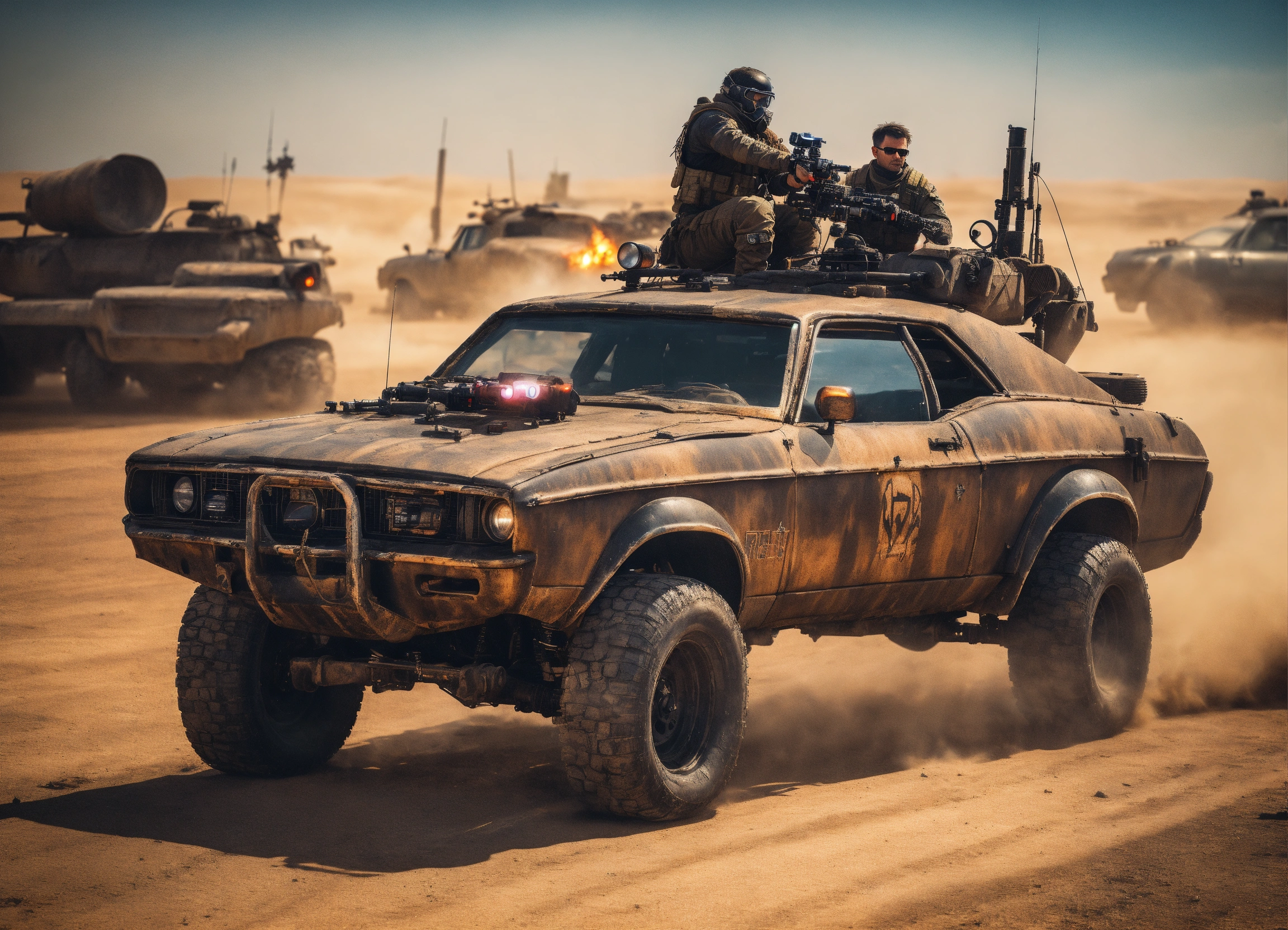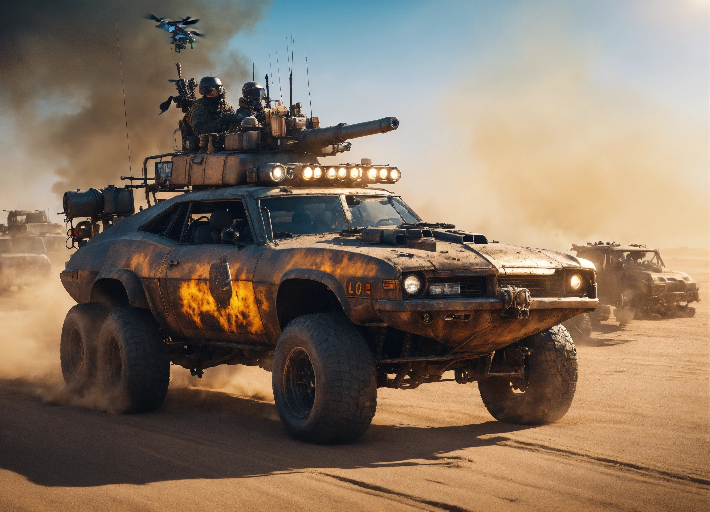 Mad max vehicles and special forces rolling out, drone photography, trending on artstation, battle cinematic realism, convoy, smoke lumenescent