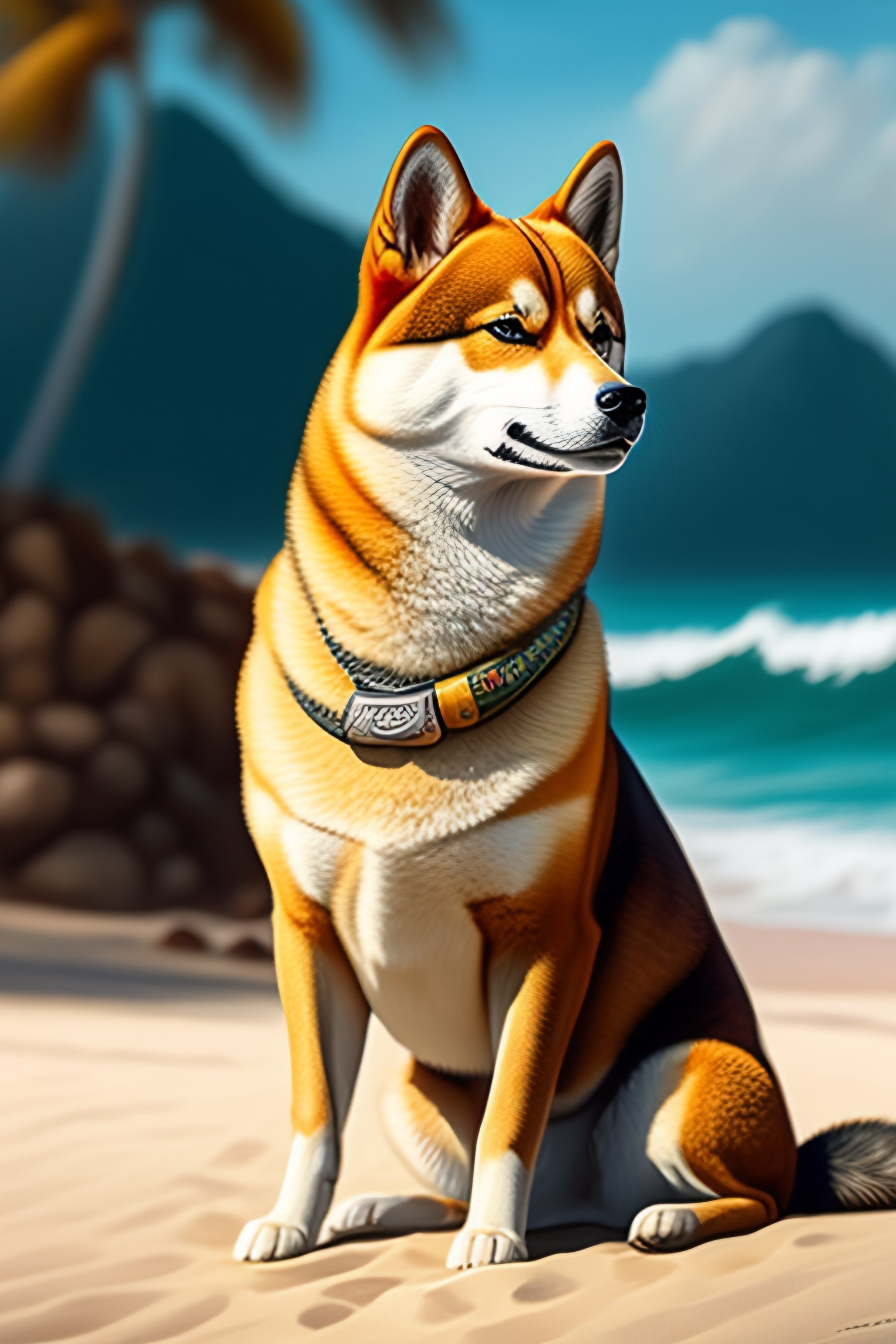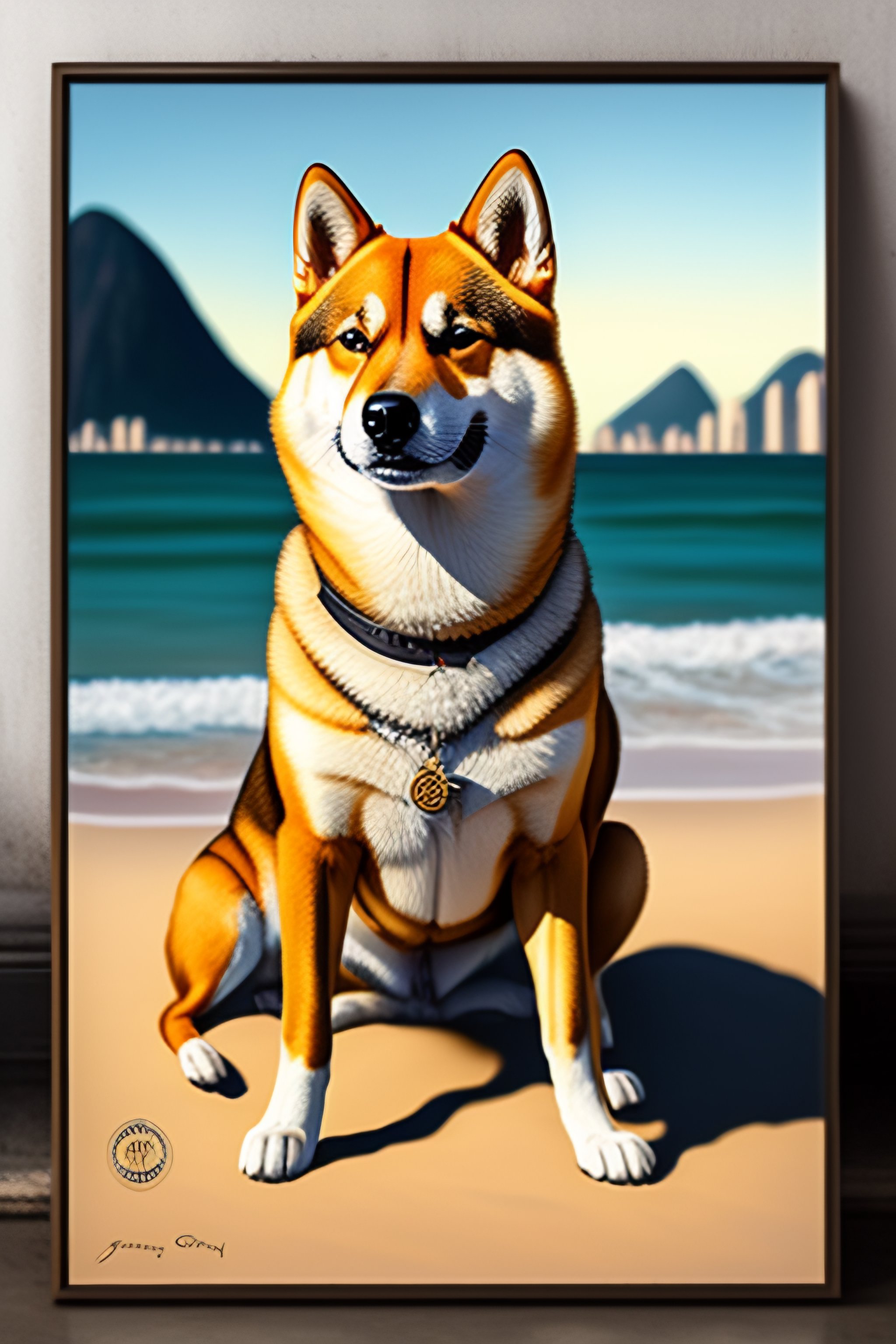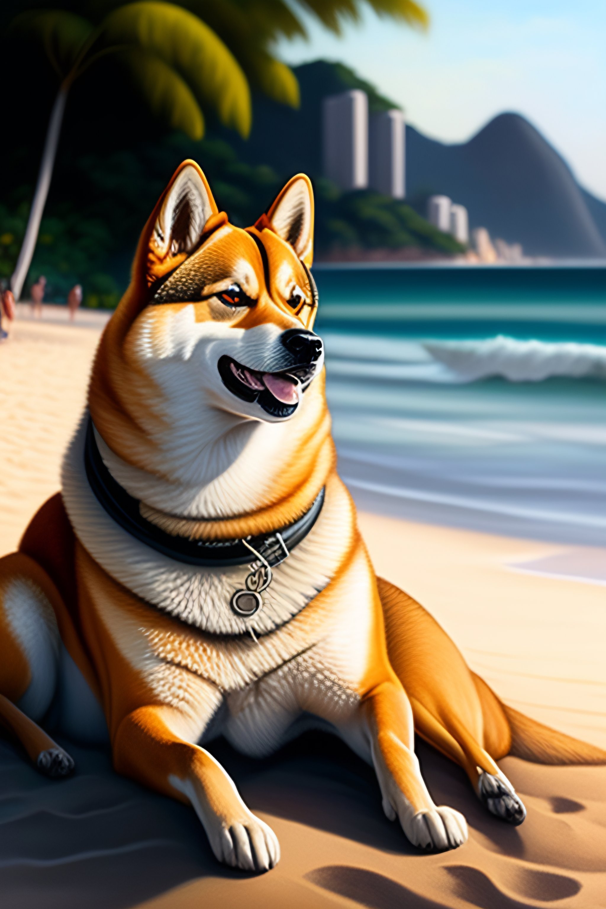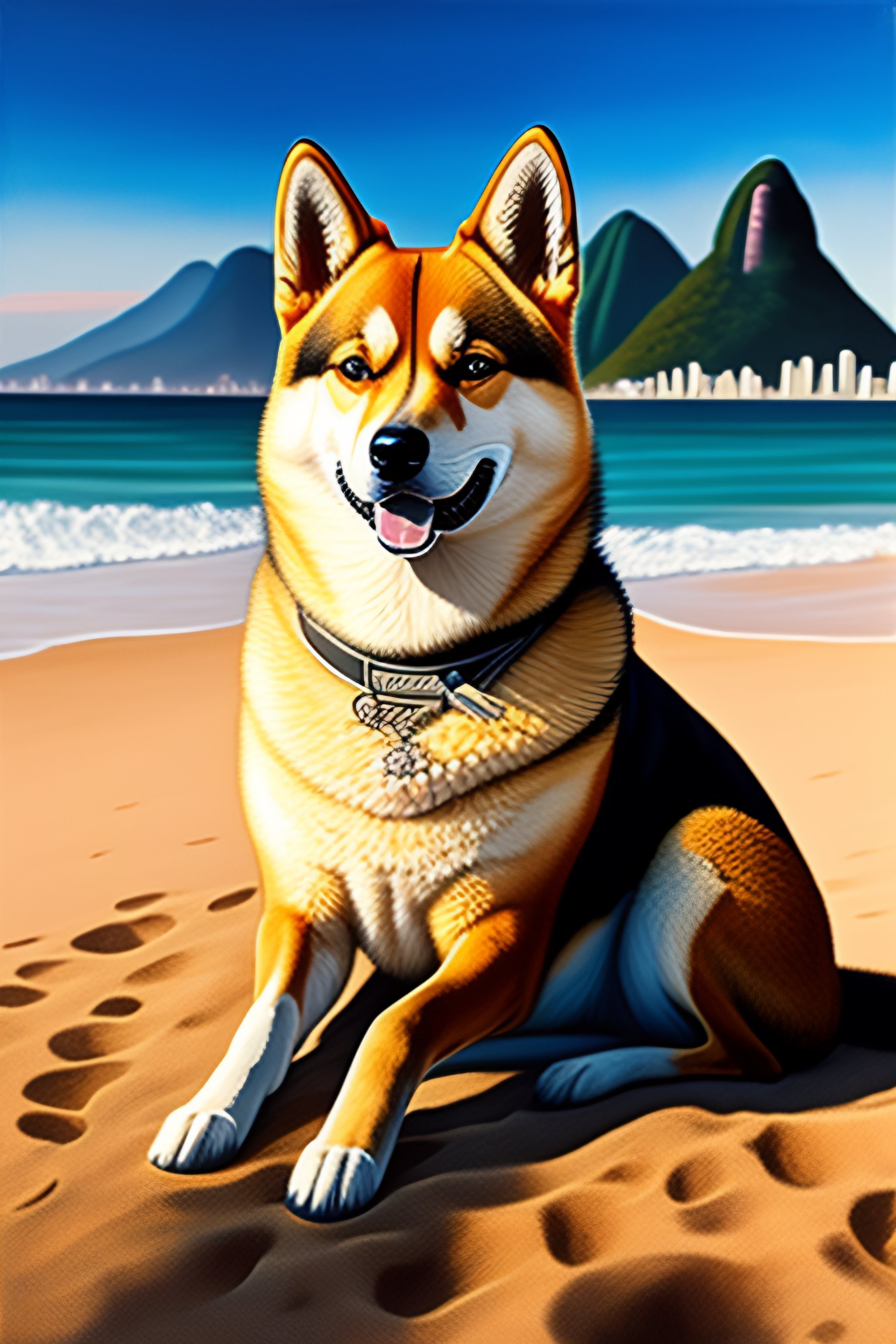 Realistic painting of a smiling shiba dog sitting in rio de janeiro on the beach, with 4 legs, by james gurney, smiley, vintage, concept art, winner